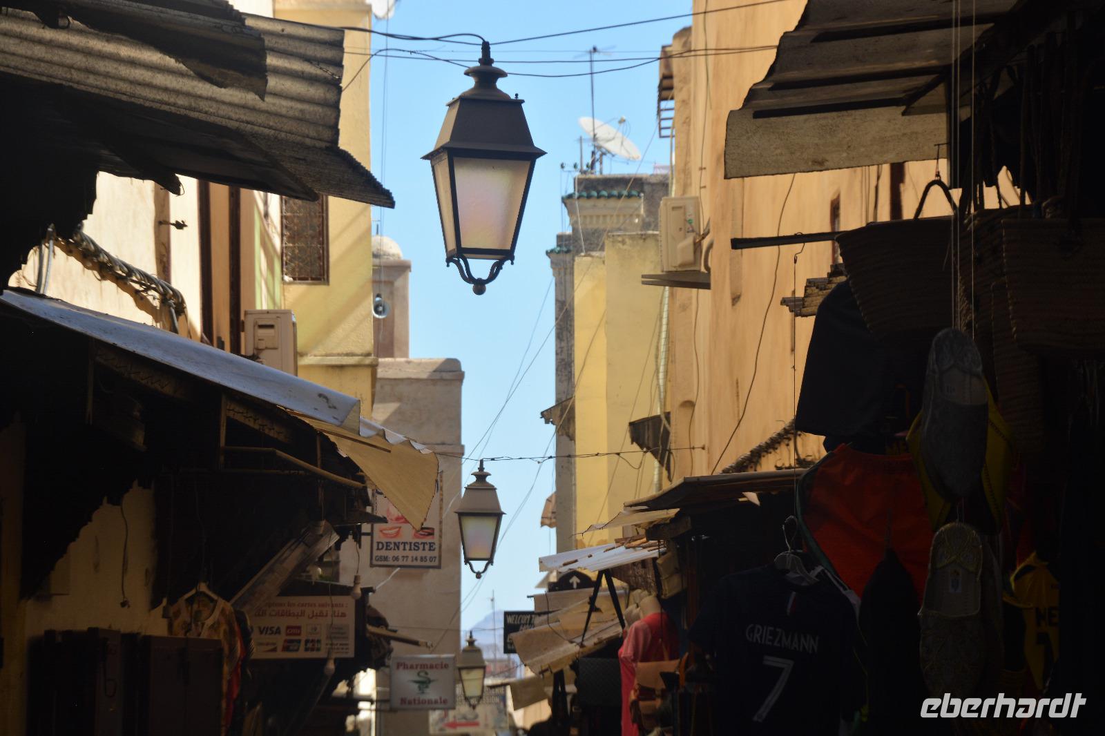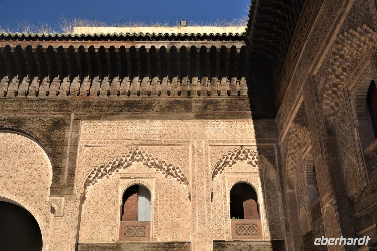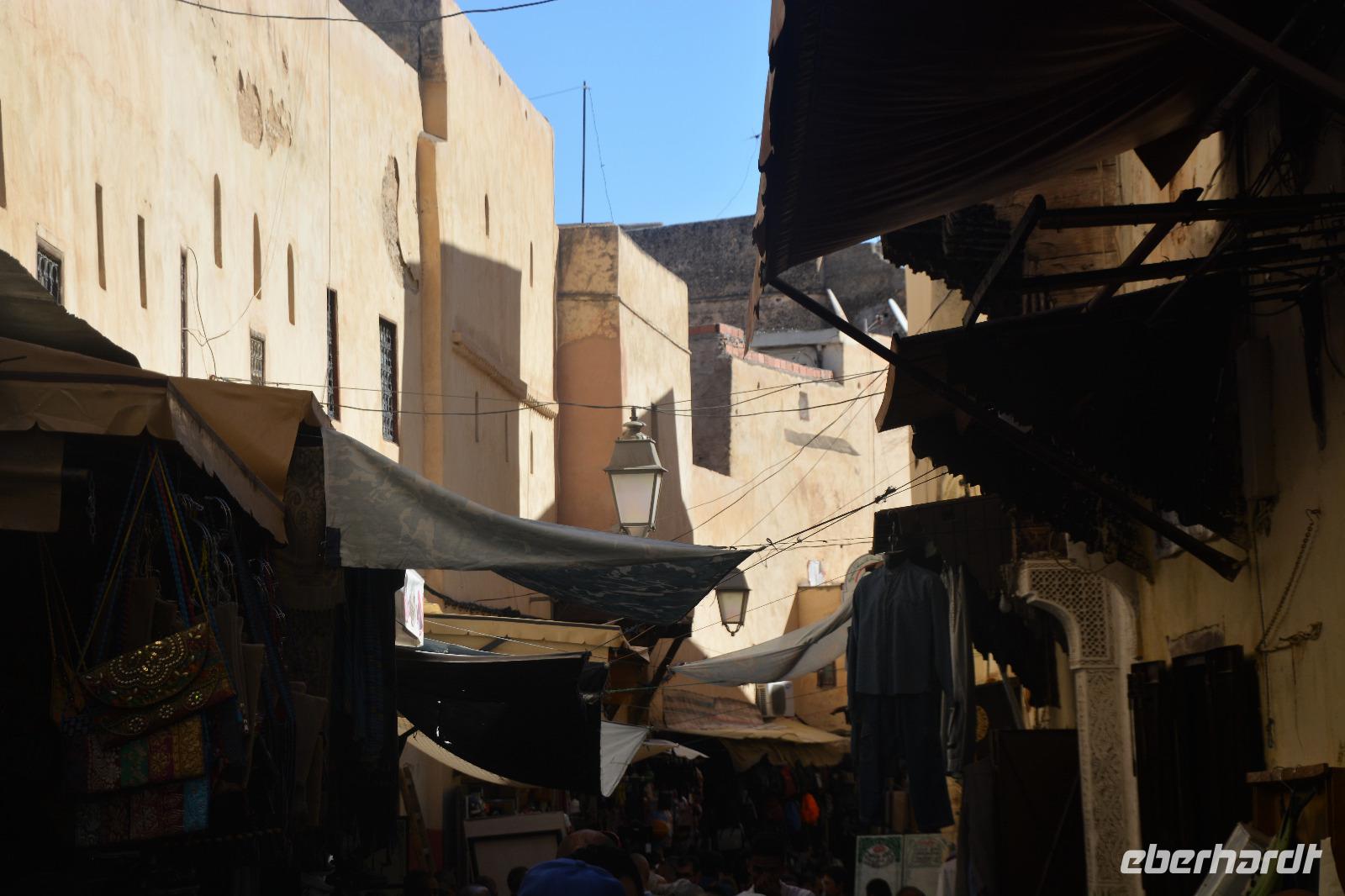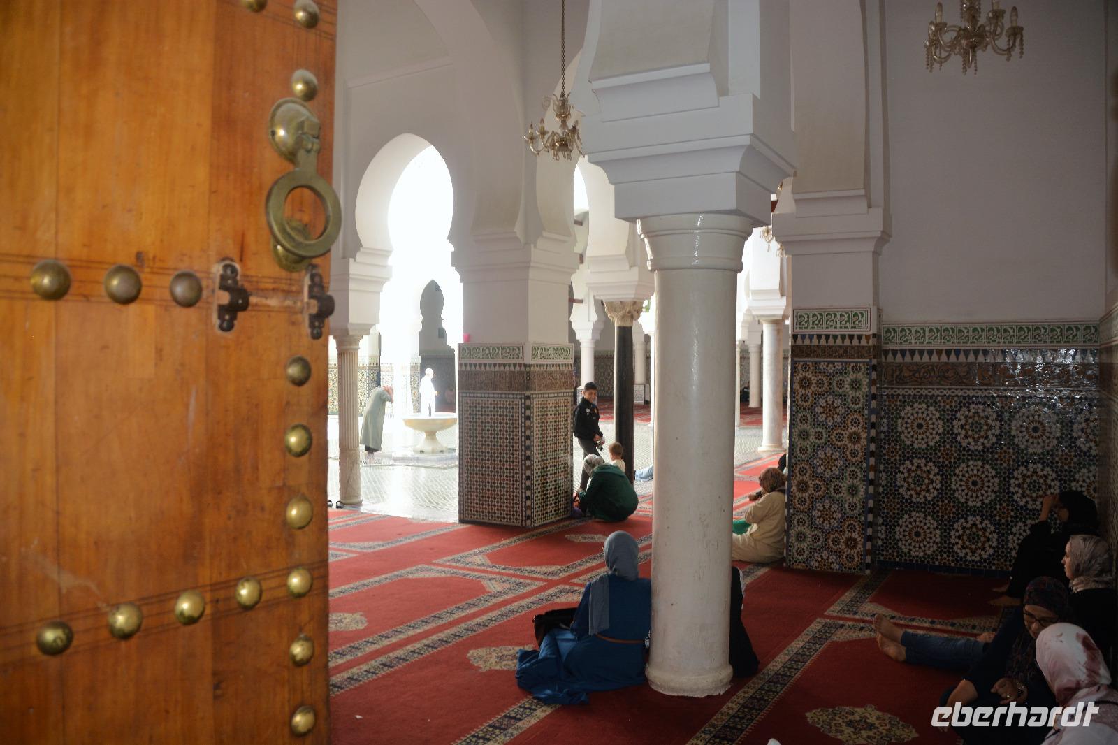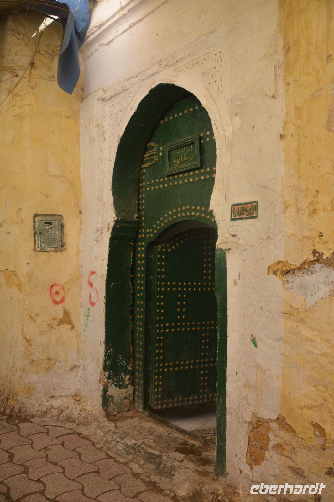 Am "Bab Boujeloud", eines der Eingangstore zur Medina, verlassen wir unseren Bus. Ab hier geht es zu Fuß weiter. Wir gehen leicht bergab und gelangen zuerst zu einer der berühmtesten Koranschulen von Fes, der "Medersa Bou Inania". Schön sind die Holzdecken, die zellige-Wände und die Stuckarbeiten. Diese 3 Dinge sind die wichtigsten Gestaltungselemente der marokkanischen Baukunst. Hier in dieser Koranschule kamen in früheren Zeiten Studenten, um den Koran zu studieren und haben hier gleichzeitig gewohnt. Im heiligen Bezirk können wir einen Blick in den Hof des Grabes von "Idris II". und der "Qarawiyine Moschee", der wichtigsten Moschee von Fes werfen. Am Eingang werden Kerzen und andere Devotionalien verkauft.