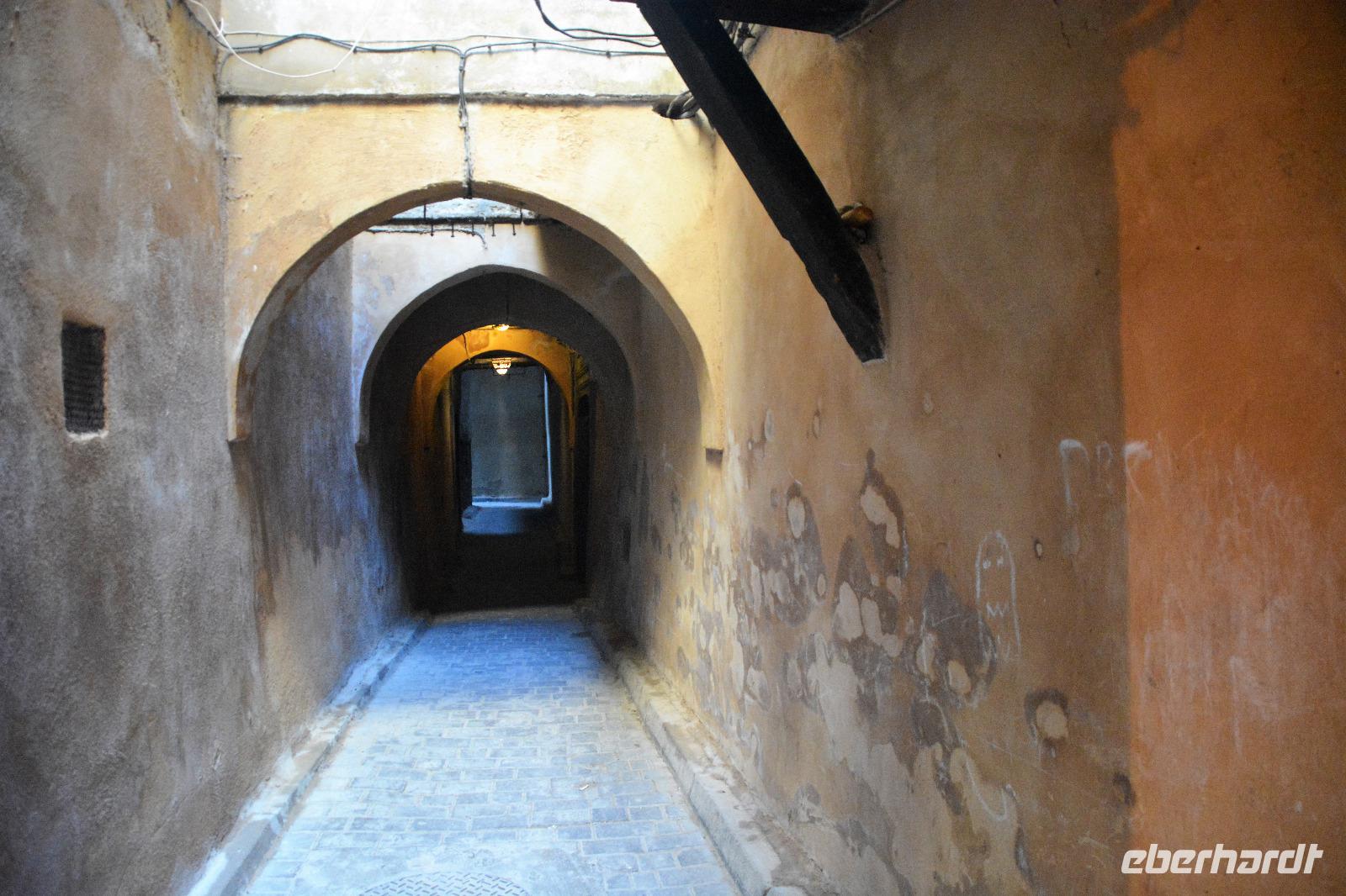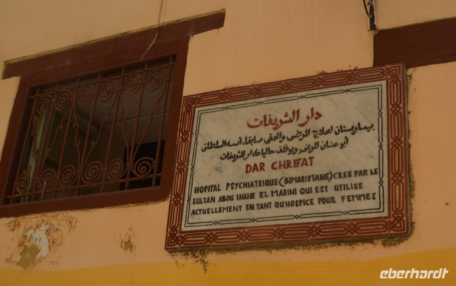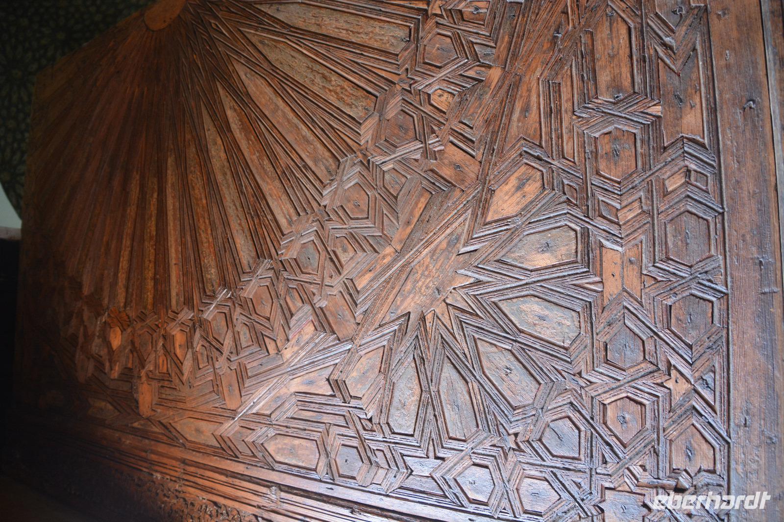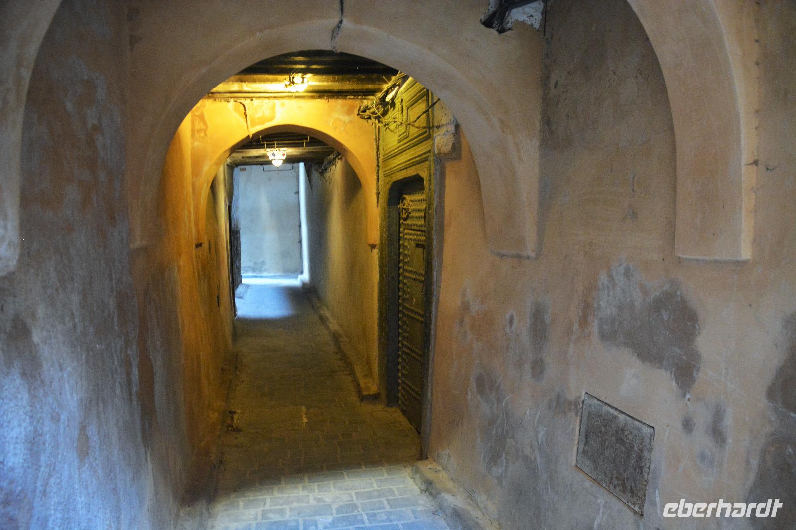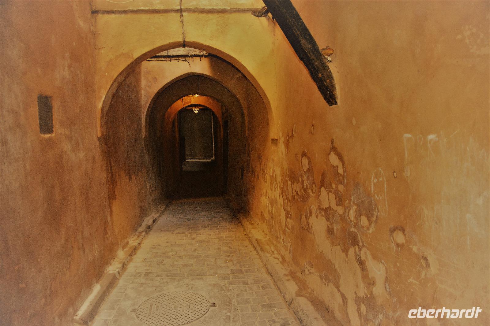 Am "Bab Boujeloud", eines der Eingangstore zur Medina, verlassen wir unseren Bus. Ab hier geht es zu Fuß weiter. Wir gehen leicht bergab und gelangen zuerst zu einer der berühmtesten Koranschulen von Fes, der "Medersa Bou Inania". Schön sind die Holzdecken, die zellige-Wände und die Stuckarbeiten. Diese 3 Dinge sind die wichtigsten Gestaltungselemente der marokkanischen Baukunst. Hier in dieser Koranschule kamen in früheren Zeiten Studenten, um den Koran zu studieren und haben hier gleichzeitig gewohnt. Im heiligen Bezirk können wir einen Blick in den Hof des Grabes von "Idris II". und der "Qarawiyine Moschee", der wichtigsten Moschee von Fes werfen. Am Eingang werden Kerzen und andere Devotionalien verkauft.