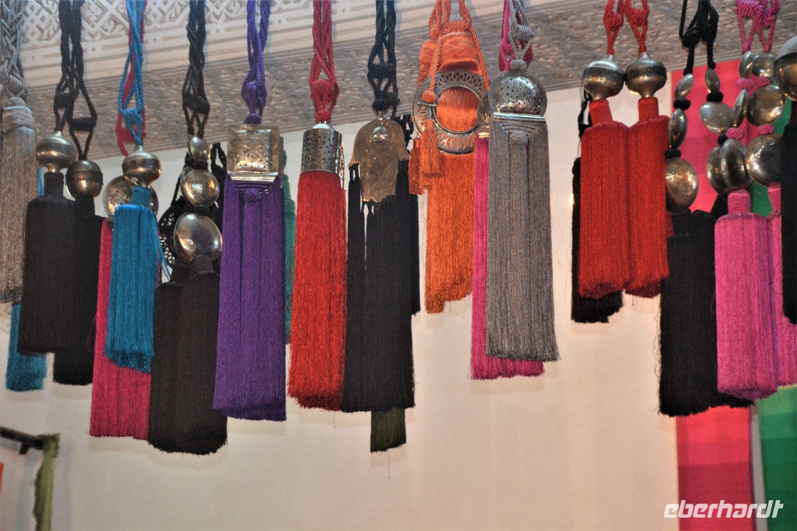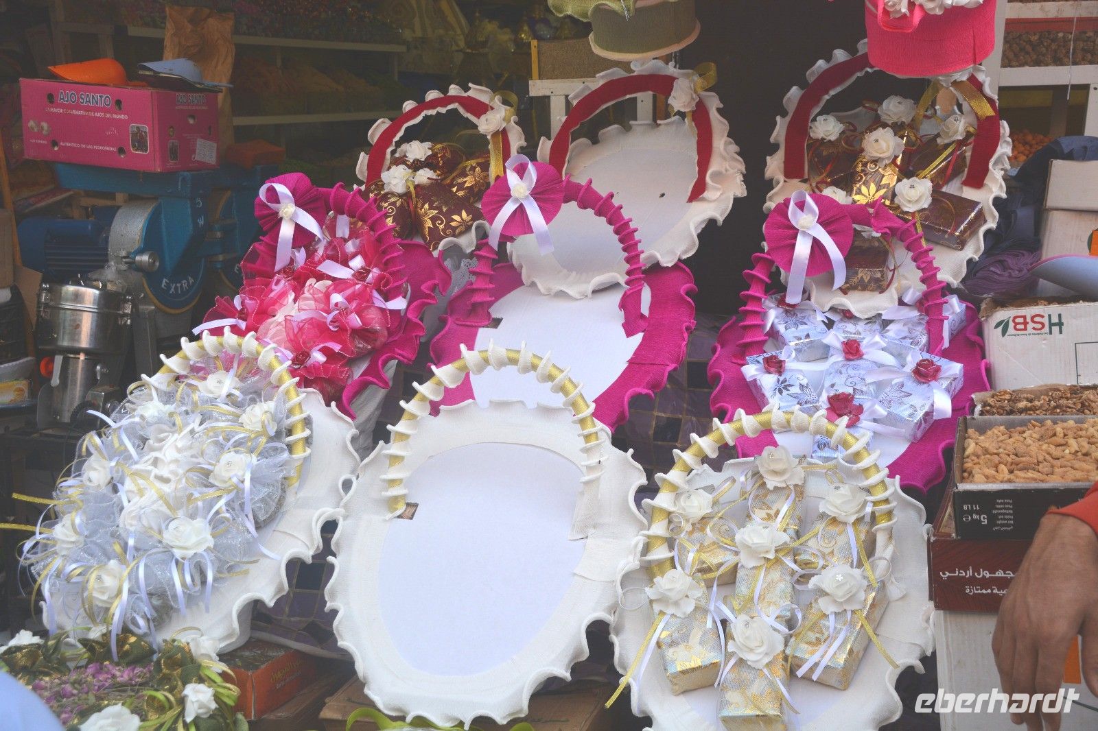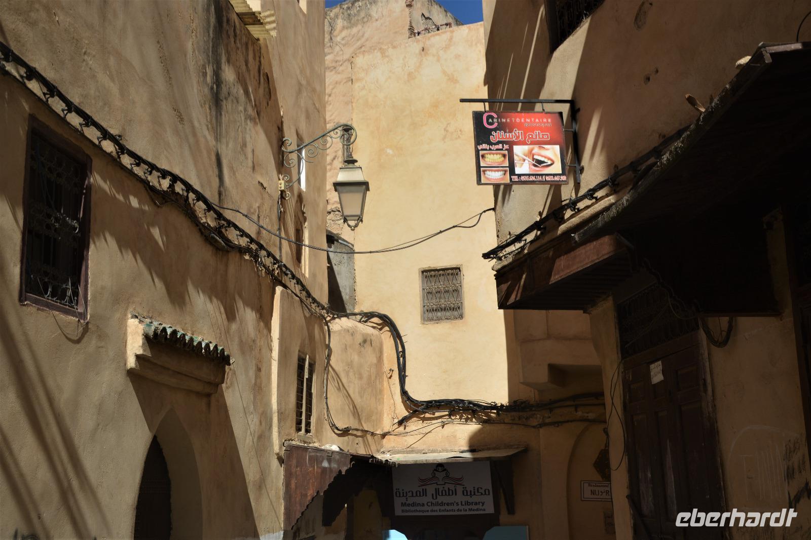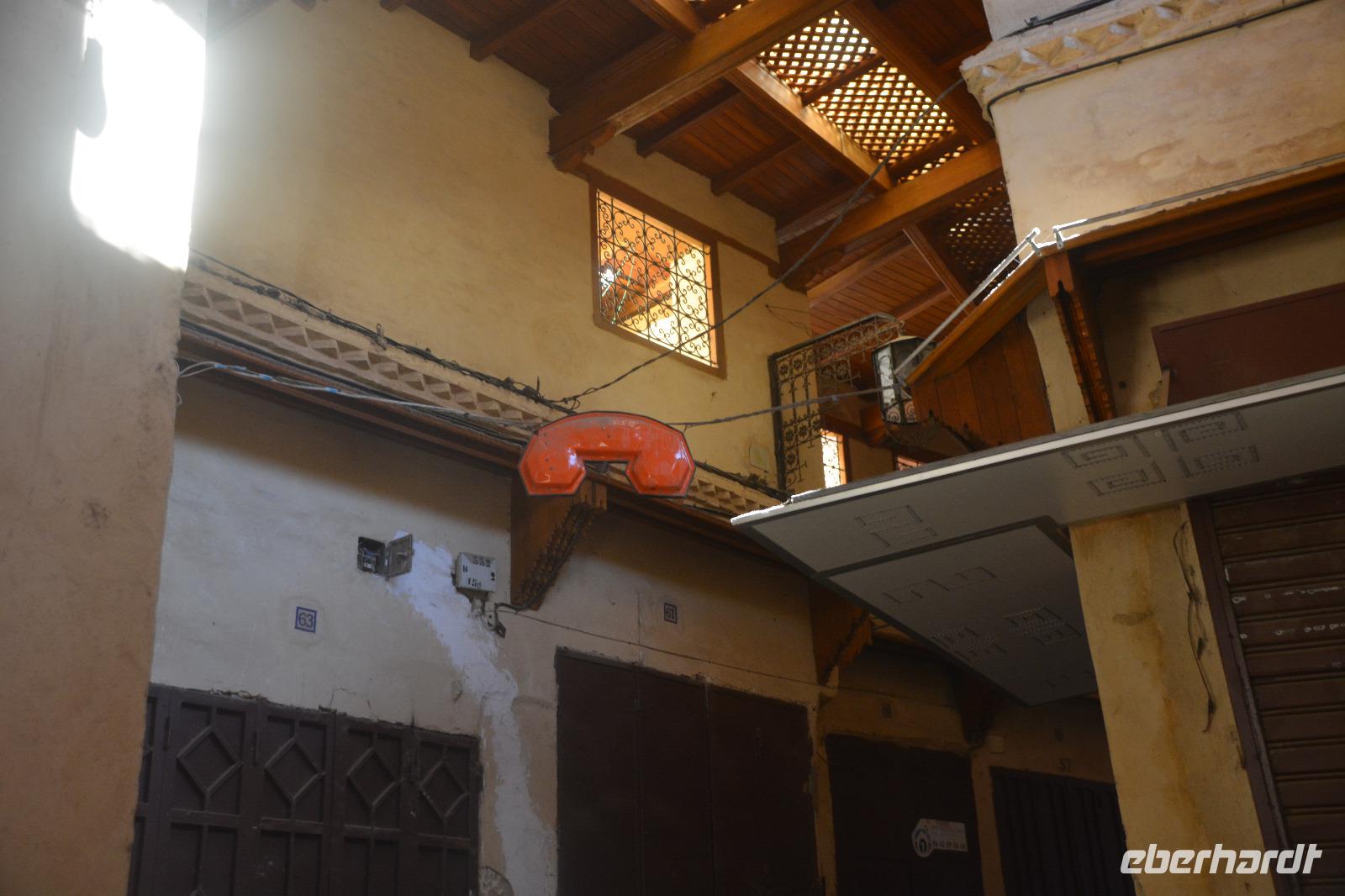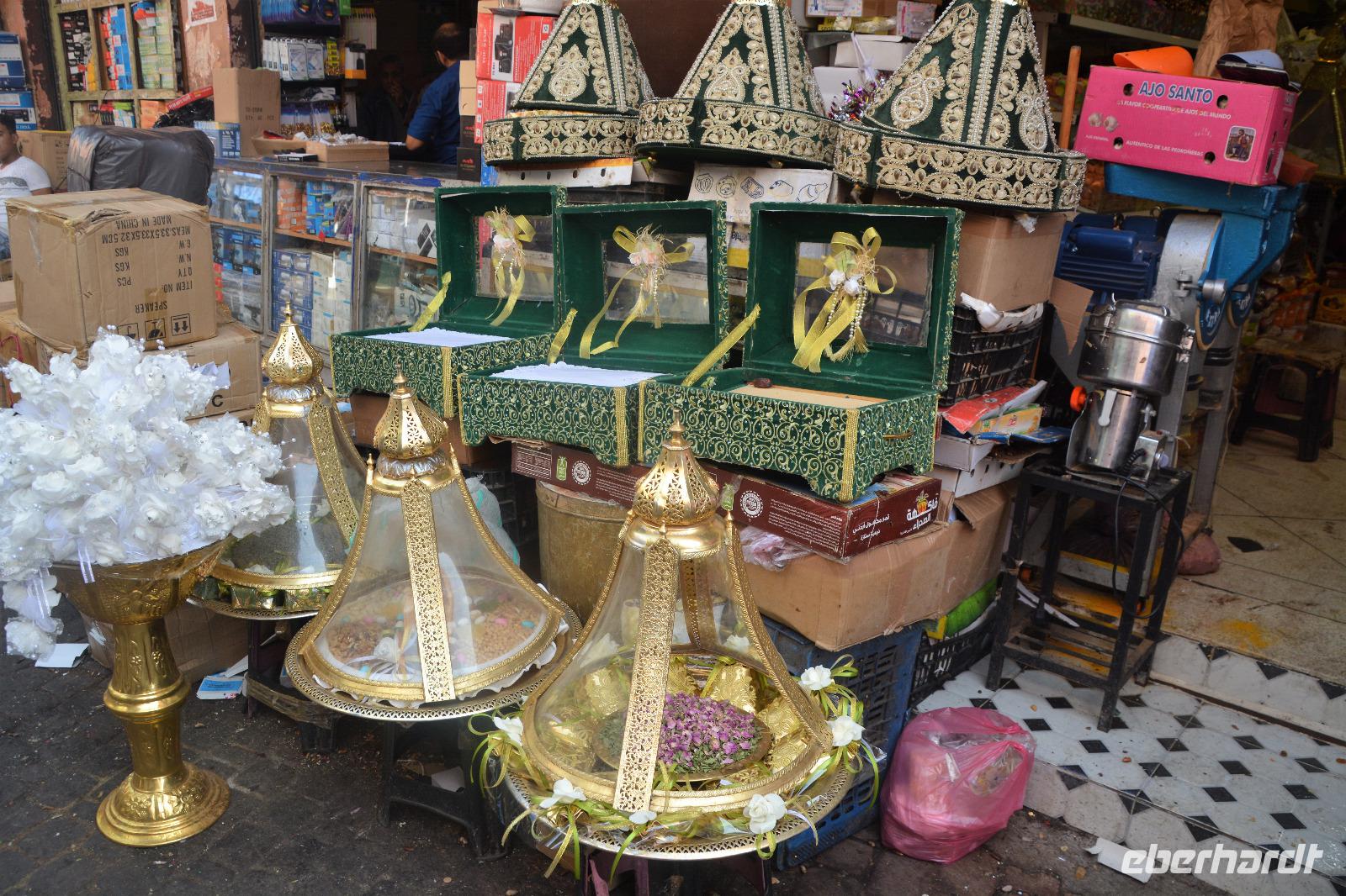 Am "Bab Boujeloud", eines der Eingangstore zur Medina, verlassen wir unseren Bus. Ab hier geht es zu Fuß weiter. Wir gehen leicht bergab und gelangen zuerst zu einer der berühmtesten Koranschulen von Fes, der "Medersa Bou Inania". Schön sind die Holzdecken, die zellige-Wände und die Stuckarbeiten. Diese 3 Dinge sind die wichtigsten Gestaltungselemente der marokkanischen Baukunst. Hier in dieser Koranschule kamen in früheren Zeiten Studenten, um den Koran zu studieren und haben hier gleichzeitig gewohnt. Im heiligen Bezirk können wir einen Blick in den Hof des Grabes von "Idris II". und der "Qarawiyine Moschee", der wichtigsten Moschee von Fes werfen. Am Eingang werden Kerzen und andere Devotionalien verkauft.