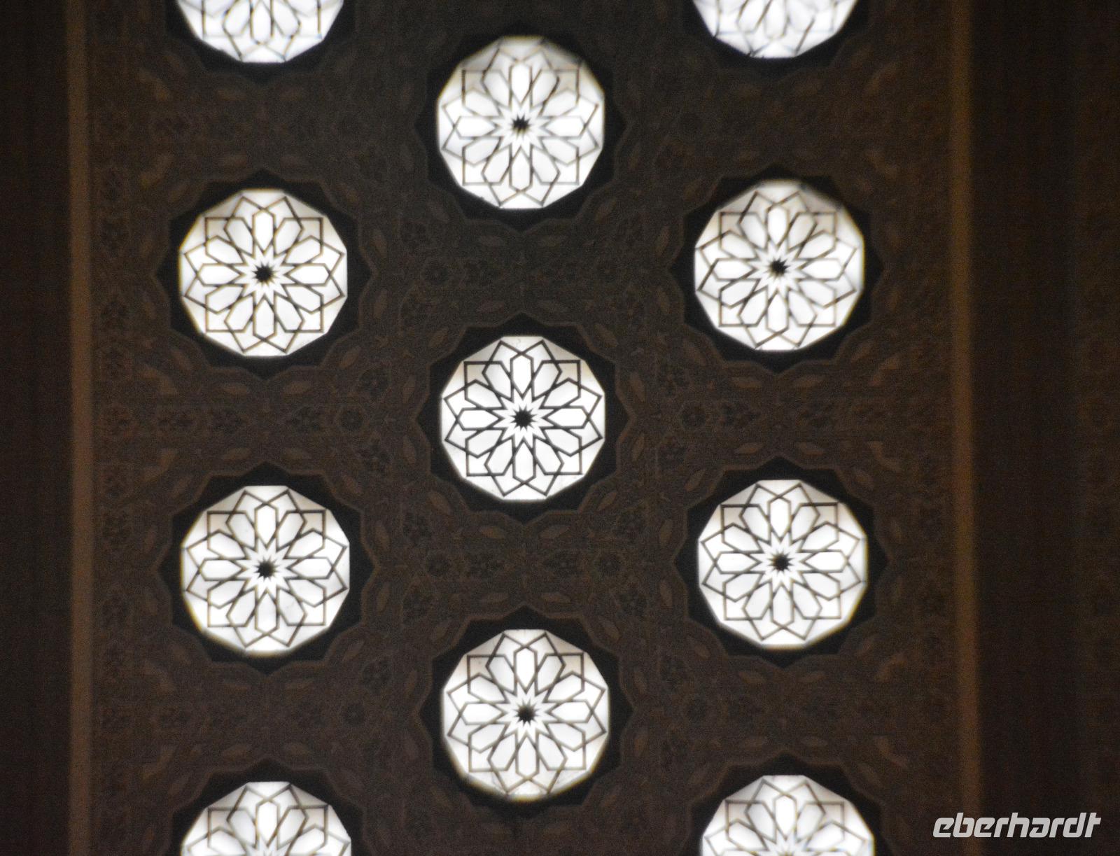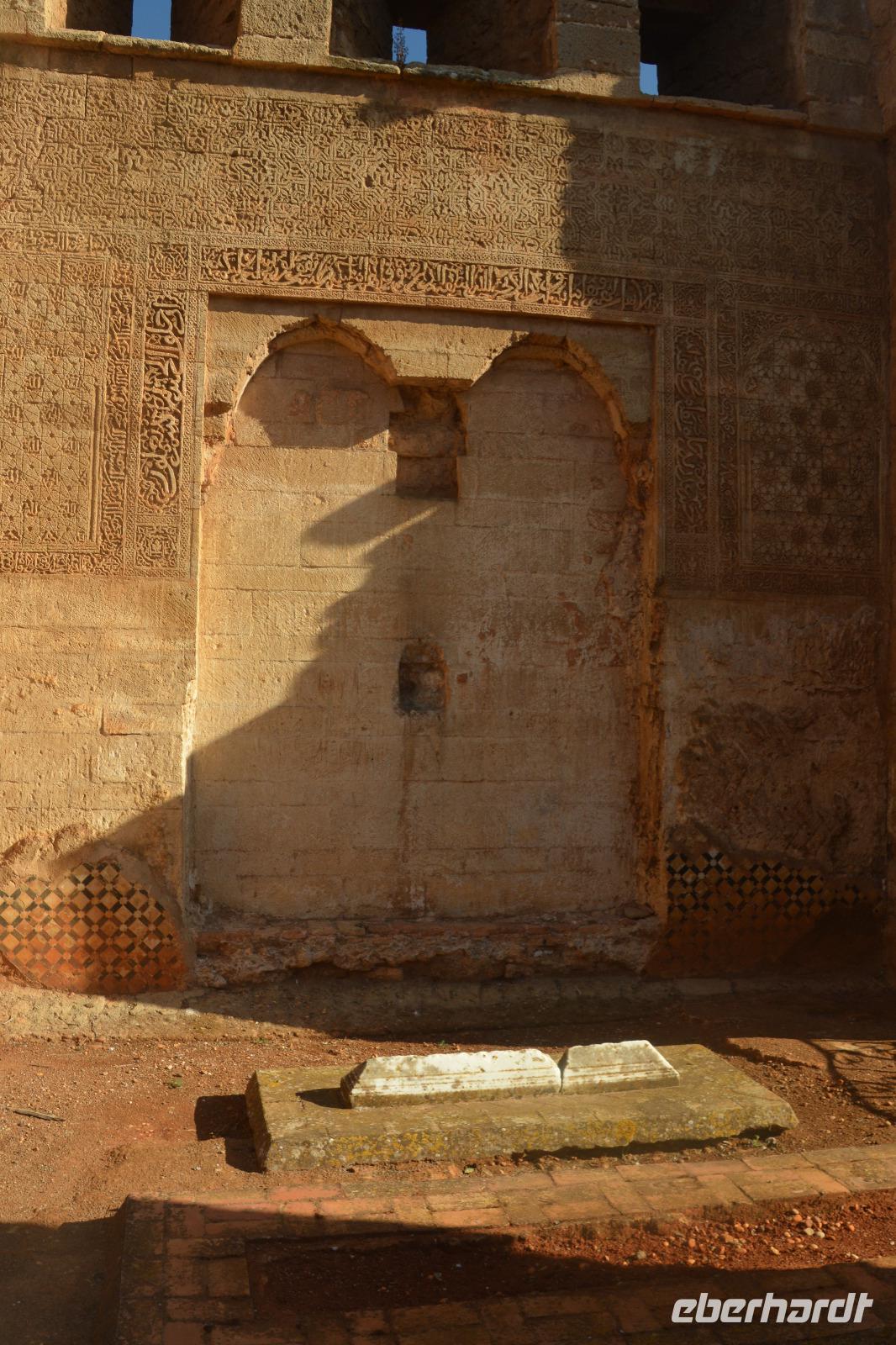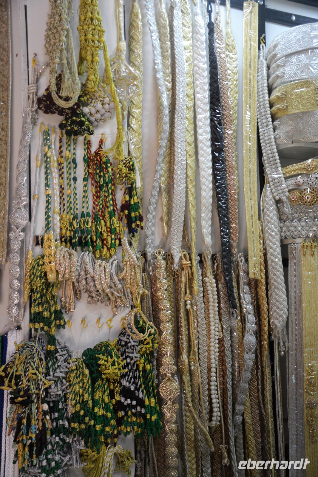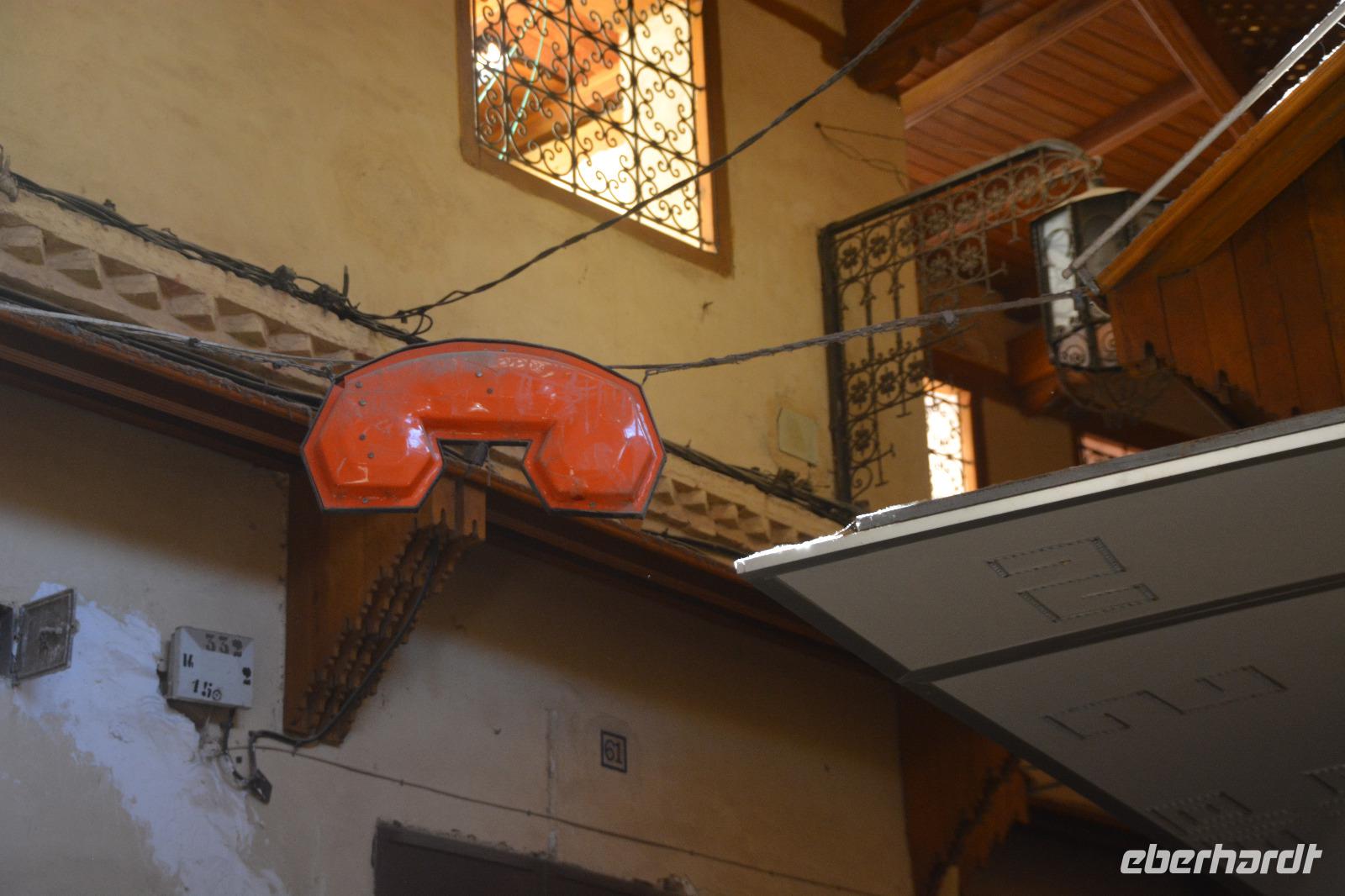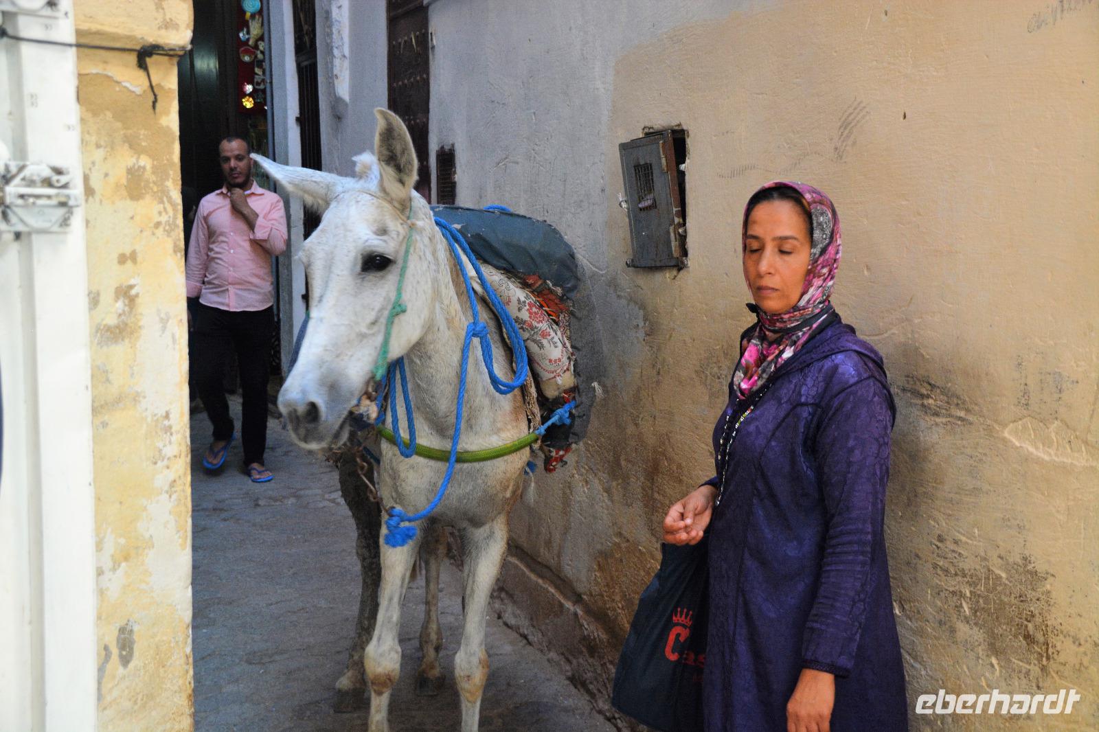 Am "Bab Boujeloud", eines der Eingangstore zur Medina, verlassen wir unseren Bus. Ab hier geht es zu Fuß weiter. Wir gehen leicht bergab und gelangen zuerst zu einer der berühmtesten Koranschulen von Fes, der "Medersa Bou Inania". Schön sind die Holzdecken, die zellige-Wände und die Stuckarbeiten. Diese 3 Dinge sind die wichtigsten Gestaltungselemente der marokkanischen Baukunst. Hier in dieser Koranschule kamen in früheren Zeiten Studenten, um den Koran zu studieren und haben hier gleichzeitig gewohnt. Im heiligen Bezirk können wir einen Blick in den Hof des Grabes von "Idris II". und der "Qarawiyine Moschee", der wichtigsten Moschee von Fes werfen. Am Eingang werden Kerzen und andere Devotionalien verkauft.