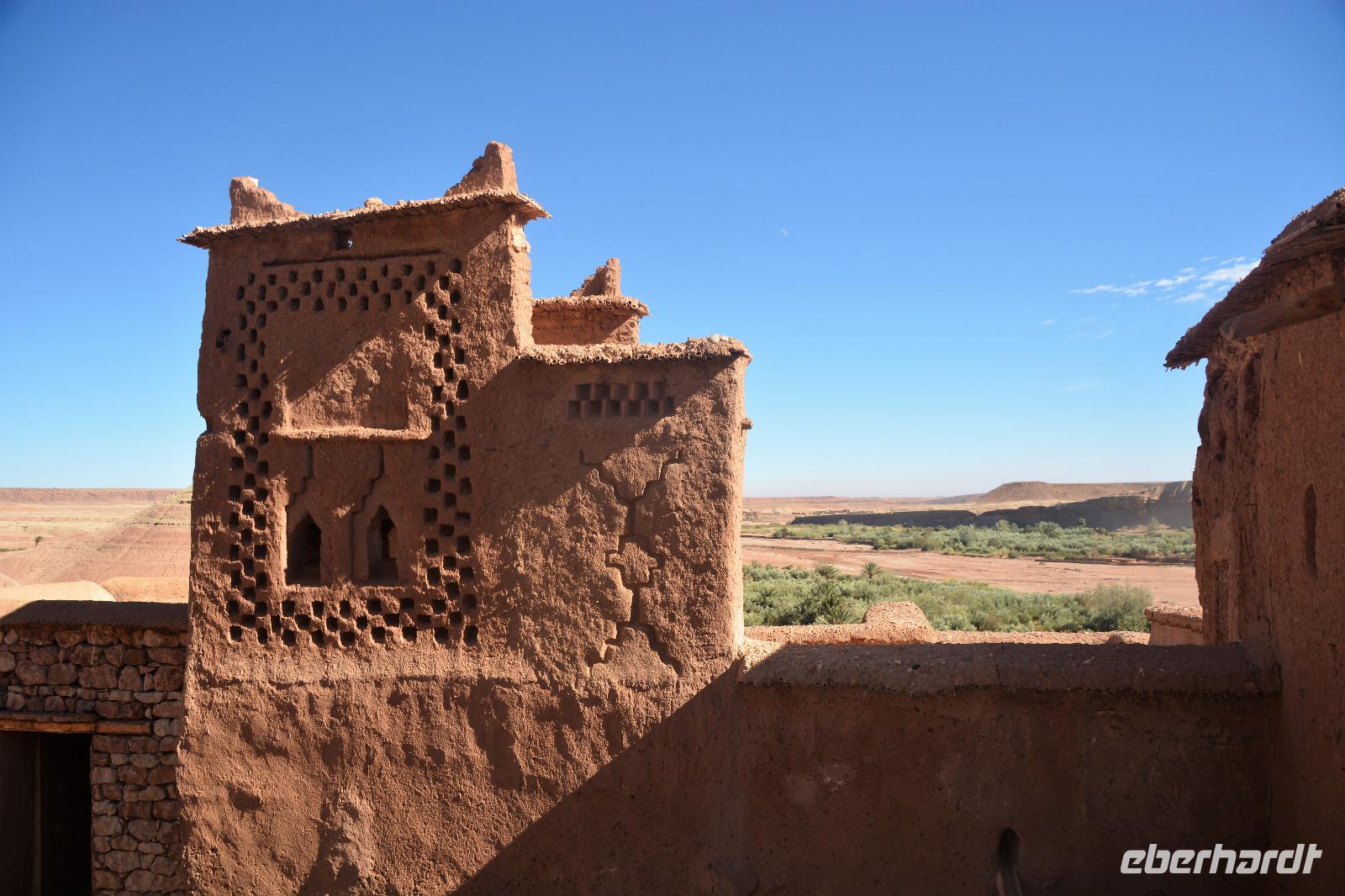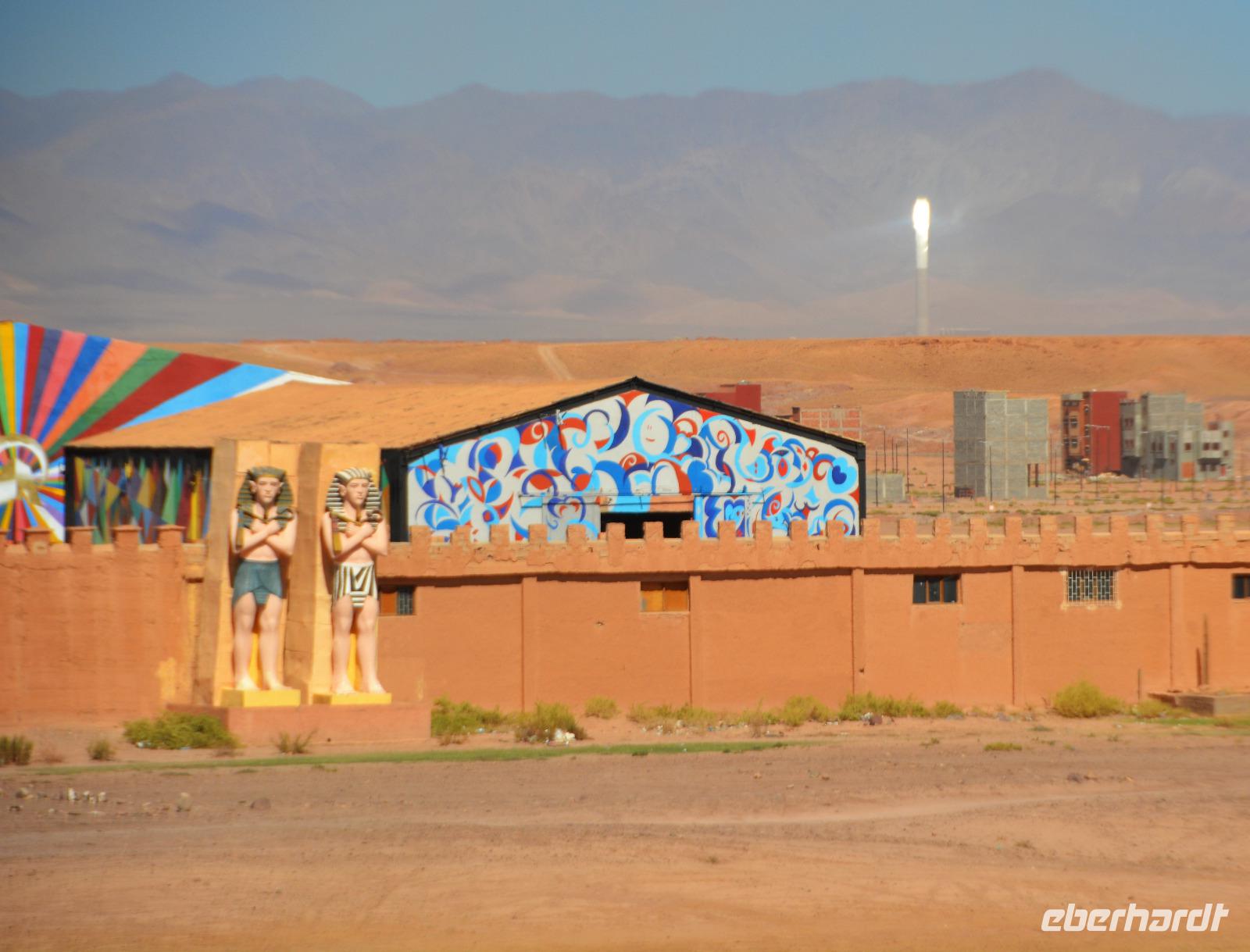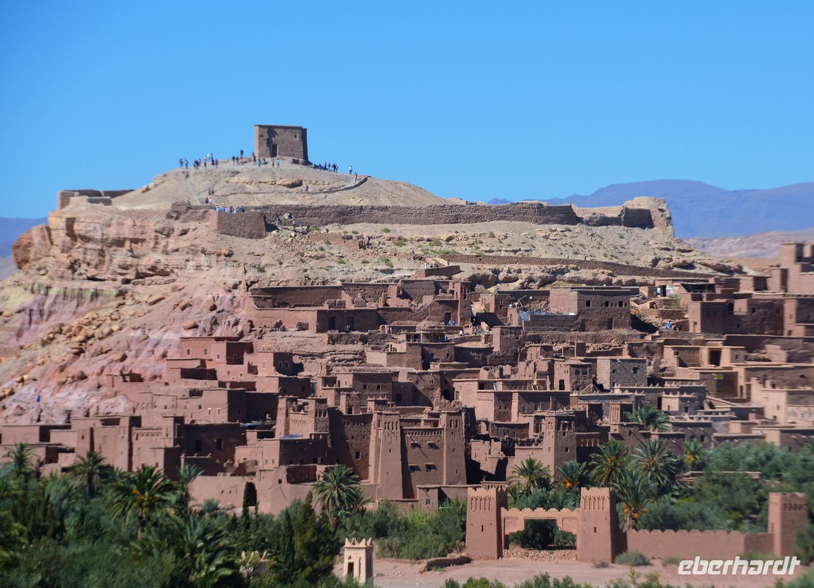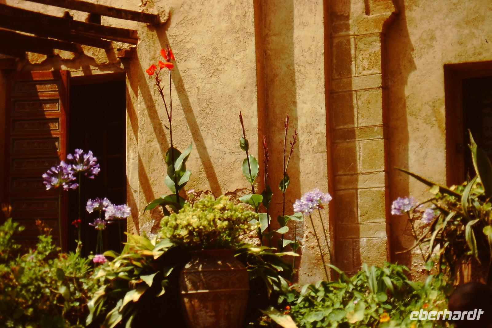 Heute nehmen wir die nächste Schlucht in Angriff. Wieder ist der Morgen empfindlich kühl und in der Dades-Schlucht ist es noch schattig. Die Einheimischen, die uns begegnen sind auch entsprechend warm angezogen. Wir fahren über schwindelerregende Kehren bis noch oben und geniessen bei einem spendierten Pfefferminztee die spektakuläre Aussicht. Durch das Tal der Rosen fahren wir weiter. Hier wird in jedem Frühjahr das berühmte Rosenfest gefeiert. Aus der Damaszener-Rose wird das kostbare Rosenöl und Rosenwasser gewonnen, beides Grundstoffe für die Kosmetik- und Parfumherstellung. Wir decken uns in einem Geschäft mit diesen wohlriechenden Produkten ein. Die Rosenblätter werden in Marokko sehr oft als Dekoration auf den Tischen in Restaurants oder Geschäften verwendet. Nach einer Fahrt vorbei an zahlreichen Kasbahs kommen wir in der Filmstadt Quarzazate an. Europäische und Amerikanische Filmproduktionen haben Marokko schon sehr lange als Drehort auserkoren. Die Landschaft ist vielfältig, die Statisten preiswert und das Rundum ist angenehm. Das dachten auch Regisseure wie Scorcese und Bertolucci. Diverse Filmstudios haben in den letzten Jahren ihre Studios ausgebaut. Früher "Tor zur Wüste" genannt lebt die Stadt heute vorwiegend von der Filmindustrie. Ein Highlight ist einer der Orte, der früher ein wichtiger Stützpunkt auf dem Weg der Karawanen von Quarzazate in den Norden des Landes war, die "Kasbah Ait Benhaddou" am Rivière Salé (Salzfluss) gelegen. Dieser Fluss wird so genannt, da durch flussaufwärts liegende Salzminen das Wasser salzig ist. Früher bei Hochwasser von der Außenwelt abgeschnitten, hat man den neuen Ort am diesseitigen Ufer gebaut. Die alte Kasbah wird durch die UNESCO geschützt und deshalb aufwändig restauriert. Wir gehen über die neue Brücke und entdecken am Eingang einen interessanten Künstler, der Bilder mit unsichtbarer Farbe und Feuer malt. Einige von uns werden auf dem Rückweg ein Bild von ihm kaufen. Der größte Teil der Gruppe geht mit Gina hinauf zum ehemaligen Gemeinschaftsspeicher. Dort wurden in alten Zeiten die Nahrungsmittel vor Überfällen geschützt aufbewahrt. Es ist heiss und es ist sehr sehr windig. Oben werden wir fast davongeweht, können aber trotzdem noch einen Blick in Richtung der alten Karawanenroute nach Norden werfen. Sie ging vorbei an der einzigen Süßwasserquelle die durch ein Marabout (Heiligengrab) erkennbar ist. Quellen waren für die Karawanen von einst wichtige Raststationen. Auch wir brauchen eine Rast und die werden wir heute in einem ziemlich neu ausgebautem Kasbah-Hotel bekommen. Schnell umfängt uns die ruhige Atmosphäre dieses idyllischen Hotels. Die feindliche und unwirtliche Wüste bleibt draußen. Wir sind in einem grünen Garten mit Wasserbrunnen. Jedes der verteilten Zimmer ist ein wenig anders, was aus der Bauart dieser alten Behausungen resultiert, war doch eine Kasbah ein Domizil für eine ganze Sippe und gehörte einem Anführer der im Stamm etwas zu sagen hatte. Wir genießen den Abend und wissen, daß das alles bald Erinnerung sein wird.