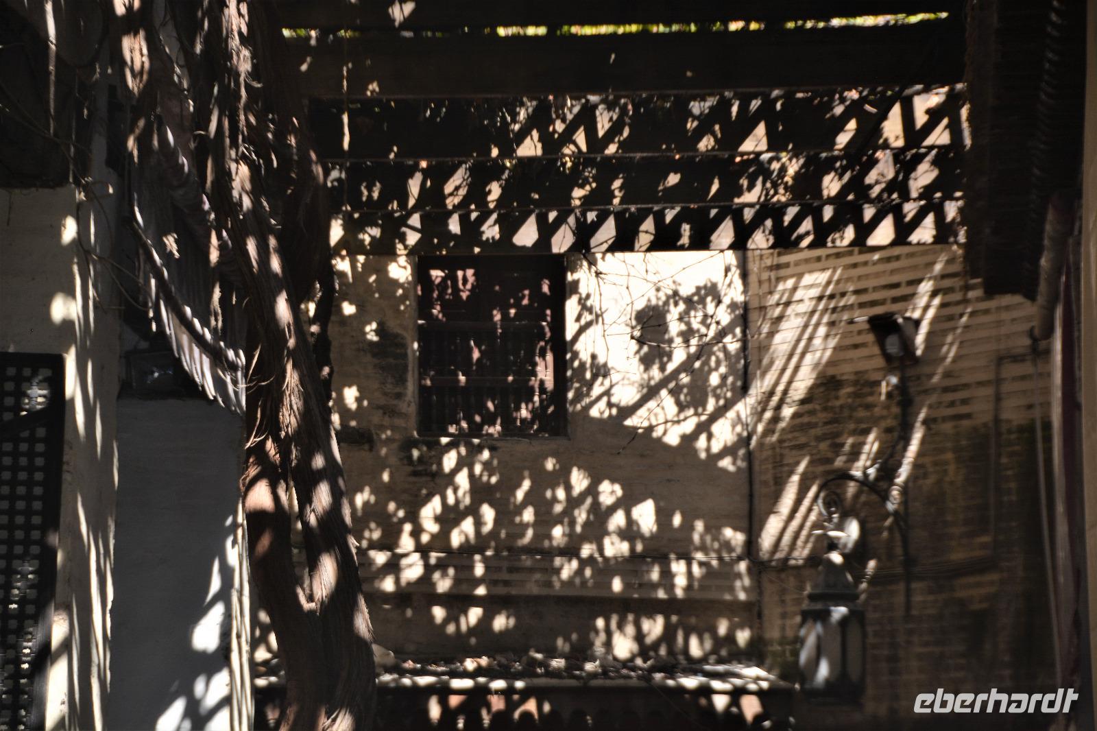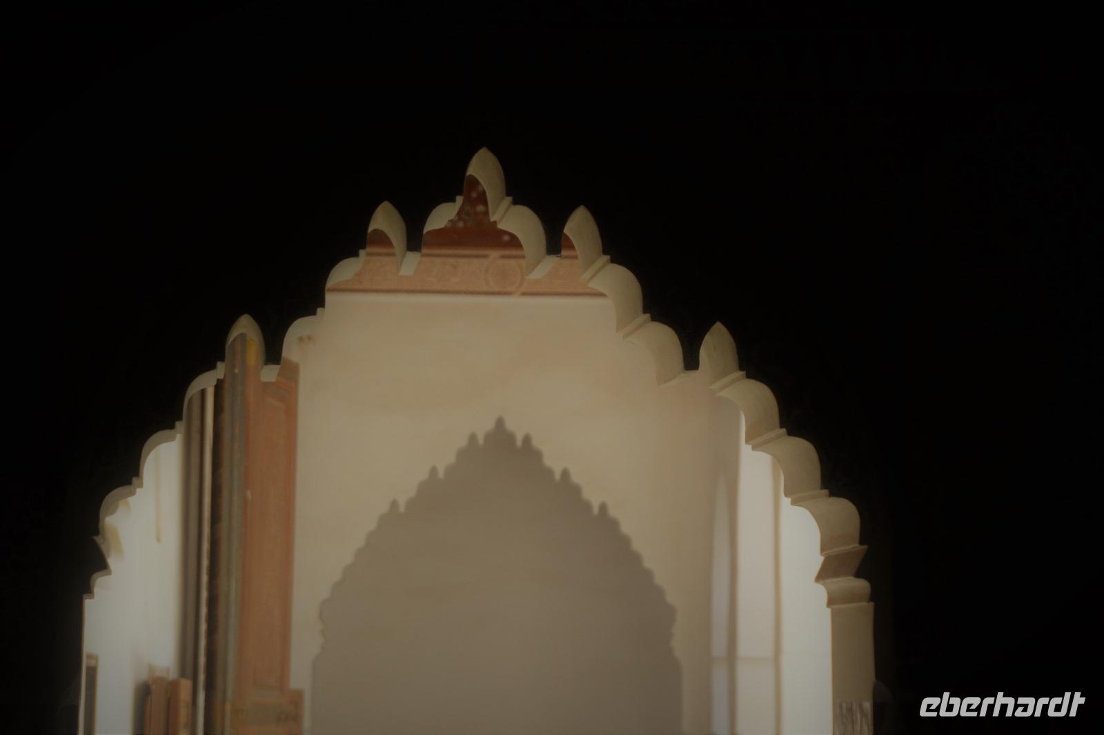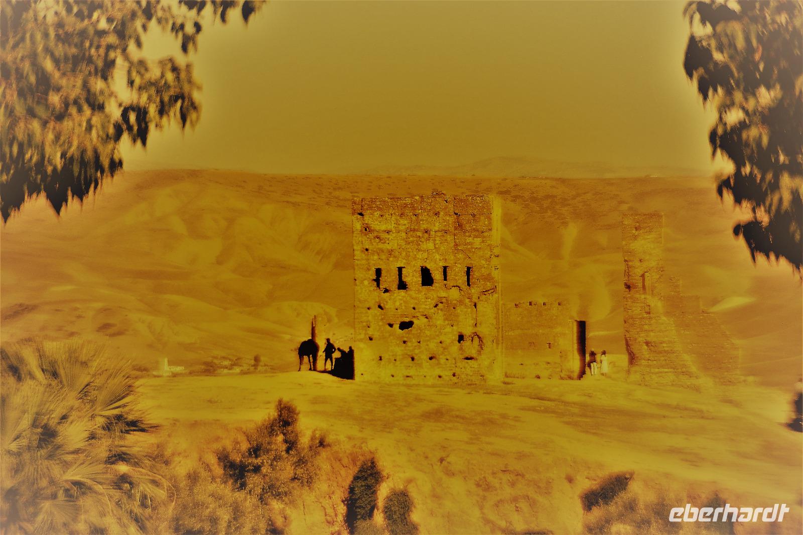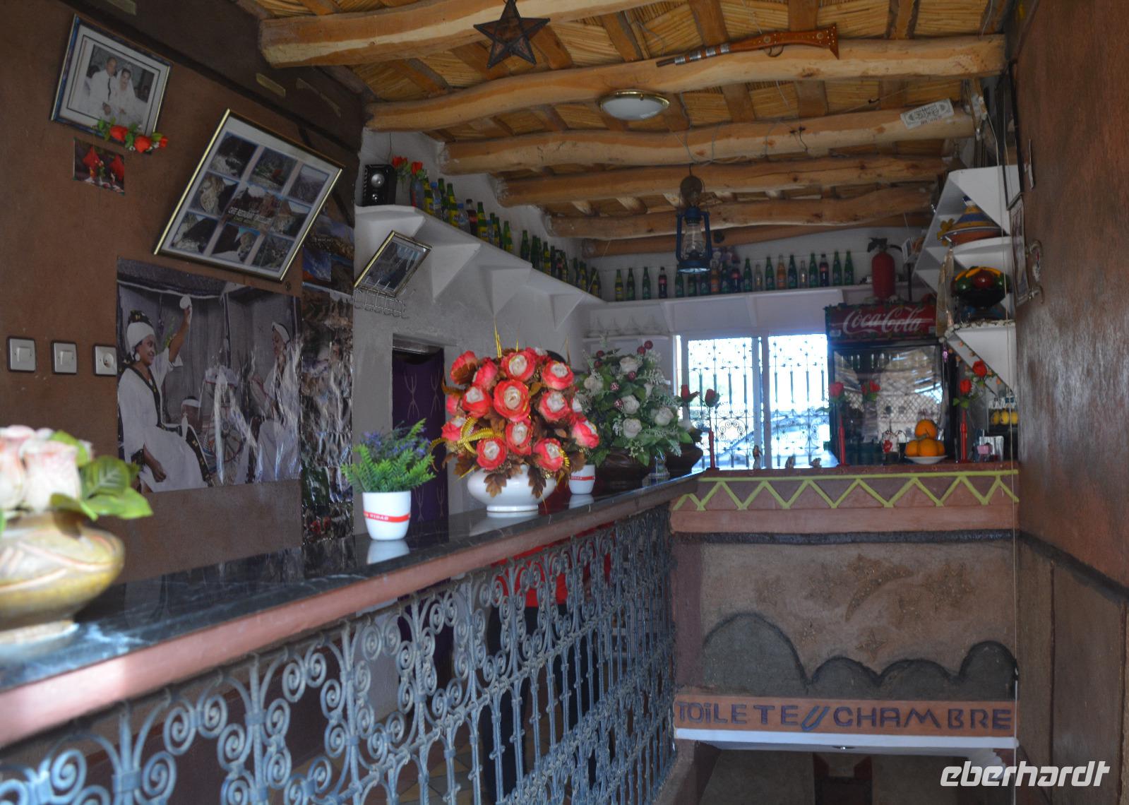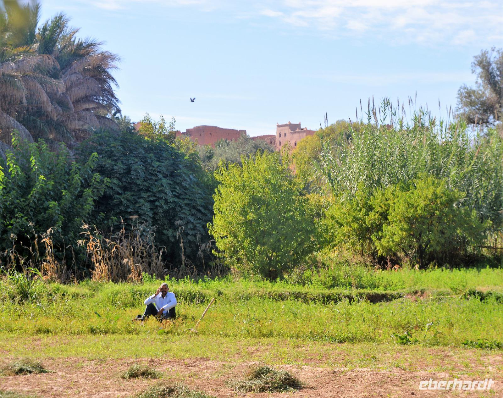 Heute nehmen wir die nächste Schlucht in Angriff. Wieder ist der Morgen empfindlich kühl und in der Dades-Schlucht ist es noch schattig. Die Einheimischen, die uns begegnen sind auch entsprechend warm angezogen. Wir fahren über schwindelerregende Kehren bis noch oben und geniessen bei einem spendierten Pfefferminztee die spektakuläre Aussicht. Durch das Tal der Rosen fahren wir weiter. Hier wird in jedem Frühjahr das berühmte Rosenfest gefeiert. Aus der Damaszener-Rose wird das kostbare Rosenöl und Rosenwasser gewonnen, beides Grundstoffe für die Kosmetik- und Parfumherstellung. Wir decken uns in einem Geschäft mit diesen wohlriechenden Produkten ein. Die Rosenblätter werden in Marokko sehr oft als Dekoration auf den Tischen in Restaurants oder Geschäften verwendet. Nach einer Fahrt vorbei an zahlreichen Kasbahs kommen wir in der Filmstadt Quarzazate an. Europäische und Amerikanische Filmproduktionen haben Marokko schon sehr lange als Drehort auserkoren. Die Landschaft ist vielfältig, die Statisten preiswert und das Rundum ist angenehm. Das dachten auch Regisseure wie Scorcese und Bertolucci. Diverse Filmstudios haben in den letzten Jahren ihre Studios ausgebaut. Früher "Tor zur Wüste" genannt lebt die Stadt heute vorwiegend von der Filmindustrie. Ein Highlight ist einer der Orte, der früher ein wichtiger Stützpunkt auf dem Weg der Karawanen von Quarzazate in den Norden des Landes war, die "Kasbah Ait Benhaddou" am Rivière Salé (Salzfluss) gelegen. Dieser Fluss wird so genannt, da durch flussaufwärts liegende Salzminen das Wasser salzig ist. Früher bei Hochwasser von der Außenwelt abgeschnitten, hat man den neuen Ort am diesseitigen Ufer gebaut. Die alte Kasbah wird durch die UNESCO geschützt und deshalb aufwändig restauriert. Wir gehen über die neue Brücke und entdecken am Eingang einen interessanten Künstler, der Bilder mit unsichtbarer Farbe und Feuer malt. Einige von uns werden auf dem Rückweg ein Bild von ihm kaufen. Der größte Teil der Gruppe geht mit Gina hinauf zum ehemaligen Gemeinschaftsspeicher. Dort wurden in alten Zeiten die Nahrungsmittel vor Überfällen geschützt aufbewahrt. Es ist heiss und es ist sehr sehr windig. Oben werden wir fast davongeweht, können aber trotzdem noch einen Blick in Richtung der alten Karawanenroute nach Norden werfen. Sie ging vorbei an der einzigen Süßwasserquelle die durch ein Marabout (Heiligengrab) erkennbar ist. Quellen waren für die Karawanen von einst wichtige Raststationen. Auch wir brauchen eine Rast und die werden wir heute in einem ziemlich neu ausgebautem Kasbah-Hotel bekommen. Schnell umfängt uns die ruhige Atmosphäre dieses idyllischen Hotels. Die feindliche und unwirtliche Wüste bleibt draußen. Wir sind in einem grünen Garten mit Wasserbrunnen. Jedes der verteilten Zimmer ist ein wenig anders, was aus der Bauart dieser alten Behausungen resultiert, war doch eine Kasbah ein Domizil für eine ganze Sippe und gehörte einem Anführer der im Stamm etwas zu sagen hatte. Wir genießen den Abend und wissen, daß das alles bald Erinnerung sein wird.