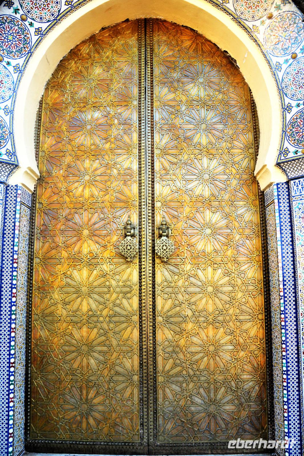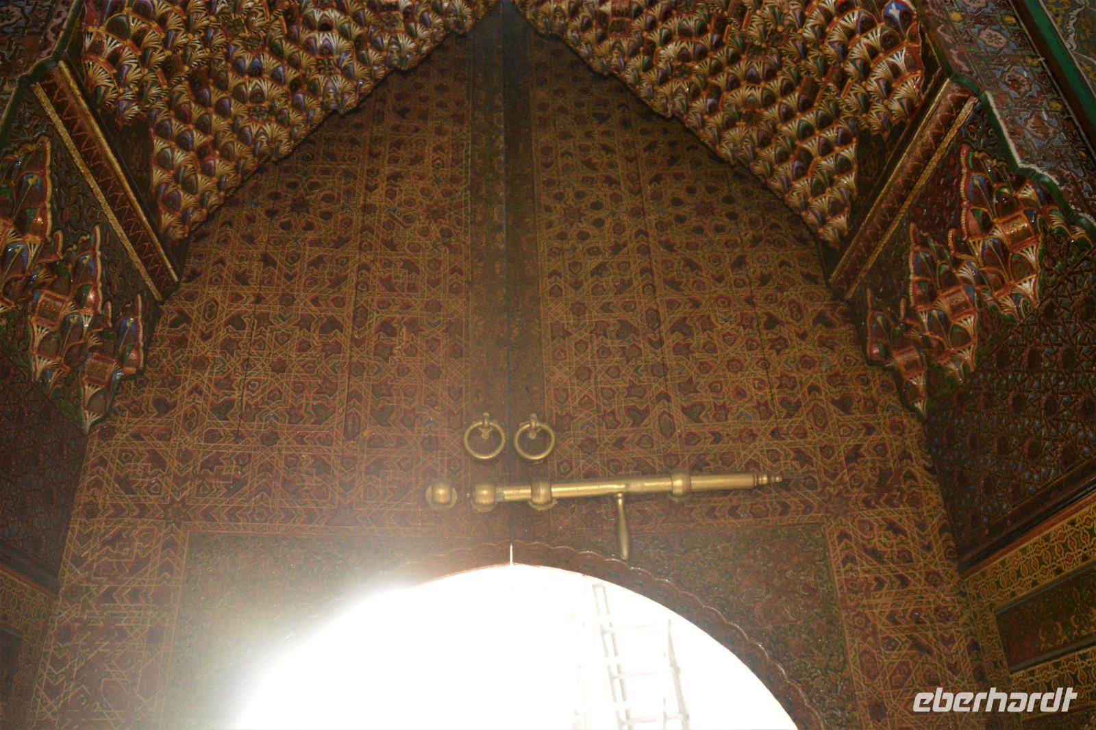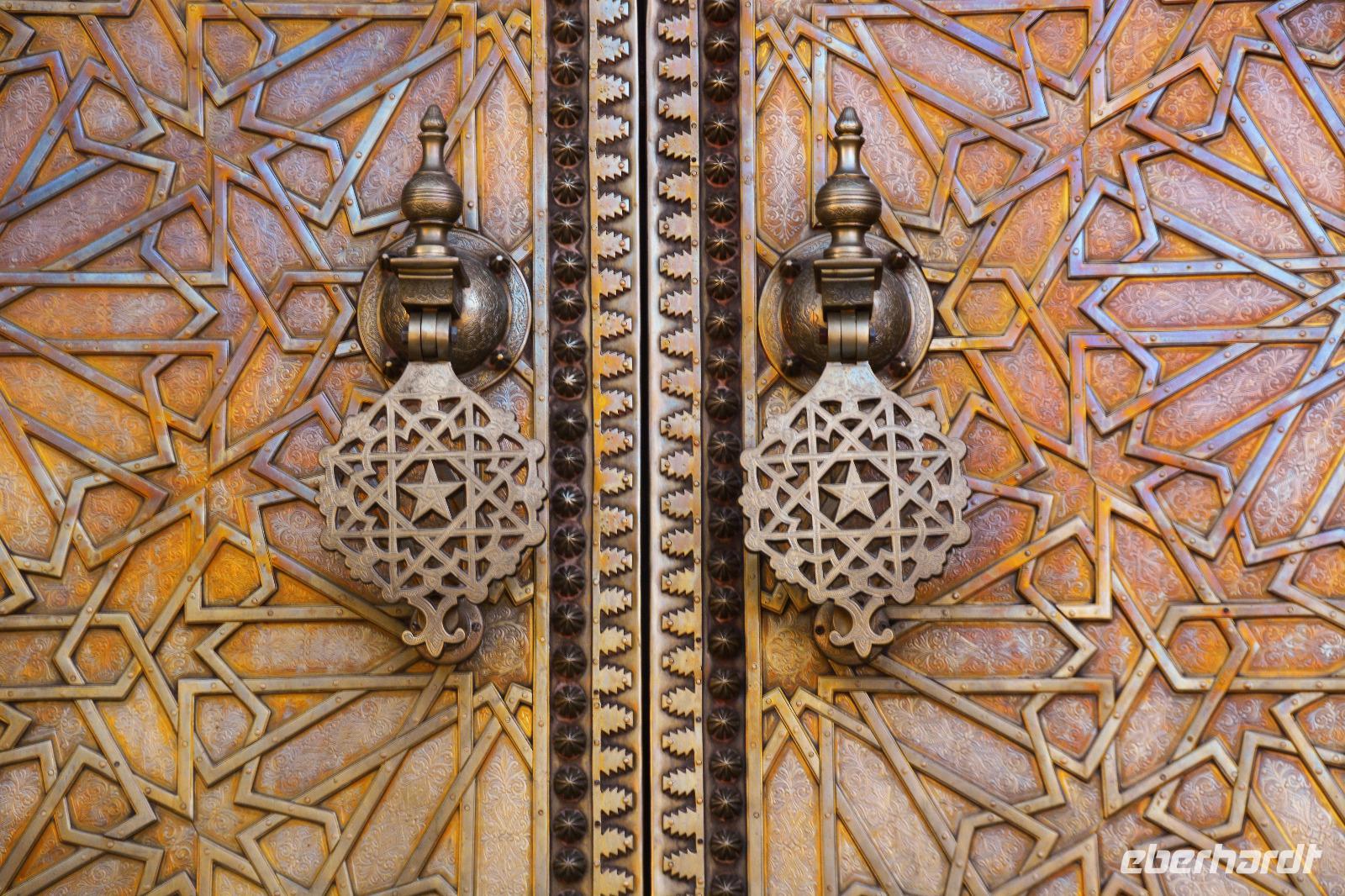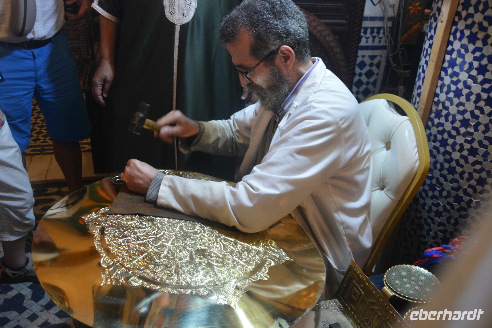 Früh beginnen wir unsere Besichtigung. Wir fahren zum Königspalast mit seinen wunderbar gearbeiteten Toren. Auf den Bronzedekoren ist das Spinnennetz Gottes, ein häufiges Ornament in der islamischen Welt, zu bewundern. Hier neben dem Eingang des Palastes beginnt die "Mellah", das ehemals jüdische Viertel von Fes. Der Name "Mellah" stammt aus einer Zeit, als die jüdische Bevölkerung, die eine wichtige Bevölkerungsgruppe in Marokko war, sich noch mit dem Salzhandel beschäftigte, denn "melh" bedeutet Salz. Wir besuchen eine Werkstatt wo uns die Bearbeitung der Bronze und die Unterschiede zwischen Blech und Bronze gezeigt werden.