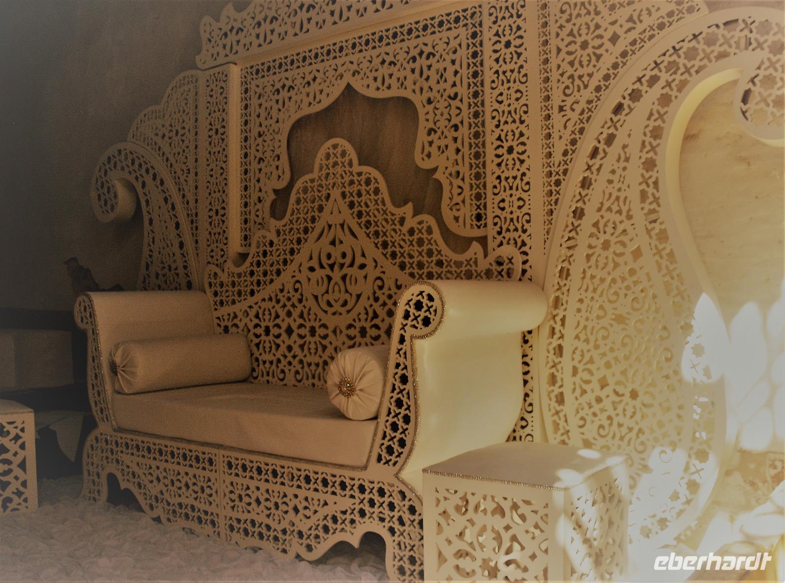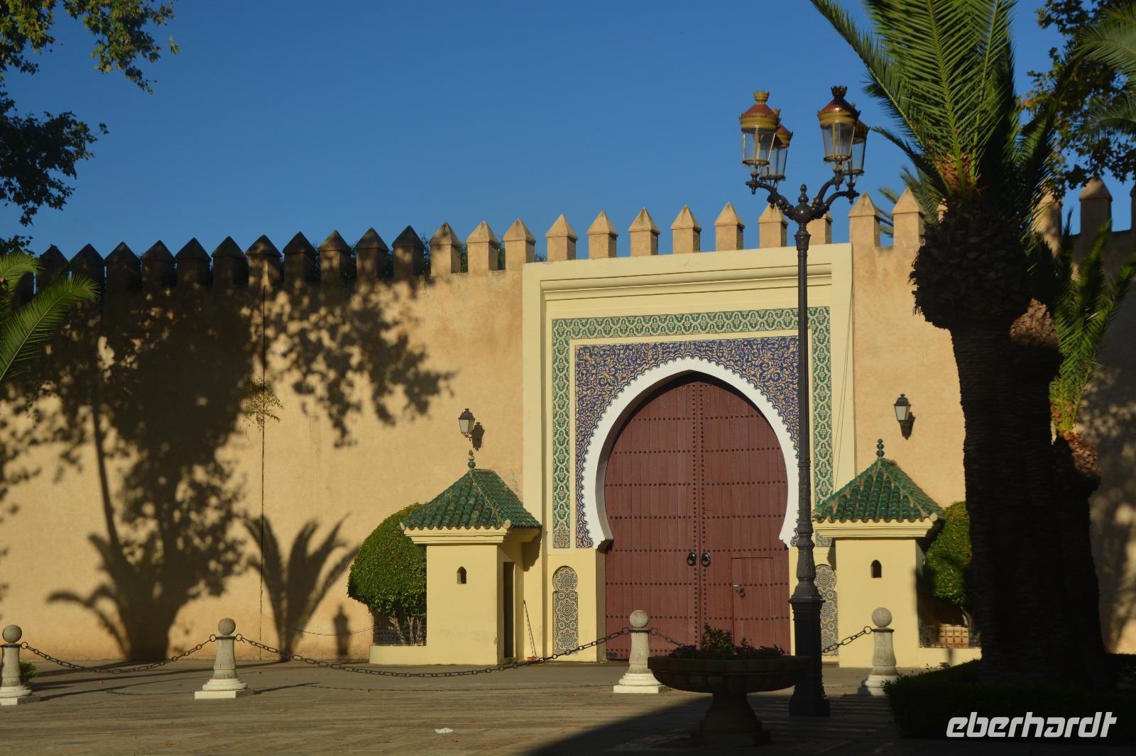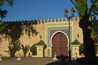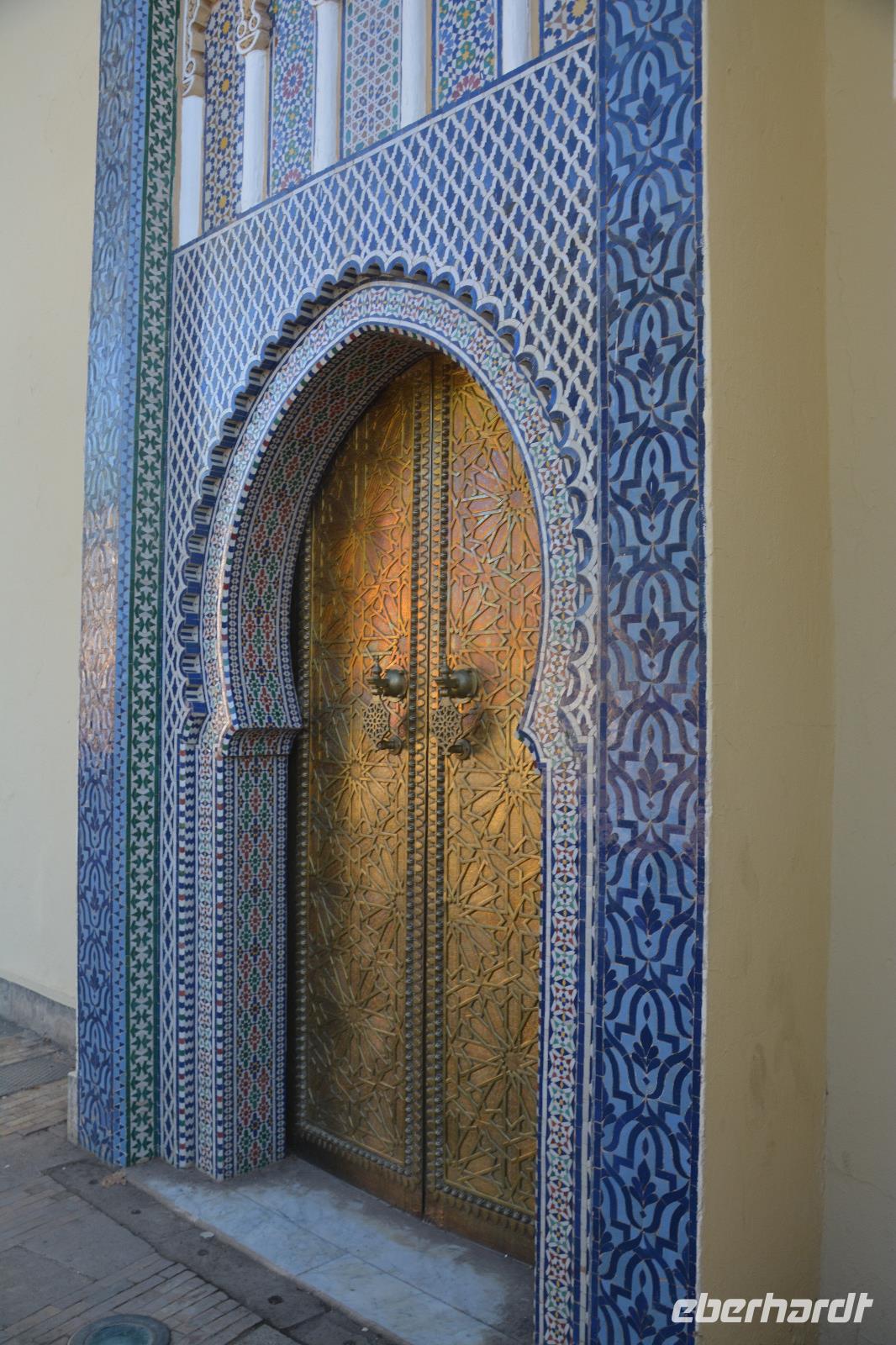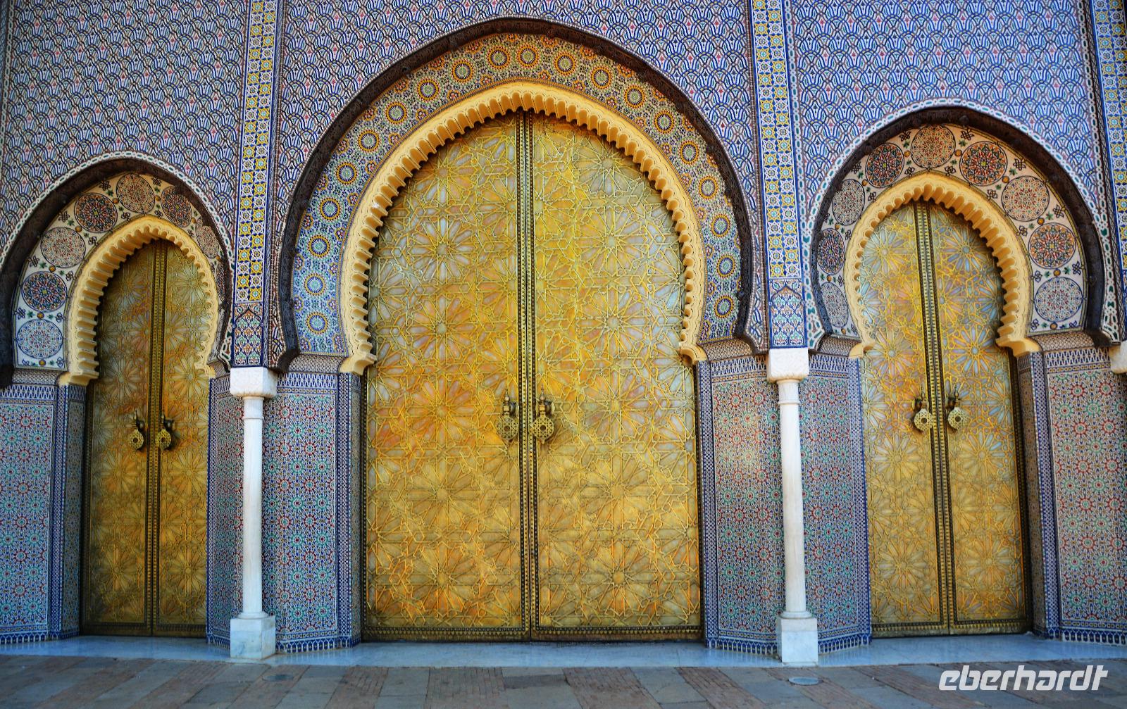 Früh beginnen wir unsere Besichtigung. Wir fahren zum Königspalast mit seinen wunderbar gearbeiteten Toren. Auf den Bronzedekoren ist das Spinnennetz Gottes, ein häufiges Ornament in der islamischen Welt, zu bewundern. Hier neben dem Eingang des Palastes beginnt die "Mellah", das ehemals jüdische Viertel von Fes. Der Name "Mellah" stammt aus einer Zeit, als die jüdische Bevölkerung, die eine wichtige Bevölkerungsgruppe in Marokko war, sich noch mit dem Salzhandel beschäftigte, denn "melh" bedeutet Salz. Wir besuchen eine Werkstatt wo uns die Bearbeitung der Bronze und die Unterschiede zwischen Blech und Bronze gezeigt werden.