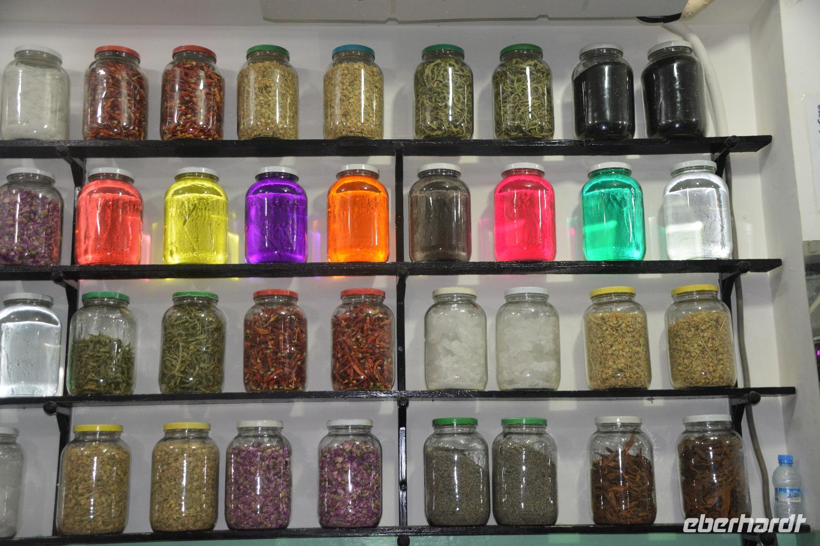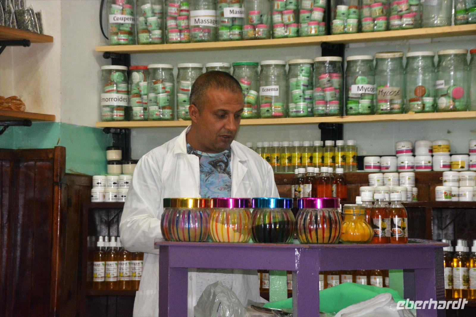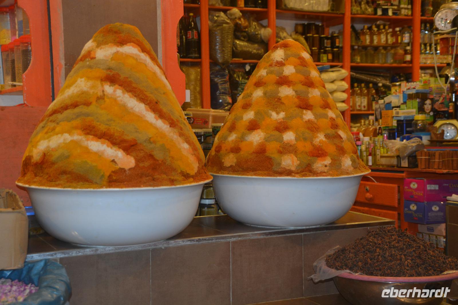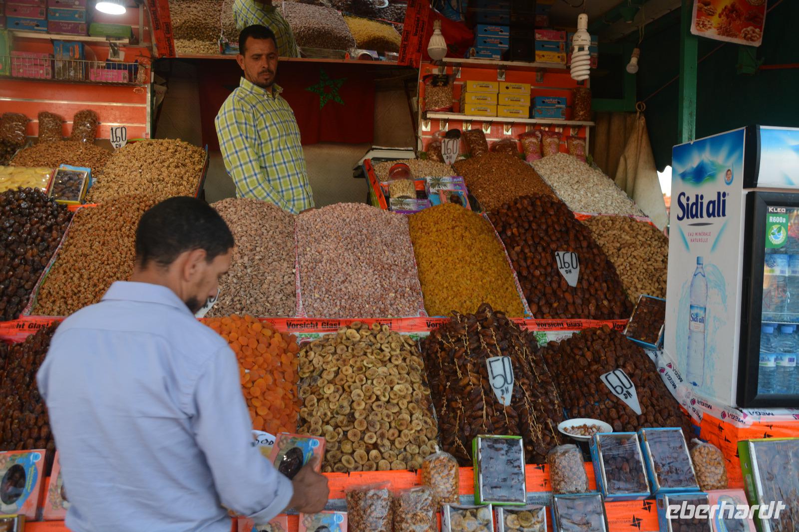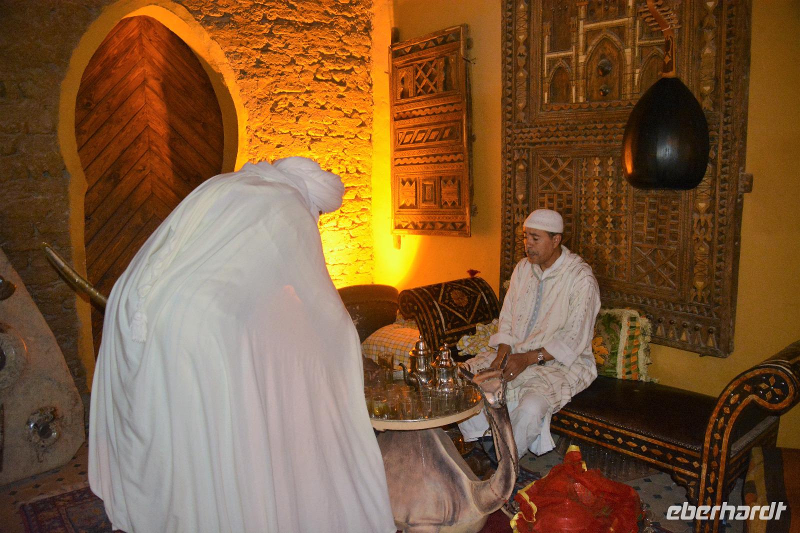 Jetzt haben wir uns eine Mittagspause verdient, auch ist es noch ein wenig heißer geworden. Nach einer wohlschmeckenden "Harrira", einer marokkanischen Gemüsesuppe und einiger anderer kleiner Gerichte gehen wir durch die "Medina" zu einer der traditionellen Apotheken um uns über die besonderen Gewürze und die Naturheilmittelchen in amüsanter und kurzweiliger Form aufklären zu lassen. Wir machen einige Einkäufe und fahren zurück in unser Hotel für eine kleine Pause. Am späten Nachmittag treffen wir uns alle, um den Tag noch einmal revue passieren zu lassen und mit einigen Ergänzungen anzureichern. Gina, unsere dt. Reiseleiterin erzählt uns ein wenig aus dem marokkanischen Familienleben und spricht über einige Problemchen und Veränderungen in der marokkanischen Gesellschaft während der letzten Jahre. Wir füllen unsere Trinkgeldkasse auf, denn Trinkgelder spielen hier in Marokko eine wichtige Rolle, zeigen sie doch die Zufriedenheit des Gastes und dienen dem Lebensunterhalt. Freundlich geht man in Marokko miteinander um.