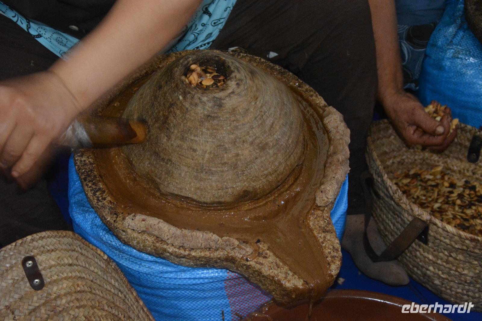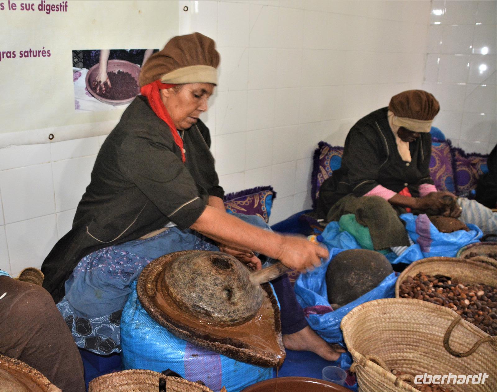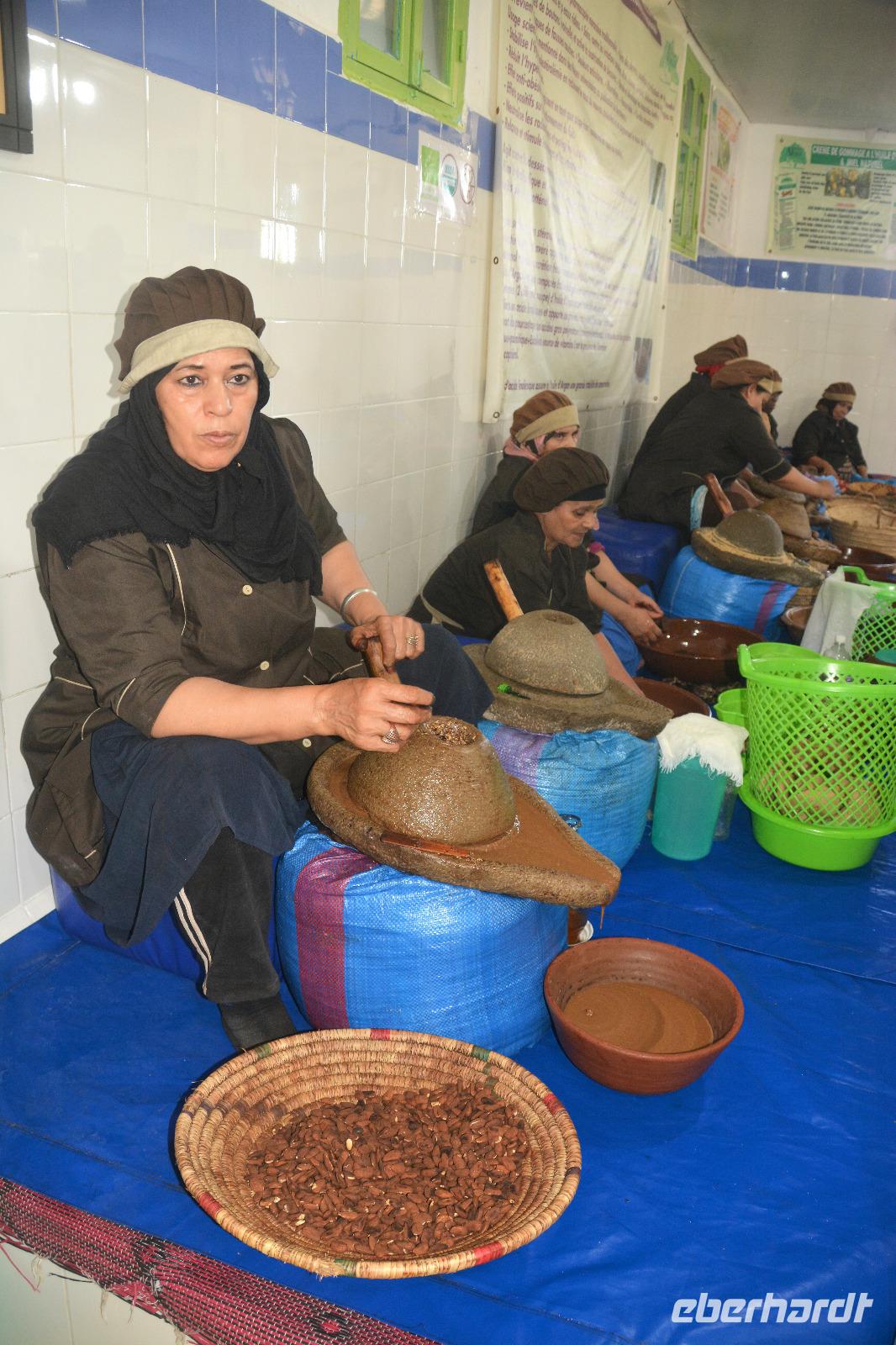 Heute verlassen wir "unsere 1." Königsstadt Marrakesch um Atlantikluft zu schnuppern. Auch heute ist der Wetterbericht gut und wir fahren durch die wachsenden Vororte, ist doch Marrakesch aufgrund seiner Popularität in den letzten Jahren extrem gewachsen. Viele Marokkaner suchen in Marrakesch im Tourismus eine Arbeitsstelle und zahlreiche Agenturen haben sich hier angesiedelt. Diese Menschen können hier kostengünstig wohnen, was in der Innenstadt schon wesentlich schwieriger geworden ist. Dann werden die Häuser weniger und wir fahren durch Agrargebiete, ist doch die Landwirtschaft eine der Einnahmequellen Marokkos. Nach einer "technischen Pause", die auch meistens mit einem Kaffee oder mit einem kleinen Ladengeschäft verbunden ist, nähern wir uns langsam der Küste. Eine der wichtigsten Pflanzen in dieser Küstenregion ist der Arganienbaum. Aus ihm wird ein reichhaltiges, gesundes Öl gewonnen, welches sowohl für die Hautpflege als auch zum Essen verwendet wird. Dieses Öl wird in den letzten Jahren in Frauen-Kooperativen gewonnen und verarbeitet. Bevor wir jedoch diese Arbeit genau betrachten können überrascht uns doch noch ein Baum auf dem Ziegen wie Statisten auf ihren Einsatz warten. Gegen eine kleine Spende an den Hirten dürfen wir unsere Fotos machen. Auch Ziegen mögen die Arganiennüsse und werden davon gut genährt nur dass die Nüsse heute eigentlich zu kostbar sind, um als Ziegenfutter zu dienen. Das lernen wir in der Kooperative wo wir die verschiedenen Produkte wie das Öl, Amlou, eine Sorte von Nusspaste mit Honig, und die Kosmetik ausprobieren können. Ein Tee dazu versteht sich von selbst. Nun-günstig ist das Öl nicht, aber hier können wir sicher sein, daß es eine gute Qualität hat, denn oft wird es gestreckt und dann für teures Geld verkauft.
