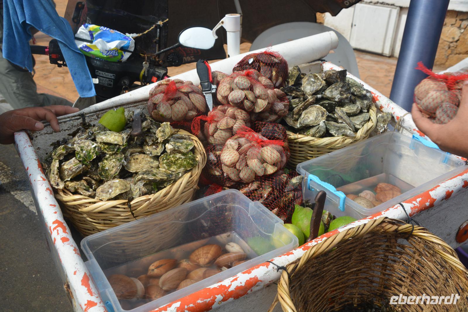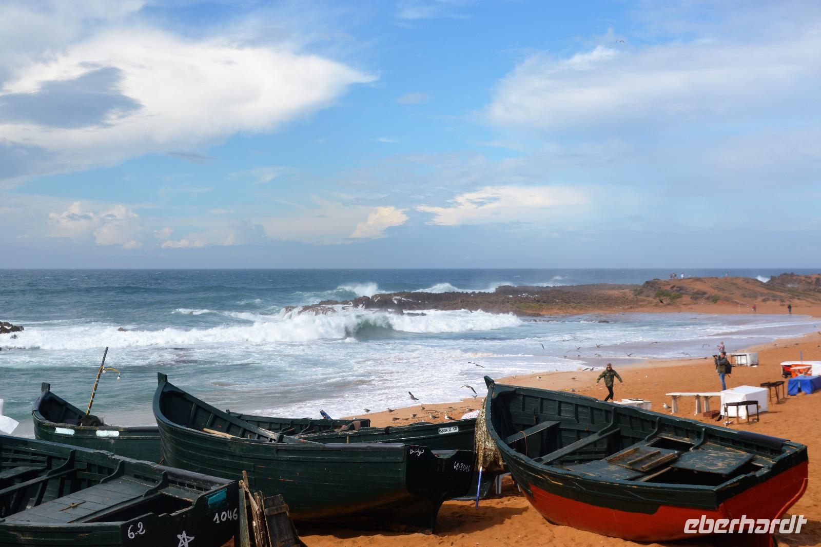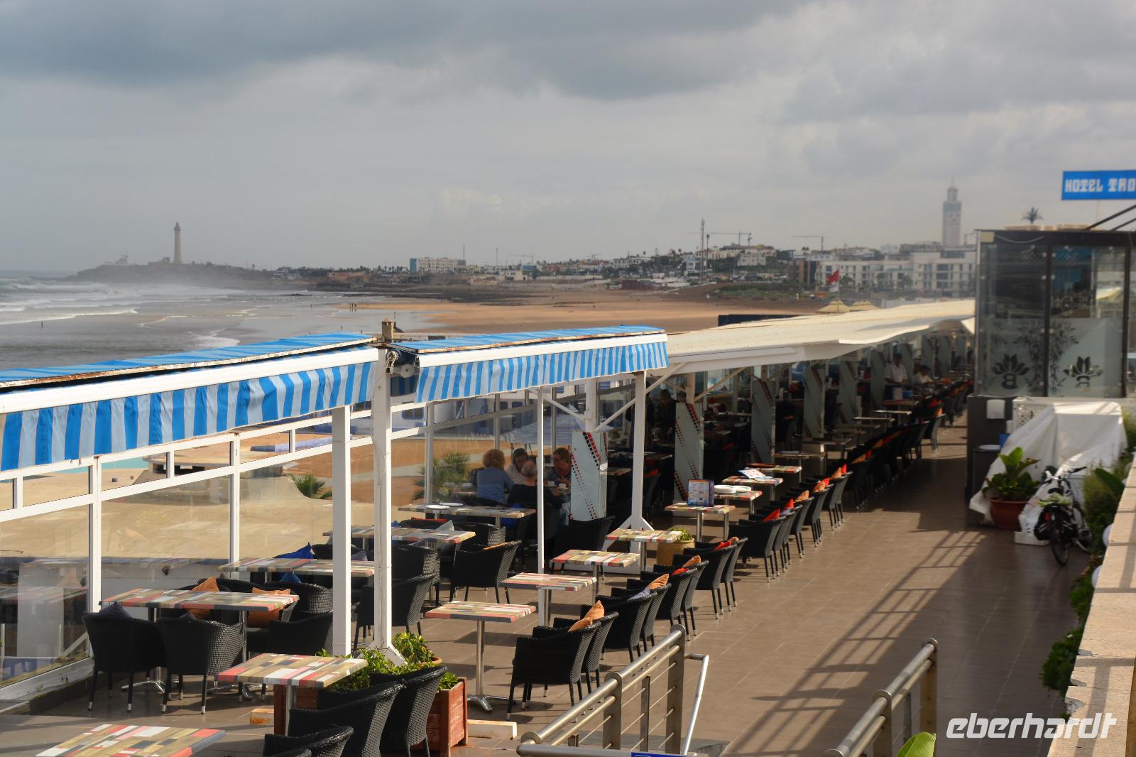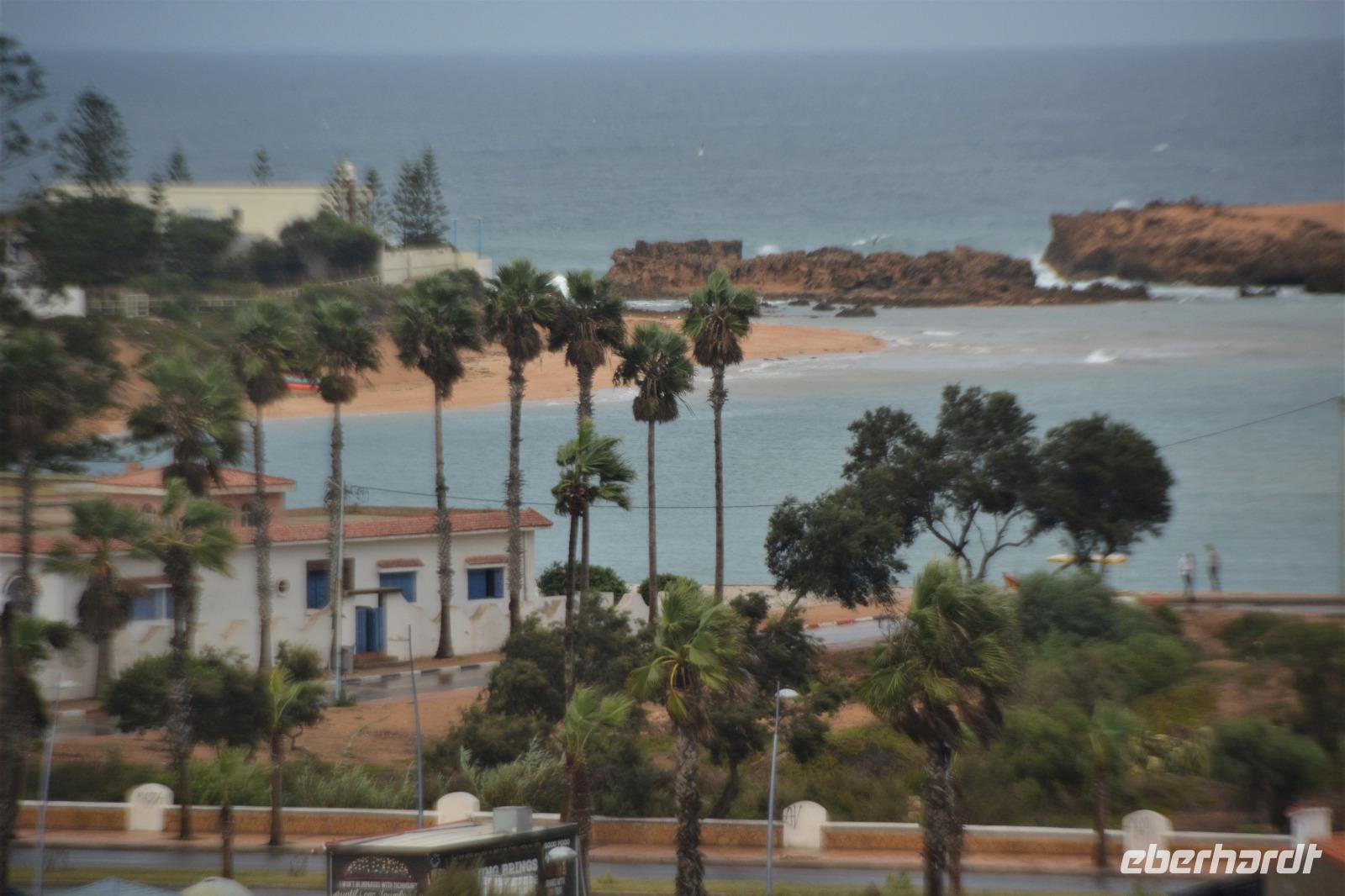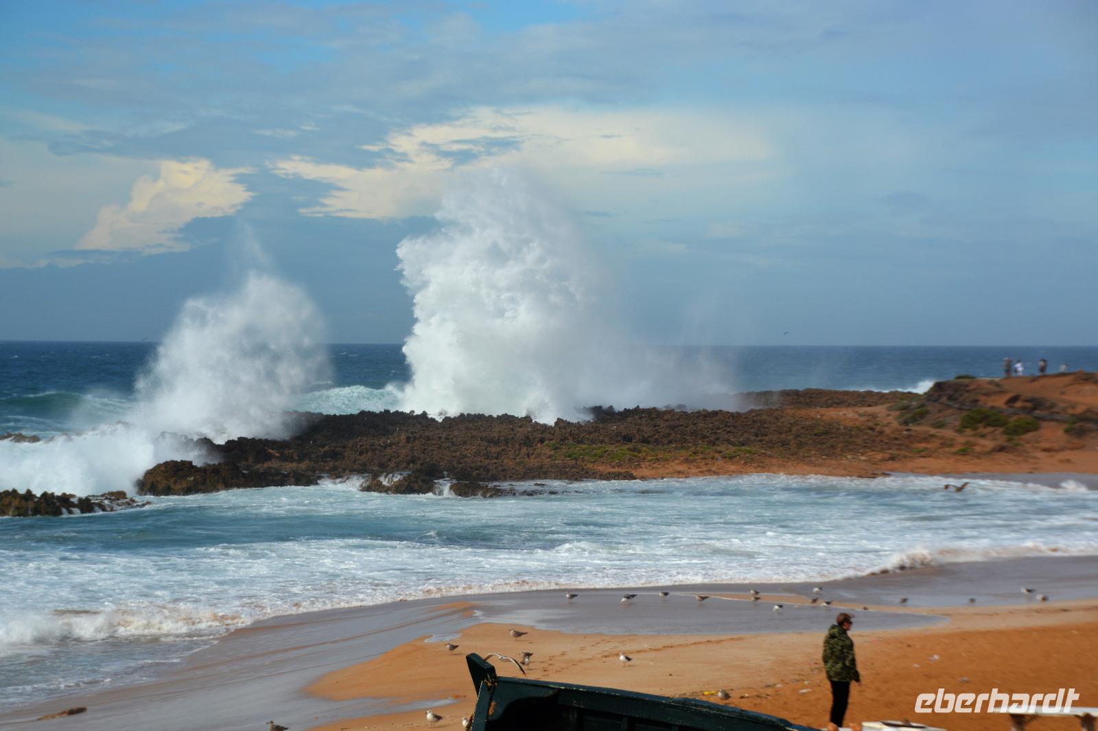 Wir fahren entlang der Küste in Richtung Norden, vorbei an Safi, einem der wichtigsten Häfen Marokkos. Hier in der Region wird großräumig Phosphat abgebaut, was für die marokkanische Wirtschaft extrem wichtig ist. Vorbei an großen Raffinerien und kleinen Orten in denen für den deutschen Markt Krabben gepuhlt werden gelangen wir endlich nach Oualidia, denn der Straßenbelag ist nicht mehr der beste. Jetzt im Oktober wirkt der Ort, der seine Saison in den Sommermonaten hat, ein wenig schläfrig. Die Austernverkäufer erwarten aber immer Touristen und auch Marokkaner die sich gerne so ein Leckerbissen genehmigen. Auch von uns sind es einige, die sich für Austern begeistern können. Die anderen ziehen eine Speise in dem Restaurant vor, in dem wir zu Mittag essen.