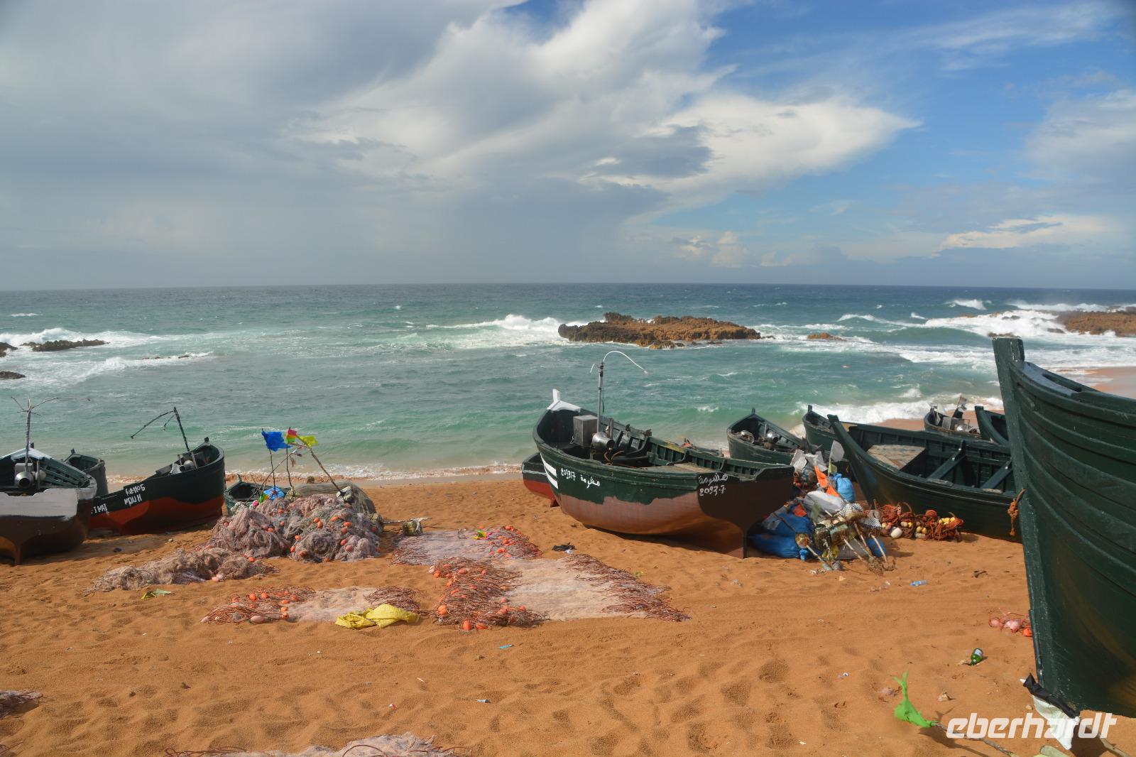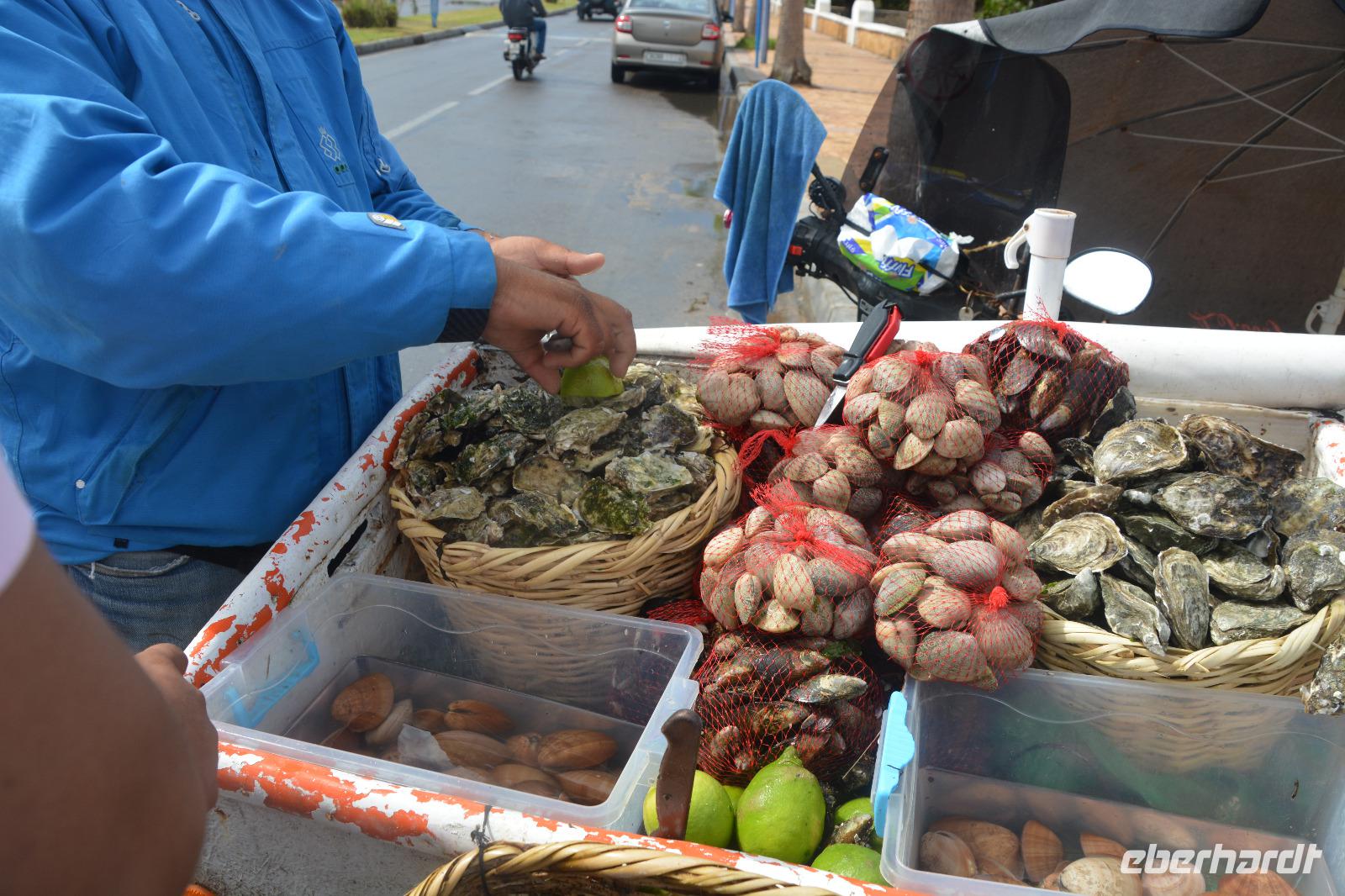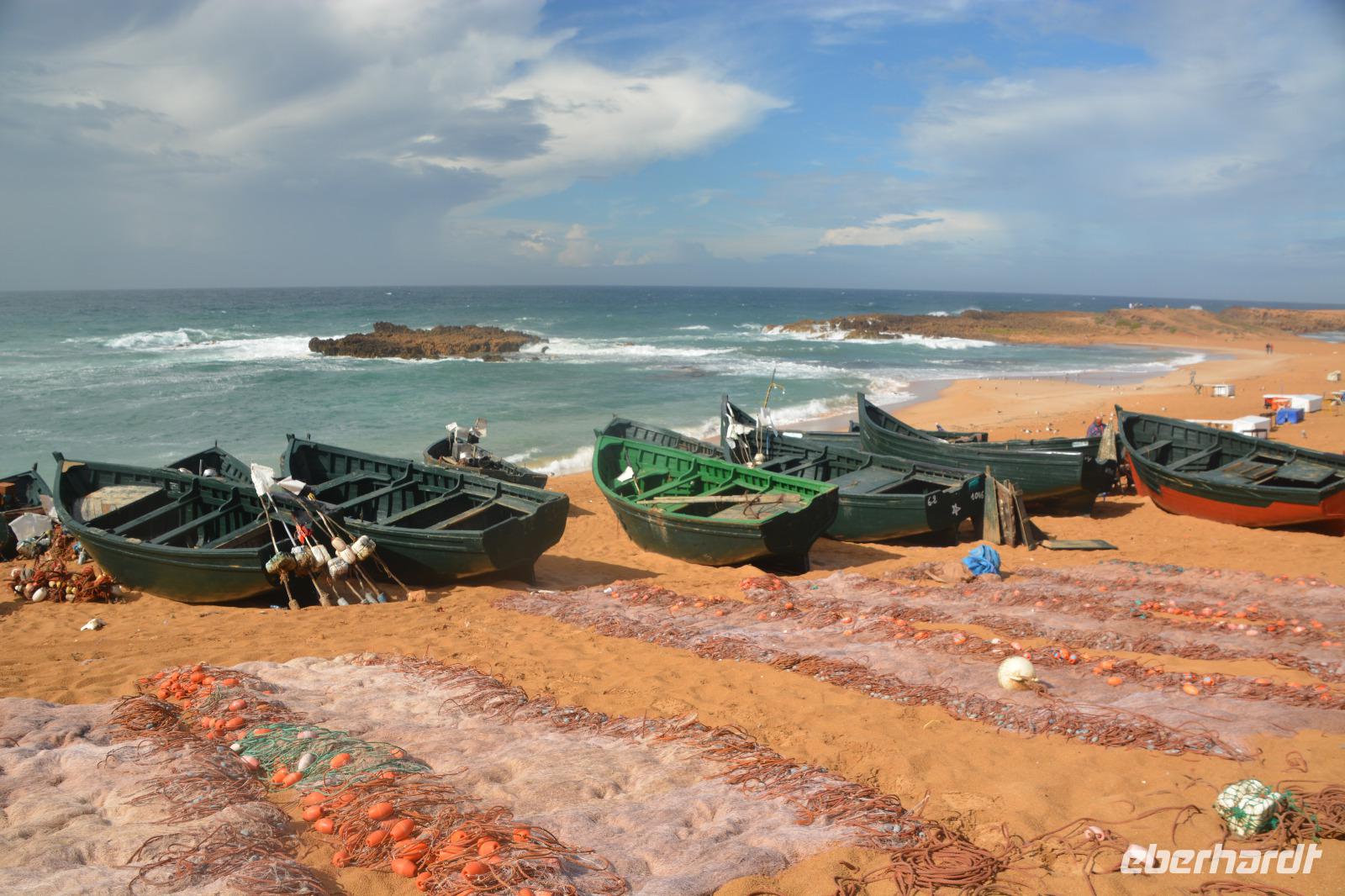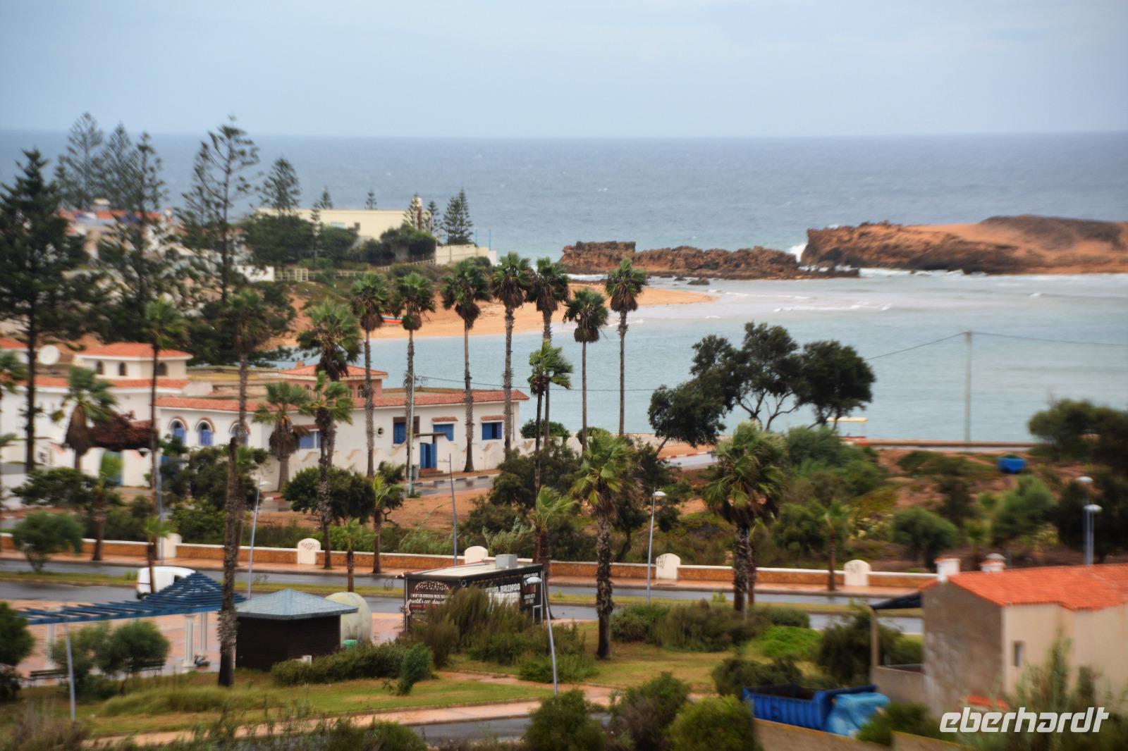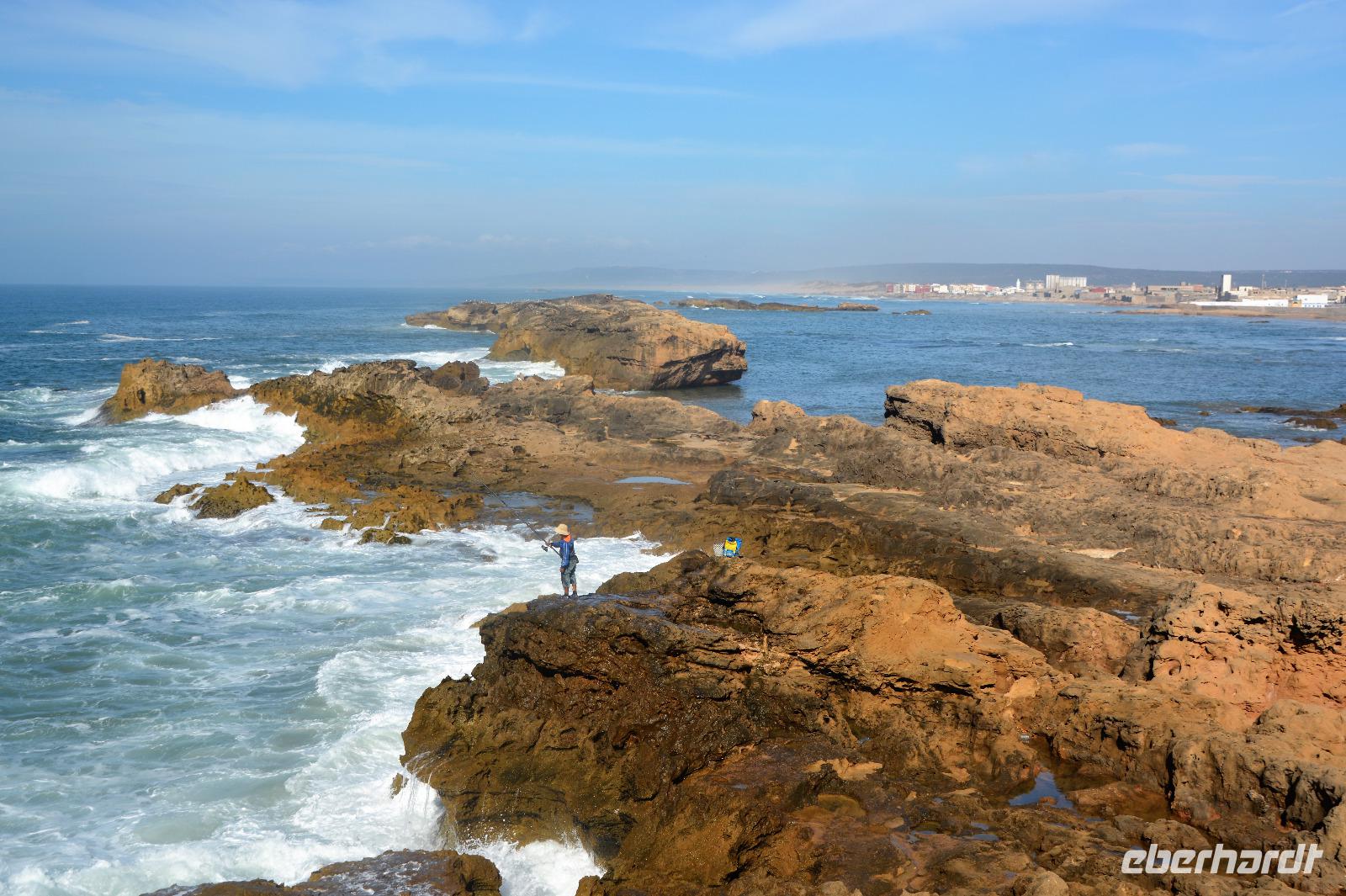 Wir fahren entlang der Küste in Richtung Norden, vorbei an Safi, einem der wichtigsten Häfen Marokkos. Hier in der Region wird großräumig Phosphat abgebaut, was für die marokkanische Wirtschaft extrem wichtig ist. Vorbei an großen Raffinerien und kleinen Orten in denen für den deutschen Markt Krabben gepuhlt werden gelangen wir endlich nach Oualidia, denn der Straßenbelag ist nicht mehr der beste. Jetzt im Oktober wirkt der Ort, der seine Saison in den Sommermonaten hat, ein wenig schläfrig. Die Austernverkäufer erwarten aber immer Touristen und auch Marokkaner die sich gerne so ein Leckerbissen genehmigen. Auch von uns sind es einige, die sich für Austern begeistern können. Die anderen ziehen eine Speise in dem Restaurant vor, in dem wir zu Mittag essen.