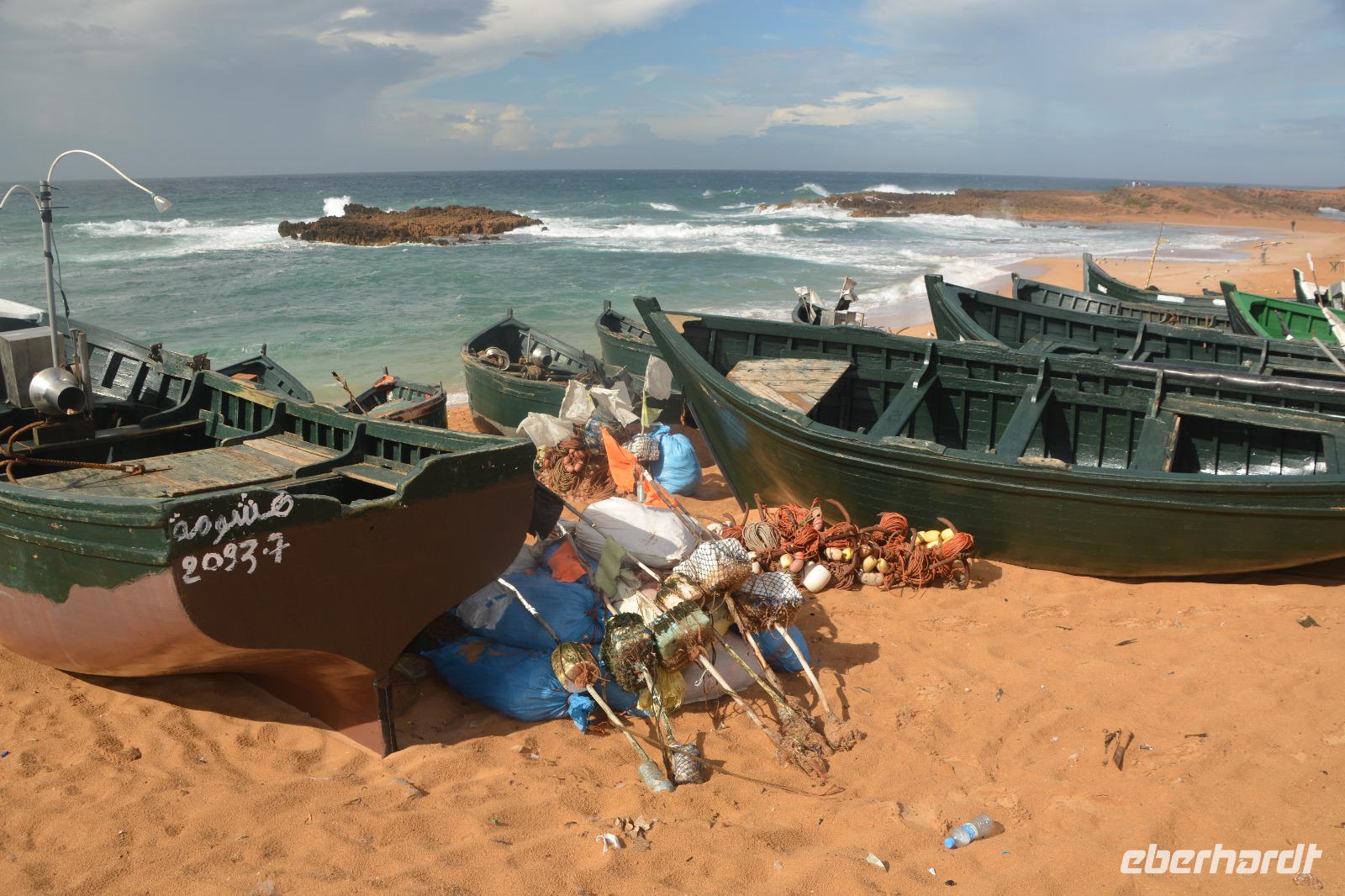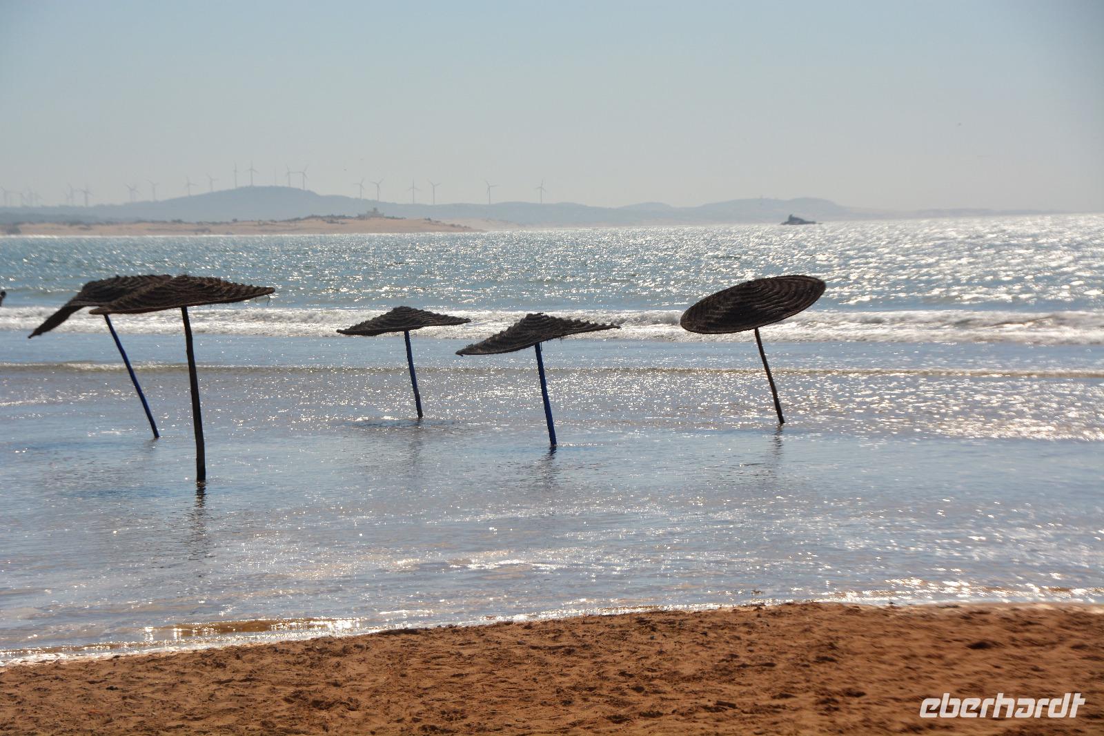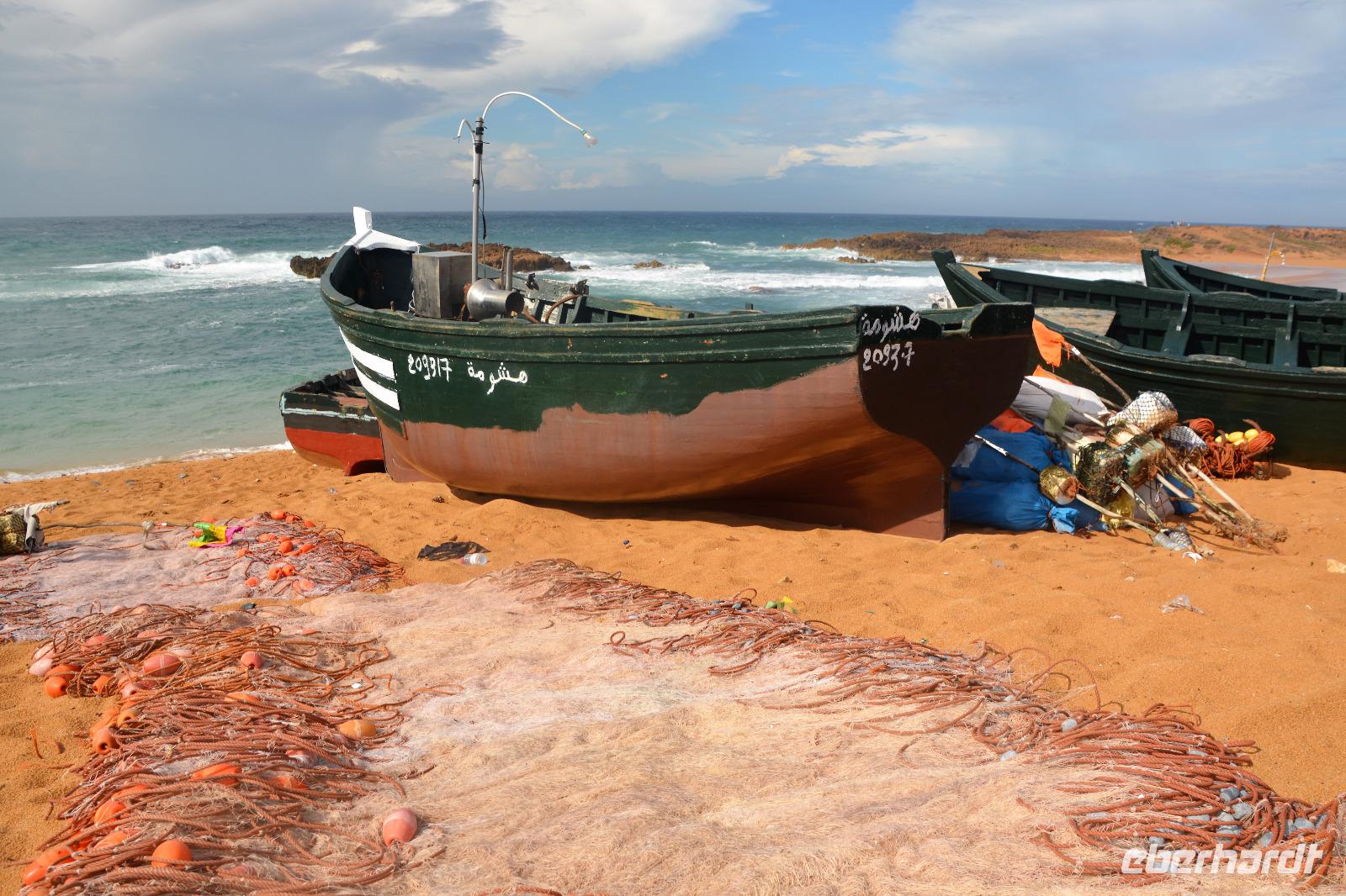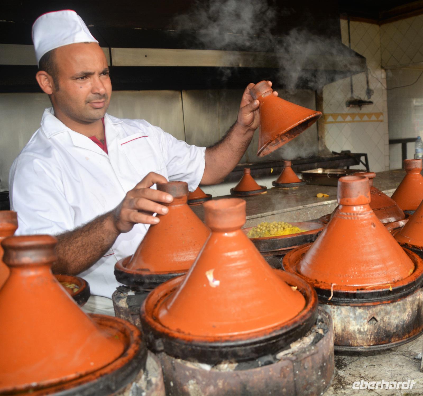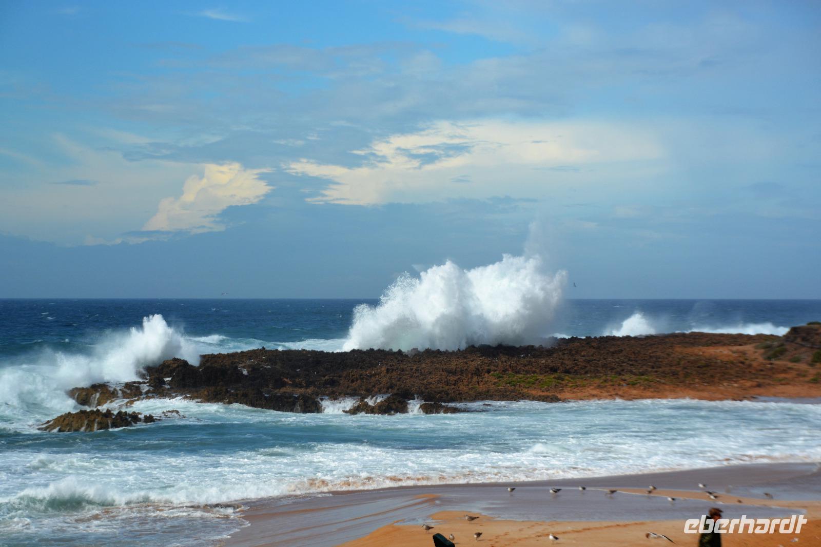 Wir fahren entlang der Küste in Richtung Norden, vorbei an Safi, einem der wichtigsten Häfen Marokkos. Hier in der Region wird großräumig Phosphat abgebaut, was für die marokkanische Wirtschaft extrem wichtig ist. Vorbei an großen Raffinerien und kleinen Orten in denen für den deutschen Markt Krabben gepuhlt werden gelangen wir endlich nach Oualidia, denn der Straßenbelag ist nicht mehr der beste. Jetzt im Oktober wirkt der Ort, der seine Saison in den Sommermonaten hat, ein wenig schläfrig. Die Austernverkäufer erwarten aber immer Touristen und auch Marokkaner die sich gerne so ein Leckerbissen genehmigen. Auch von uns sind es einige, die sich für Austern begeistern können. Die anderen ziehen eine Speise in dem Restaurant vor, in dem wir zu Mittag essen.