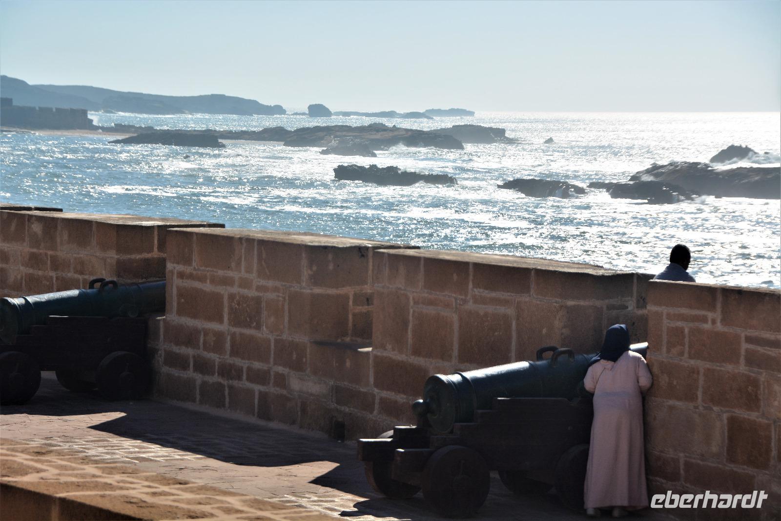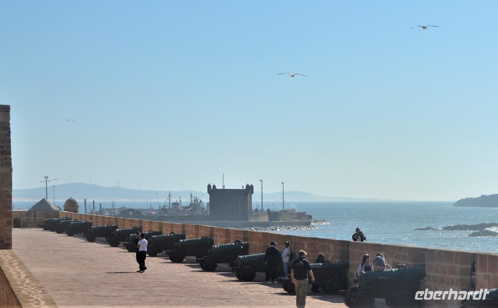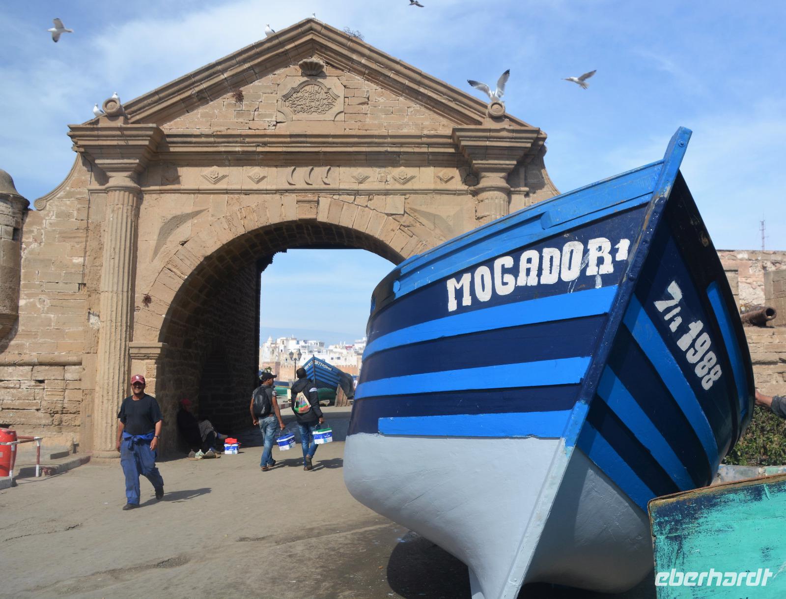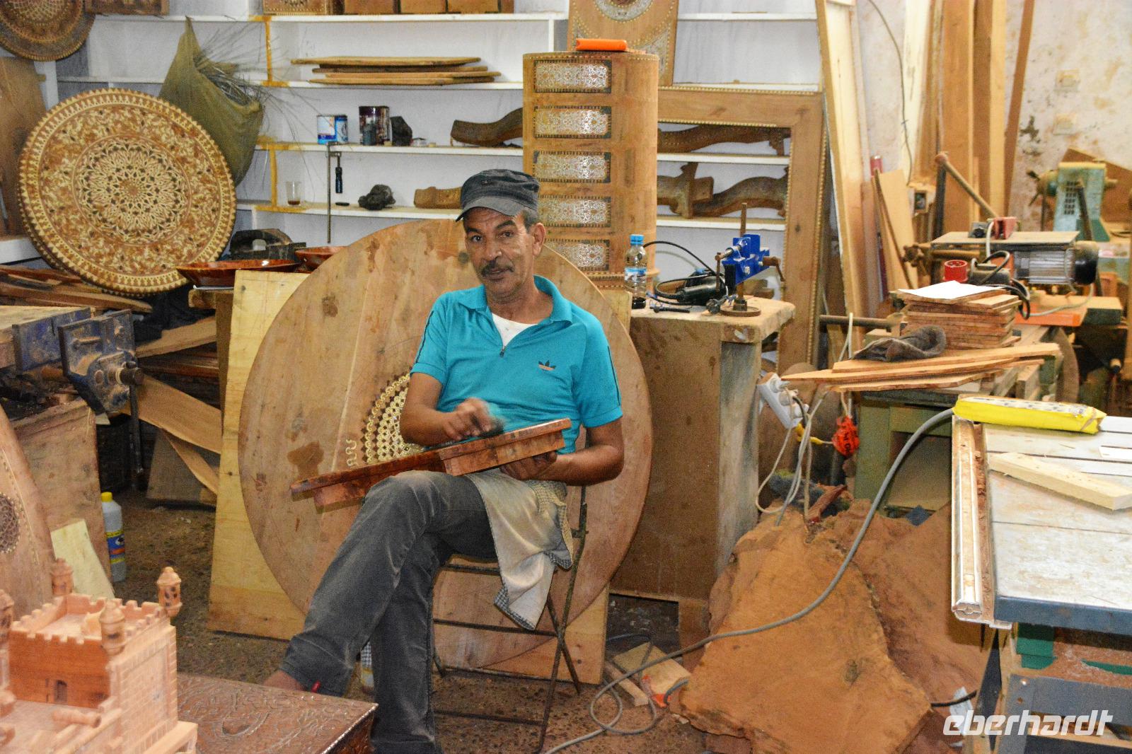 Nach diesem Besuch fahren wir nach Essaouira, die Stadt welche auch schon als Filmkulisse in bekannten Filmen diente, z.B. in "Königreich der Himmel" von Ridley Scott. Bevor wir diese wunderschöne Stadt am Meer besichtigen geben wir unser Gepäck im Hotel ab und stärken uns in einem Fischrestaurant. Hier an der fischreichen Atlantikküste landet der Fisch frisch auf dem Teller. Dann spazieren wir durch die befestigte Altstadt von Essaouira, gehen zum Hafen, sehen die Schiffswerft und bekommen von Mohammed die unterschiedlichen Fangmethoden und Schiffstypen erläutert. Immer wieder schweift der Blick zur Scala, der befestigten Mauer der Stadt. Wir haben das Glück noch ohne Eintritt diese hoch gelegene mit Kanonen bestückte frisch renovierte Promenade zu betreten. Essaouira ist auch die Stadt der Schreiner und Holzkünstler. Fein gearbeitete Möbel aus verschiedenen Hölzern mit Intarsienarbeiten oder auch Skulpturen werden hier hergestellt. Wir besuchen eine große Werkstatt wo uns diese Arbeit erklärt wird.