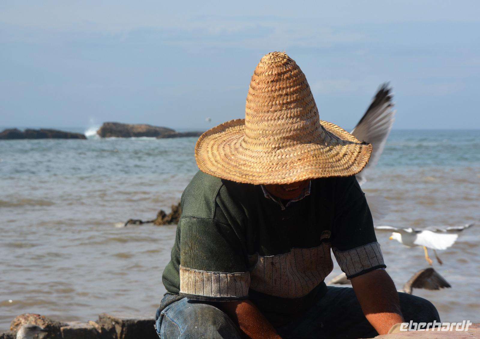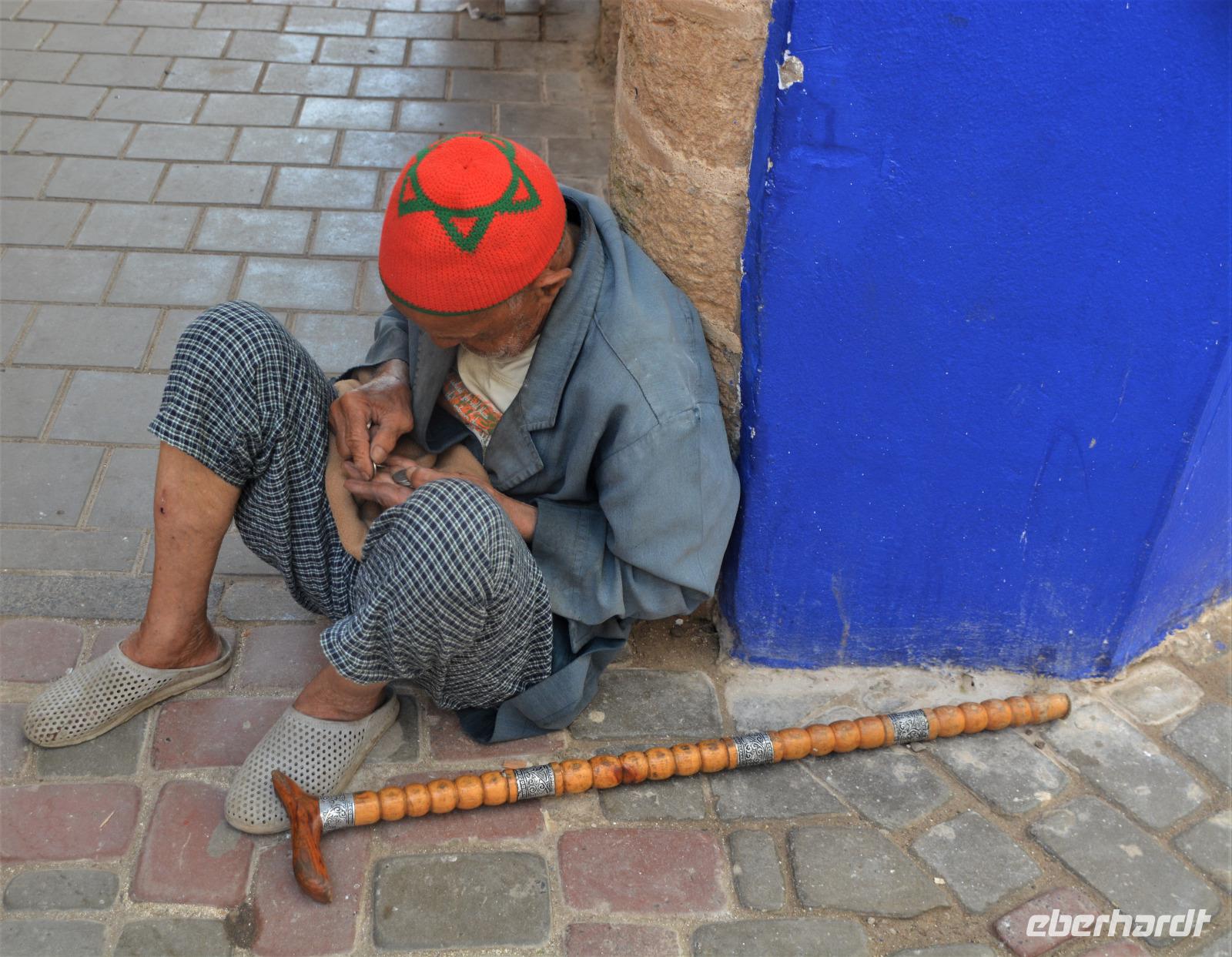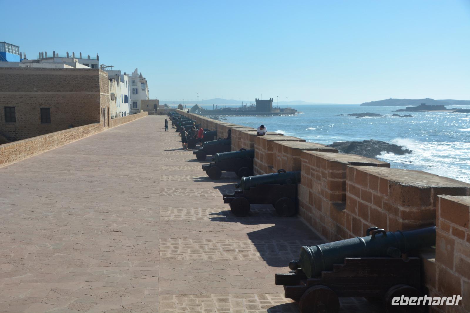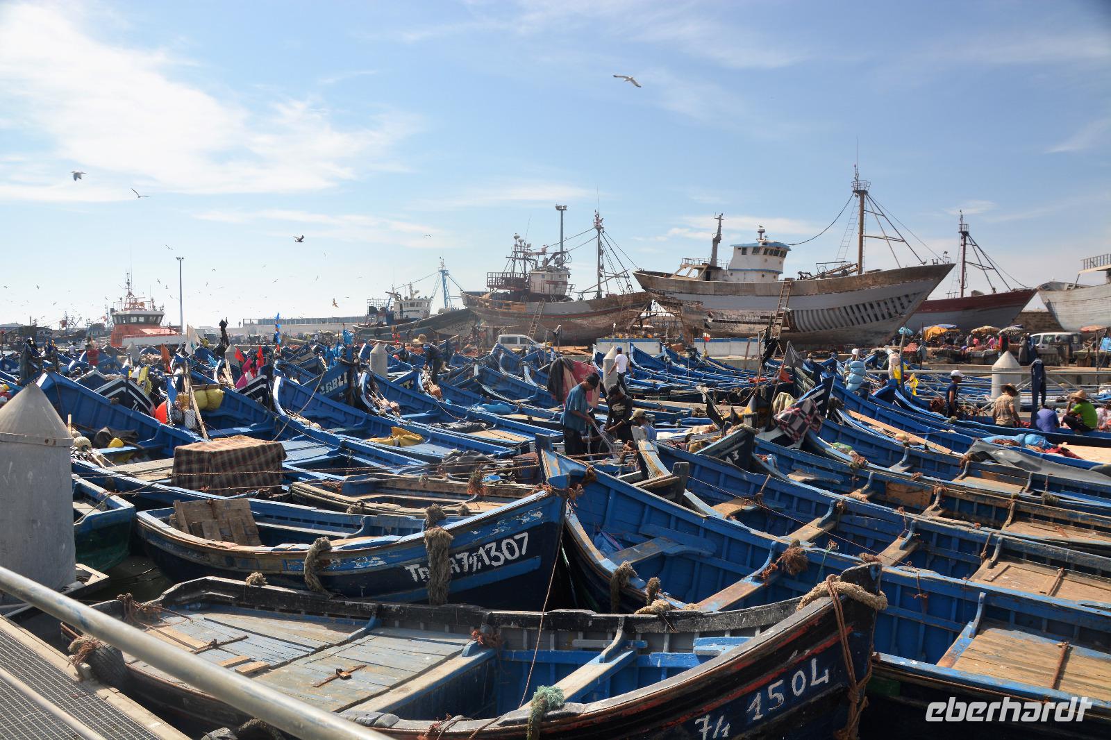 Nach diesem Besuch fahren wir nach Essaouira, die Stadt welche auch schon als Filmkulisse in bekannten Filmen diente, z.B. in "Königreich der Himmel" von Ridley Scott. Bevor wir diese wunderschöne Stadt am Meer besichtigen geben wir unser Gepäck im Hotel ab und stärken uns in einem Fischrestaurant. Hier an der fischreichen Atlantikküste landet der Fisch frisch auf dem Teller. Dann spazieren wir durch die befestigte Altstadt von Essaouira, gehen zum Hafen, sehen die Schiffswerft und bekommen von Mohammed die unterschiedlichen Fangmethoden und Schiffstypen erläutert. Immer wieder schweift der Blick zur Scala, der befestigten Mauer der Stadt. Wir haben das Glück noch ohne Eintritt diese hoch gelegene mit Kanonen bestückte frisch renovierte Promenade zu betreten. Essaouira ist auch die Stadt der Schreiner und Holzkünstler. Fein gearbeitete Möbel aus verschiedenen Hölzern mit Intarsienarbeiten oder auch Skulpturen werden hier hergestellt. Wir besuchen eine große Werkstatt wo uns diese Arbeit erklärt wird.