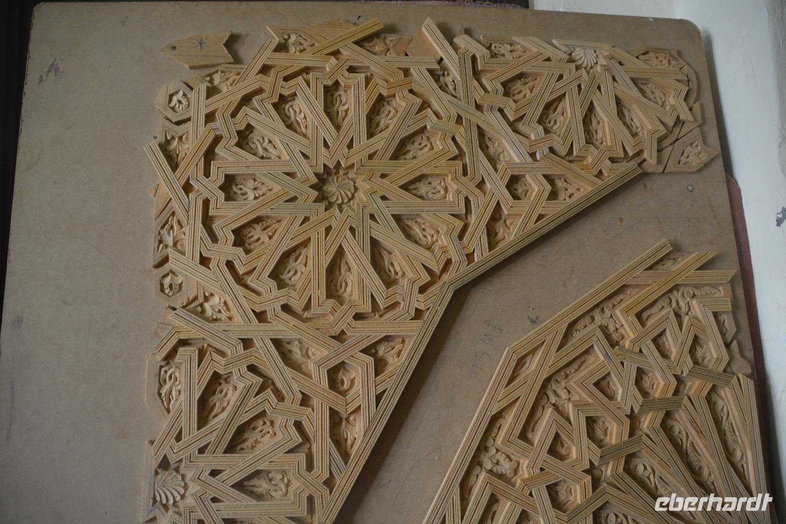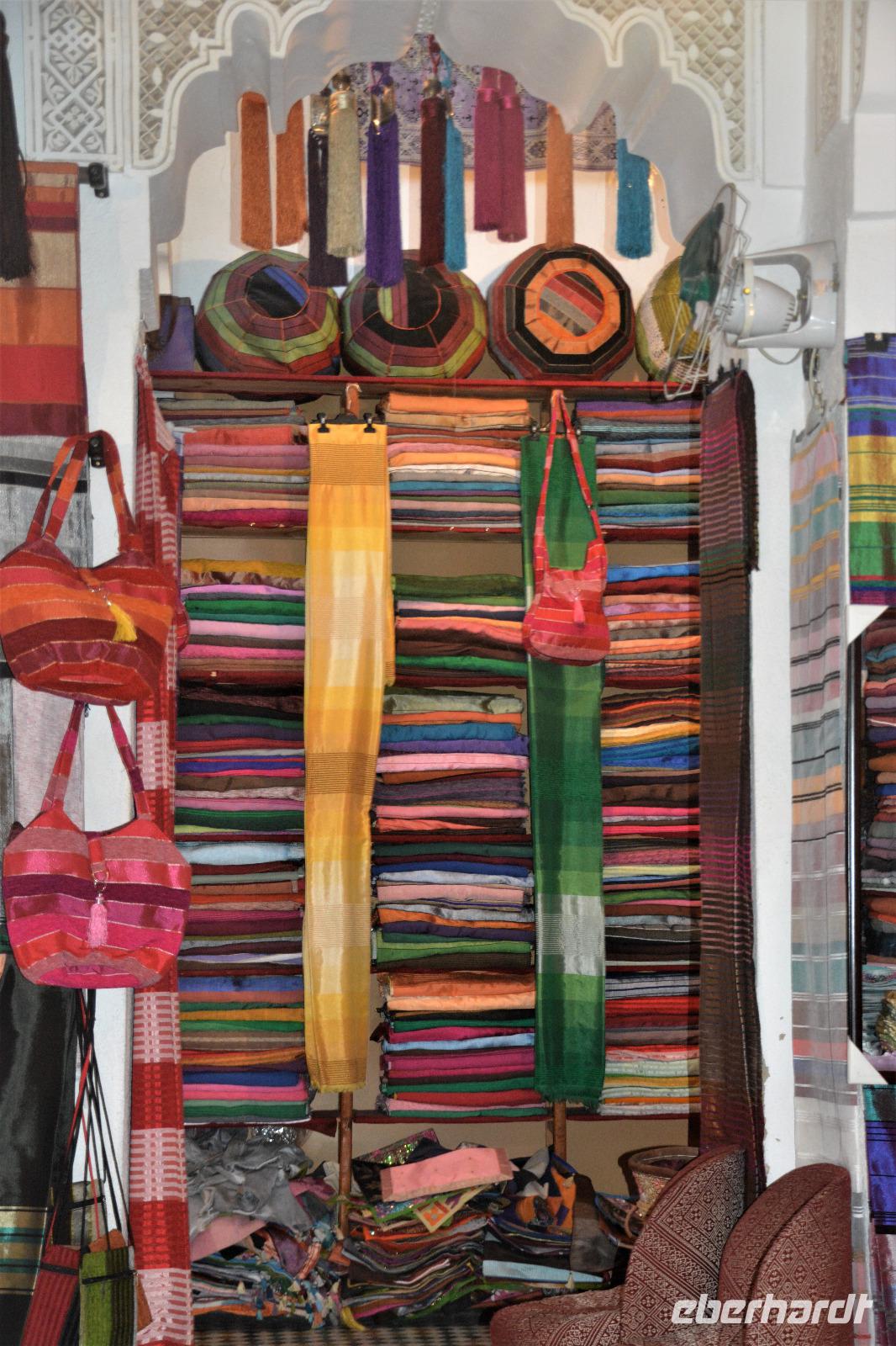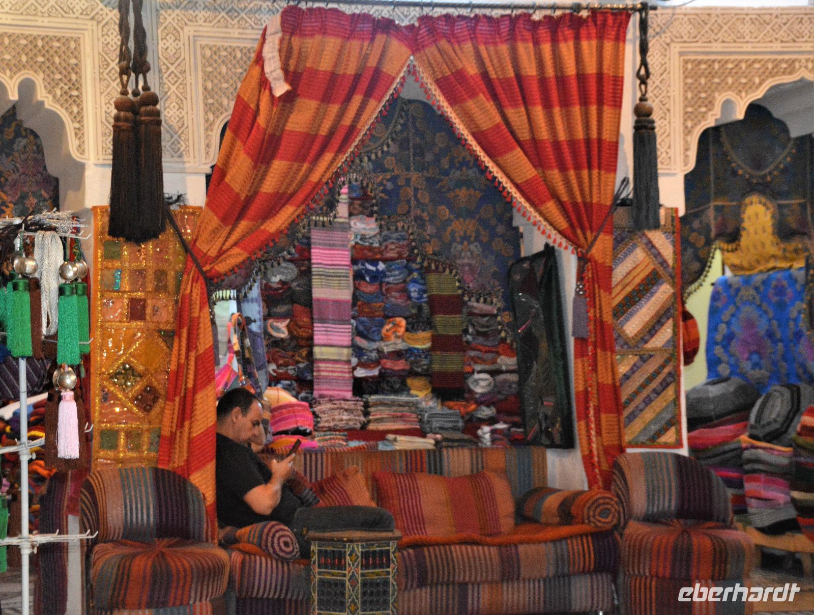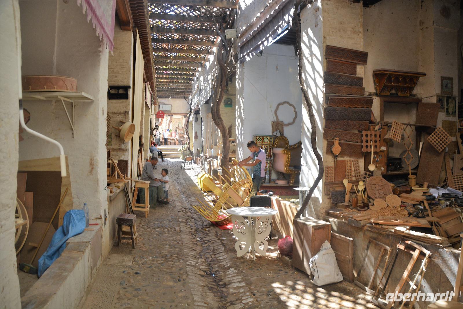 Nach diesem Besuch fahren wir nach Essaouira, die Stadt welche auch schon als Filmkulisse in bekannten Filmen diente, z.B. in "Königreich der Himmel" von Ridley Scott. Bevor wir diese wunderschöne Stadt am Meer besichtigen geben wir unser Gepäck im Hotel ab und stärken uns in einem Fischrestaurant. Hier an der fischreichen Atlantikküste landet der Fisch frisch auf dem Teller. Dann spazieren wir durch die befestigte Altstadt von Essaouira, gehen zum Hafen, sehen die Schiffswerft und bekommen von Mohammed die unterschiedlichen Fangmethoden und Schiffstypen erläutert. Immer wieder schweift der Blick zur Scala, der befestigten Mauer der Stadt. Wir haben das Glück noch ohne Eintritt diese hoch gelegene mit Kanonen bestückte frisch renovierte Promenade zu betreten. Essaouira ist auch die Stadt der Schreiner und Holzkünstler. Fein gearbeitete Möbel aus verschiedenen Hölzern mit Intarsienarbeiten oder auch Skulpturen werden hier hergestellt. Wir besuchen eine große Werkstatt wo uns diese Arbeit erklärt wird.