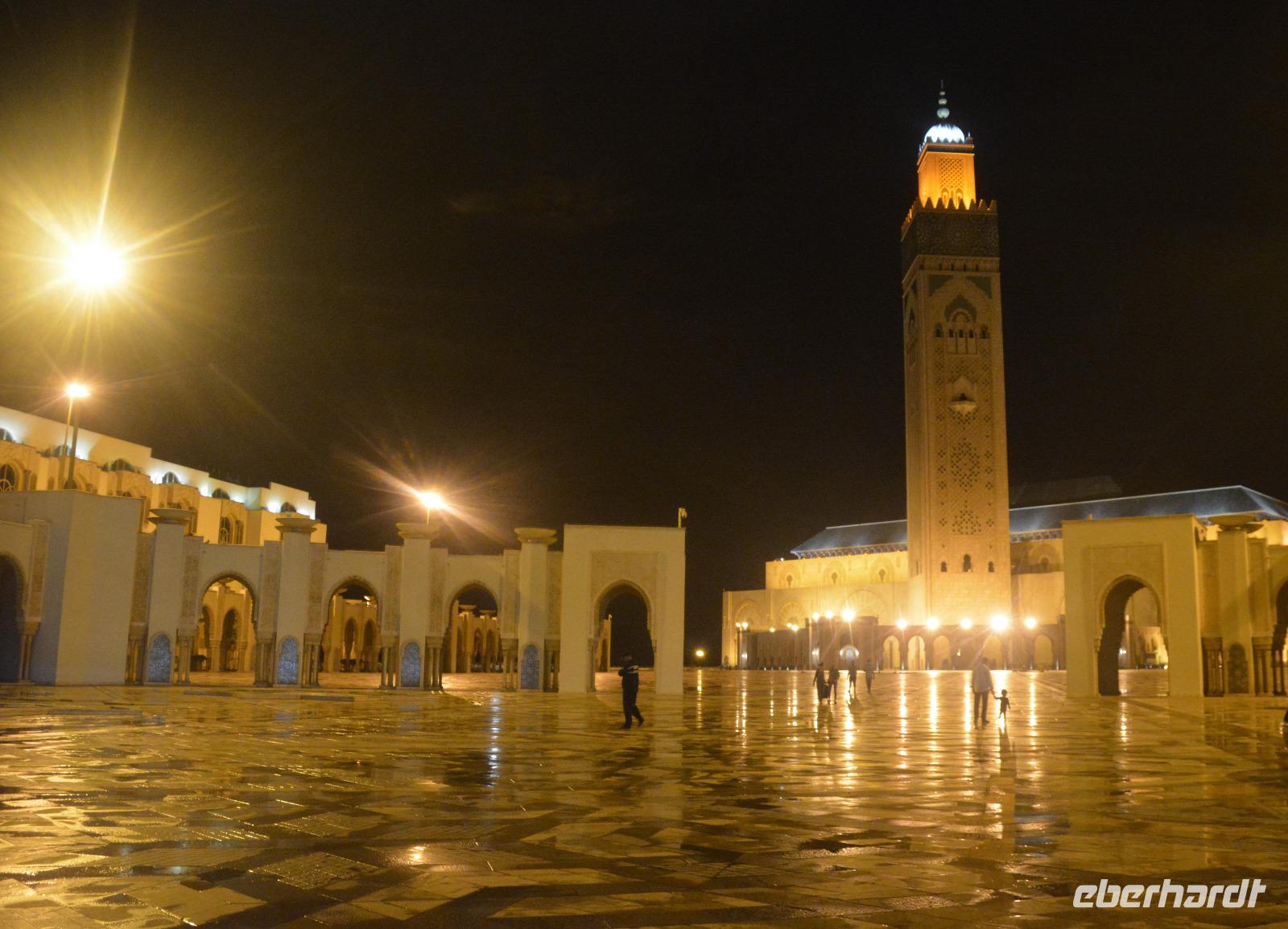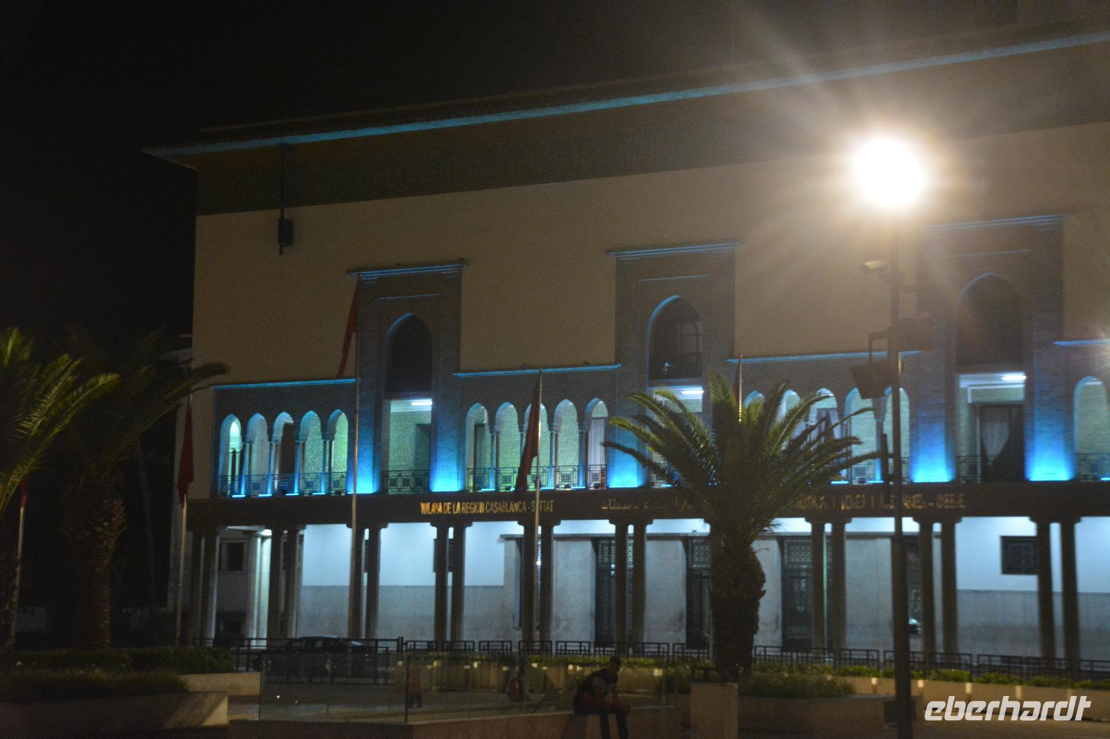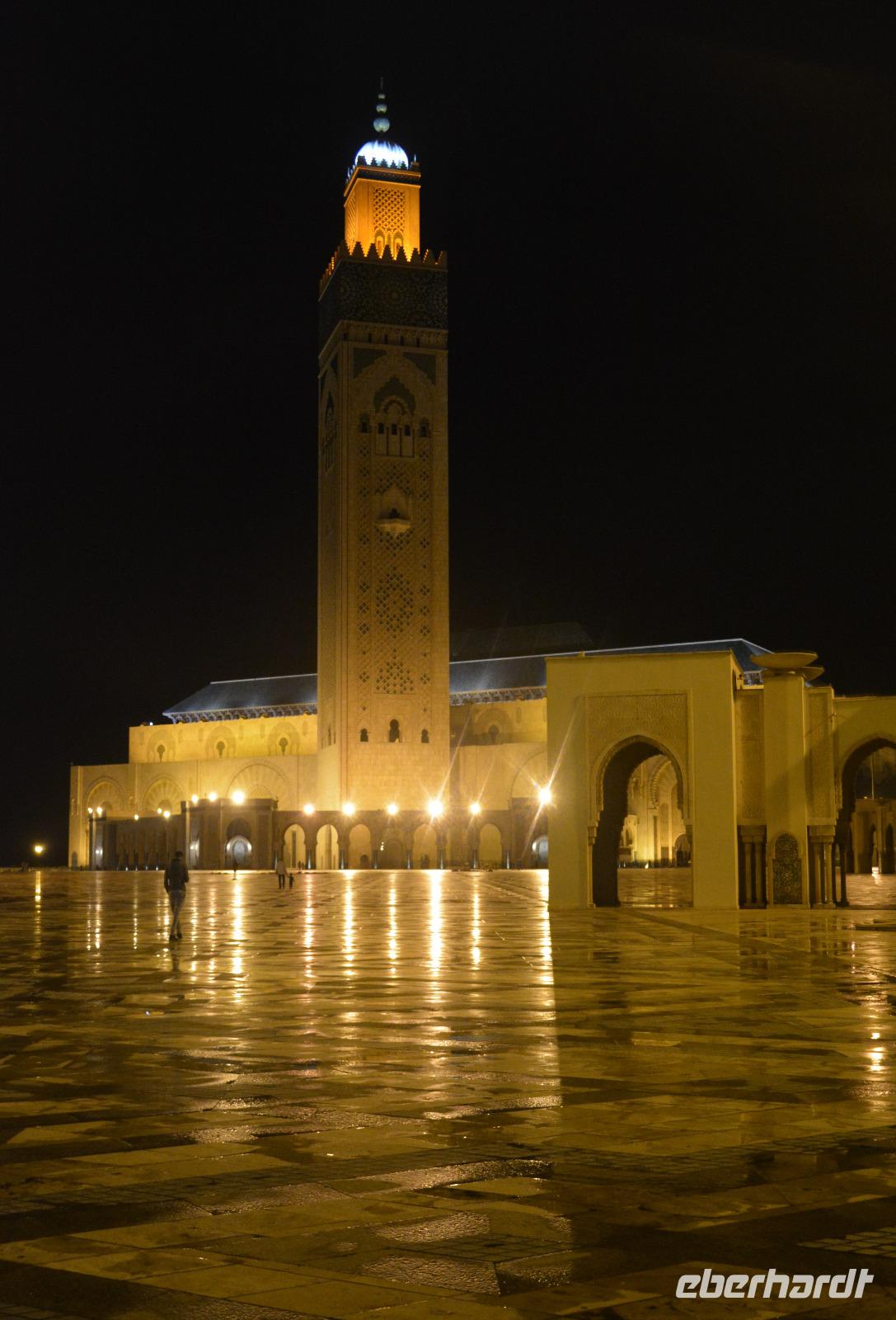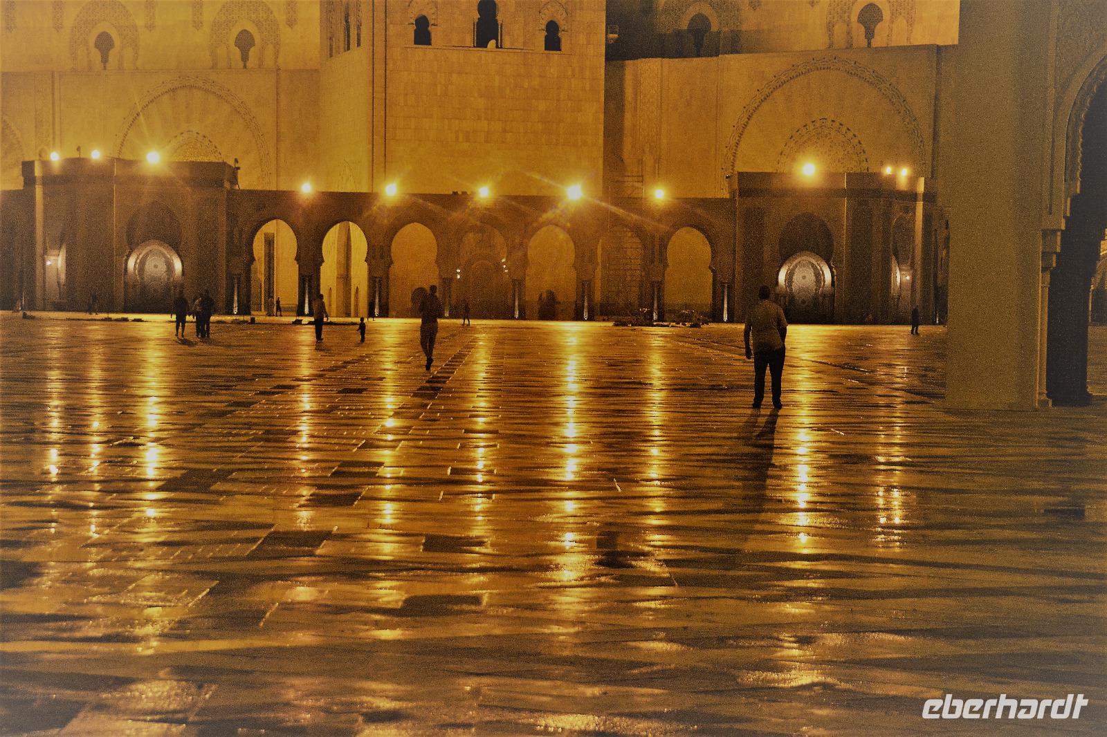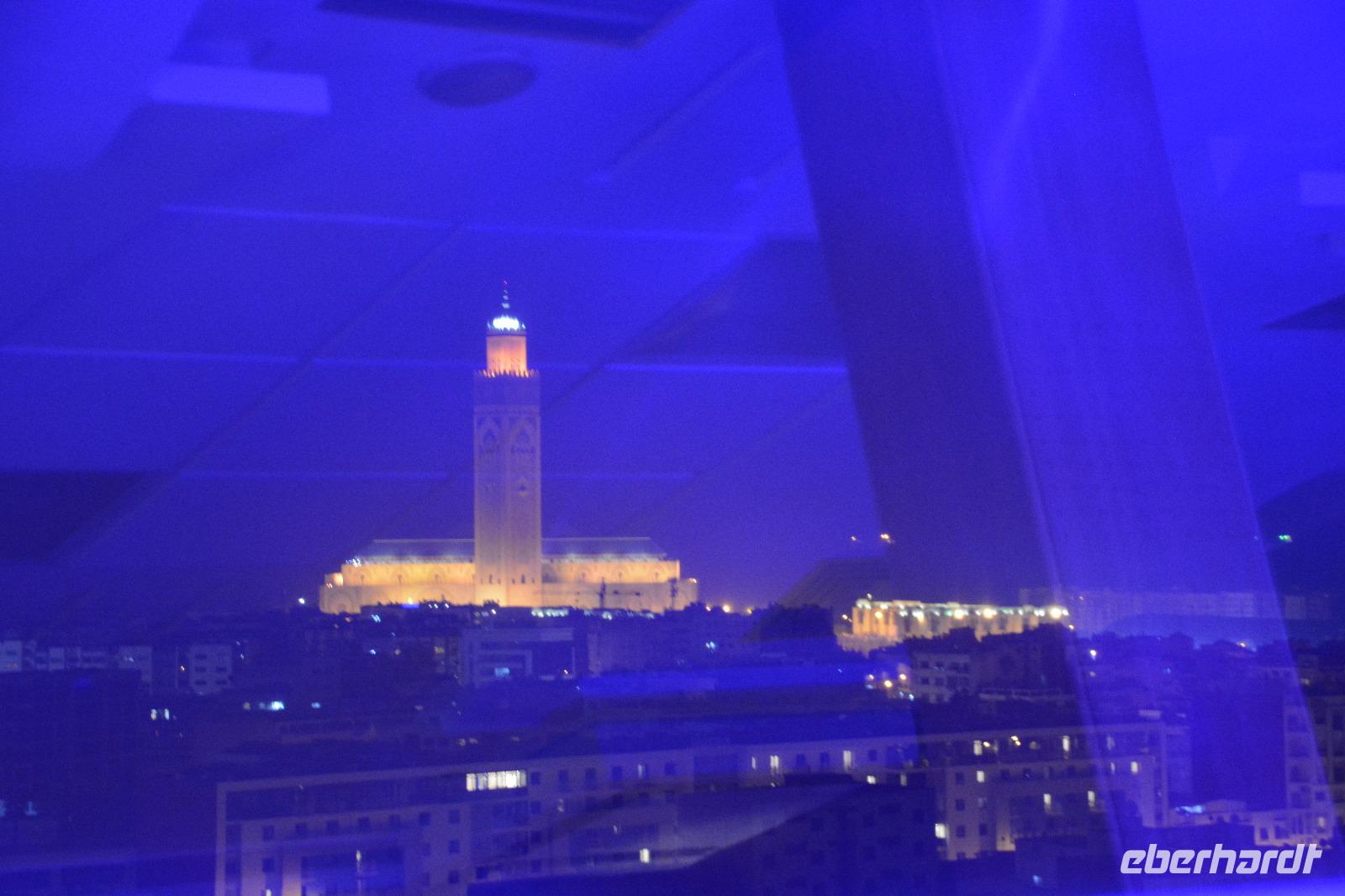 Weiter geht unsere Fahrt auf dem letzten Stück nach Casa auf der Autobahn, die gebührenpflichtig ist. Casablanca ist die größte und modernste Stadt Marokkos und Sehnsuchtsziel von Aussteigern und Intellektuellen früherer Zeiten. Das mag vielleicht auch die Amerikanerin veranlaßt haben, den Mythos "Rick's Café" auferstehen zu lassen. Denn dort wollen wir heute abend speisen. Im Hotel erfahren wir, daß unser Essen auf 22.00 Uhr verschoben wurde aber Gina und Mohammed wissen Rat. Wir gehen auf unser Zimmer zum Umziehen und treffen uns für eine Stadtrundfahrt bei Nacht in Casablanca. Wir fahren zum Platz Mohammed V., benannt nach dem Großvater des jetzigen Königs. Die Bauwerke hier am Platz stammen aus der Zeit des französischen Protektorats und wurden von den Architekten Robert Marrast und Henri Prost entworfen. Sie beinhalten maurische und europäische Elemente oder sind im Art-Deco-Stil gehalten. Wir betrachten den Justizpalast. Auch die Hauptpost und das französische Konsulat mit dem Reiterstandbild von Hubert Lyautey, dem französischen Marschall zur Protektoratszeit, sind zu sehen. Gerade werden Restaurierungsarbeiten auf dem Platz durchgeführt. Anschließend bewundert wir die wunderschöne Moschee Hassan II bei nächtlicher Beleuchtung.