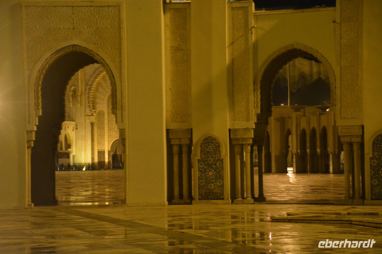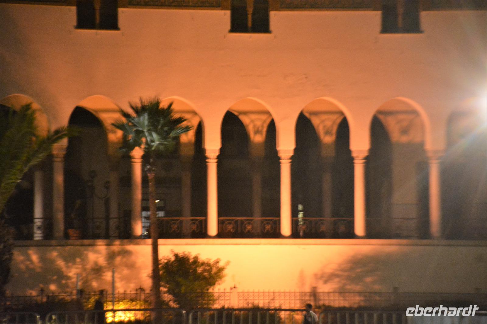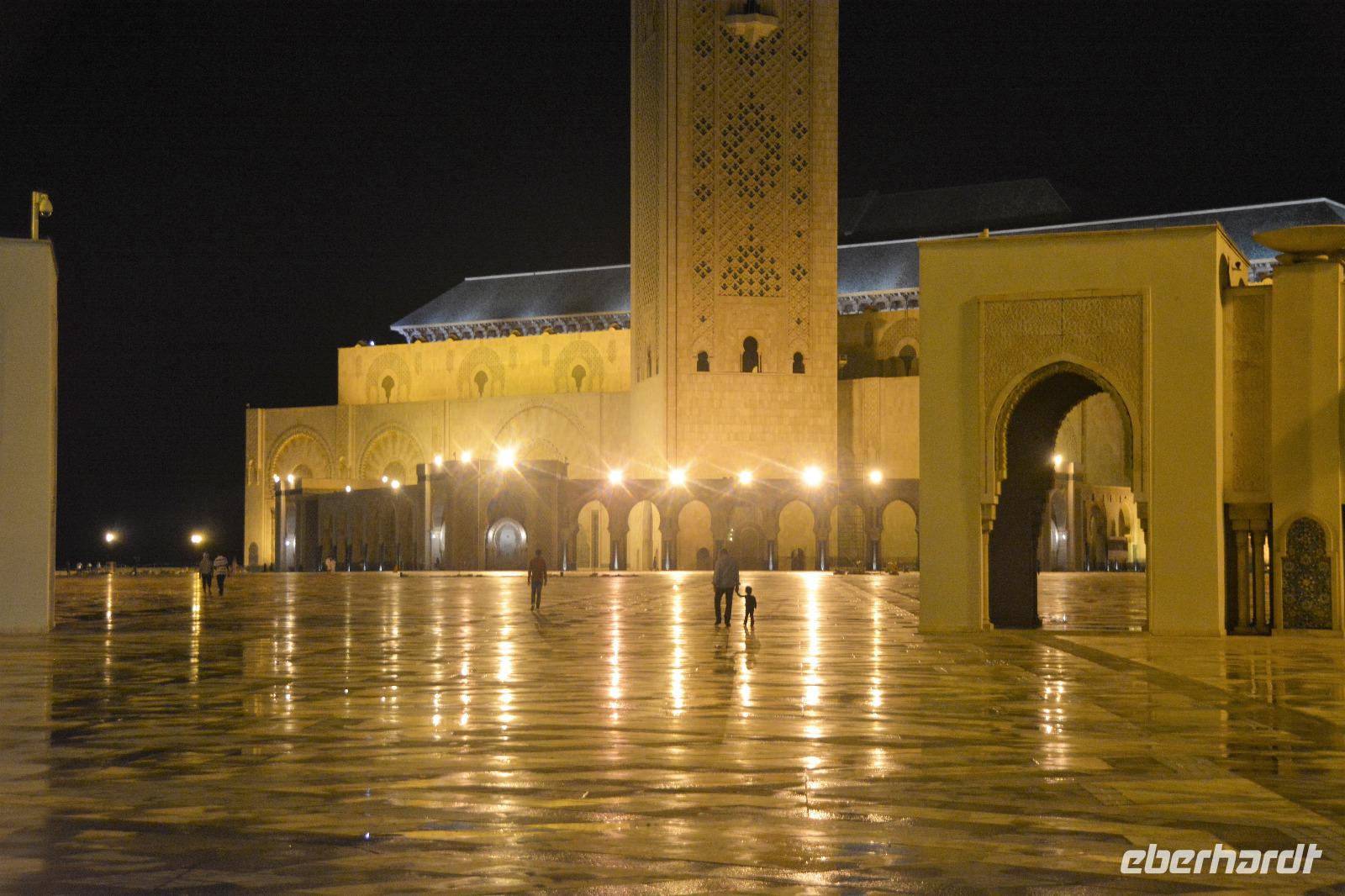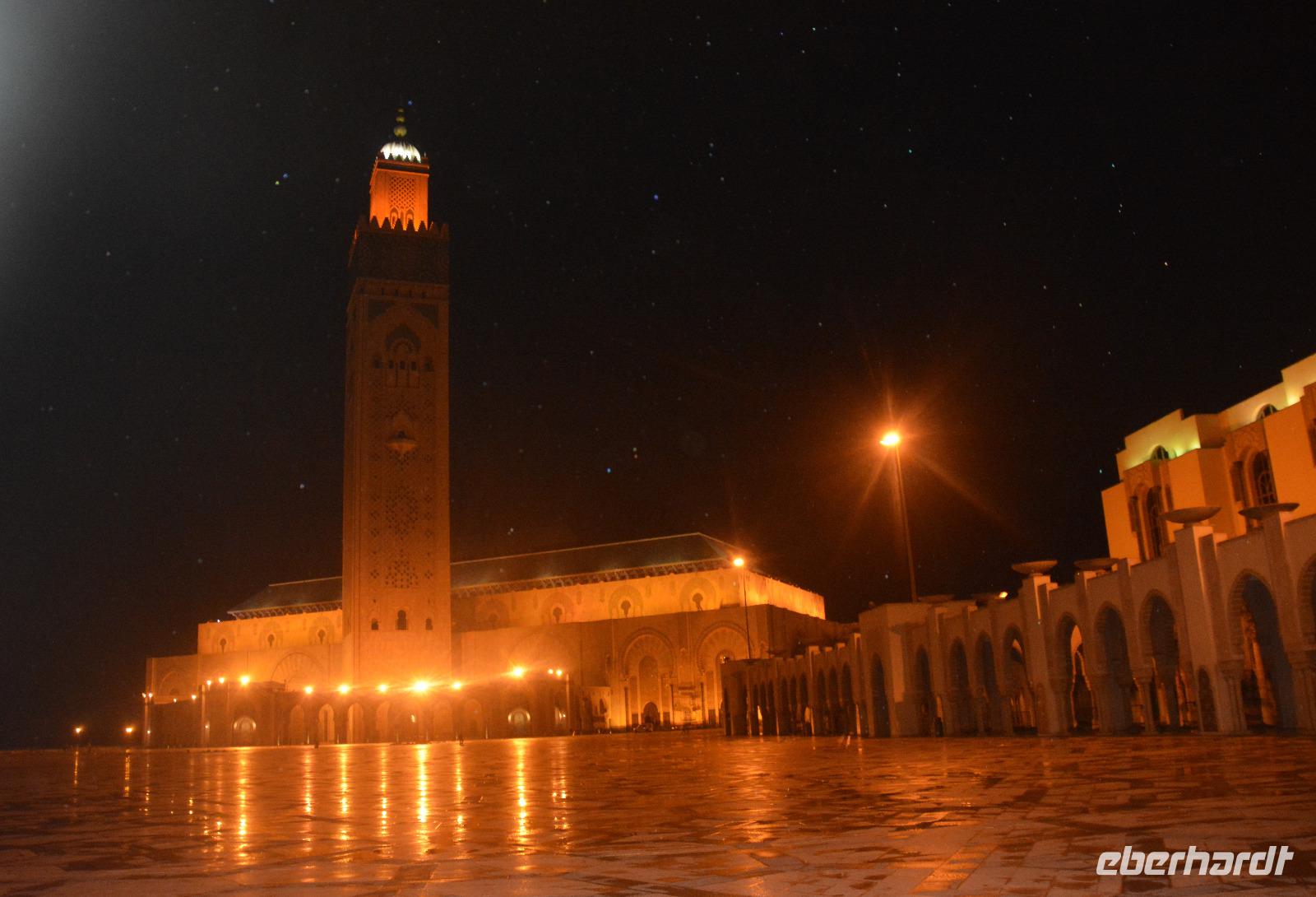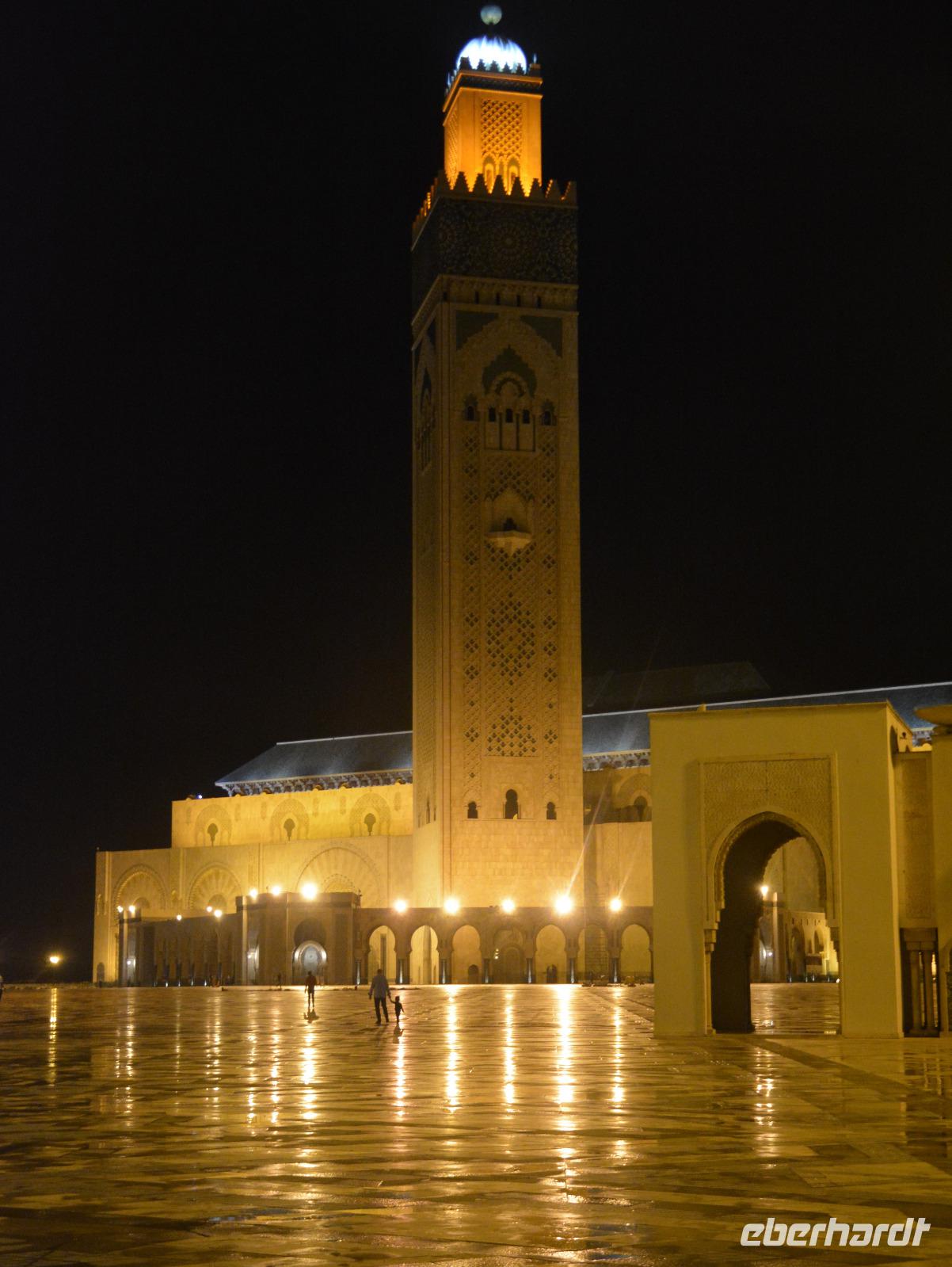 Weiter geht unsere Fahrt auf dem letzten Stück nach Casa auf der Autobahn, die gebührenpflichtig ist. Casablanca ist die größte und modernste Stadt Marokkos und Sehnsuchtsziel von Aussteigern und Intellektuellen früherer Zeiten. Das mag vielleicht auch die Amerikanerin veranlaßt haben, den Mythos "Rick's Café" auferstehen zu lassen. Denn dort wollen wir heute abend speisen. Im Hotel erfahren wir, daß unser Essen auf 22.00 Uhr verschoben wurde aber Gina und Mohammed wissen Rat. Wir gehen auf unser Zimmer zum Umziehen und treffen uns für eine Stadtrundfahrt bei Nacht in Casablanca. Wir fahren zum Platz Mohammed V., benannt nach dem Großvater des jetzigen Königs. Die Bauwerke hier am Platz stammen aus der Zeit des französischen Protektorats und wurden von den Architekten Robert Marrast und Henri Prost entworfen. Sie beinhalten maurische und europäische Elemente oder sind im Art-Deco-Stil gehalten. Wir betrachten den Justizpalast. Auch die Hauptpost und das französische Konsulat mit dem Reiterstandbild von Hubert Lyautey, dem französischen Marschall zur Protektoratszeit, sind zu sehen. Gerade werden Restaurierungsarbeiten auf dem Platz durchgeführt. Anschließend bewundert wir die wunderschöne Moschee Hassan II bei nächtlicher Beleuchtung.
