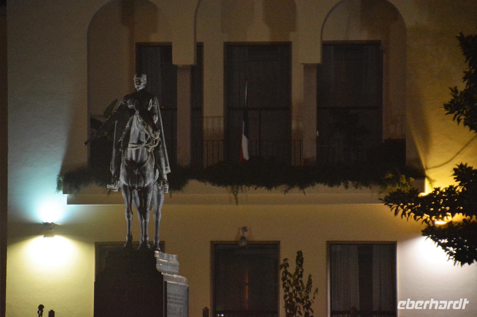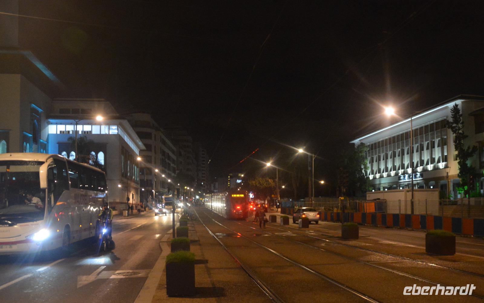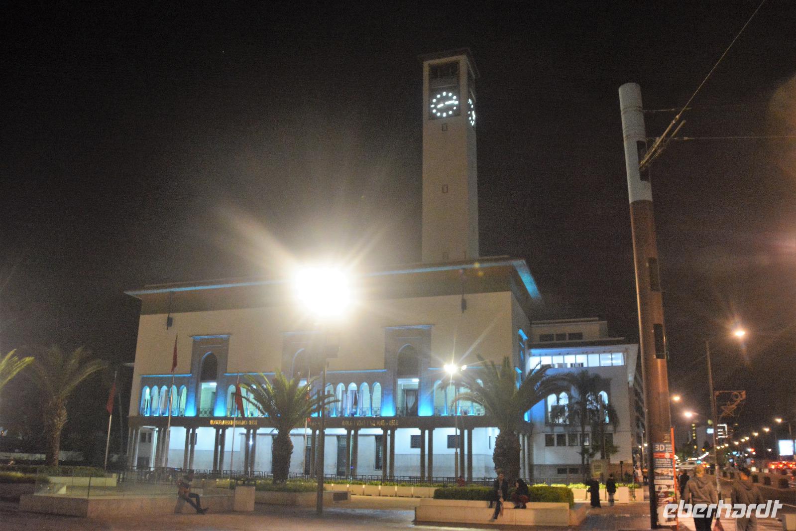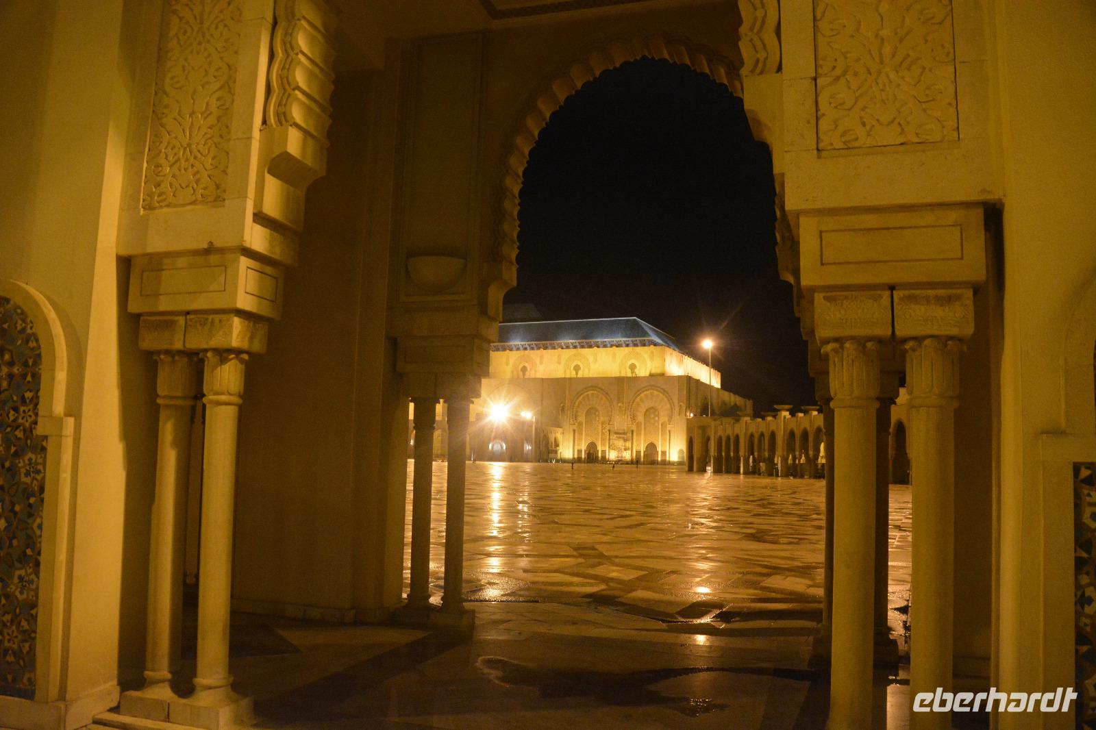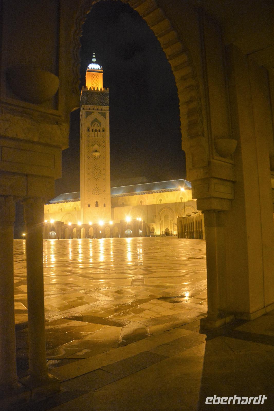Weiter geht unsere Fahrt auf dem letzten Stück nach Casa auf der Autobahn, die gebührenpflichtig ist. Casablanca ist die größte und modernste Stadt Marokkos und Sehnsuchtsziel von Aussteigern und Intellektuellen früherer Zeiten. Das mag vielleicht auch die Amerikanerin veranlaßt haben, den Mythos "Rick's Café" auferstehen zu lassen. Denn dort wollen wir heute abend speisen. Im Hotel erfahren wir, daß unser Essen auf 22.00 Uhr verschoben wurde aber Gina und Mohammed wissen Rat. Wir gehen auf unser Zimmer zum Umziehen und treffen uns für eine Stadtrundfahrt bei Nacht in Casablanca. Wir fahren zum Platz Mohammed V., benannt nach dem Großvater des jetzigen Königs. Die Bauwerke hier am Platz stammen aus der Zeit des französischen Protektorats und wurden von den Architekten Robert Marrast und Henri Prost entworfen. Sie beinhalten maurische und europäische Elemente oder sind im Art-Deco-Stil gehalten. Wir betrachten den Justizpalast. Auch die Hauptpost und das französische Konsulat mit dem Reiterstandbild von Hubert Lyautey, dem französischen Marschall zur Protektoratszeit, sind zu sehen. Gerade werden Restaurierungsarbeiten auf dem Platz durchgeführt. Anschließend bewundert wir die wunderschöne Moschee Hassan II bei nächtlicher Beleuchtung.