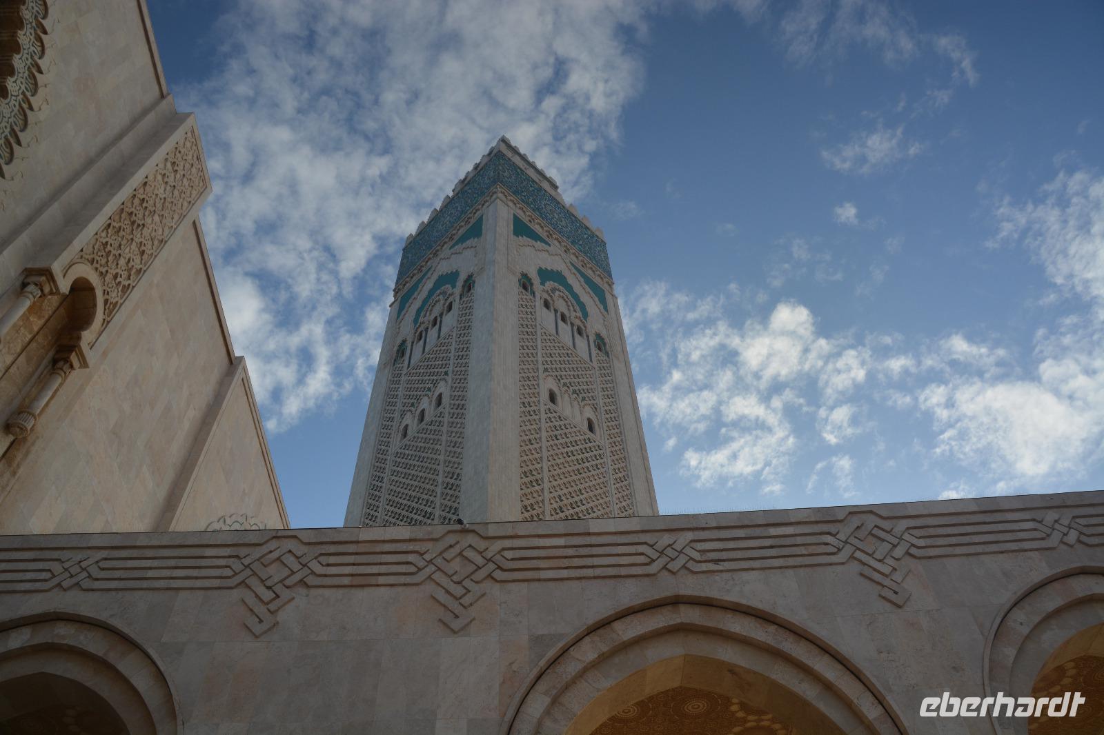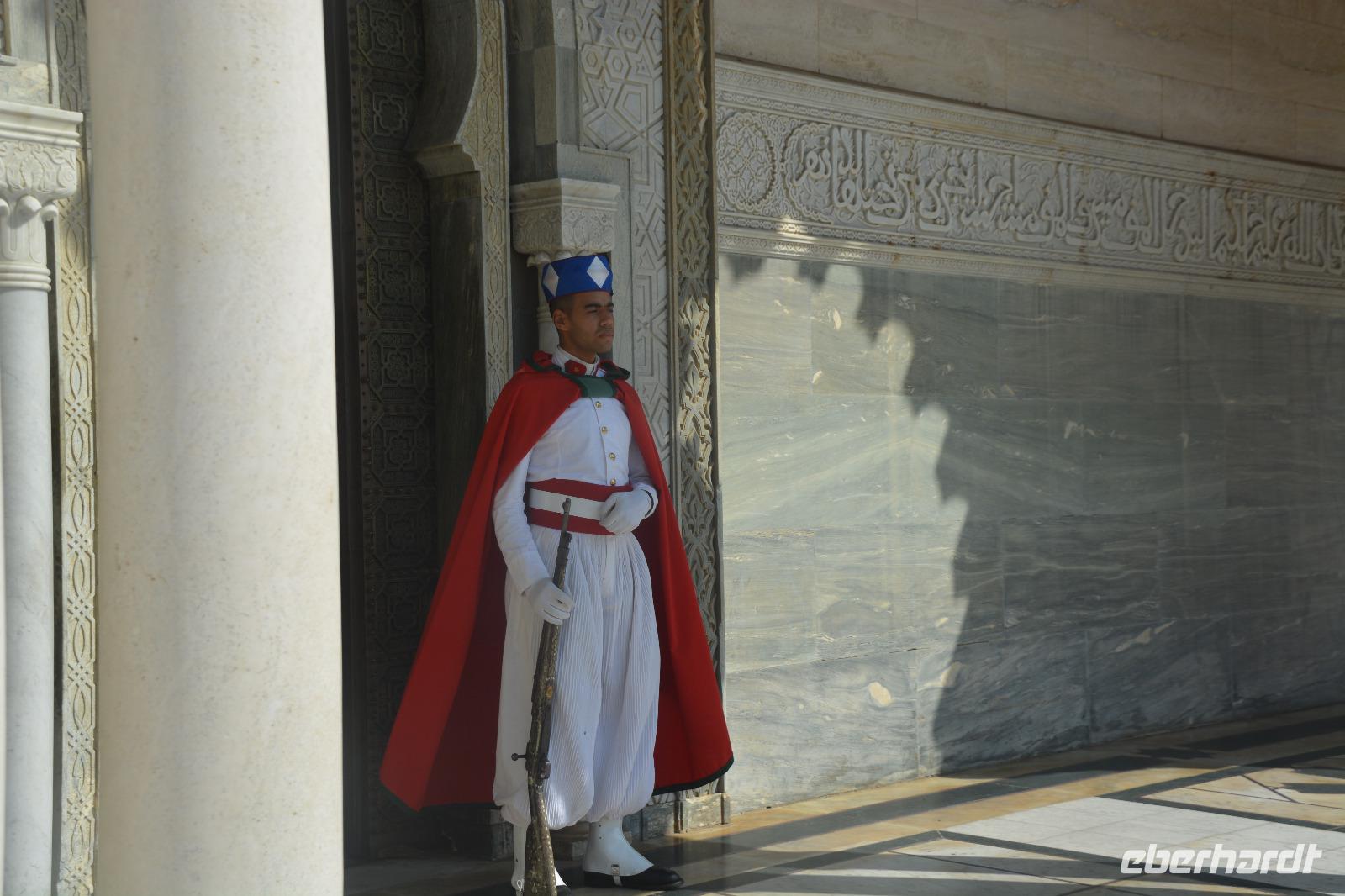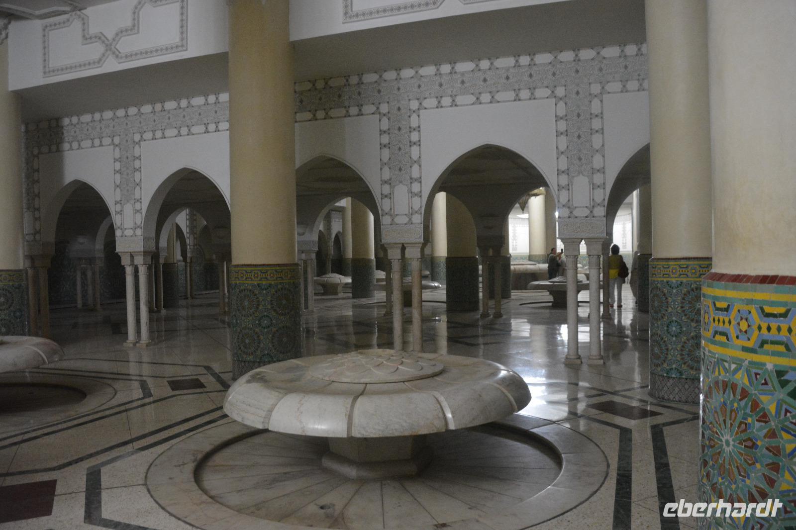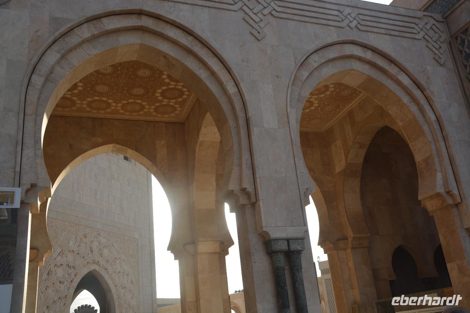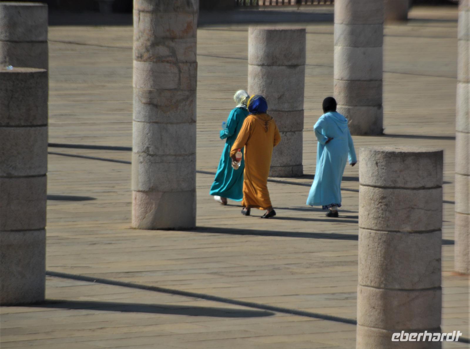 Heute morgen sind wir ganz gespannt auf das wohl imposanteste Gebäude Casablancas, wenn nicht Marokkos: die Moschee Hassan II. Diese zweitgrößte Moschee der Welt ist mit ihren technischen Raffinessen und ihrer Ästhetik ein wahres Meisterwerk der Architektur. Mit 210 Metern Höhe ist das Minarett das höchste der Welt. Wir sind tief beeindruckt von der Wirkung dieses Baus. Draußen steigt die Sonne schon wieder höher und wir verlassen diesen Ort nach ausgiebiger Besichtigung um in die Hauptstadt Rabat weiterzufahren. Nicht, ohne entlang der Corniche einen kleinen Eindruck vom "Savoir vivre" Casablancas zu bekommen. Wir werfen noch einen Blick auf den Leuchtturm von "Casa" und fahren vorbei an einigen Moscheen und den Grundstücken der Saudischen Familie in Richtung der Autobahn nach Rabat. Auch hier sieht man, daß es nicht nur reiche Menschen in Casablanca gibt. Die Slums sind zahlreich am Rande der Stadt. Wir fahren über die Autobahn in Richtung Hauptstadt und über die mit 954,30 m Länge längste Schrägseilbrücke Afrikas, die Brücke Mohammed VI. Sie wurde 2016 fertiggestellt. Nach einer Kräftigung durch eine echte marokkanische Tajine fahren wir zum Mausoleum in dem Mohammed V und sein Sohn Hassan II begraben sind. Es liegt neben einer von den Almohaden begonnenen aber unvollendeten Moschee. Es ist die Dynastie, welche den marokkanischen nationalen Baustil vorwiegend prägte und weiter nach Andalusien exportierte. Am Königspalast bekommen wir von Mohammed die Kleider und die Funktionen der königlichen Angestellten erklärt. In der Chellah, eine Nekropole der Meriniden, die inmitten eines grünen Parks liegt, können wir etwas entspannen.