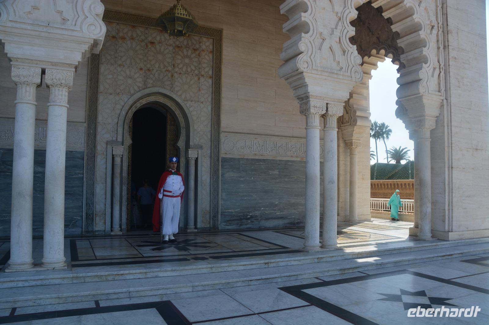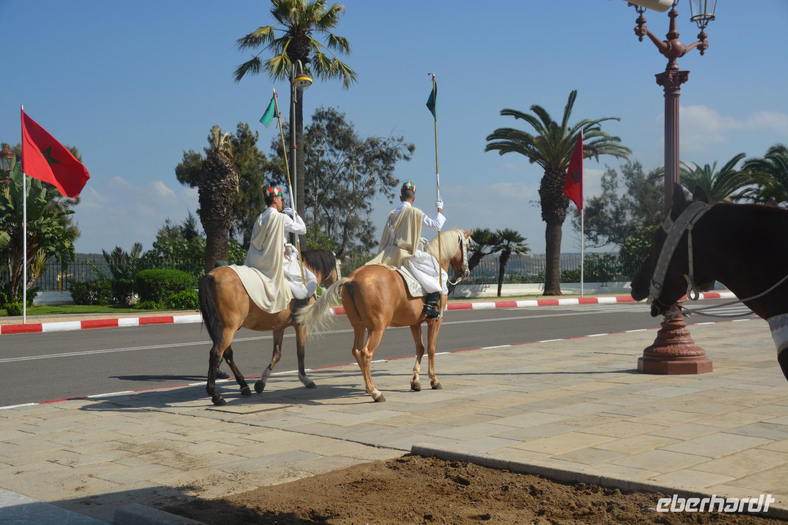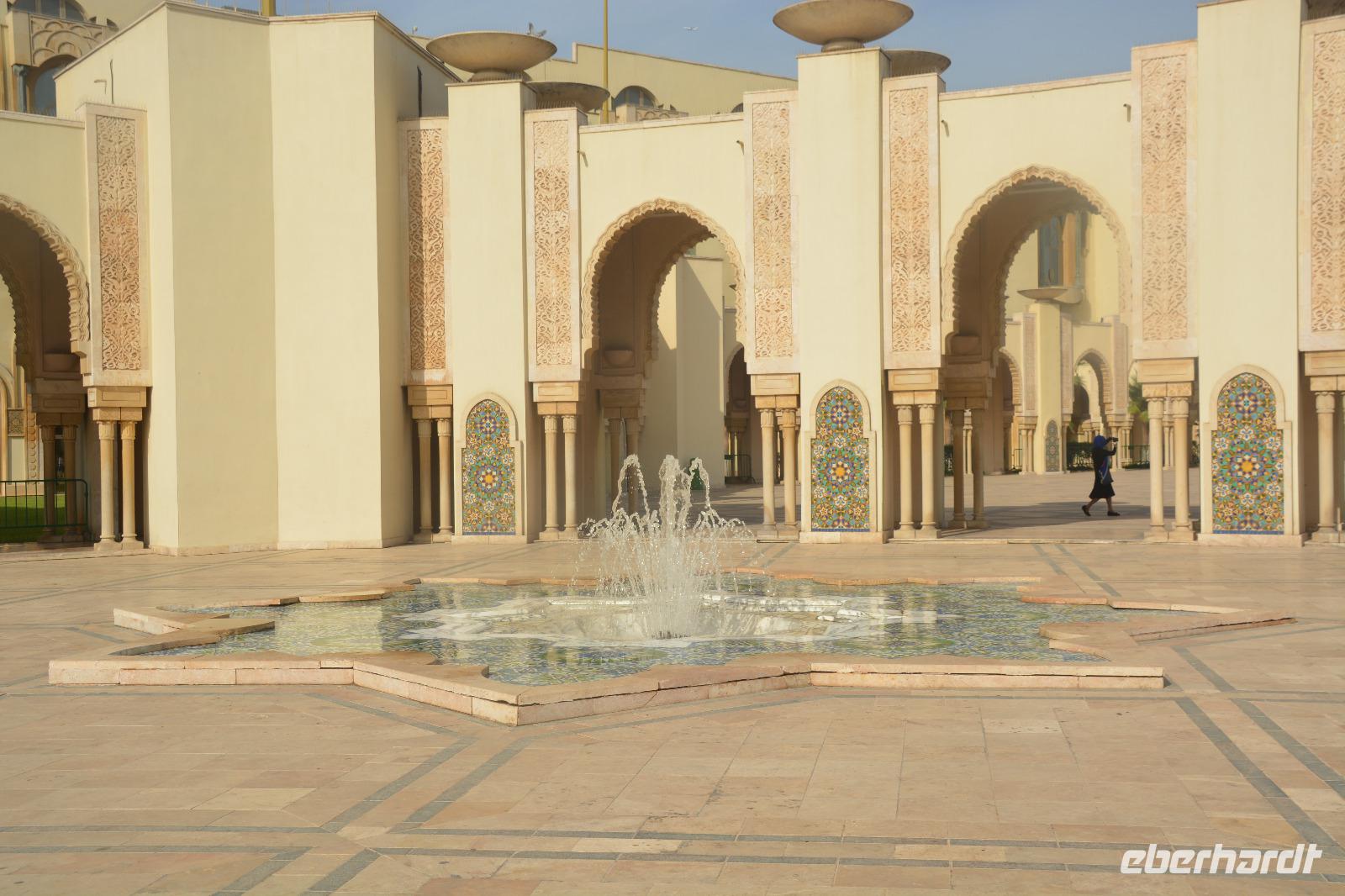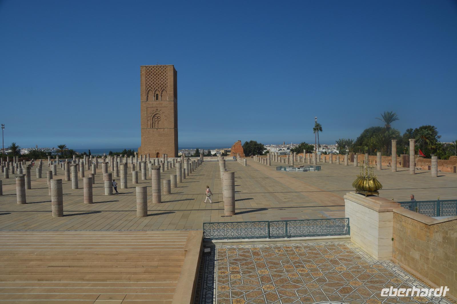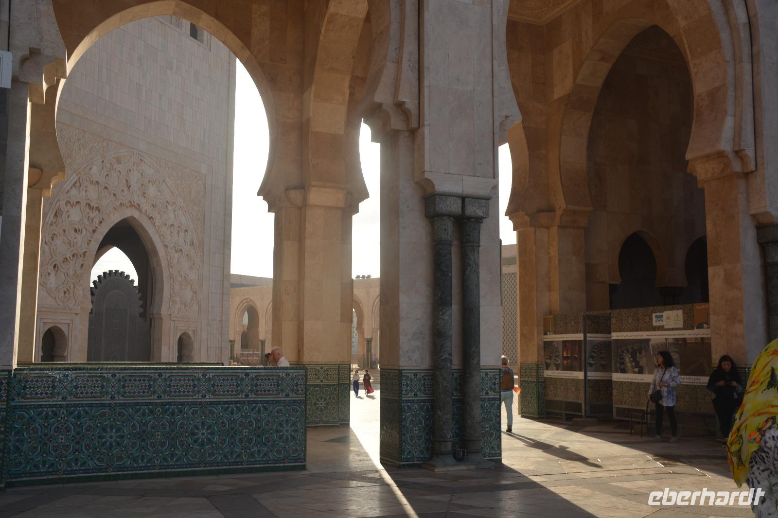 Heute morgen sind wir ganz gespannt auf das wohl imposanteste Gebäude Casablancas, wenn nicht Marokkos: die Moschee Hassan II. Diese zweitgrößte Moschee der Welt ist mit ihren technischen Raffinessen und ihrer Ästhetik ein wahres Meisterwerk der Architektur. Mit 210 Metern Höhe ist das Minarett das höchste der Welt. Wir sind tief beeindruckt von der Wirkung dieses Baus. Draußen steigt die Sonne schon wieder höher und wir verlassen diesen Ort nach ausgiebiger Besichtigung um in die Hauptstadt Rabat weiterzufahren. Nicht, ohne entlang der Corniche einen kleinen Eindruck vom "Savoir vivre" Casablancas zu bekommen. Wir werfen noch einen Blick auf den Leuchtturm von "Casa" und fahren vorbei an einigen Moscheen und den Grundstücken der Saudischen Familie in Richtung der Autobahn nach Rabat. Auch hier sieht man, daß es nicht nur reiche Menschen in Casablanca gibt. Die Slums sind zahlreich am Rande der Stadt. Wir fahren über die Autobahn in Richtung Hauptstadt und über die mit 954,30 m Länge längste Schrägseilbrücke Afrikas, die Brücke Mohammed VI. Sie wurde 2016 fertiggestellt. Nach einer Kräftigung durch eine echte marokkanische Tajine fahren wir zum Mausoleum in dem Mohammed V und sein Sohn Hassan II begraben sind. Es liegt neben einer von den Almohaden begonnenen aber unvollendeten Moschee. Es ist die Dynastie, welche den marokkanischen nationalen Baustil vorwiegend prägte und weiter nach Andalusien exportierte. Am Königspalast bekommen wir von Mohammed die Kleider und die Funktionen der königlichen Angestellten erklärt. In der Chellah, eine Nekropole der Meriniden, die inmitten eines grünen Parks liegt, können wir etwas entspannen.