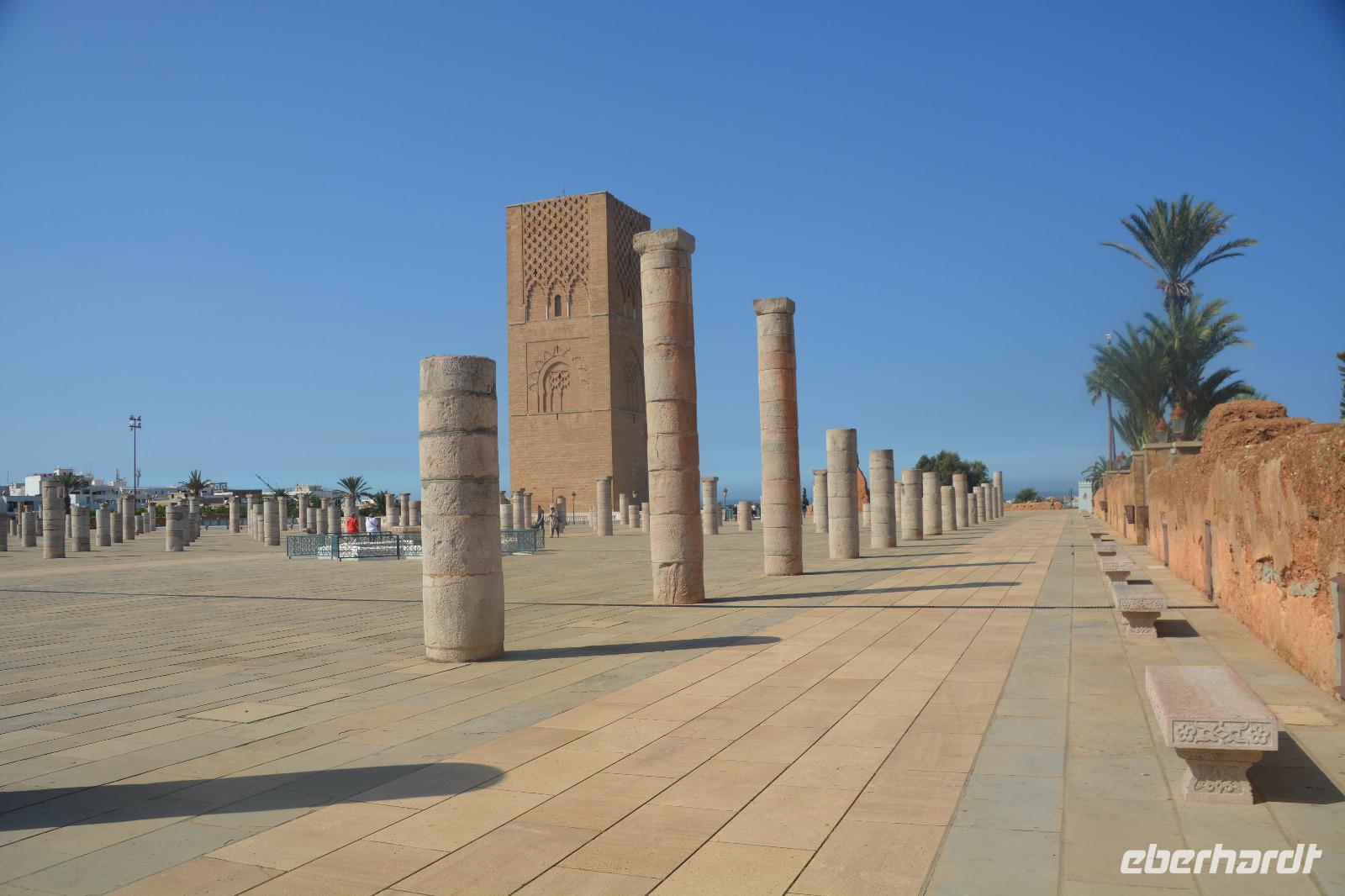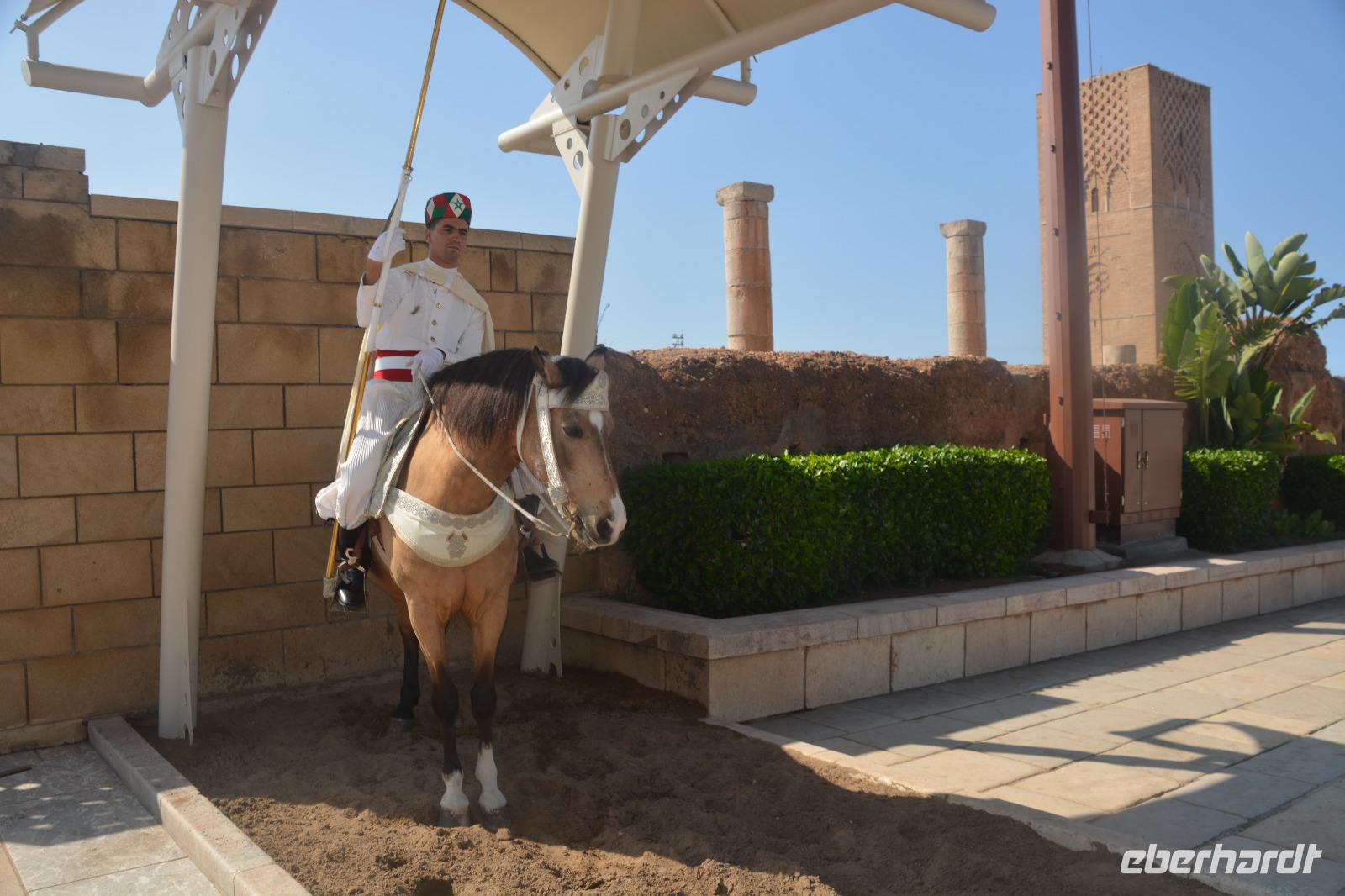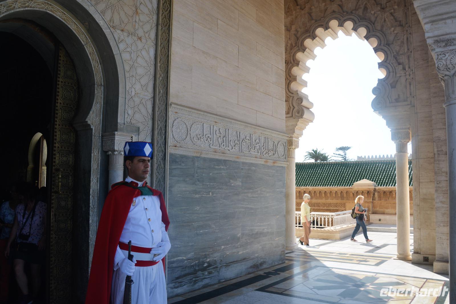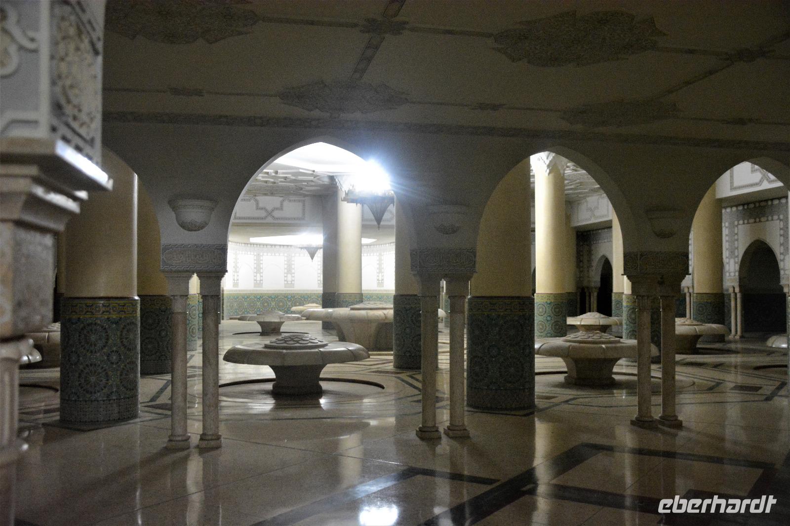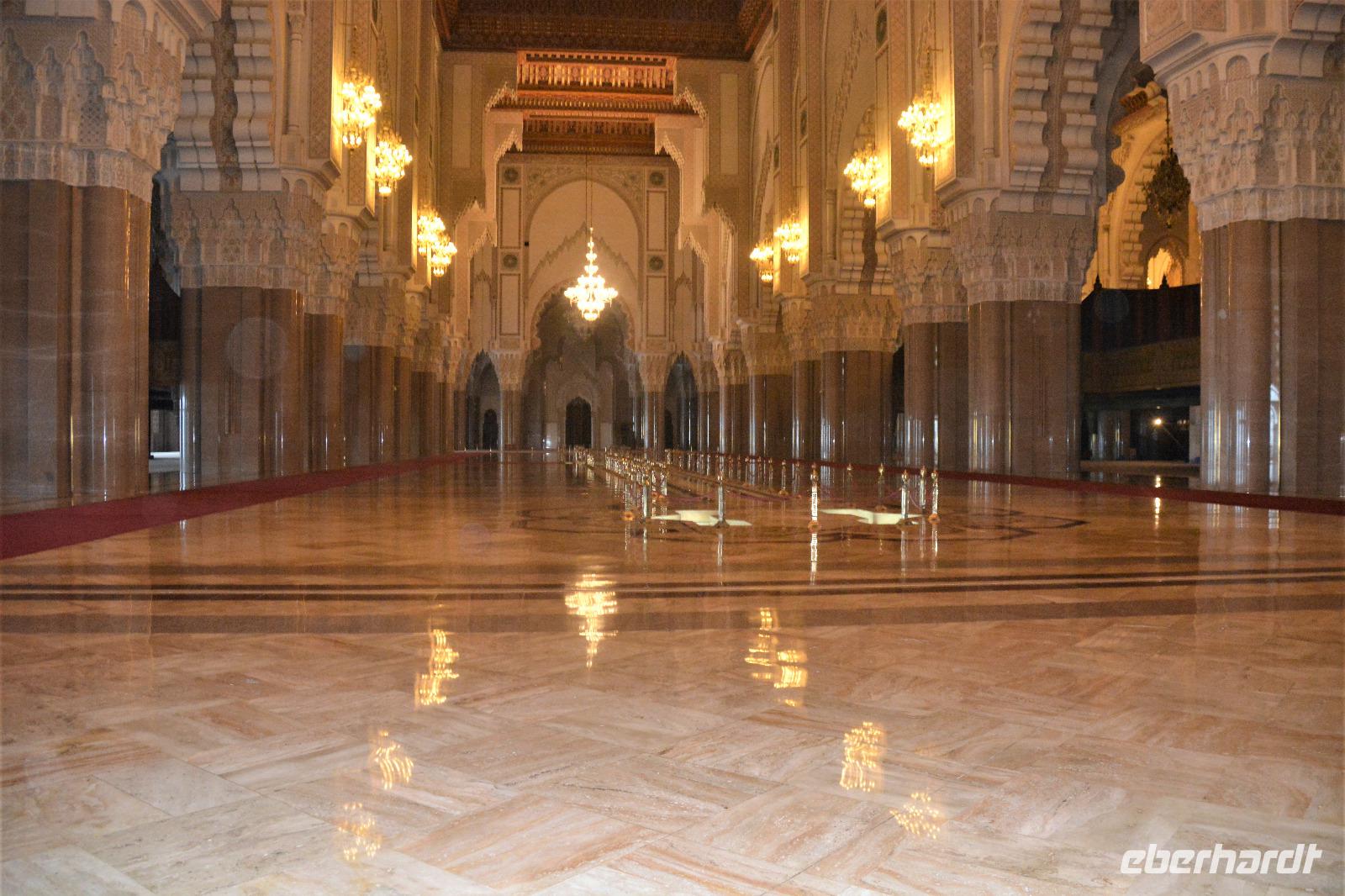 Heute morgen sind wir ganz gespannt auf das wohl imposanteste Gebäude Casablancas, wenn nicht Marokkos: die Moschee Hassan II. Diese zweitgrößte Moschee der Welt ist mit ihren technischen Raffinessen und ihrer Ästhetik ein wahres Meisterwerk der Architektur. Mit 210 Metern Höhe ist das Minarett das höchste der Welt. Wir sind tief beeindruckt von der Wirkung dieses Baus. Draußen steigt die Sonne schon wieder höher und wir verlassen diesen Ort nach ausgiebiger Besichtigung um in die Hauptstadt Rabat weiterzufahren. Nicht, ohne entlang der Corniche einen kleinen Eindruck vom "Savoir vivre" Casablancas zu bekommen. Wir werfen noch einen Blick auf den Leuchtturm von "Casa" und fahren vorbei an einigen Moscheen und den Grundstücken der Saudischen Familie in Richtung der Autobahn nach Rabat. Auch hier sieht man, daß es nicht nur reiche Menschen in Casablanca gibt. Die Slums sind zahlreich am Rande der Stadt. Wir fahren über die Autobahn in Richtung Hauptstadt und über die mit 954,30 m Länge längste Schrägseilbrücke Afrikas, die Brücke Mohammed VI. Sie wurde 2016 fertiggestellt. Nach einer Kräftigung durch eine echte marokkanische Tajine fahren wir zum Mausoleum in dem Mohammed V und sein Sohn Hassan II begraben sind. Es liegt neben einer von den Almohaden begonnenen aber unvollendeten Moschee. Es ist die Dynastie, welche den marokkanischen nationalen Baustil vorwiegend prägte und weiter nach Andalusien exportierte. Am Königspalast bekommen wir von Mohammed die Kleider und die Funktionen der königlichen Angestellten erklärt. In der Chellah, eine Nekropole der Meriniden, die inmitten eines grünen Parks liegt, können wir etwas entspannen.
