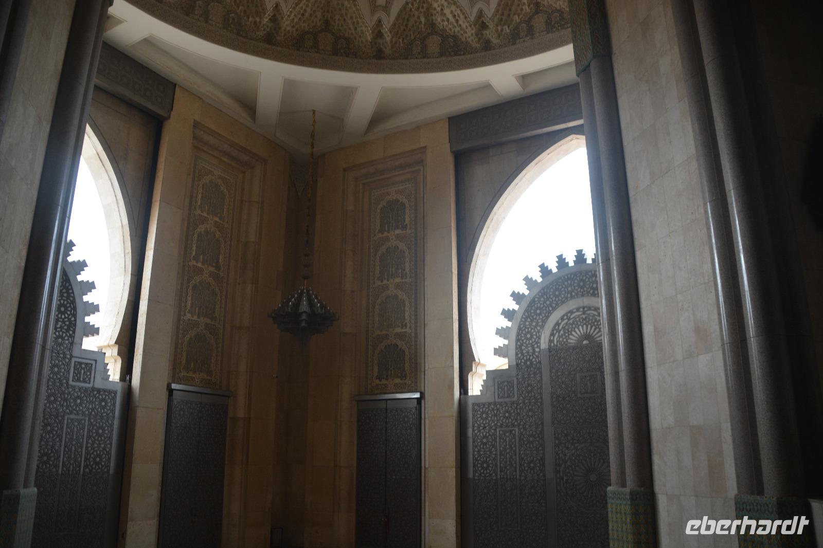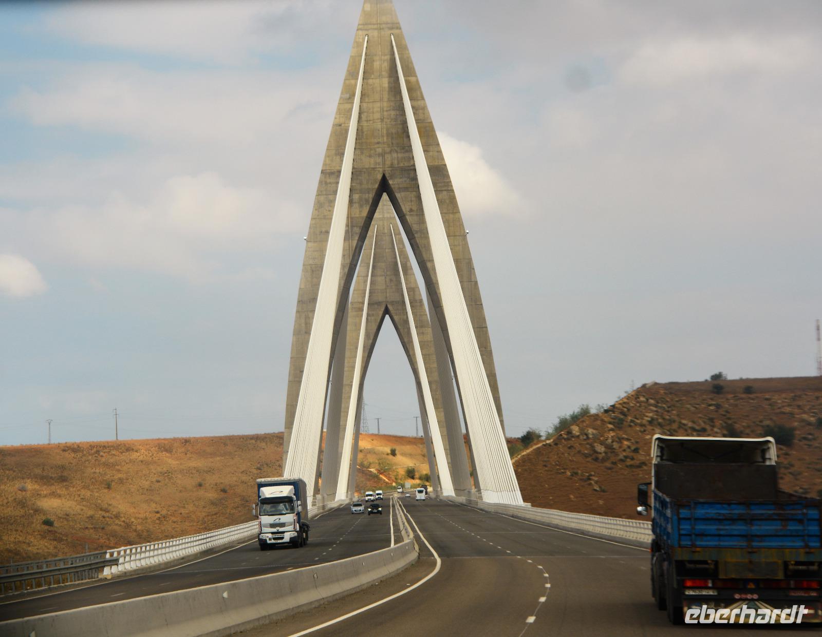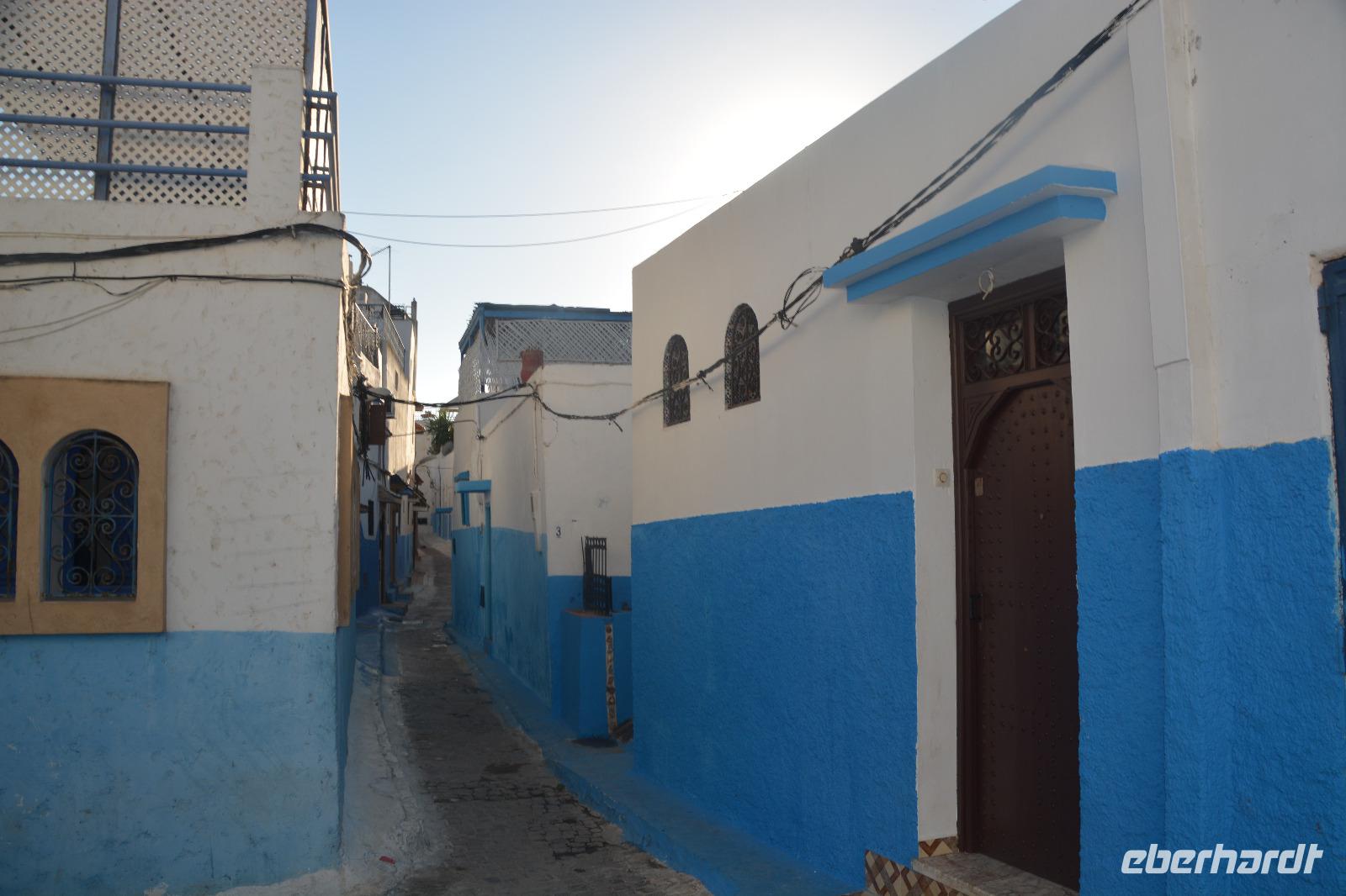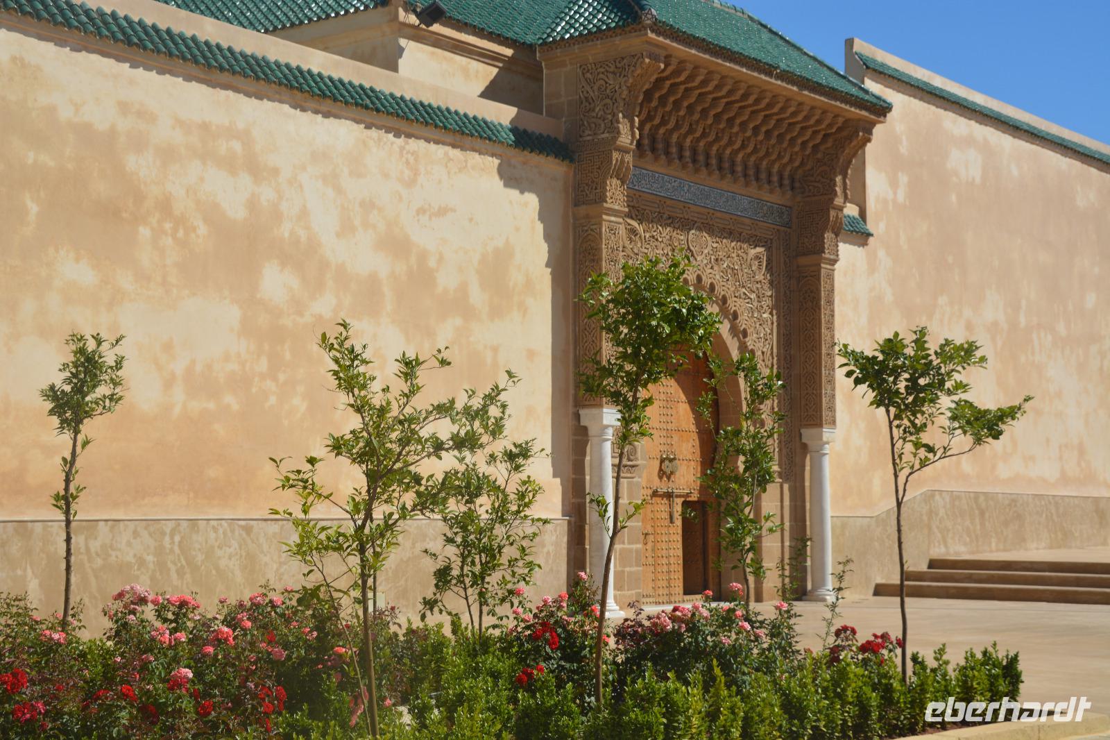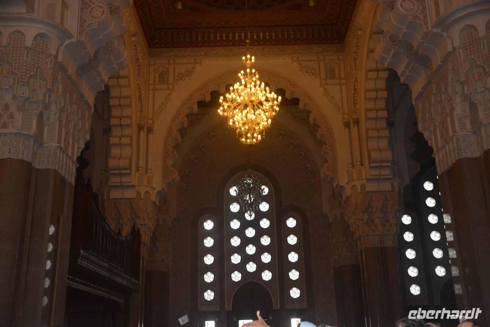 Heute morgen sind wir ganz gespannt auf das wohl imposanteste Gebäude Casablancas, wenn nicht Marokkos: die Moschee Hassan II. Diese zweitgrößte Moschee der Welt ist mit ihren technischen Raffinessen und ihrer Ästhetik ein wahres Meisterwerk der Architektur. Mit 210 Metern Höhe ist das Minarett das höchste der Welt. Wir sind tief beeindruckt von der Wirkung dieses Baus. Draußen steigt die Sonne schon wieder höher und wir verlassen diesen Ort nach ausgiebiger Besichtigung um in die Hauptstadt Rabat weiterzufahren. Nicht, ohne entlang der Corniche einen kleinen Eindruck vom "Savoir vivre" Casablancas zu bekommen. Wir werfen noch einen Blick auf den Leuchtturm von "Casa" und fahren vorbei an einigen Moscheen und den Grundstücken der Saudischen Familie in Richtung der Autobahn nach Rabat. Auch hier sieht man, daß es nicht nur reiche Menschen in Casablanca gibt. Die Slums sind zahlreich am Rande der Stadt. Wir fahren über die Autobahn in Richtung Hauptstadt und über die mit 954,30 m Länge längste Schrägseilbrücke Afrikas, die Brücke Mohammed VI. Sie wurde 2016 fertiggestellt. Nach einer Kräftigung durch eine echte marokkanische Tajine fahren wir zum Mausoleum in dem Mohammed V und sein Sohn Hassan II begraben sind. Es liegt neben einer von den Almohaden begonnenen aber unvollendeten Moschee. Es ist die Dynastie, welche den marokkanischen nationalen Baustil vorwiegend prägte und weiter nach Andalusien exportierte. Am Königspalast bekommen wir von Mohammed die Kleider und die Funktionen der königlichen Angestellten erklärt. In der Chellah, eine Nekropole der Meriniden, die inmitten eines grünen Parks liegt, können wir etwas entspannen.
