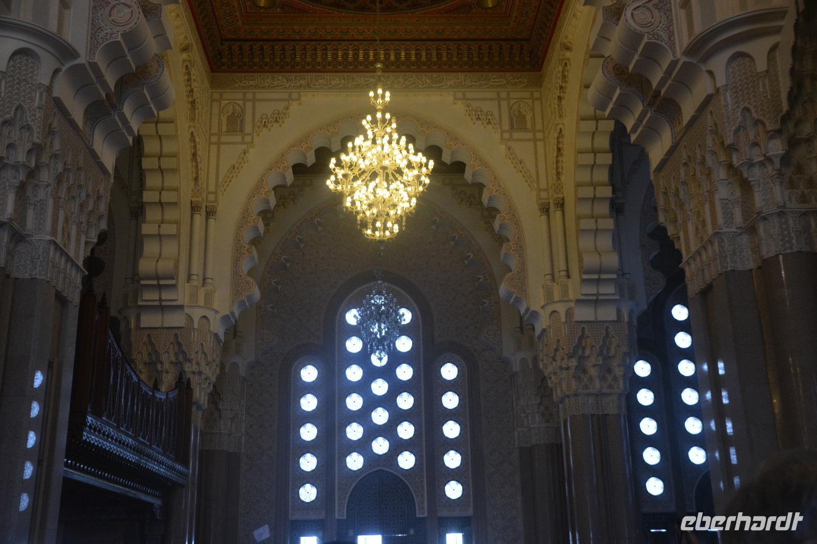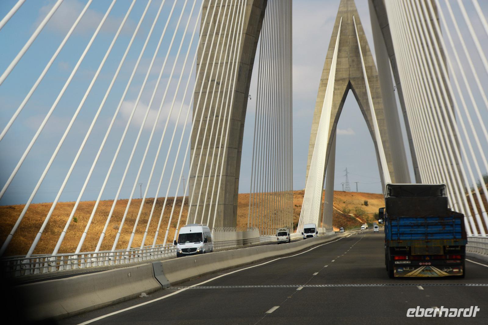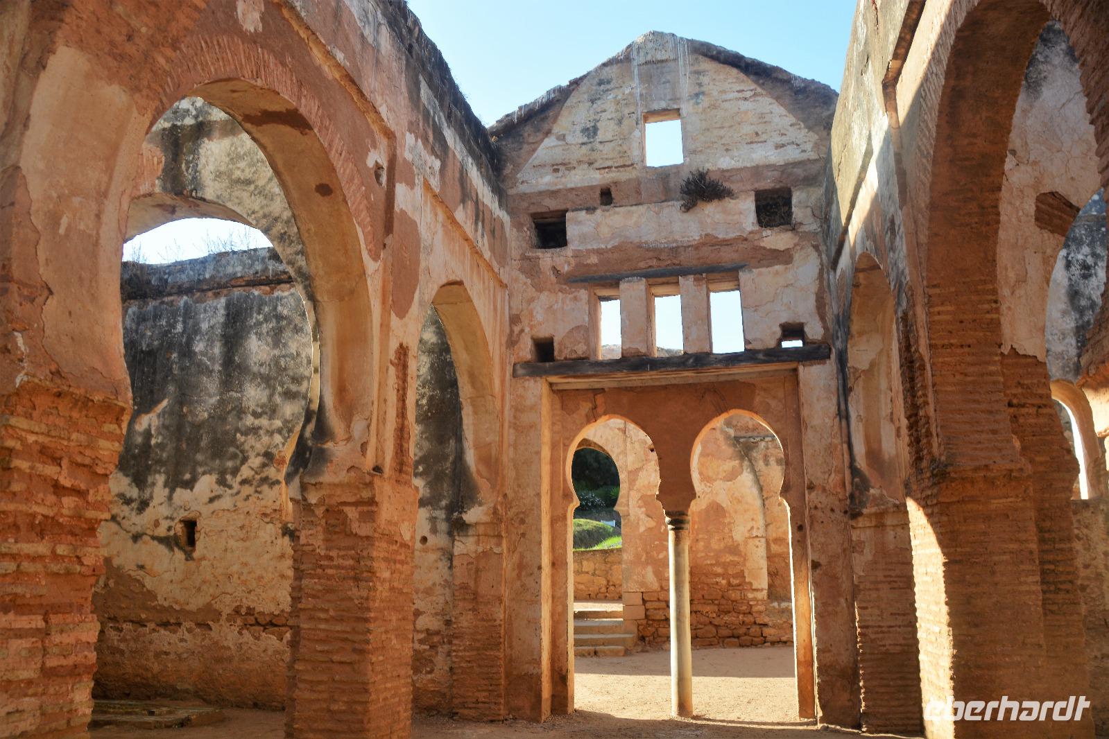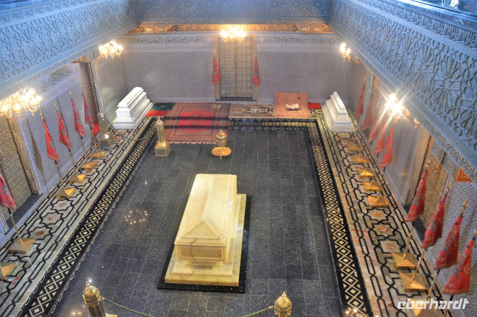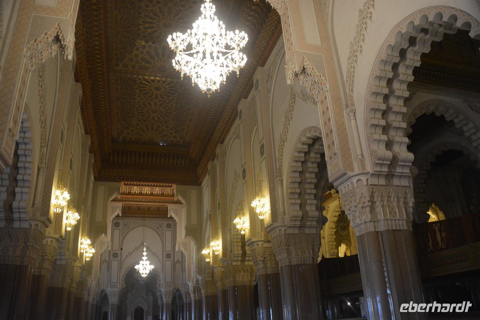 Heute morgen sind wir ganz gespannt auf das wohl imposanteste Gebäude Casablancas, wenn nicht Marokkos: die Moschee Hassan II. Diese zweitgrößte Moschee der Welt ist mit ihren technischen Raffinessen und ihrer Ästhetik ein wahres Meisterwerk der Architektur. Mit 210 Metern Höhe ist das Minarett das höchste der Welt. Wir sind tief beeindruckt von der Wirkung dieses Baus. Draußen steigt die Sonne schon wieder höher und wir verlassen diesen Ort nach ausgiebiger Besichtigung um in die Hauptstadt Rabat weiterzufahren. Nicht, ohne entlang der Corniche einen kleinen Eindruck vom "Savoir vivre" Casablancas zu bekommen. Wir werfen noch einen Blick auf den Leuchtturm von "Casa" und fahren vorbei an einigen Moscheen und den Grundstücken der Saudischen Familie in Richtung der Autobahn nach Rabat. Auch hier sieht man, daß es nicht nur reiche Menschen in Casablanca gibt. Die Slums sind zahlreich am Rande der Stadt. Wir fahren über die Autobahn in Richtung Hauptstadt und über die mit 954,30 m Länge längste Schrägseilbrücke Afrikas, die Brücke Mohammed VI. Sie wurde 2016 fertiggestellt. Nach einer Kräftigung durch eine echte marokkanische Tajine fahren wir zum Mausoleum in dem Mohammed V und sein Sohn Hassan II begraben sind. Es liegt neben einer von den Almohaden begonnenen aber unvollendeten Moschee. Es ist die Dynastie, welche den marokkanischen nationalen Baustil vorwiegend prägte und weiter nach Andalusien exportierte. Am Königspalast bekommen wir von Mohammed die Kleider und die Funktionen der königlichen Angestellten erklärt. In der Chellah, eine Nekropole der Meriniden, die inmitten eines grünen Parks liegt, können wir etwas entspannen.
