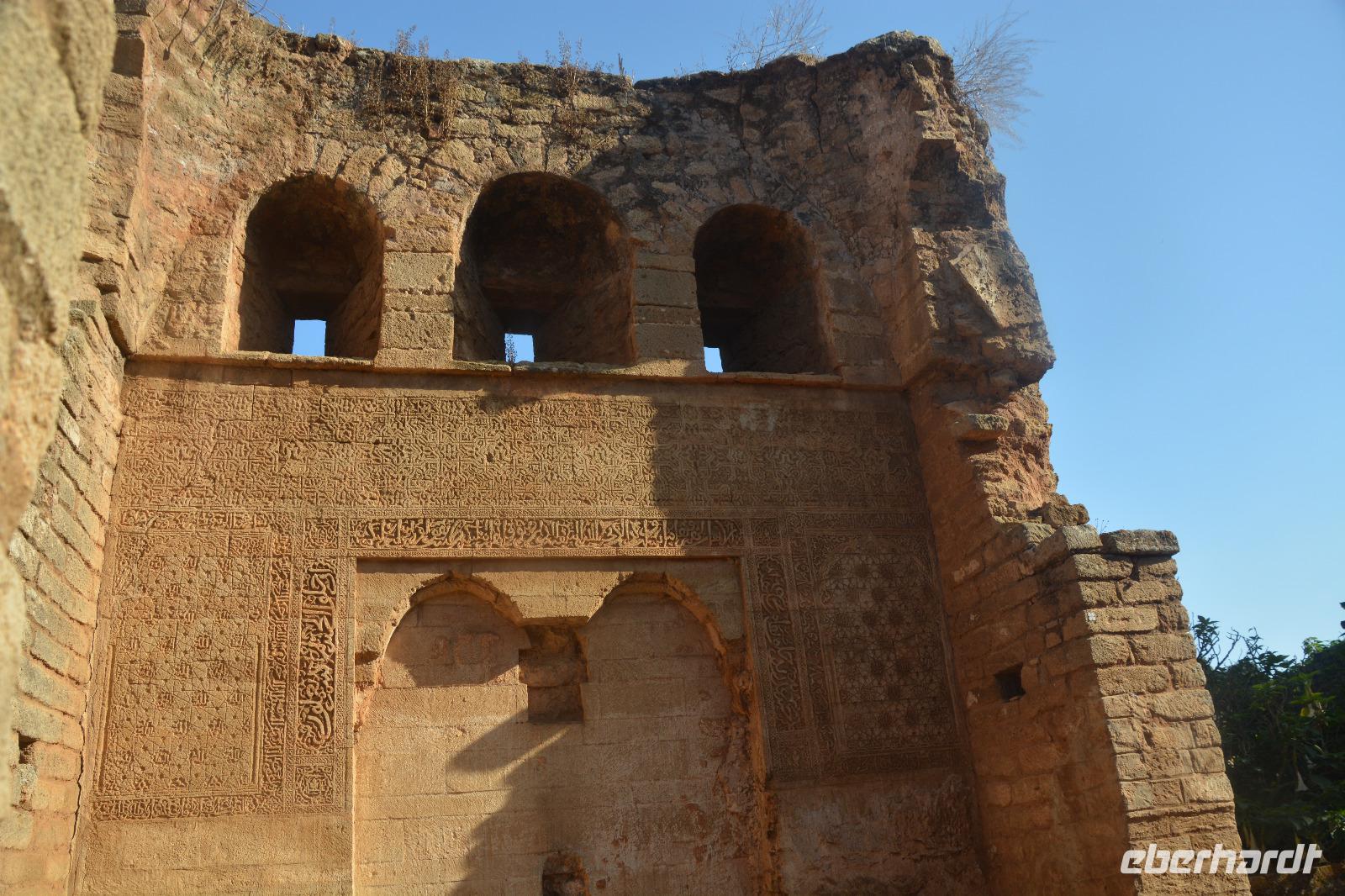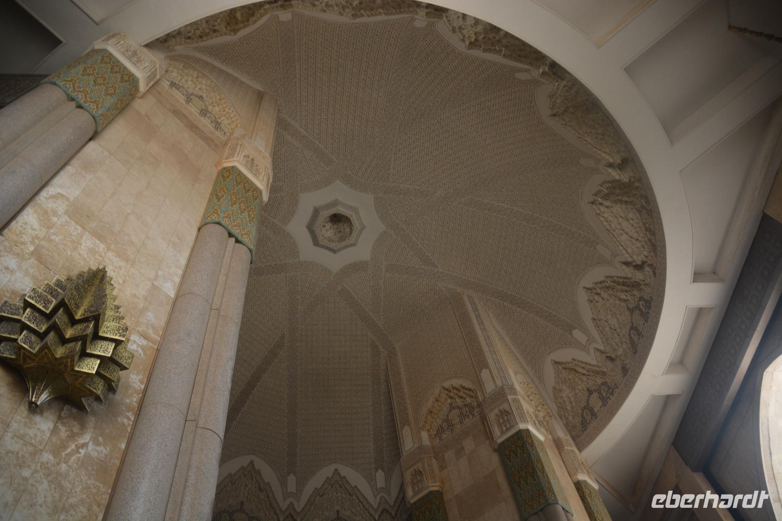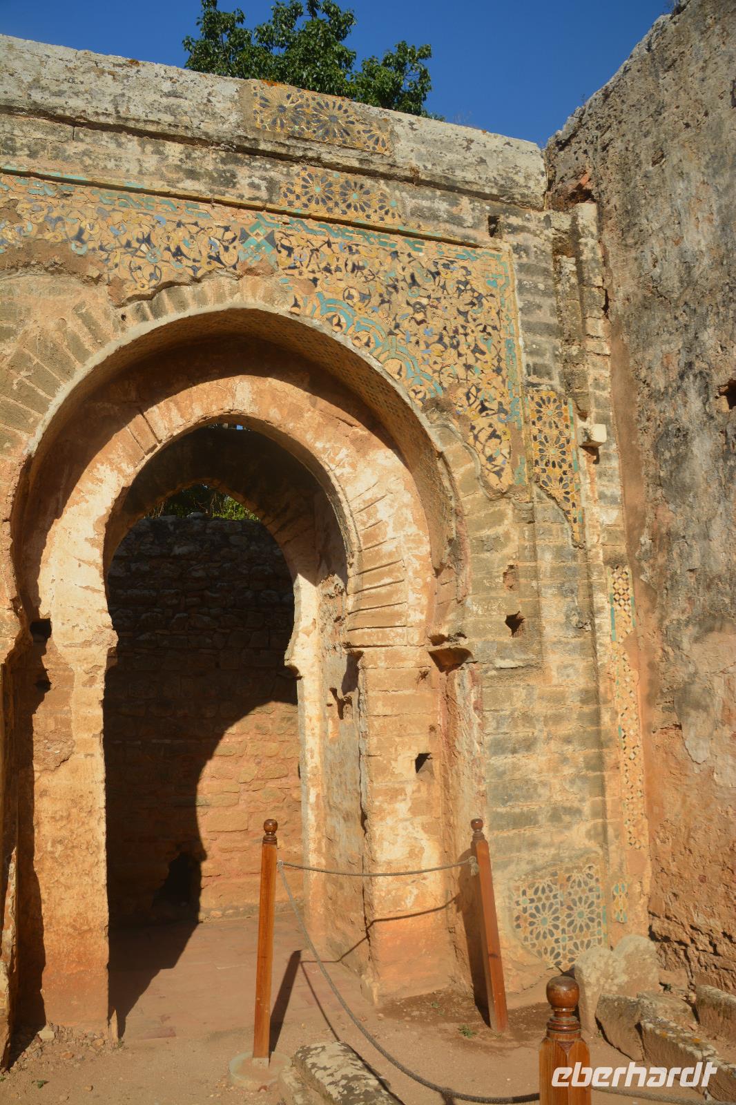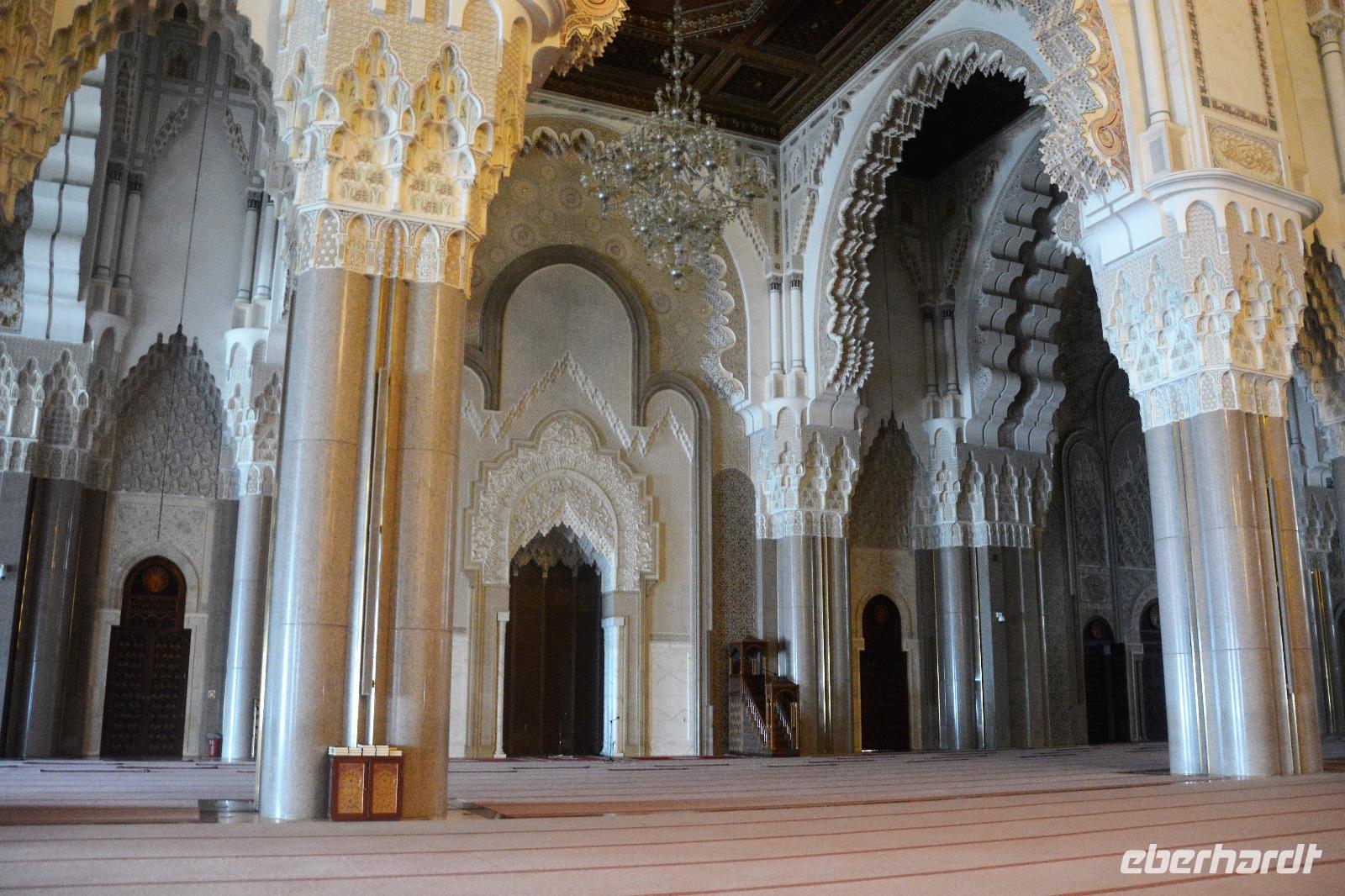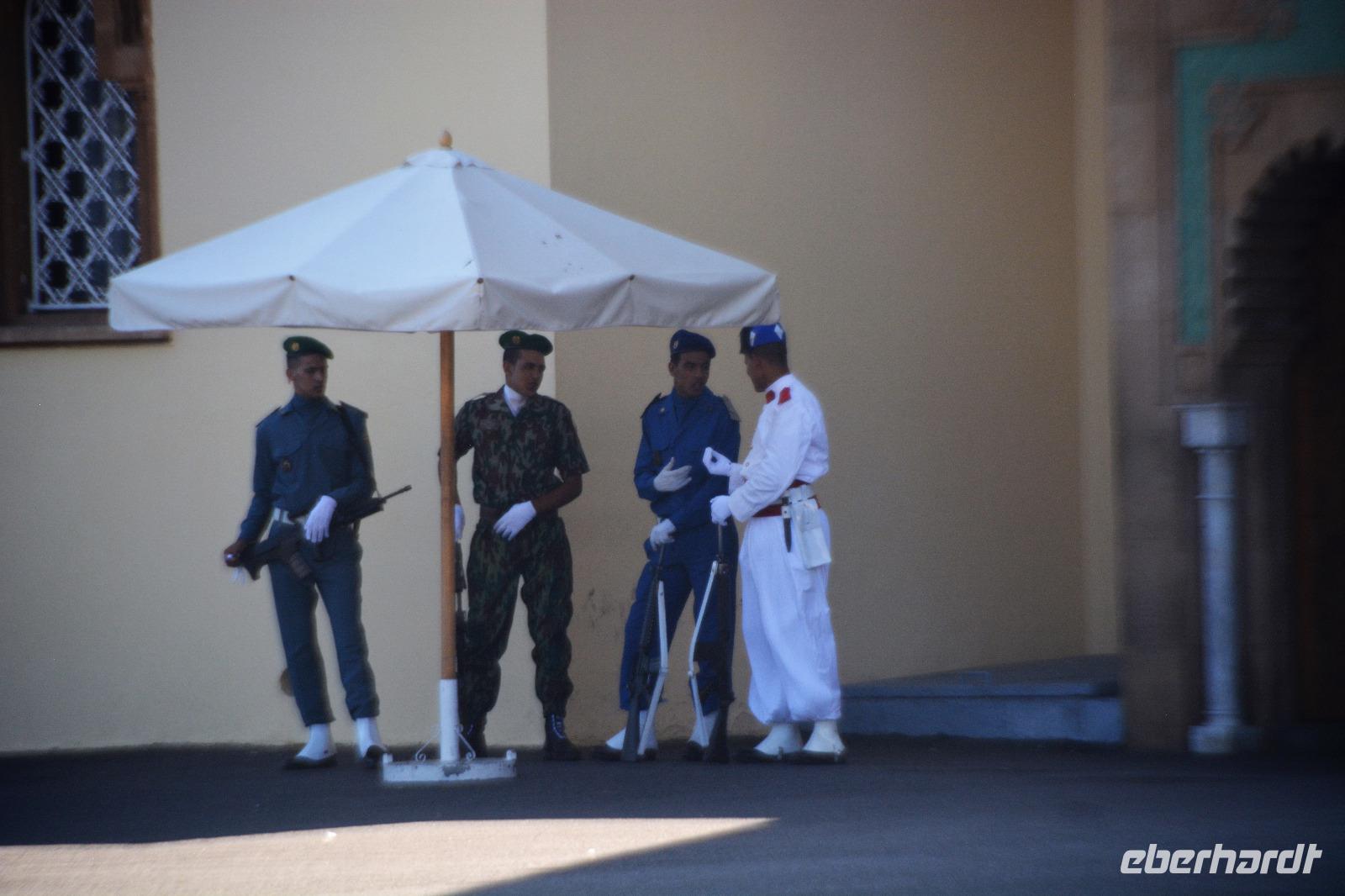 Heute morgen sind wir ganz gespannt auf das wohl imposanteste Gebäude Casablancas, wenn nicht Marokkos: die Moschee Hassan II. Diese zweitgrößte Moschee der Welt ist mit ihren technischen Raffinessen und ihrer Ästhetik ein wahres Meisterwerk der Architektur. Mit 210 Metern Höhe ist das Minarett das höchste der Welt. Wir sind tief beeindruckt von der Wirkung dieses Baus. Draußen steigt die Sonne schon wieder höher und wir verlassen diesen Ort nach ausgiebiger Besichtigung um in die Hauptstadt Rabat weiterzufahren. Nicht, ohne entlang der Corniche einen kleinen Eindruck vom "Savoir vivre" Casablancas zu bekommen. Wir werfen noch einen Blick auf den Leuchtturm von "Casa" und fahren vorbei an einigen Moscheen und den Grundstücken der Saudischen Familie in Richtung der Autobahn nach Rabat. Auch hier sieht man, daß es nicht nur reiche Menschen in Casablanca gibt. Die Slums sind zahlreich am Rande der Stadt. Wir fahren über die Autobahn in Richtung Hauptstadt und über die mit 954,30 m Länge längste Schrägseilbrücke Afrikas, die Brücke Mohammed VI. Sie wurde 2016 fertiggestellt. Nach einer Kräftigung durch eine echte marokkanische Tajine fahren wir zum Mausoleum in dem Mohammed V und sein Sohn Hassan II begraben sind. Es liegt neben einer von den Almohaden begonnenen aber unvollendeten Moschee. Es ist die Dynastie, welche den marokkanischen nationalen Baustil vorwiegend prägte und weiter nach Andalusien exportierte. Am Königspalast bekommen wir von Mohammed die Kleider und die Funktionen der königlichen Angestellten erklärt. In der Chellah, eine Nekropole der Meriniden, die inmitten eines grünen Parks liegt, können wir etwas entspannen.