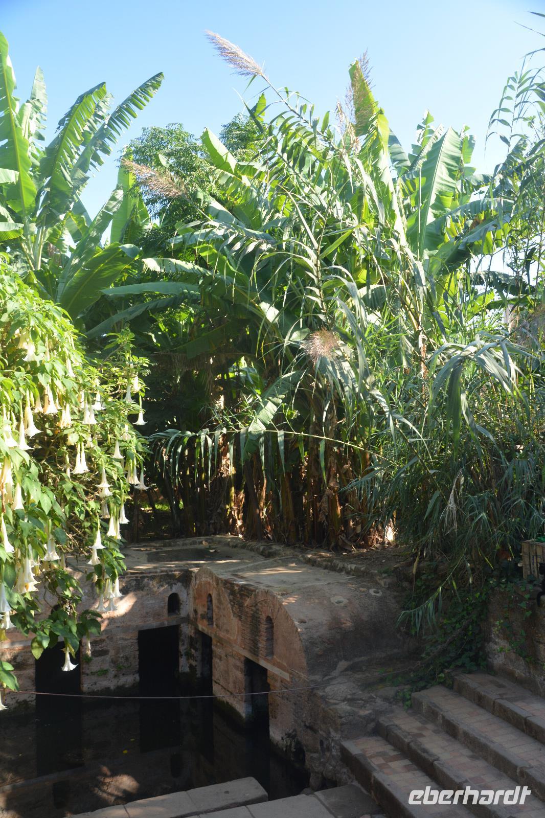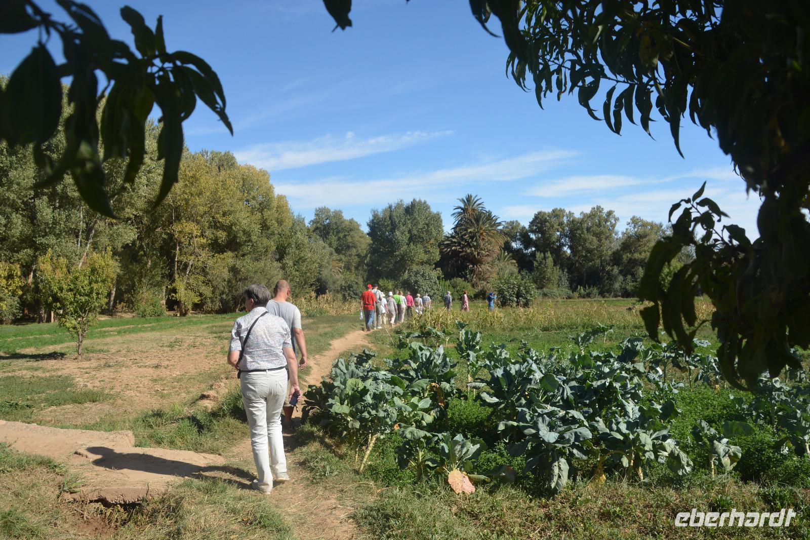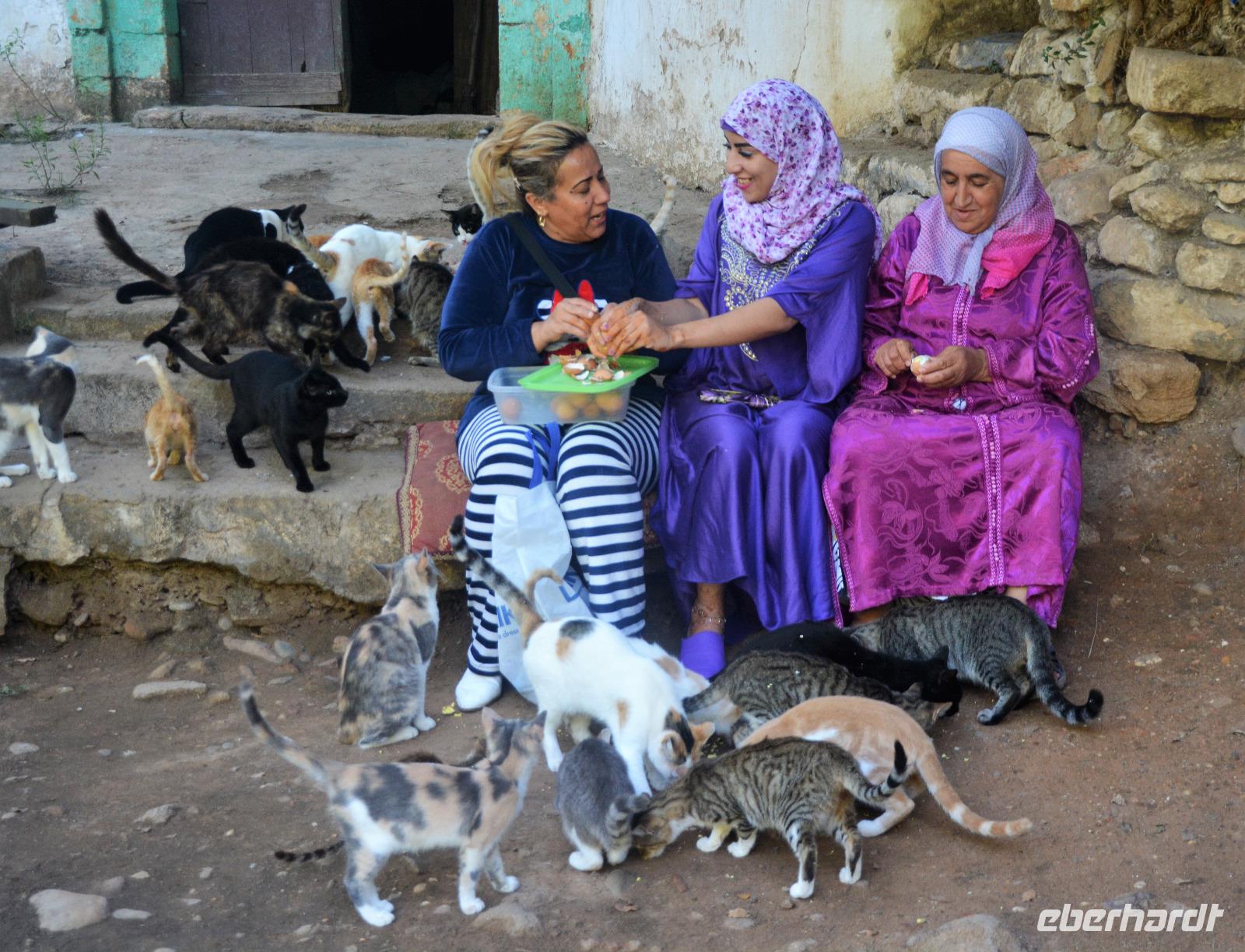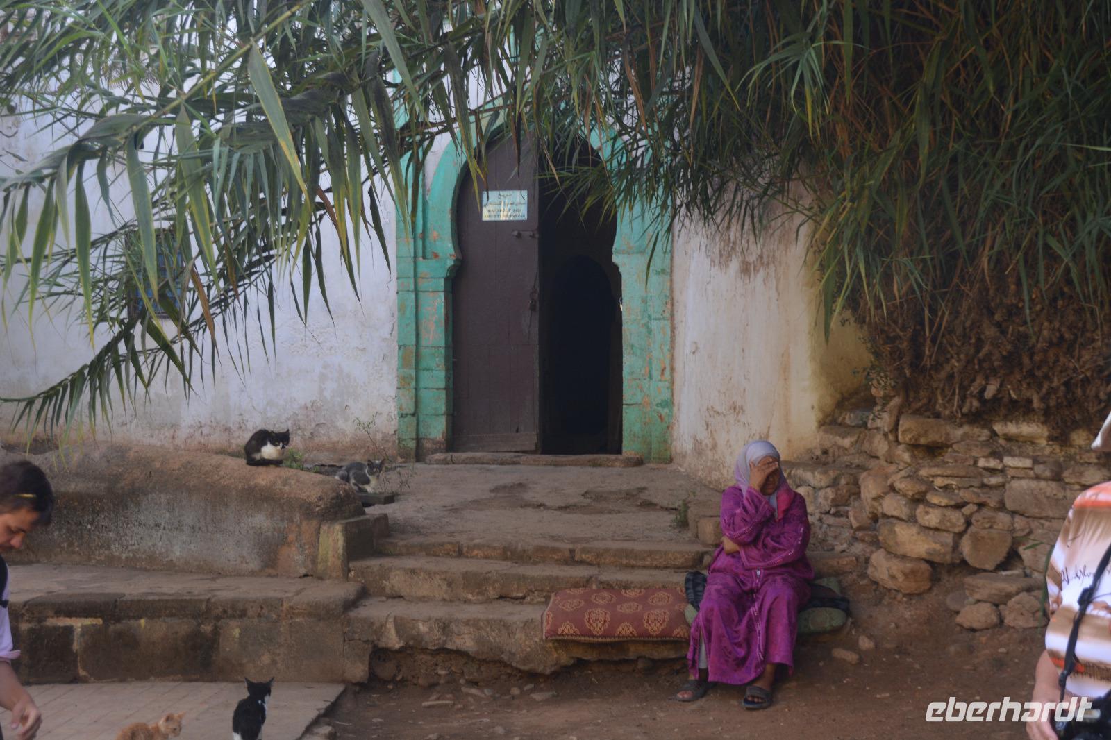 Wir erfahren an diesem Tag vieles über den Islam in Marokko aber auch über die Religiosität und den Aberglauben der einfachen Bevölkerung. Und schon treffen wir am Grab eines der Heiligen in dieser Grabanlage auf eine Familie, deren Tochter versucht, die Aale im Teich mit gekochten Eiern zu locken, was Kindersegen verspricht. Der Islam der solche Bräuche eigentlich nicht kennt konnte diese alten Traditionen nicht vertreiben. Gina erzählt uns auf dieser Reise noch mehrere Geschichten, von den Frauen und deren Traditionen und ihre eigenen Erlebnisse mit Schildkröten und sonstigem Getier welches Glück in das Haus und Heim bringen soll. Auf alle Fälle gilt es, den "bösen Blick" zu tilgen, der mit dem neidischen Blick gleichgesetzt wird. Es gibt Frauen in Marokko, die um die Künste der erfolgreichen Geistervertreibung wissen und auch Schriftsteller, wie Tahar Ben Jelloun, die darüber schrieben.
