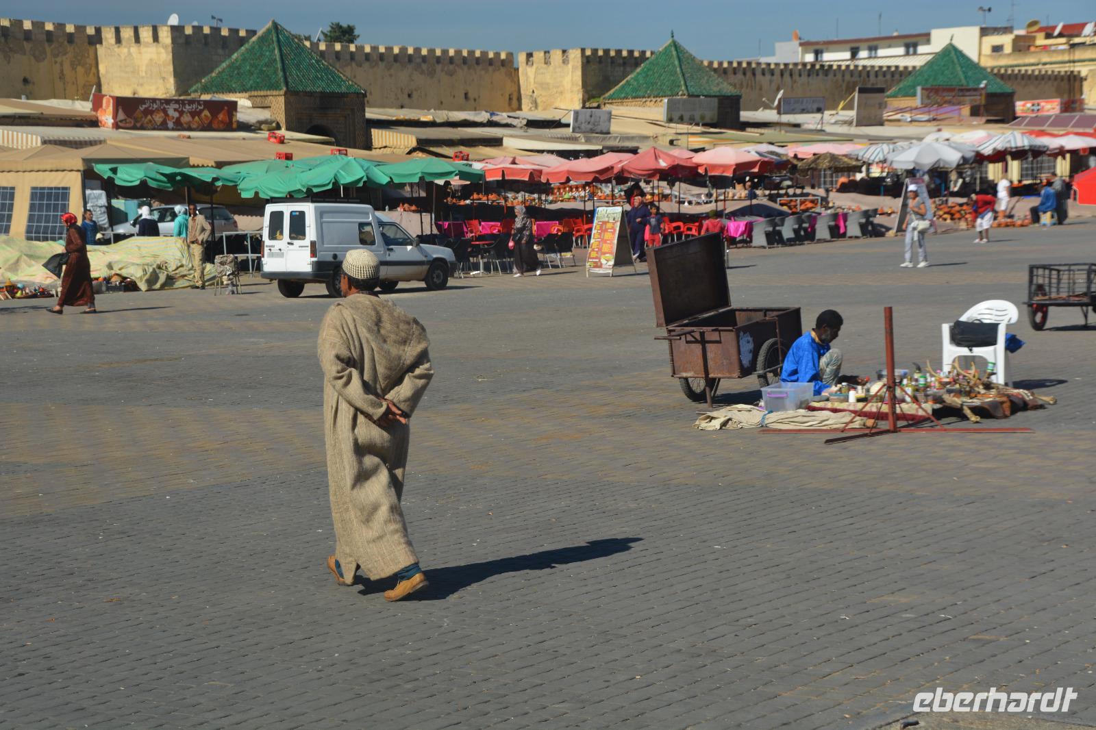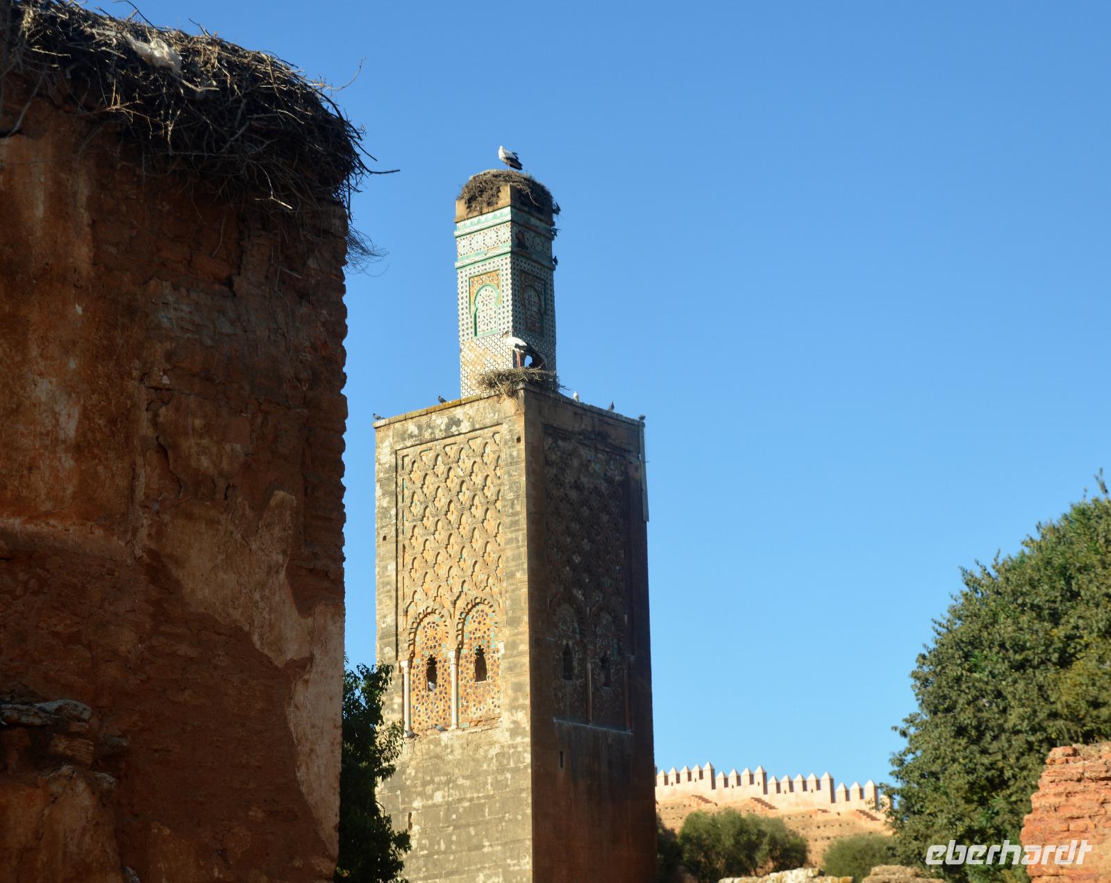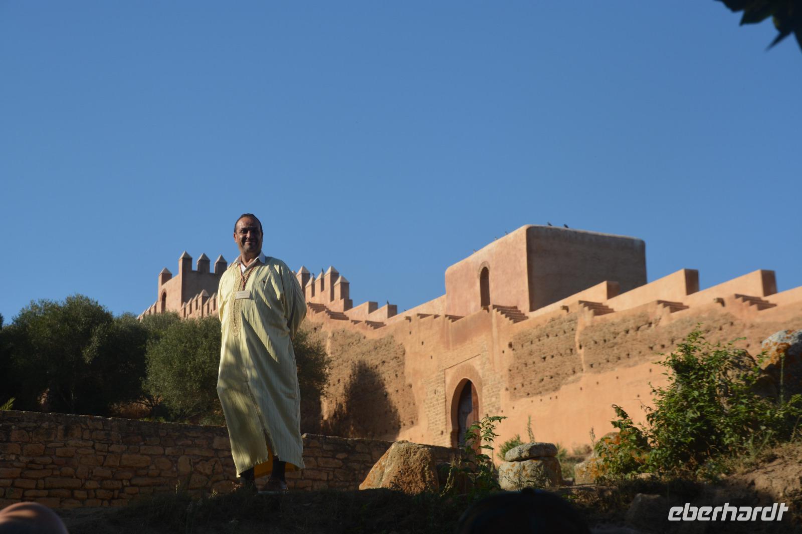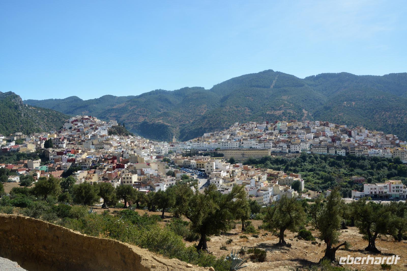 Wir besichtigen in Meknes eines der wohl schönsten Stadttore das "Bab Mansour" aus der Zeit des mächtigen Alaouiten Herrschers "Moulay Ismail". Er war ein Zeitgenosse Ludwigs XIV, ebenso machtbesessen und maßlos. Er hat der Stadt seinen Stempel aufgedrückt. Mehrere Befestigungsringe, riesige Speicheranlagen und ein unterirdisches Gefängnis liegen in der Stadt. Aber alle Massnahmen bewahrten ihn nicht vor dem Gang alles Irdischen und so liegt er heute in seinem Mausoleum in Meknes begraben. Wir verlassen diese Königstadt um einen Blick auf den wichtigsten Pilgerort Marokkos zu werfen, auf Moulay Idriss. Hier ist der marokkanische Staatsgründer Idriss I. begraben und eine Pilgerreise an diesen Ort ist für die ärmeren Marokkaner wichtig, die sich keine "Hadj" (Pilgerreise) nach Mekka, dem heiligen Ort der Muslime, leisten können. Noch bis in unsere Zeit war es Nichtmuslimen verboten, die Stadt zu betreten.