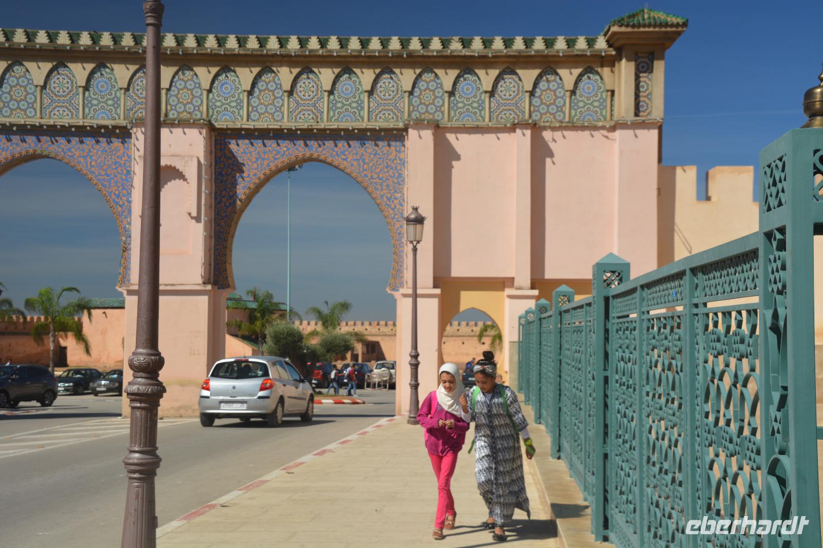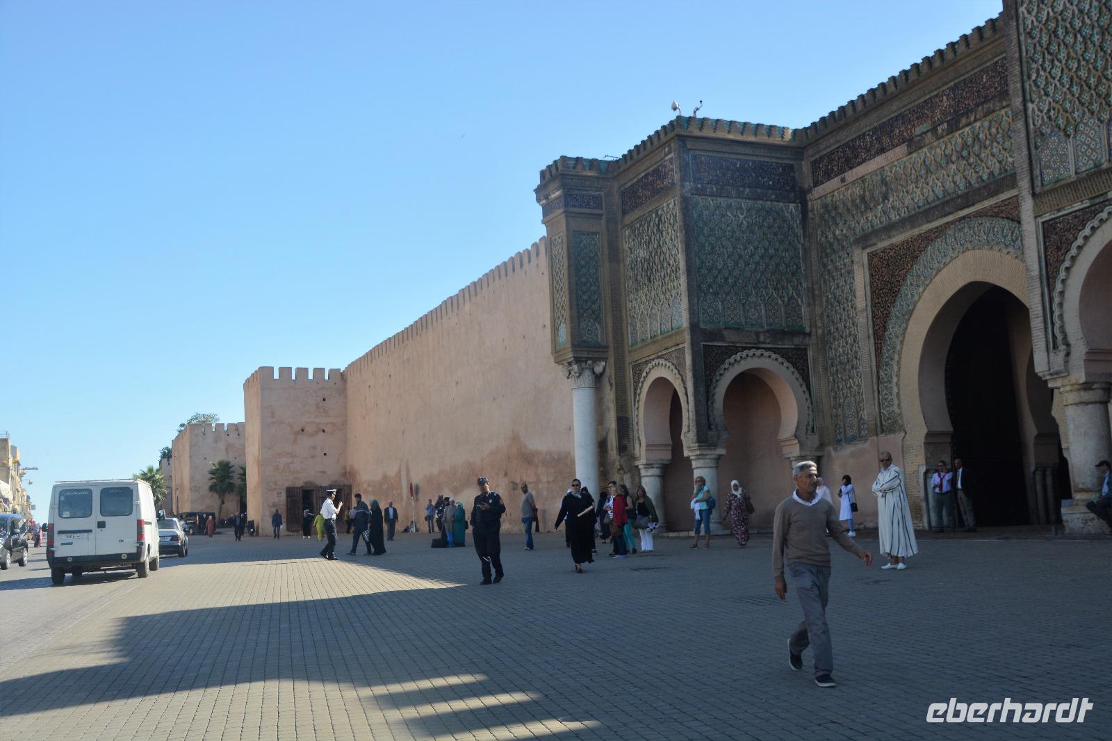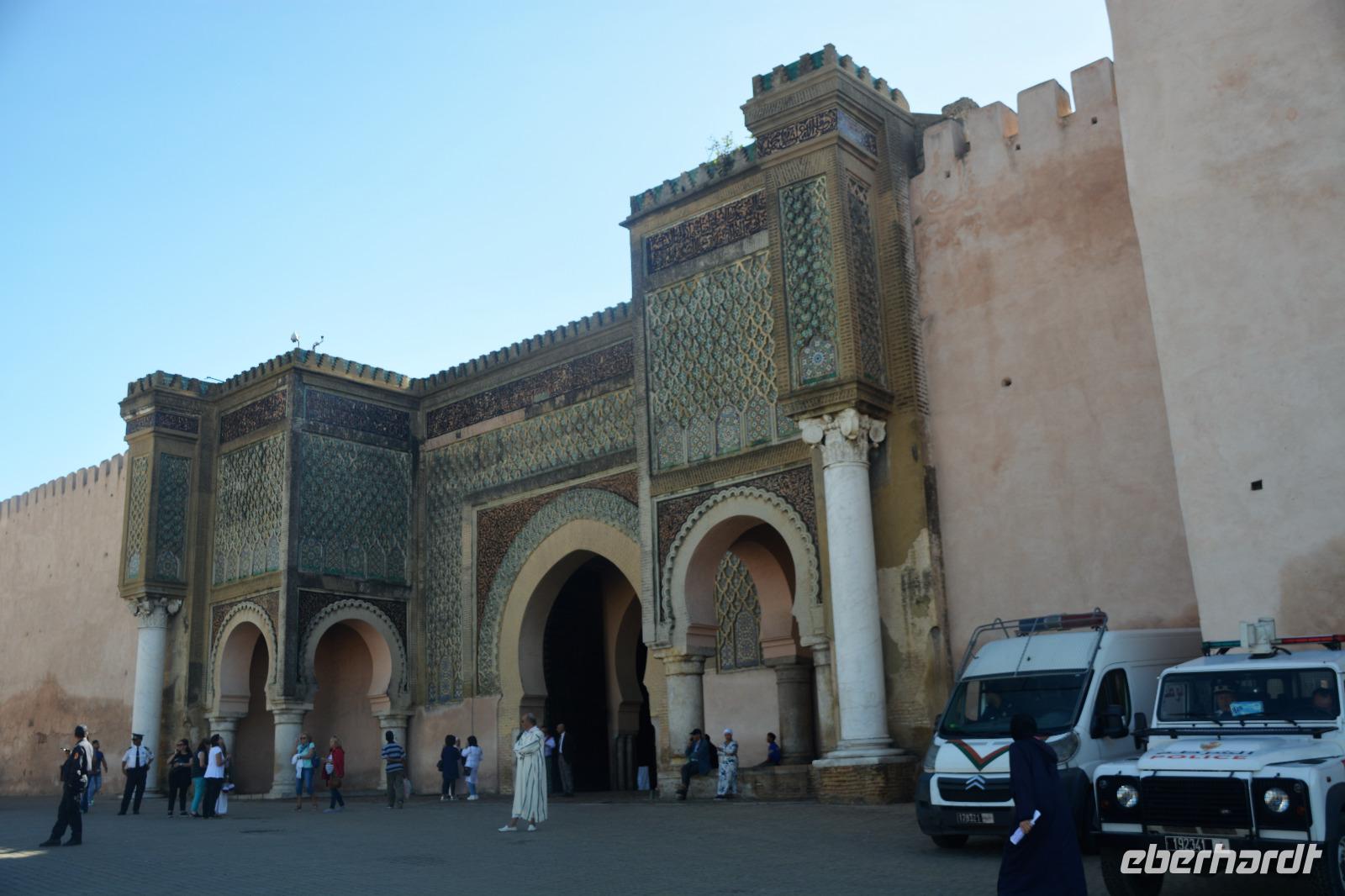 Wir starten in Richtung Meknes, die Königsstadt, die vor allem den reichen Bauern ihren Wohlstand verdankt. Auf dem Weg dorthin erfahren wir etwas über die Landwirtschaft Marokkos und von dem Anbau von Getreide und Zuckerrohr und natürlich der Olivenkultur. Auch Wein wird seit der Römerzeit kultiviert und wurde von den Franzosen in Marokko wieder etabliert. Von der Qualität der Weine konnten wir uns auf der Reise überzeugen.