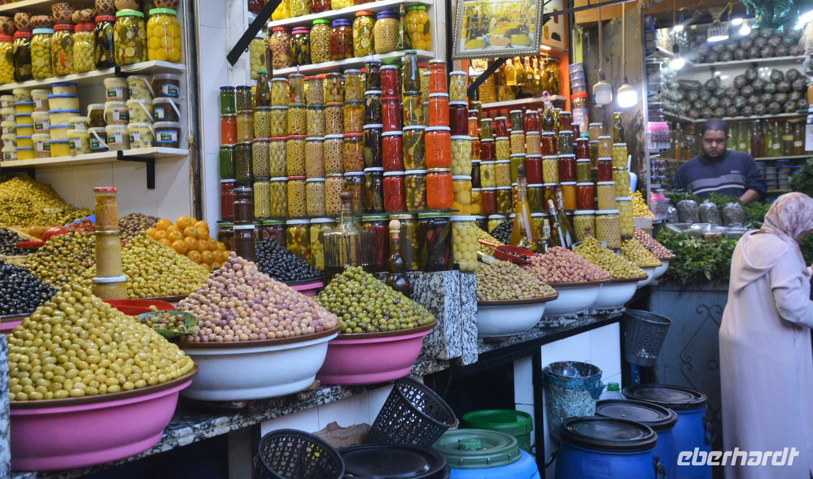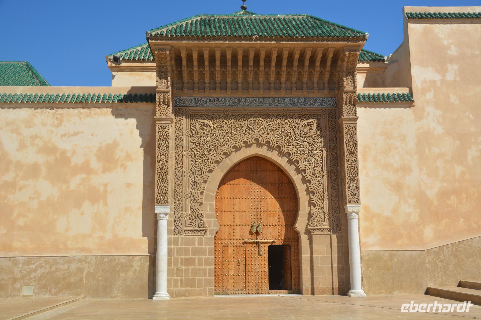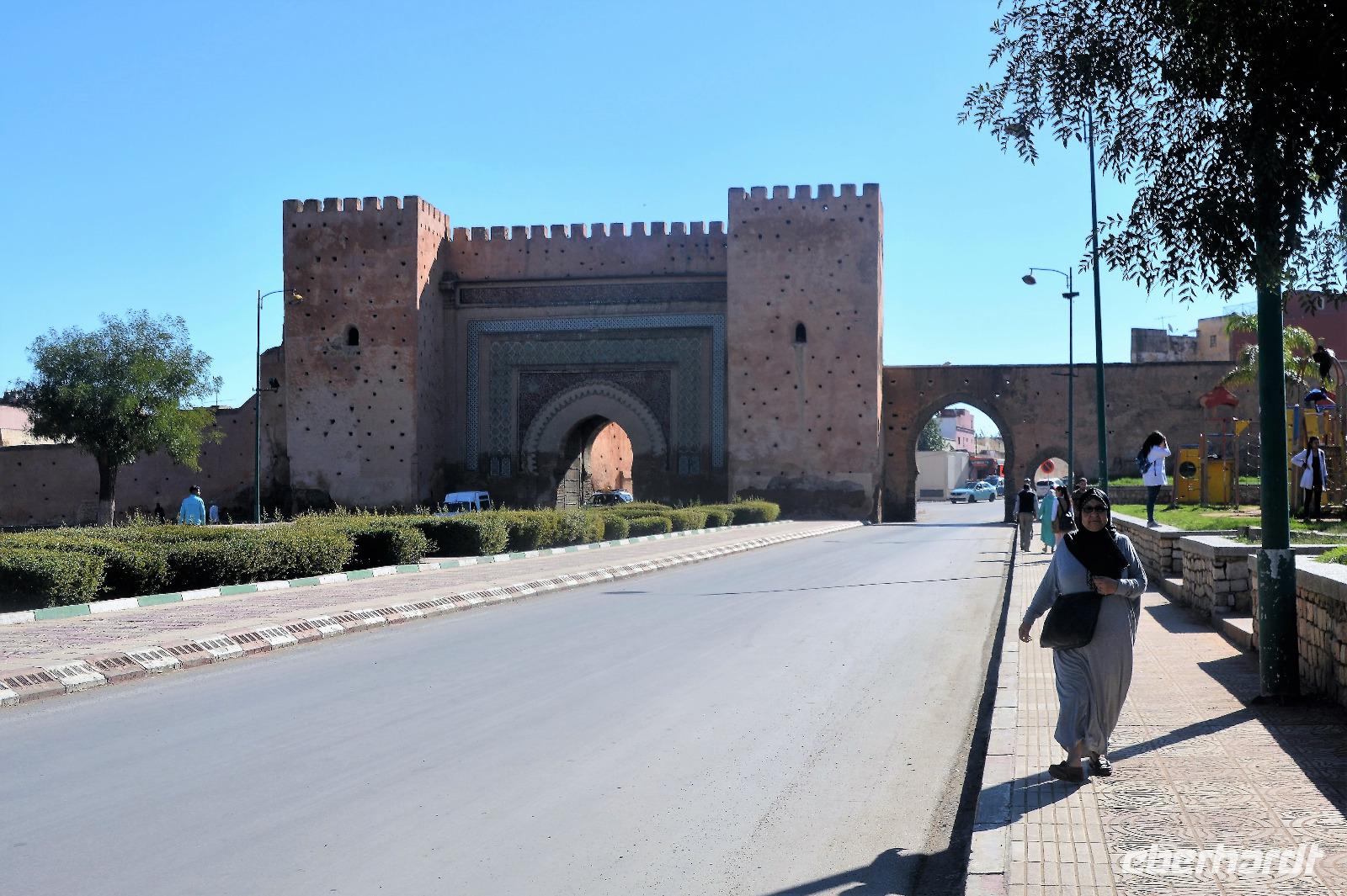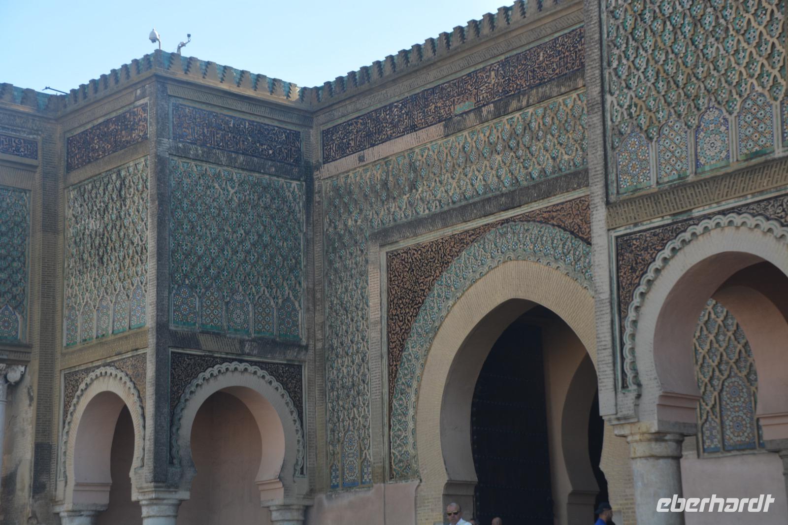 Wir starten in Richtung Meknes, die Königsstadt, die vor allem den reichen Bauern ihren Wohlstand verdankt. Auf dem Weg dorthin erfahren wir etwas über die Landwirtschaft Marokkos und von dem Anbau von Getreide und Zuckerrohr und natürlich der Olivenkultur. Auch Wein wird seit der Römerzeit kultiviert und wurde von den Franzosen in Marokko wieder etabliert. Von der Qualität der Weine konnten wir uns auf der Reise überzeugen.