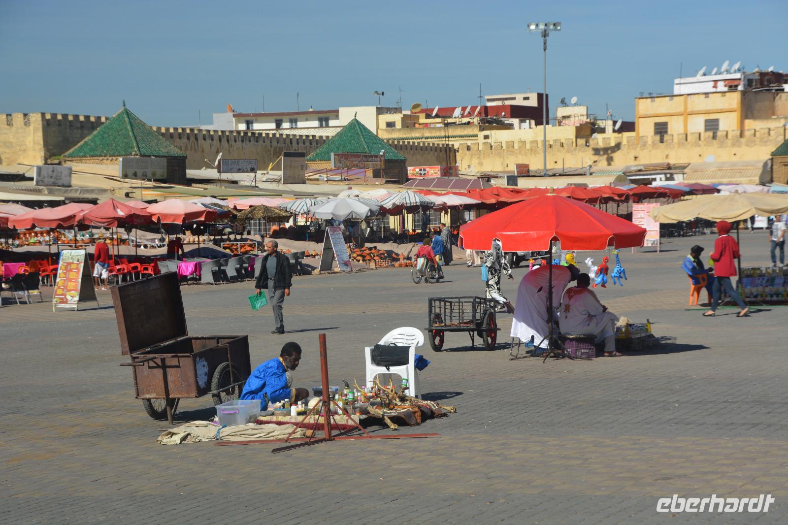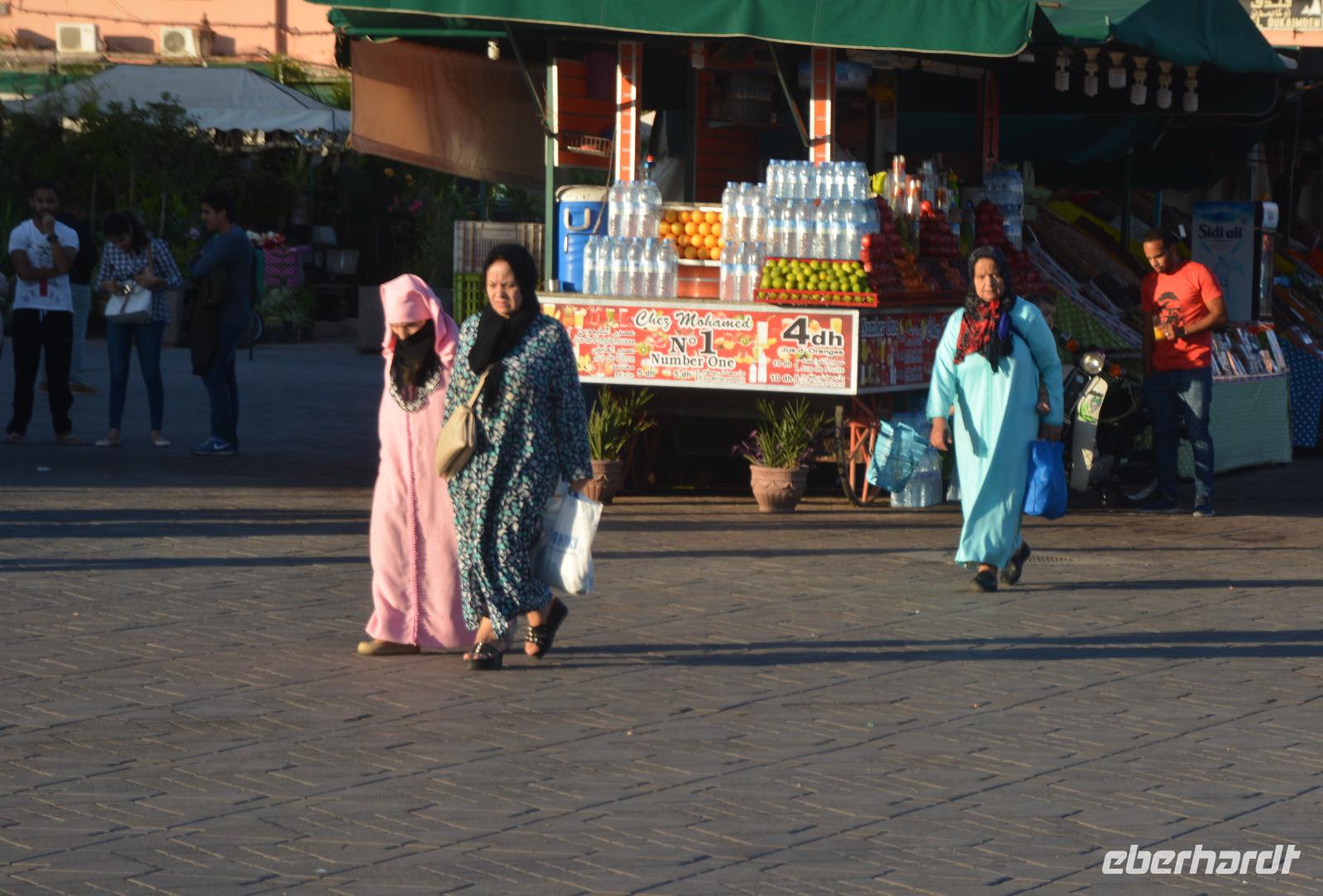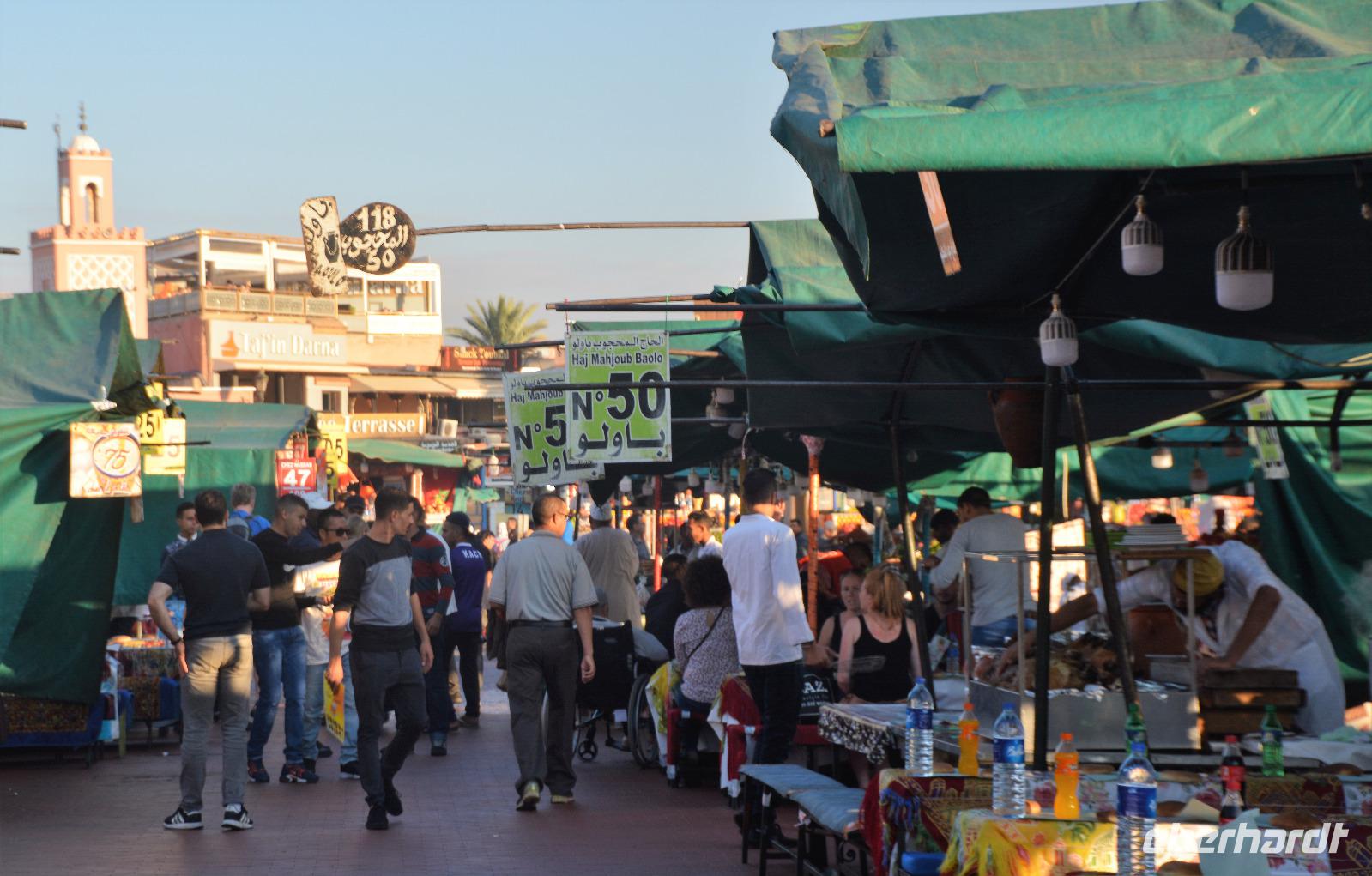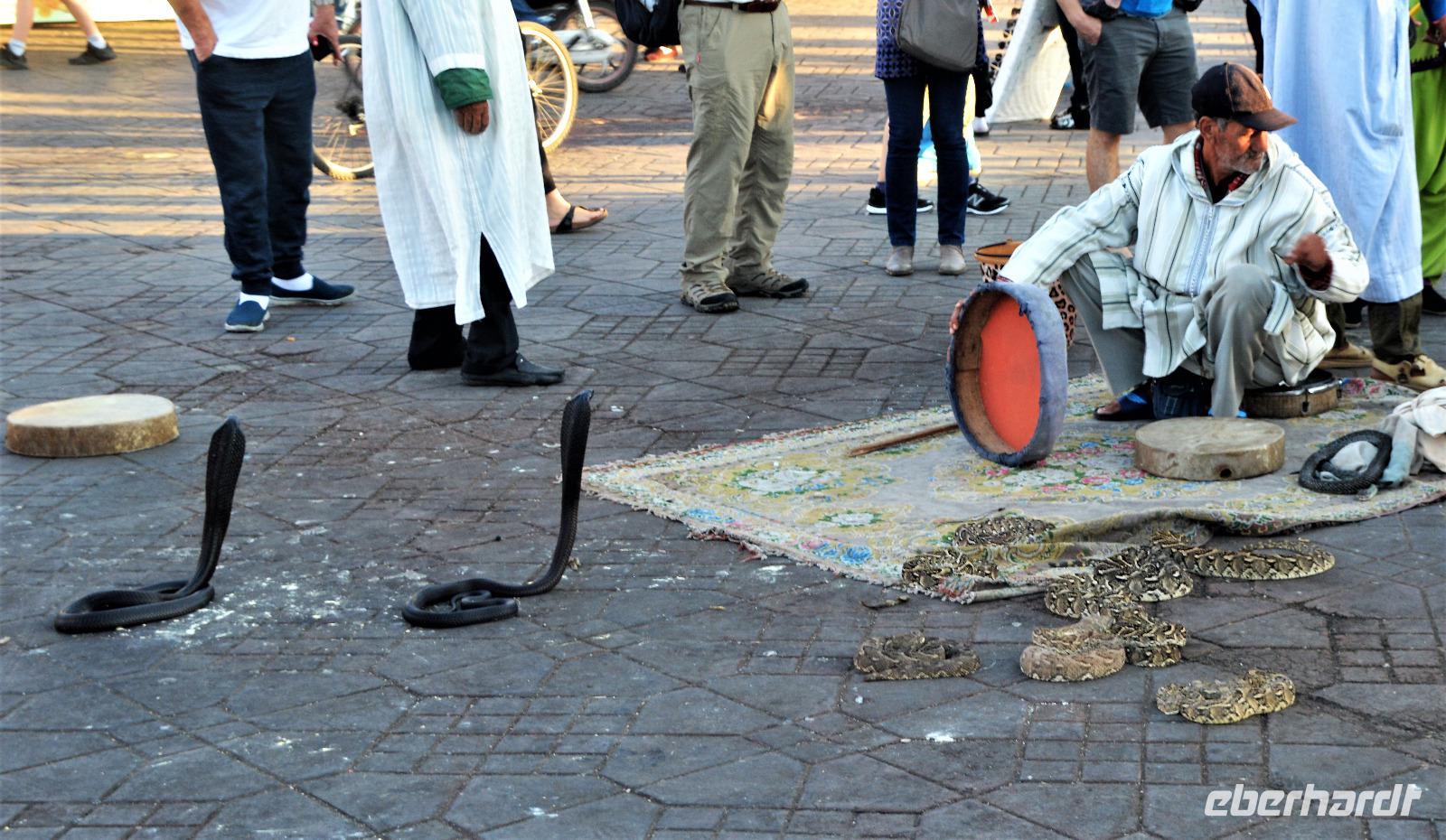 Am Nachmittag fahren wir zum Platz der Gaukler, diesem legendären Platz Marokkos. Hier herrscht wie immer ein buntes Treiben. Schlangenbeschwörer, Frauen, die Henna-Verzierungen an die Frau bringen, Musikanten, Stände für frisch gepressten Orangensaft und Garküchen bilden ein vielseitiges Spektakel. Ein schöner Abschluß unserer Marokko-Reise. Das ganze wird durch ein Essen in einem traditionellen Restaurant gekrönt. Wir können danach kaum noch atmen so reichhaltig ist unser Abendessen. Trotzdem wagt einer unserer Reiseteilnehmer ein Tänzchen mit der Bauchtänzerin die den Abend für uns abschließt. Wir werden Marokko morgen verlassen und hoffen, daß Mohammed VI morgen zuhause bleibt damit wir keine Zwischenlandung in Casablanca machen müssen wie auf dem Herflug. Wir verabschieden uns von Mohammed, unserem lokalen Reiseleiter, der schon heute seine Heimreise nach Tetouan antritt.