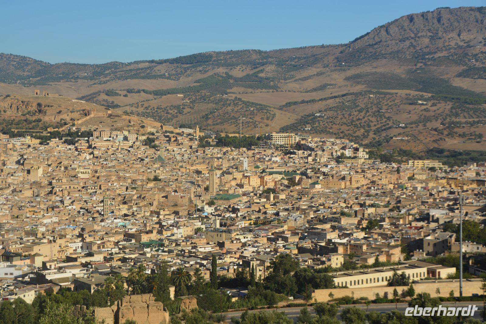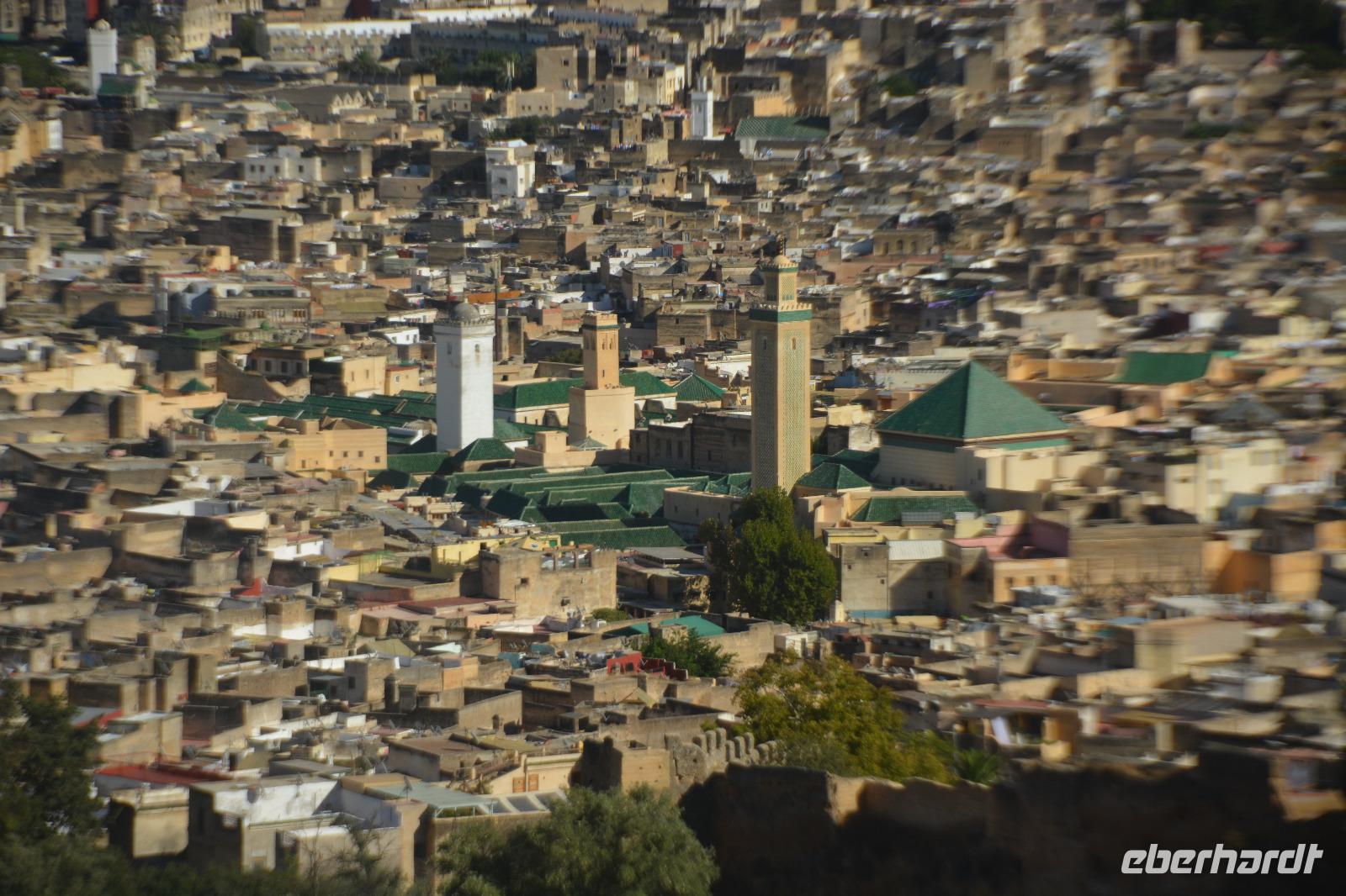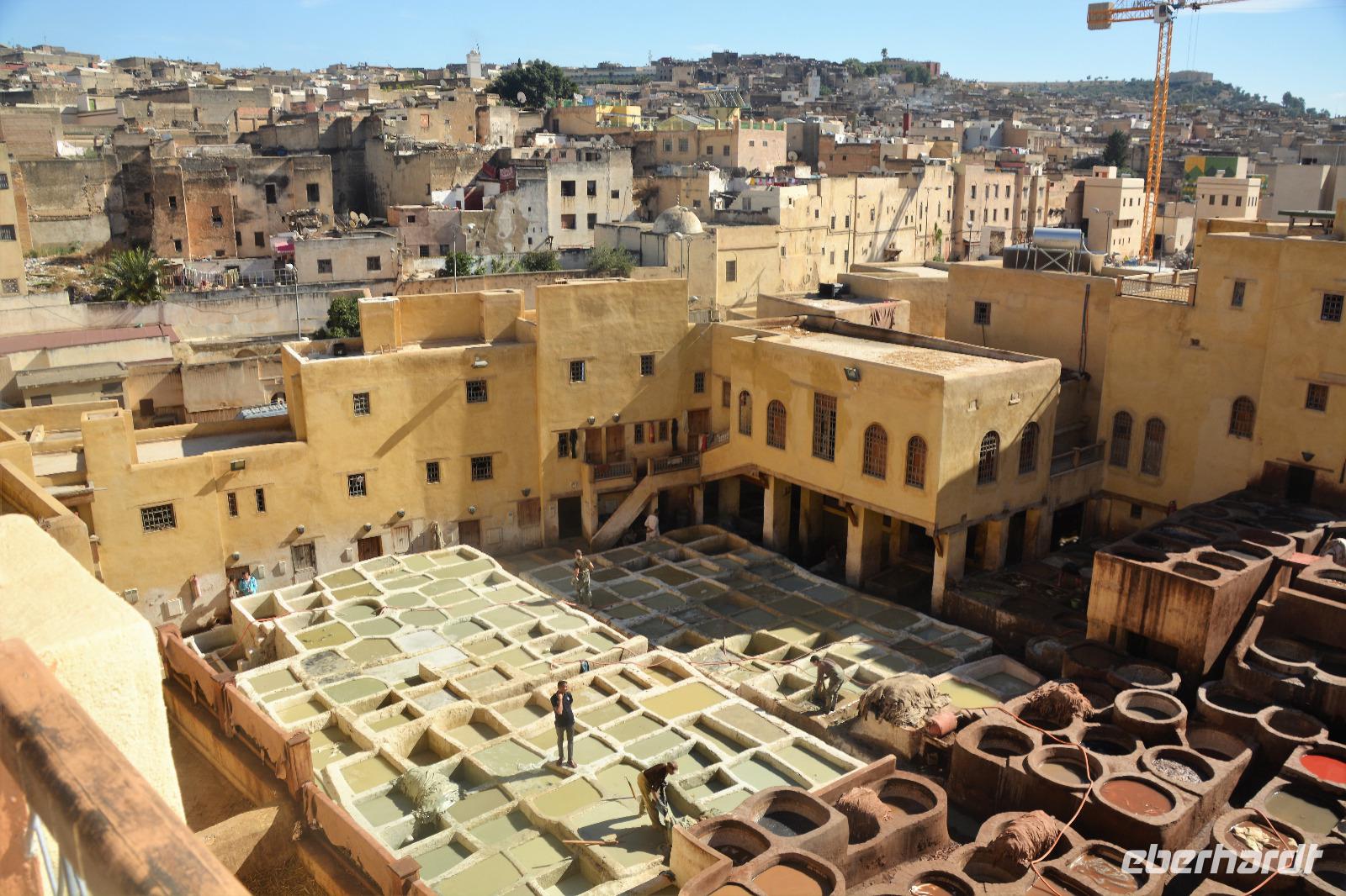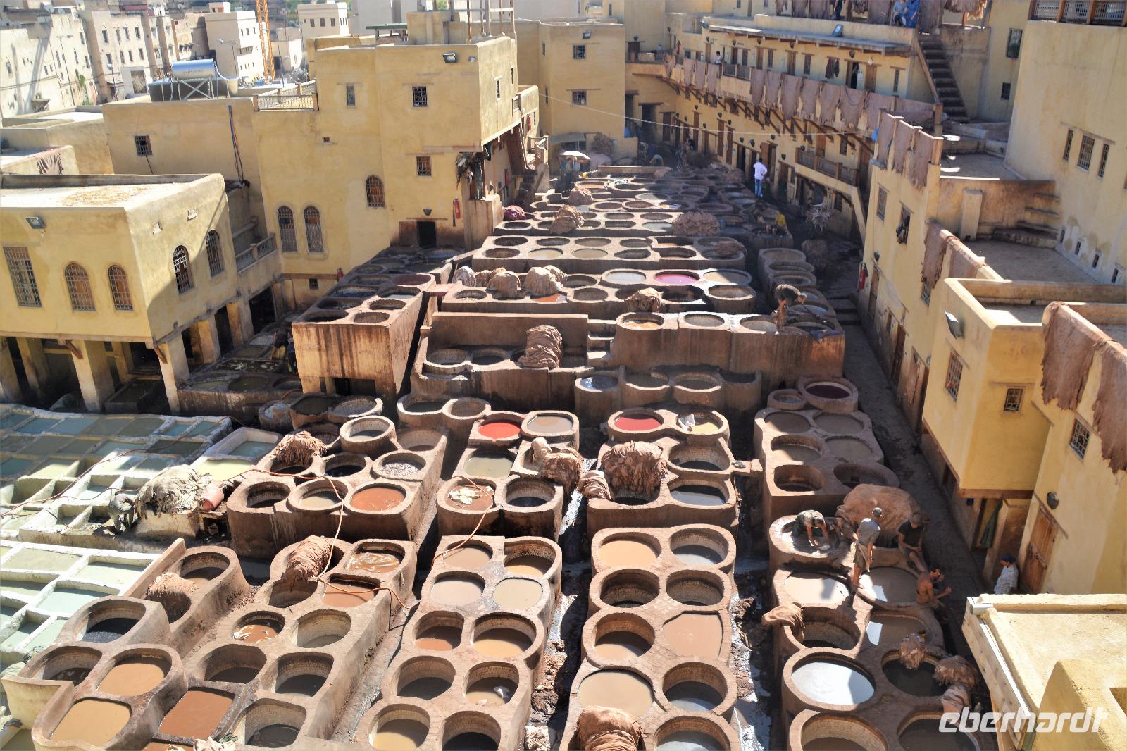 Nach einer Mittagsverschnaufpause lernen wir eine Weberei und die Arbeit einer der letzten verbliebenen Gerbereien von Fes kennen. Lederhandwerk vom Feinsten. Das Gerben der Häute war in der historischen Zeit möglich, da Fes von dem gleichnamigen Fluss durchquert wird, denn Wasser ist unabdingbar. Das Treten der Häute in den Becken ist heute eine "relativ" gute bezahlte Arbeit, die von jungen Männern erfolgt. Noch einmal werfen wir, diesmal von der Nordseite einen Blick auf Fes, angefüllt von teilweise archaischen Bildern. Fes, eine Stadt wie ein Bienenstock. Voll der bunten Bilder fahren wir noch einmal zum nördlichen Aussichtspunkt bei den Meriniden-Gräbern. Gegen Abend treffen wir uns noch einmal um den morgigen Wüstenausflug abzuklären, denn wir werden den Norden verlassen und in eine andere Welt eintauchen.