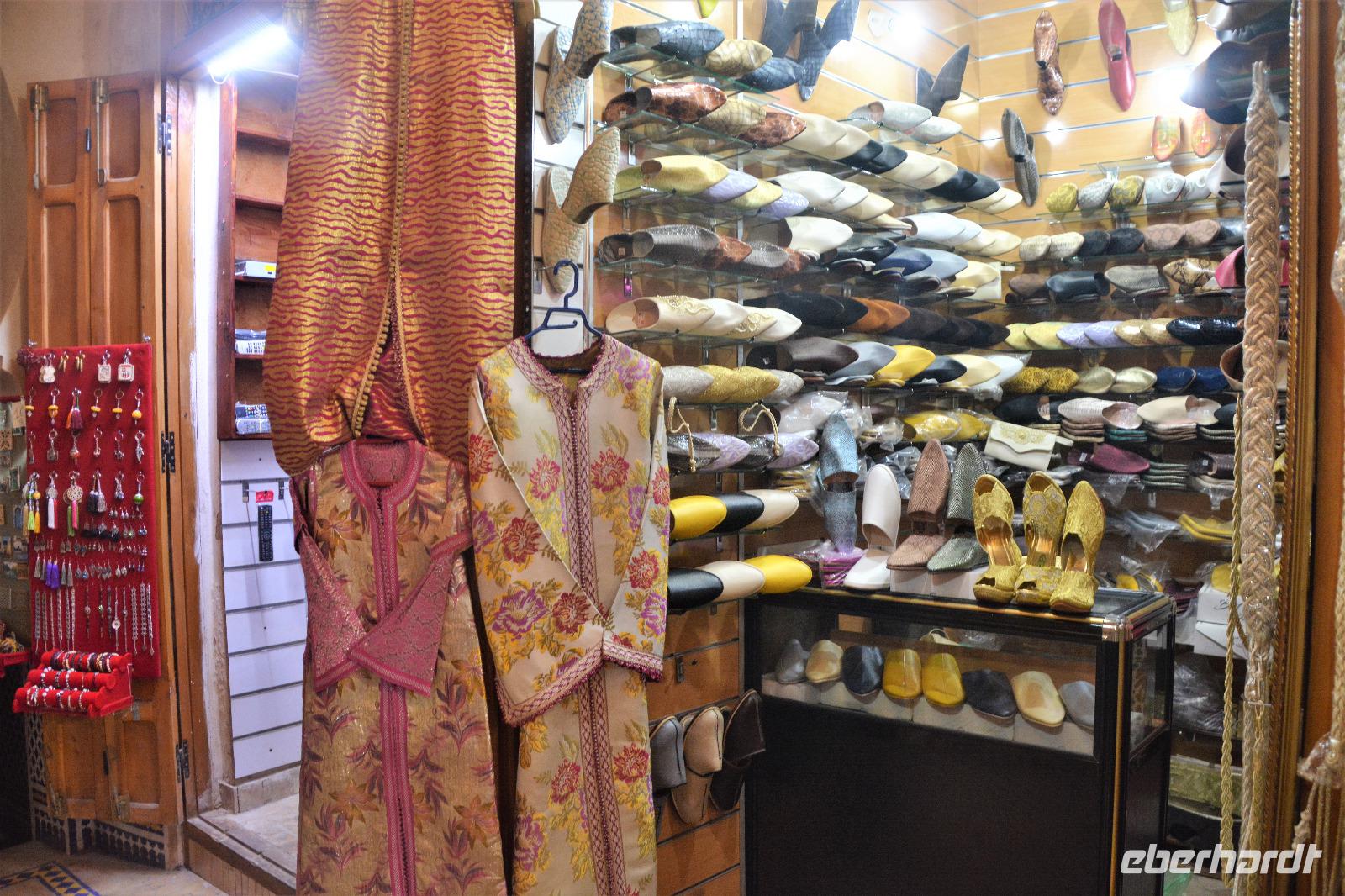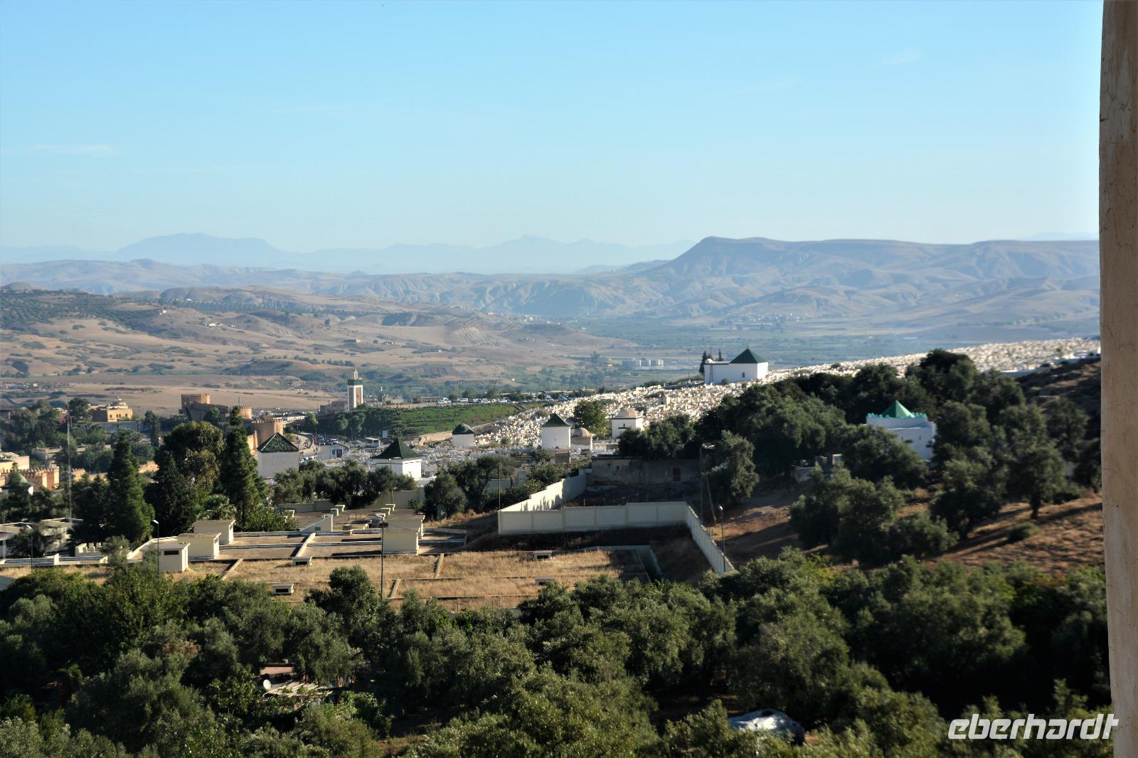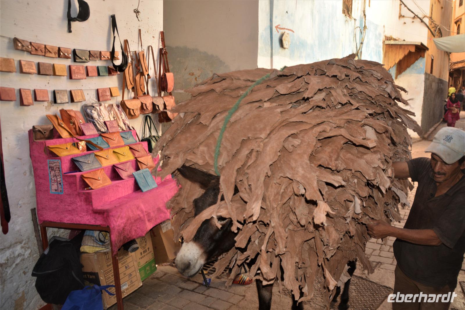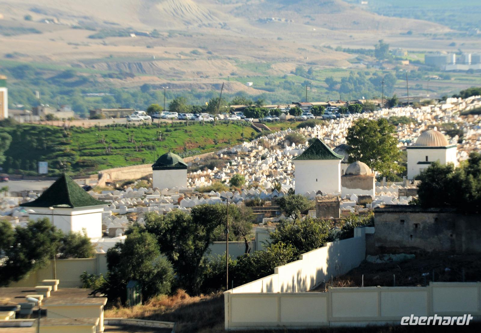 Nach einer Mittagsverschnaufpause lernen wir eine Weberei und die Arbeit einer der letzten verbliebenen Gerbereien von Fes kennen. Lederhandwerk vom Feinsten. Das Gerben der Häute war in der historischen Zeit möglich, da Fes von dem gleichnamigen Fluss durchquert wird, denn Wasser ist unabdingbar. Das Treten der Häute in den Becken ist heute eine "relativ" gute bezahlte Arbeit, die von jungen Männern erfolgt. Noch einmal werfen wir, diesmal von der Nordseite einen Blick auf Fes, angefüllt von teilweise archaischen Bildern. Fes, eine Stadt wie ein Bienenstock. Voll der bunten Bilder fahren wir noch einmal zum nördlichen Aussichtspunkt bei den Meriniden-Gräbern. Gegen Abend treffen wir uns noch einmal um den morgigen Wüstenausflug abzuklären, denn wir werden den Norden verlassen und in eine andere Welt eintauchen.
