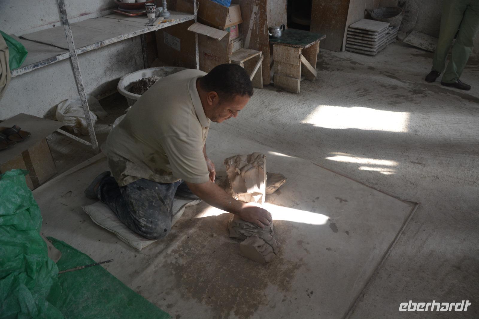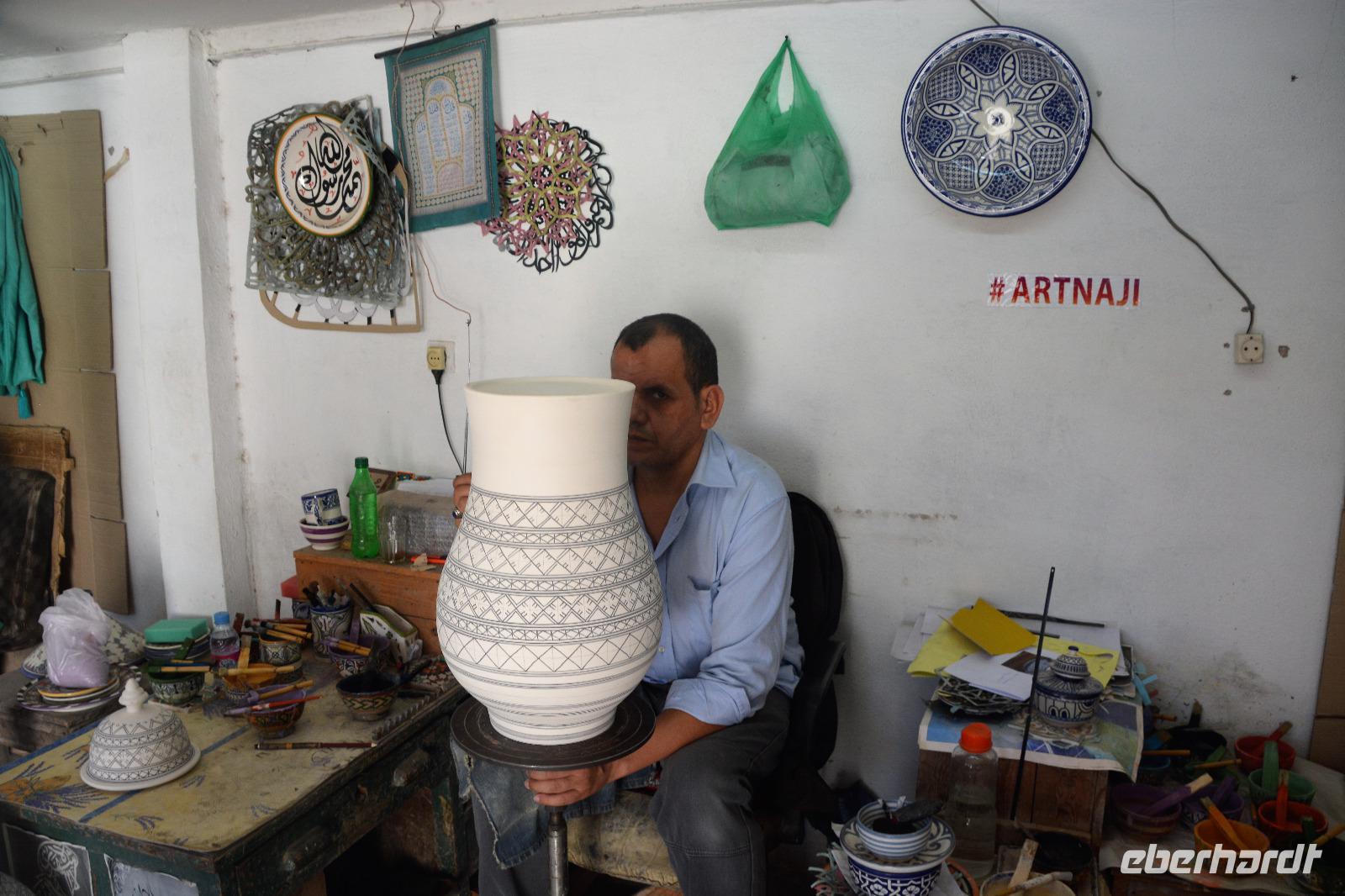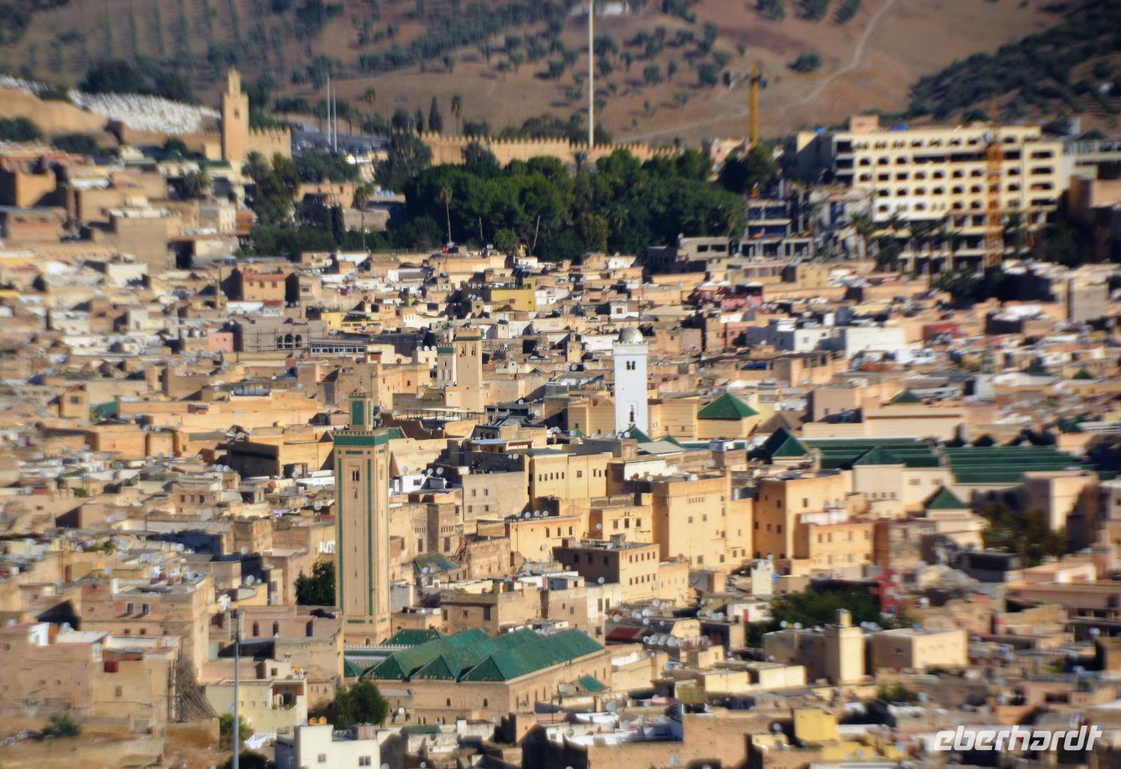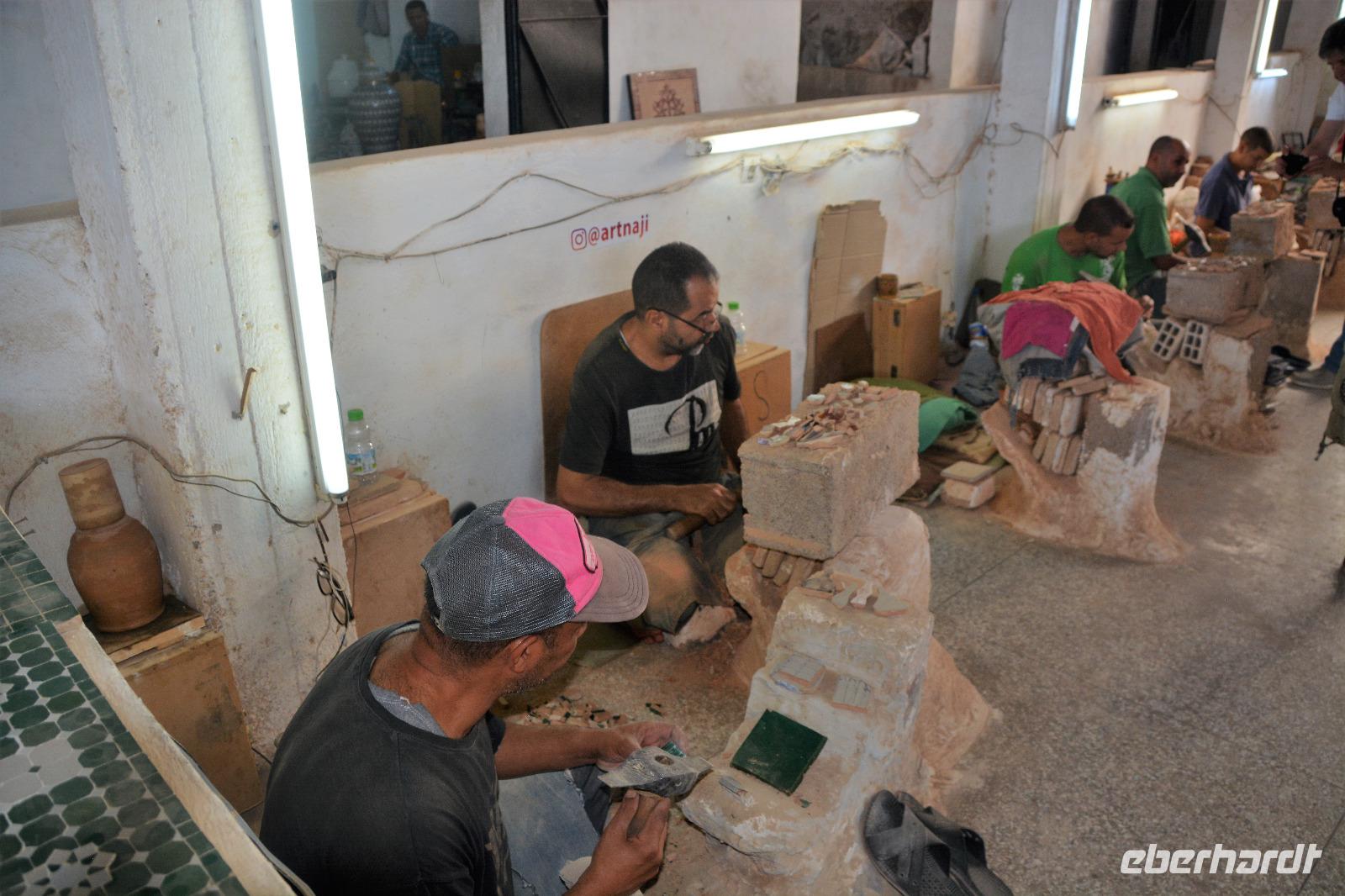 Um uns einen Überblick über die verschiedenen Stadtteile zu verschaffen fahren wir zu dem Aussichtspunkt Borj Sud im Süden der Stadt. Von dort haben wir einen guten Ausblick auf dieses Gewirr von Gässchen und Gassen. Mohammed erklärt uns die einzelnen Stadtteile von Fes und wir können von Weitem sogar das Grab von "Idris II."sehen. Es ist das zweitwichtigste Pilgerziel Marokkos, da es sich um einen der Staatsgründer handelt. Man erkennt religiöse Gebäude an der Farbe grün, ist sie doch auch die Farbe des Islam. Die Farbe von Fes ist allerdings blau, was sich an der vorherrschenden Keramik erkennen lässt. Deshalb fahren wir in die bekannteste Töpferei von Fes. Bei "Naji" wurden vor einigen Jahren die Brennöfen noch mit den Resten der Oliven betrieben, was eine ziemlich qualmende Angelegenheit war. Heute ist das verboten und man bedient sich moderner Technik, die sich auch wesentlich besser steuern lässt. Wir sehen die Keramikkünstler an der Töpferscheibe und die Maler, die aus ihrem Gedächtsnis mit ruhiger Hand die schönen Stücke bemalen. Eine der berühmtesten Techniken ist das sog. "zellige". Aus gebrannten Fliesen werden per Hand kleine Mosaikstückchen geschnitten und daraus Tischplatten, Brunnen und Wanddekorationen hergestellt. Wunderschön sind die Muster. Wir kennen diese Technik auch schon aus den Palästen in Marokko und Rabat. Es ist klar, daß diese Dinge ihren Preis haben, vergleicht man sie aber mit der Arbeit die z.B. an so einem Mosaik-Tisch liegt, ist es verhältnismäßig günstig und man erfreut sich das ganze Leben daran. Wem ein Tisch zu groß ist bekommt auch eine Schüssel