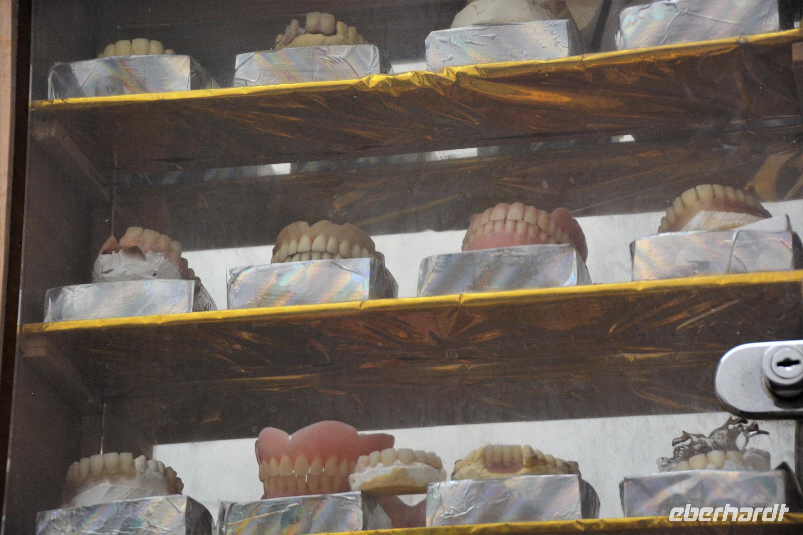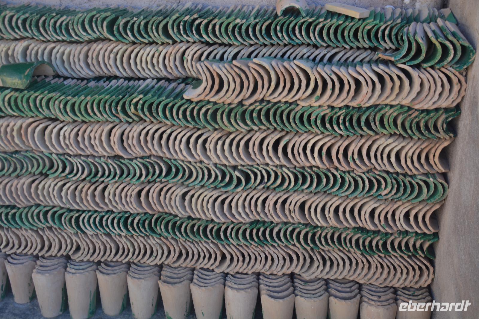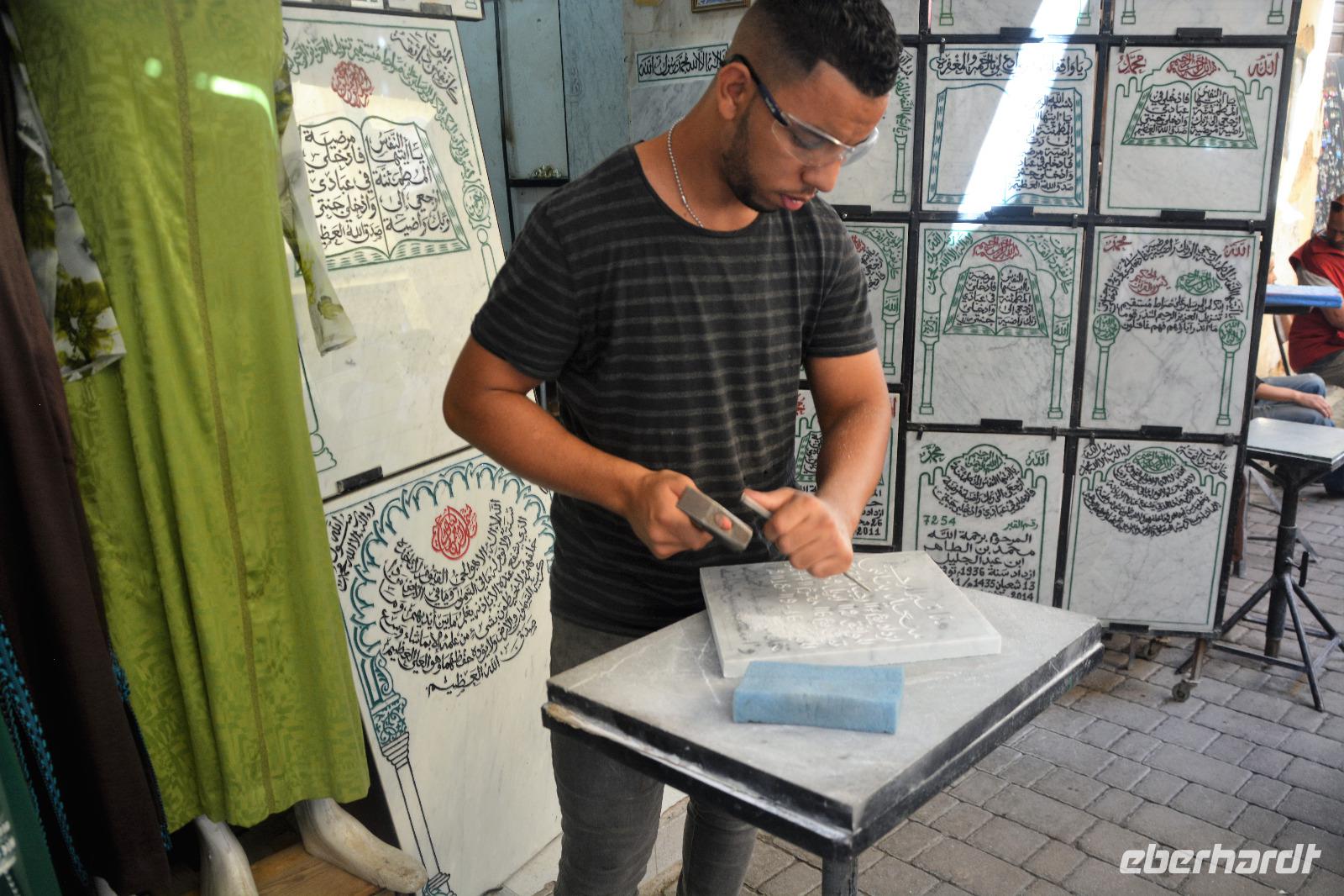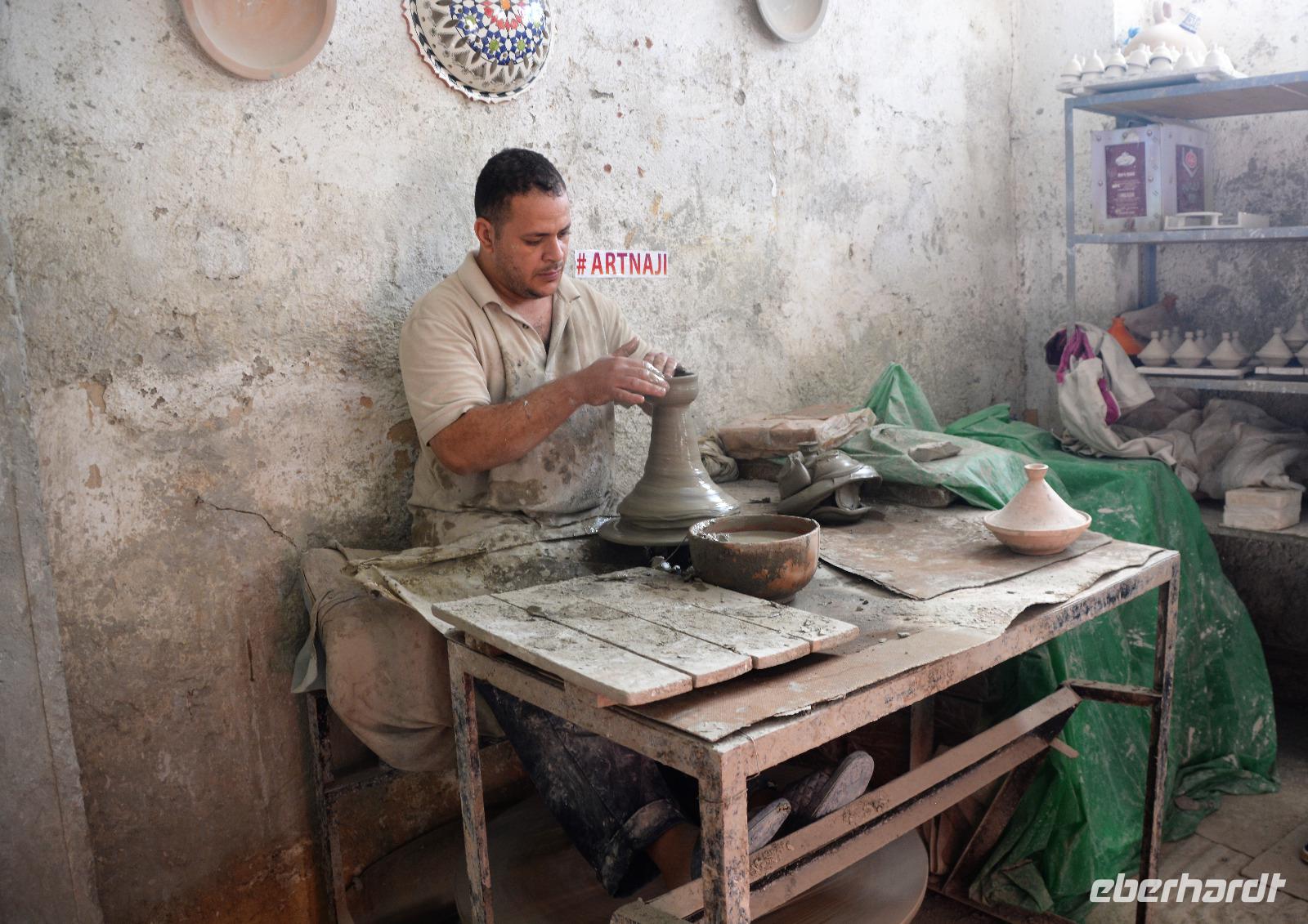 Um uns einen Überblick über die verschiedenen Stadtteile zu verschaffen fahren wir zu dem Aussichtspunkt Borj Sud im Süden der Stadt. Von dort haben wir einen guten Ausblick auf dieses Gewirr von Gässchen und Gassen. Mohammed erklärt uns die einzelnen Stadtteile von Fes und wir können von Weitem sogar das Grab von "Idris II."sehen. Es ist das zweitwichtigste Pilgerziel Marokkos, da es sich um einen der Staatsgründer handelt. Man erkennt religiöse Gebäude an der Farbe grün, ist sie doch auch die Farbe des Islam. Die Farbe von Fes ist allerdings blau, was sich an der vorherrschenden Keramik erkennen lässt. Deshalb fahren wir in die bekannteste Töpferei von Fes. Bei "Naji" wurden vor einigen Jahren die Brennöfen noch mit den Resten der Oliven betrieben, was eine ziemlich qualmende Angelegenheit war. Heute ist das verboten und man bedient sich moderner Technik, die sich auch wesentlich besser steuern lässt. Wir sehen die Keramikkünstler an der Töpferscheibe und die Maler, die aus ihrem Gedächtsnis mit ruhiger Hand die schönen Stücke bemalen. Eine der berühmtesten Techniken ist das sog. "zellige". Aus gebrannten Fliesen werden per Hand kleine Mosaikstückchen geschnitten und daraus Tischplatten, Brunnen und Wanddekorationen hergestellt. Wunderschön sind die Muster. Wir kennen diese Technik auch schon aus den Palästen in Marokko und Rabat. Es ist klar, daß diese Dinge ihren Preis haben, vergleicht man sie aber mit der Arbeit die z.B. an so einem Mosaik-Tisch liegt, ist es verhältnismäßig günstig und man erfreut sich das ganze Leben daran. Wem ein Tisch zu groß ist bekommt auch eine Schüssel