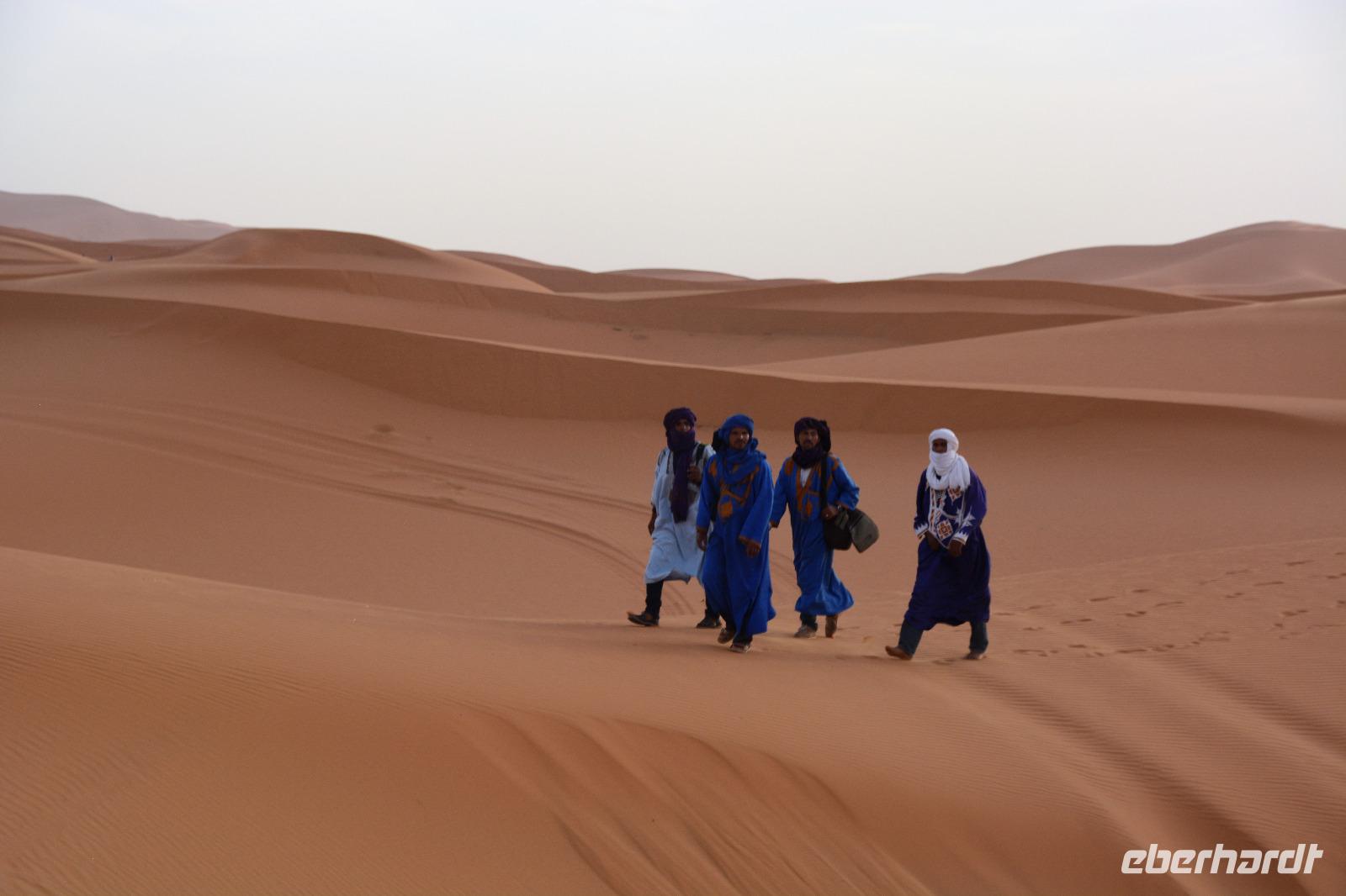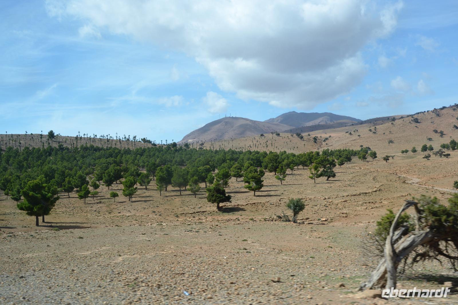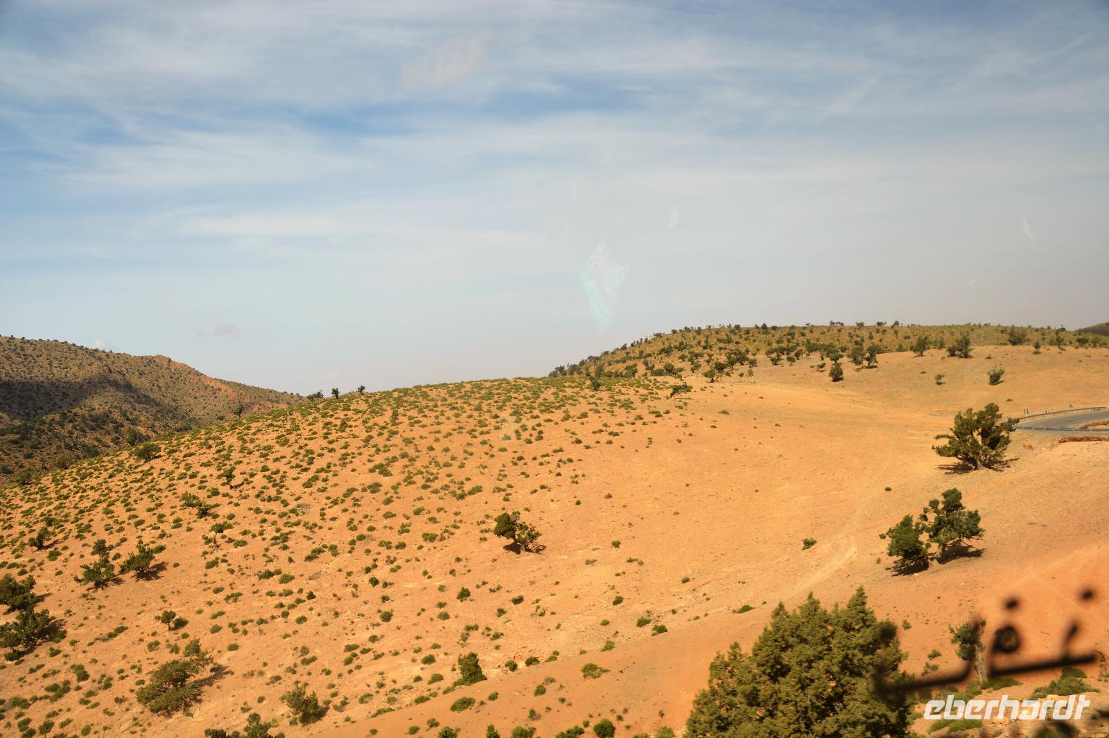 Früh müssen wir los, um unsere "Dünentaxen" rechtzeitig zu erreichen, gilt es doch vorher auf geländegängigen Fahrzeugen zu Ihnen zu gelangen. Doch von vorne. Es ist noch kühl als wir starten und während des Tages werden wir verschiedene Klimazonen durchfahren. Wir müssen zwei wichtige Gebirgszüge, den Mittleren Atlas und den Rand des Hohen Atlas durchqueren, um an den Sahararand zu gelangen. Wir durchfahren das Land der Berber, die Ureinwohner Marokkos. Kleine Marktorte, in denen man an den etwas dickeren Djellabas (Kaftane mit Kapuze) erkennt, daß es wohl hier etwas kühler ist. Beim Aussteigen im Ort Ifrane, einem Wintersportort am Rande des Zedernwaldes, können wir das hautnah spüren. Es sieht hier eher wie in einem französischem Wintersportort aus. Weiter geht es durch den Wald und vergeblich halten wir nach unseren entfernten Verwandten, den Berber-Affen, Ausschau- nun-es ist auch noch sehr früh am Tag. Wir fahren entlang weiter Hochebenen, die von den halbnomadisch lebenden Viehzüchtern schon verlassen wurden. Gina erzählt uns etwas über das Leben der verschiedenen Berbervölker und ihrer Traditionen hier in Marokko. Von deren einfachem Leben, ihrer Sitten und Gebräuche, hat sie doch den Hohen Atlas mehrfach durchwandert. Sie erzählt von der Gastfreundschaft und von dem Gemeinschaftssinn, dieser teilweise noch sehr traditionell lebenden Bevölkerung. Nicht alle alten Traditionen konnten von der streng monotheistischen Religion des Islam getilgt werden, sondern leben in Festen und Zeremonien weiter.