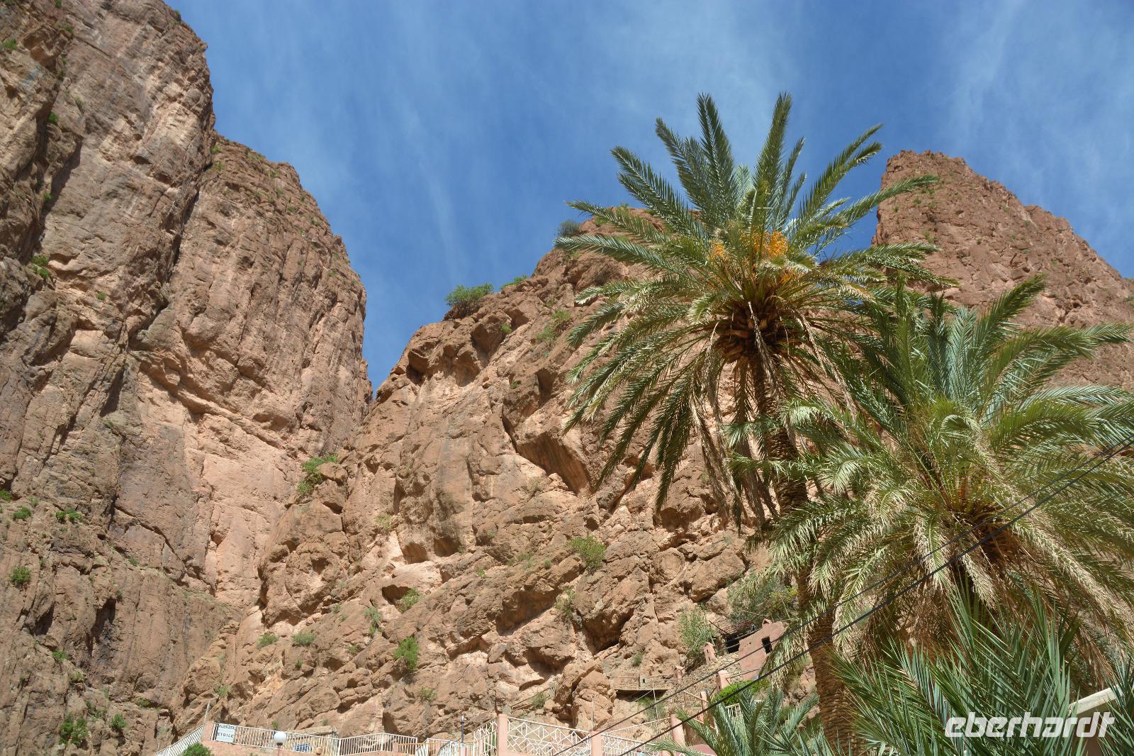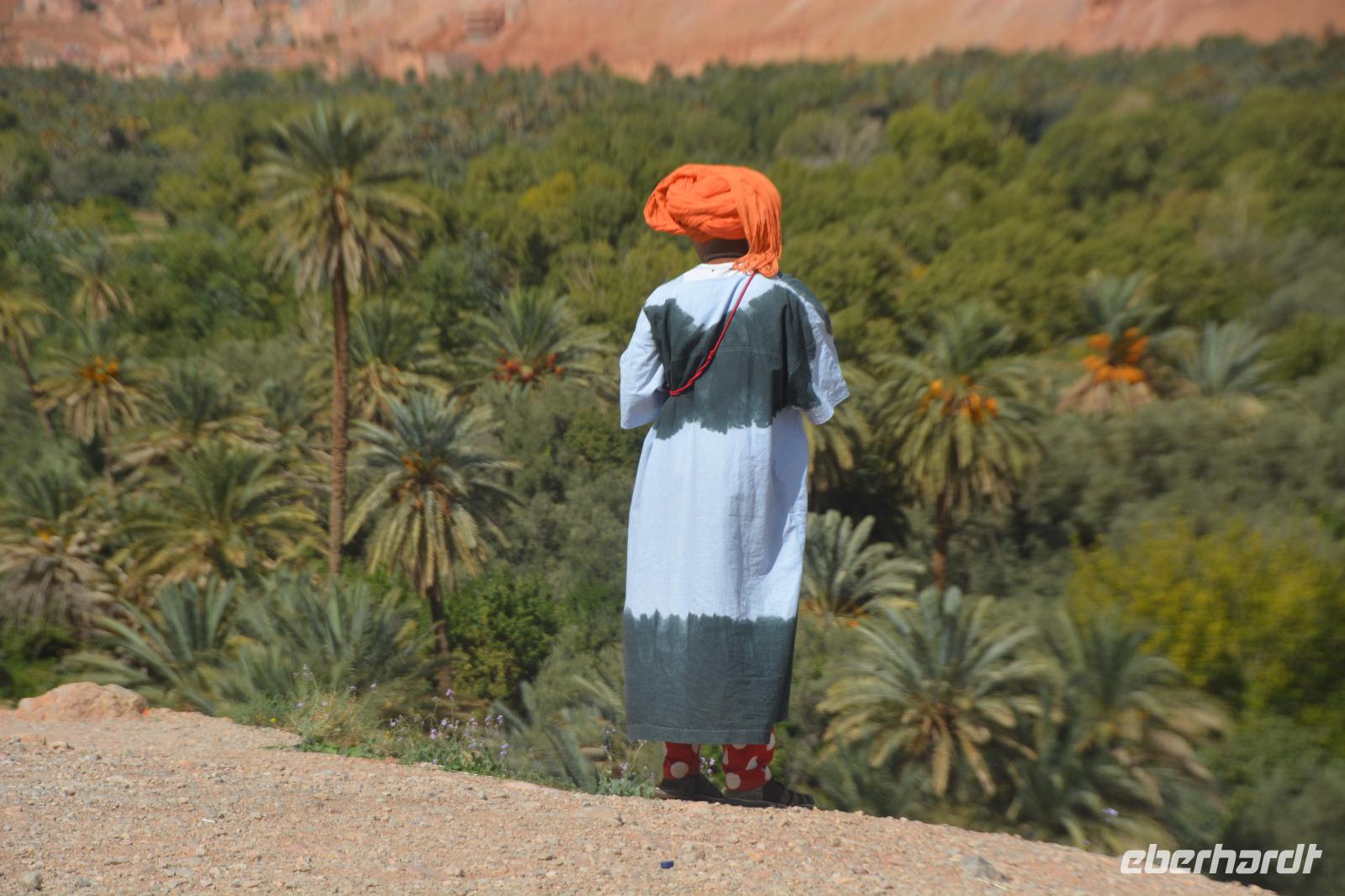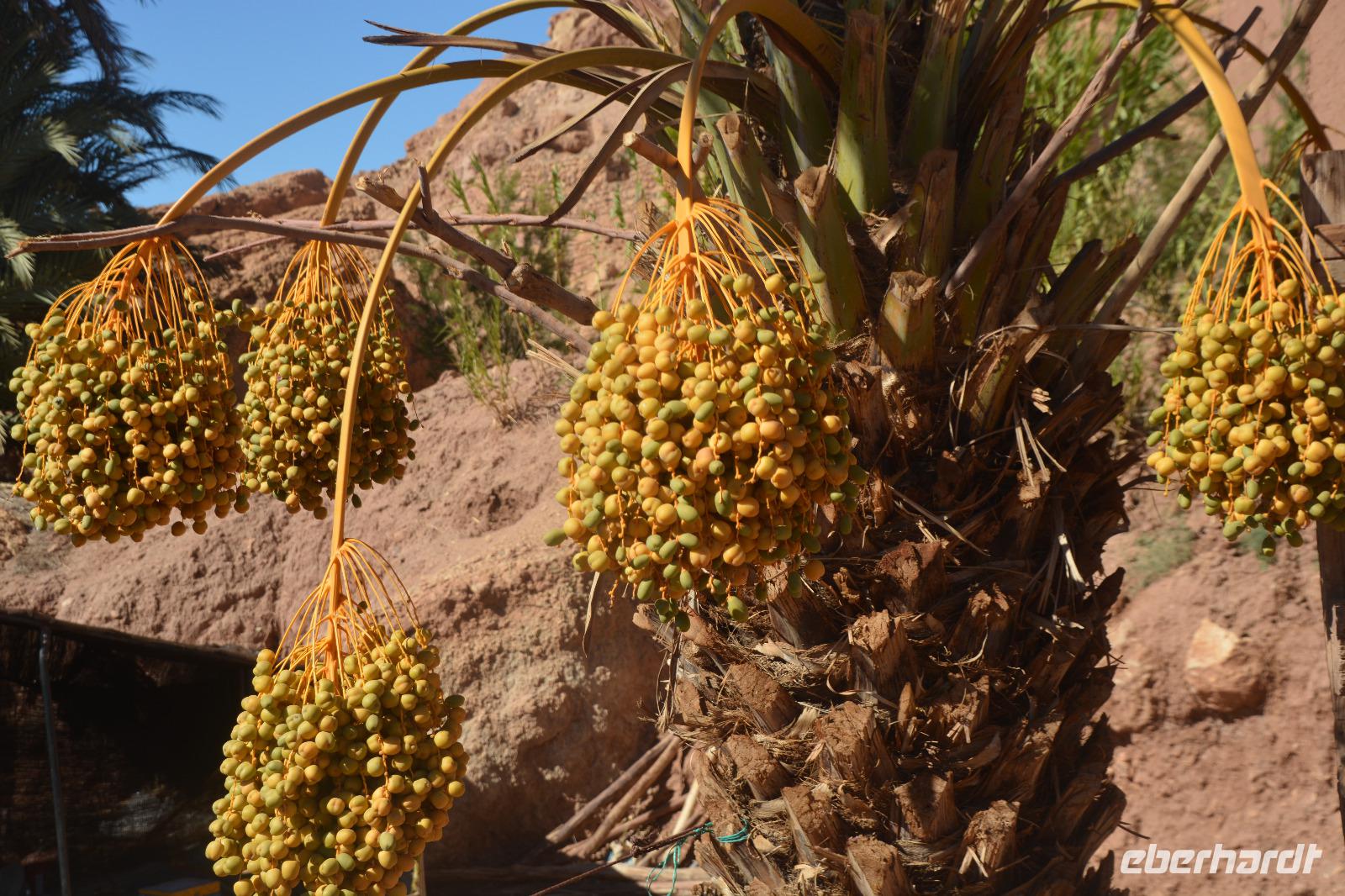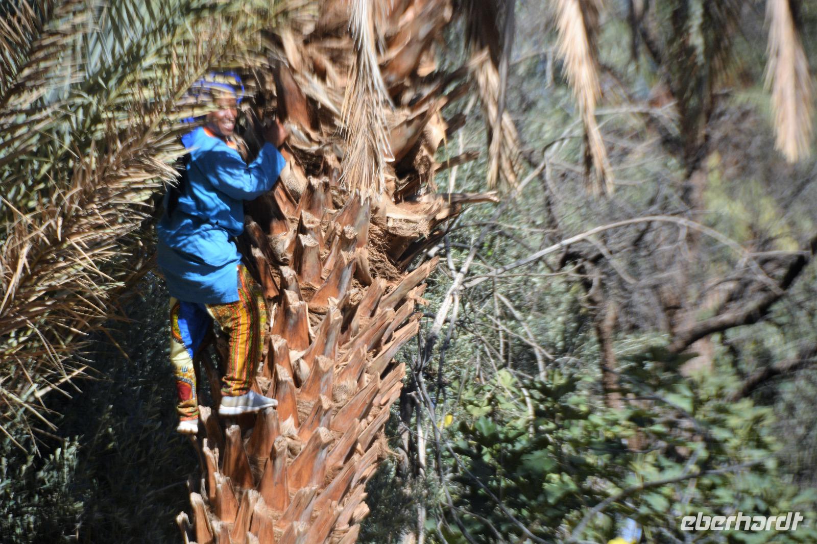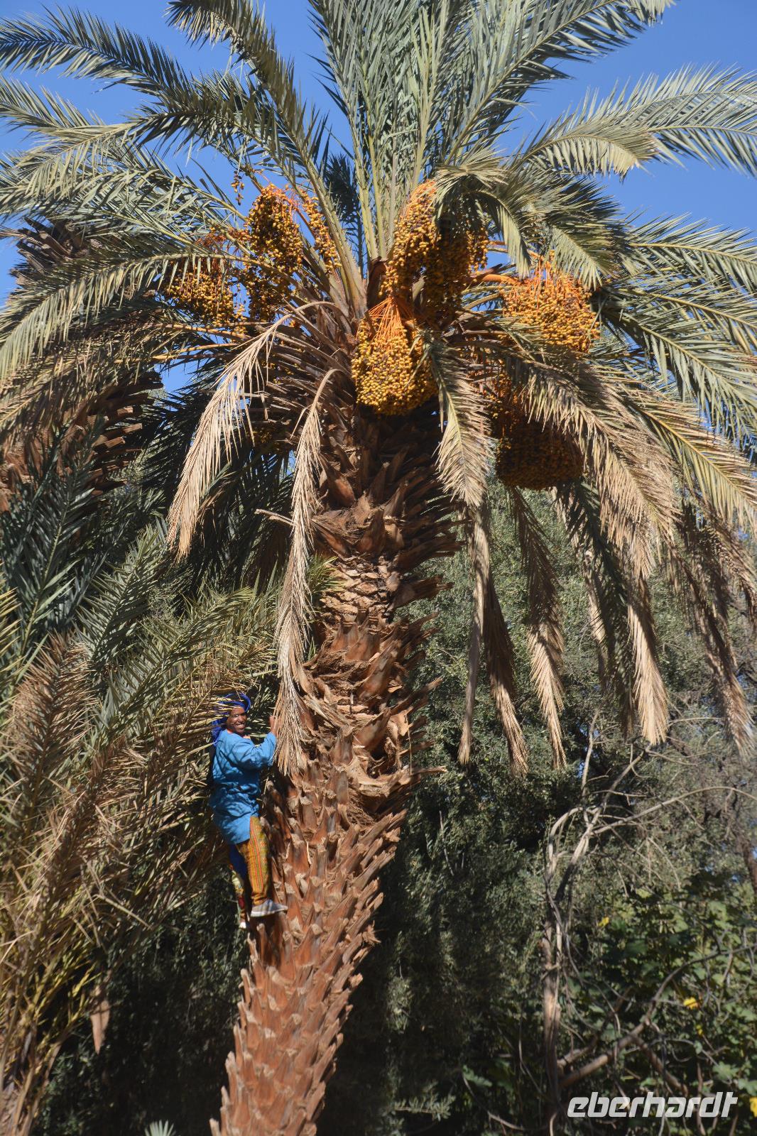 Weiter fahren wir am Südrand des Hohen Atlas in Richtung Todra-Schlucht. Auf Fotostopps halten wir die langsam zerfallenden Lehmdörfer im Bild fest. Heute leben die Menschen lieber in Steinhäusern, bedeutet doch ein Lehmhaus nicht enden wollende Instandhaltungsarbeiten, denn es regnet schon ab und an. Klimatisch sind diese Lehmbauten aber unübertroffen und keine Klimaanlage kann mithalten. Vor der engsten Stelle der Schlucht steigen wir aus und gehen zu Fuss. Diese Schlucht ist auch ein Kletterparadies für die etwas höheren Klettergrade und promt sehen wir mehrere Seilschaften, die sich an den Steilwänden der Schlucht versuchen. Danach machen wir einen Spaziergang durch eine der Oasen von Tinghir und lernen die Oasenwirtschaft etwas näher kennen. Granatapfelbäume und andere Obstbäume beschatten die Felder, auf denen Mais, Luzerne und andere Getreide nach Jahreszeit angebaut werden. Wir erfahren Details über die Dattelpalme und bekommen natürlich auch davon zu kosten. Viele verschiedene Sorten gibt es davon in Marokko. Unser Begleiter aus dem Dorf zeigt uns wie er eine Palme erklimmt um die Datteln zu ernten. Gerade ist Dattelernte in Marokko und frische Datteln sind besonders köstlich. Nach diesem Ausflug geht es über die Straße der Kasbahs in Richtung "Boumalne-du-Dades" zu unserem Hotel mit Aussicht. Hier überrascht uns der für gestern versprochene filmreife Sonnenuntergang. Das Abendessen übertrifft mal wieder alle Erwartungen. Manche von uns sprechen von Diät nach der Reise.