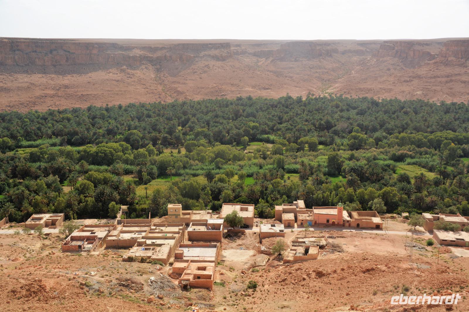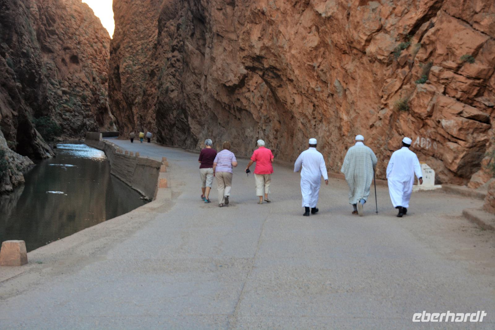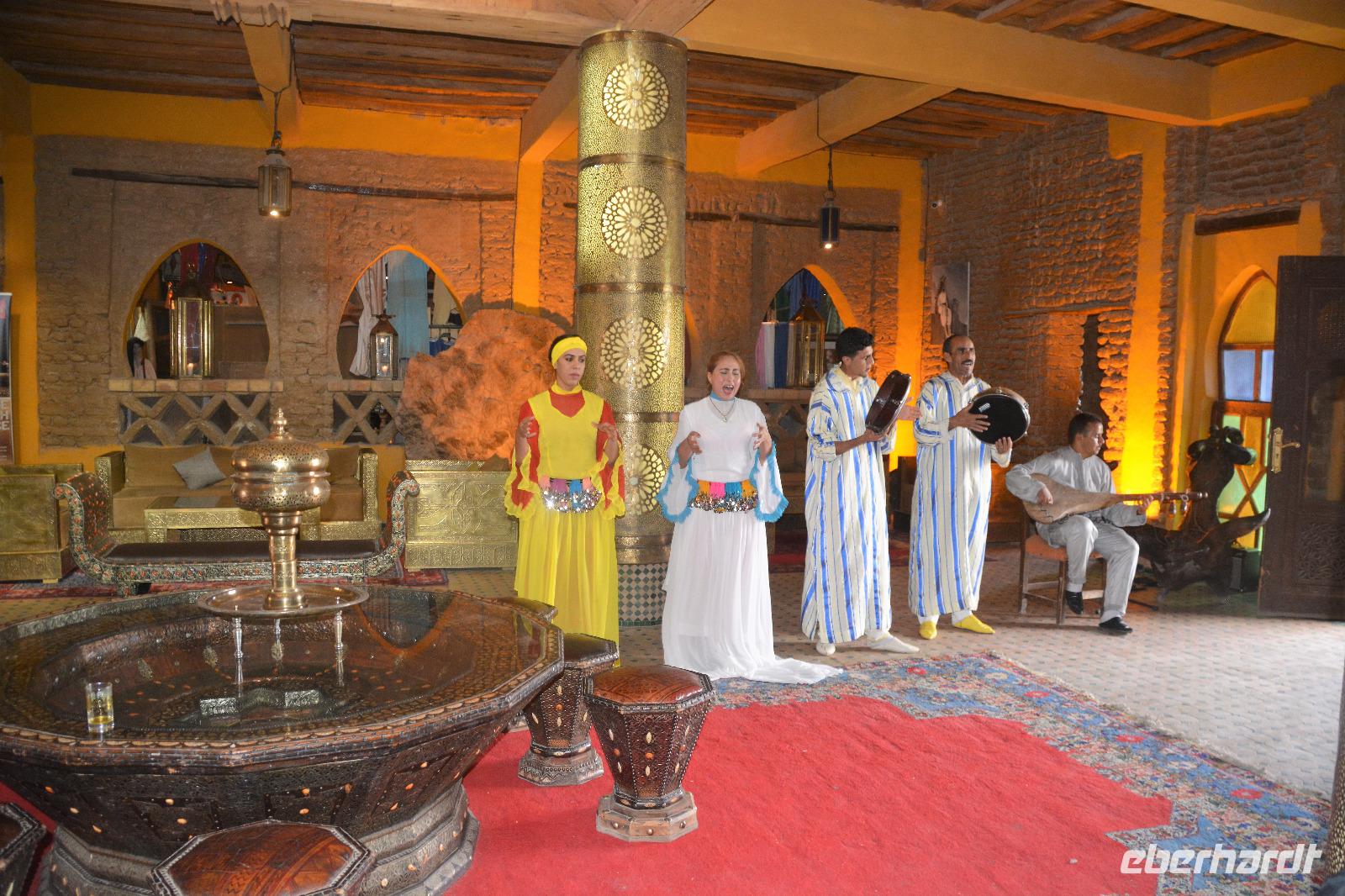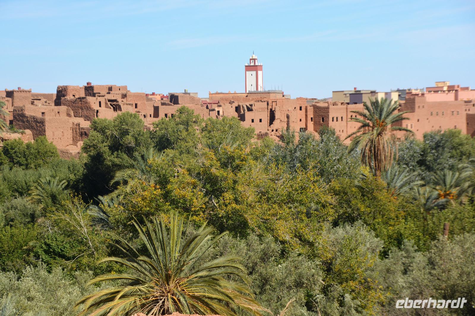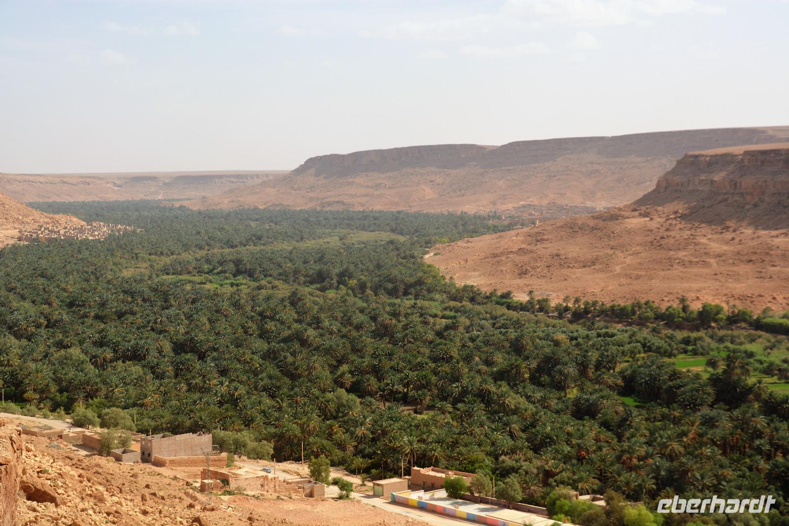 Weiter fahren wir am Südrand des Hohen Atlas in Richtung Todra-Schlucht. Auf Fotostopps halten wir die langsam zerfallenden Lehmdörfer im Bild fest. Heute leben die Menschen lieber in Steinhäusern, bedeutet doch ein Lehmhaus nicht enden wollende Instandhaltungsarbeiten, denn es regnet schon ab und an. Klimatisch sind diese Lehmbauten aber unübertroffen und keine Klimaanlage kann mithalten. Vor der engsten Stelle der Schlucht steigen wir aus und gehen zu Fuss. Diese Schlucht ist auch ein Kletterparadies für die etwas höheren Klettergrade und promt sehen wir mehrere Seilschaften, die sich an den Steilwänden der Schlucht versuchen. Danach machen wir einen Spaziergang durch eine der Oasen von Tinghir und lernen die Oasenwirtschaft etwas näher kennen. Granatapfelbäume und andere Obstbäume beschatten die Felder, auf denen Mais, Luzerne und andere Getreide nach Jahreszeit angebaut werden. Wir erfahren Details über die Dattelpalme und bekommen natürlich auch davon zu kosten. Viele verschiedene Sorten gibt es davon in Marokko. Unser Begleiter aus dem Dorf zeigt uns wie er eine Palme erklimmt um die Datteln zu ernten. Gerade ist Dattelernte in Marokko und frische Datteln sind besonders köstlich. Nach diesem Ausflug geht es über die Straße der Kasbahs in Richtung "Boumalne-du-Dades" zu unserem Hotel mit Aussicht. Hier überrascht uns der für gestern versprochene filmreife Sonnenuntergang. Das Abendessen übertrifft mal wieder alle Erwartungen. Manche von uns sprechen von Diät nach der Reise.