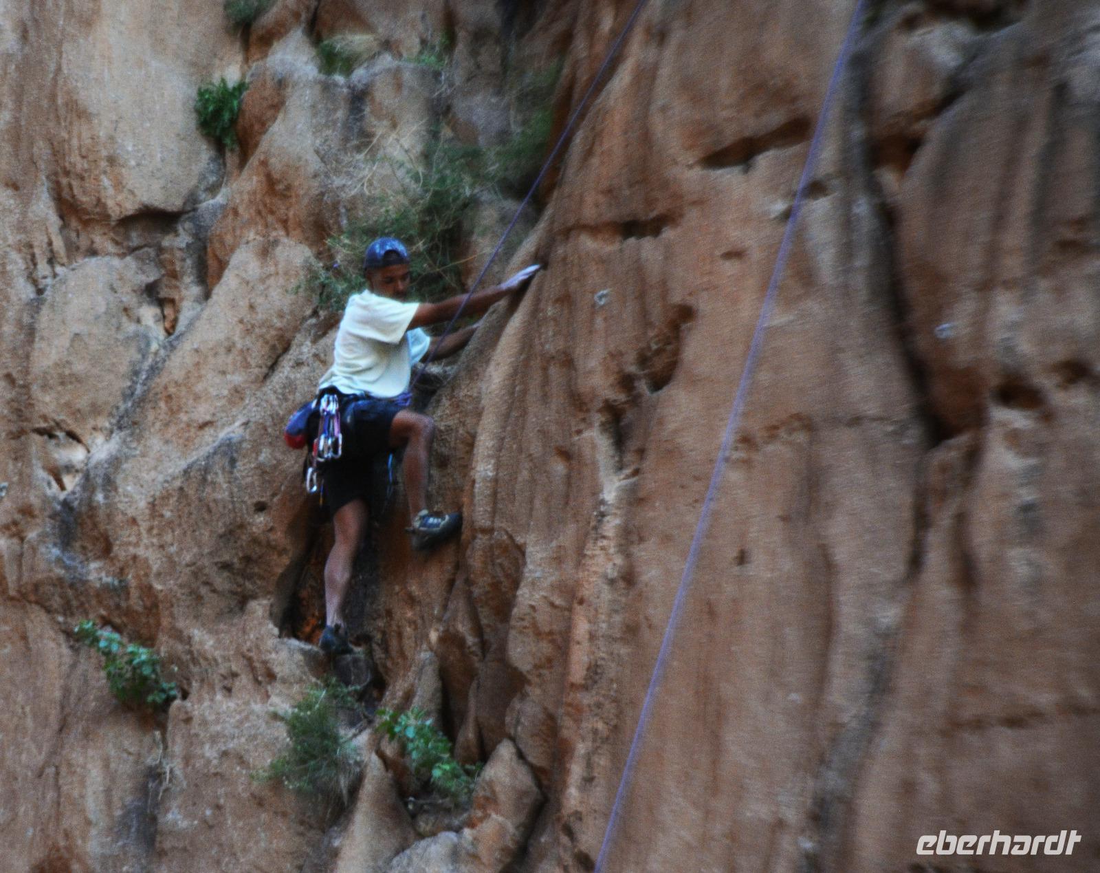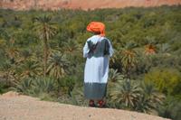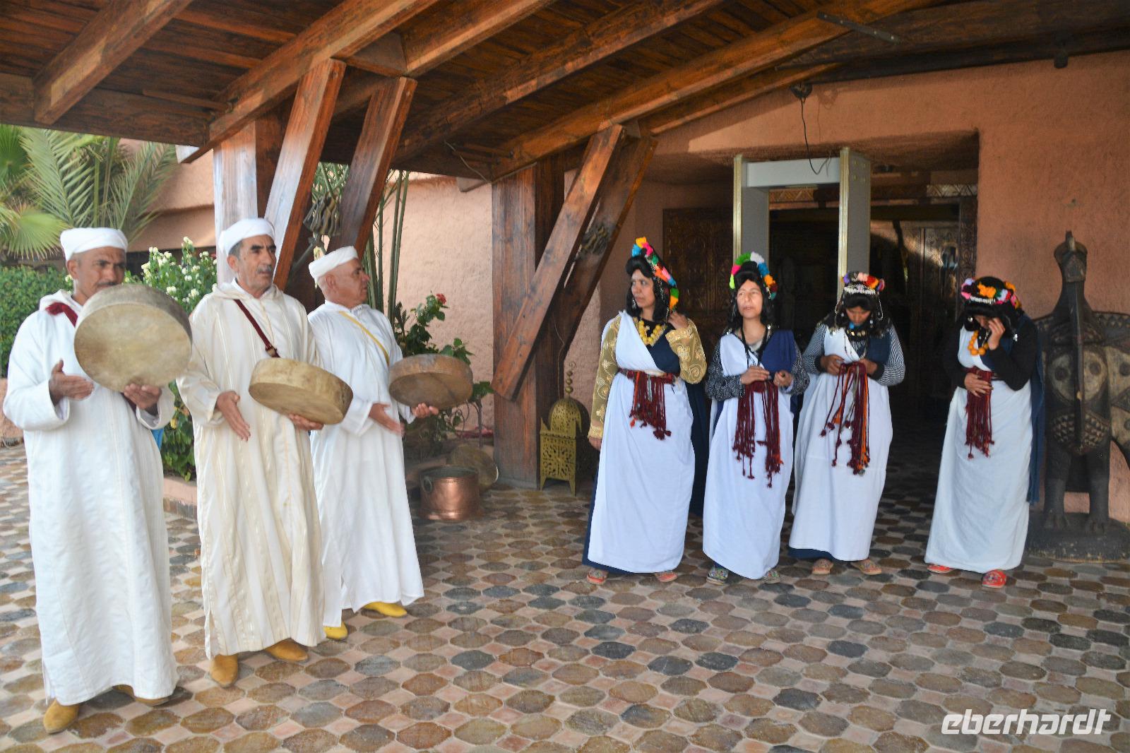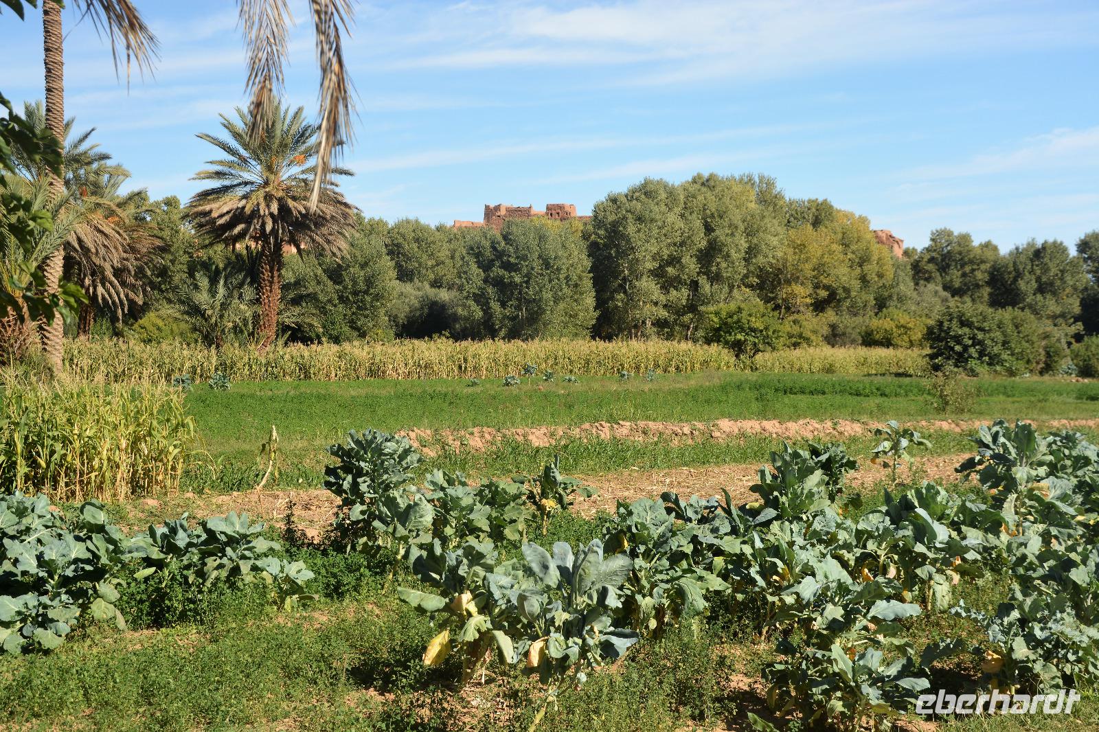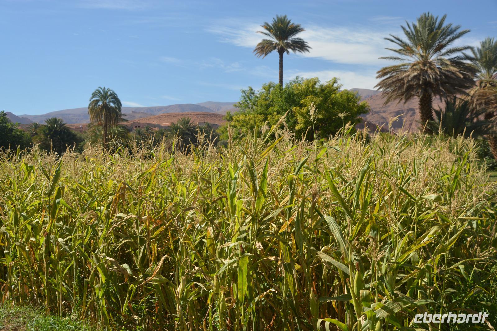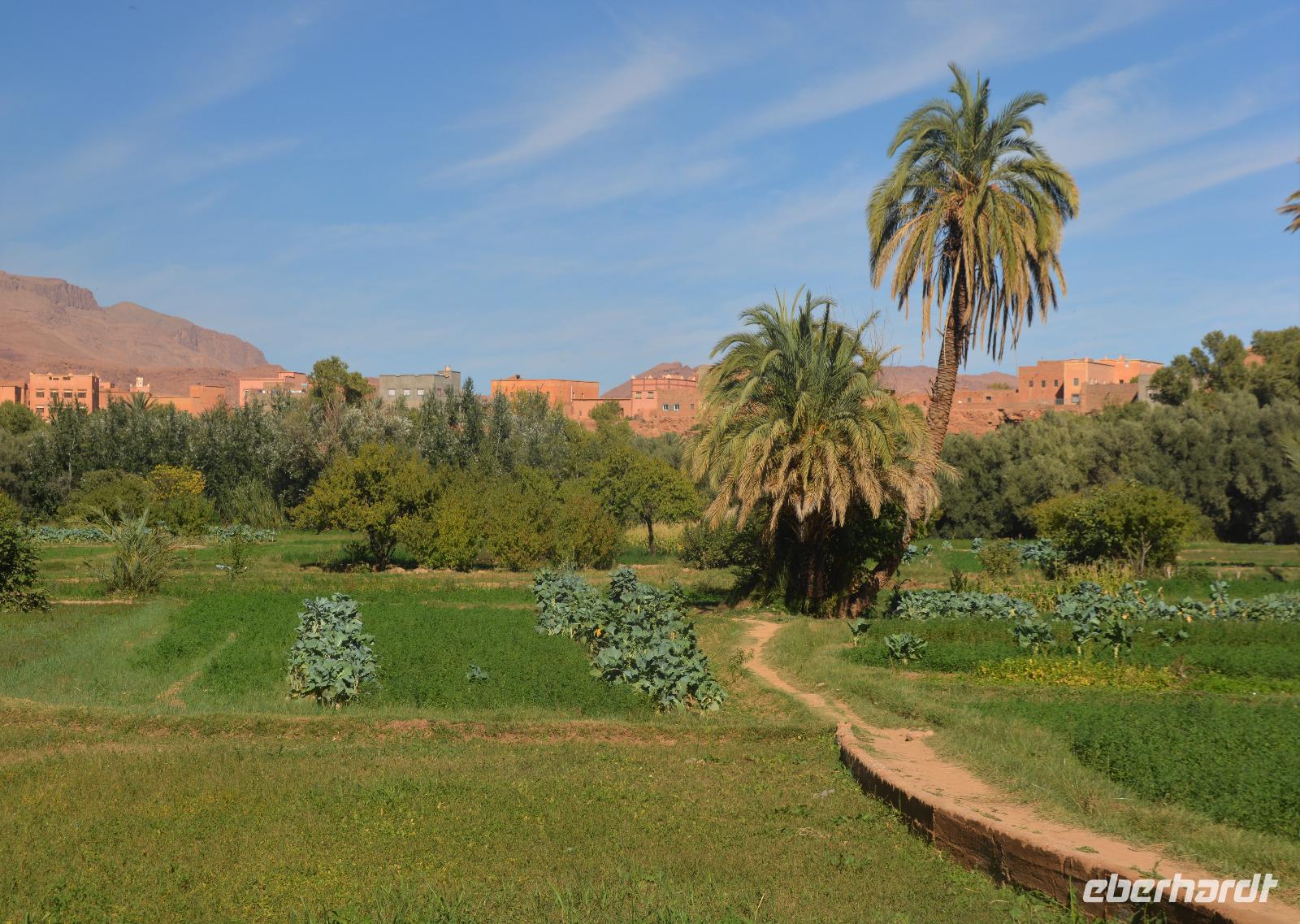 Weiter fahren wir am Südrand des Hohen Atlas in Richtung Todra-Schlucht. Auf Fotostopps halten wir die langsam zerfallenden Lehmdörfer im Bild fest. Heute leben die Menschen lieber in Steinhäusern, bedeutet doch ein Lehmhaus nicht enden wollende Instandhaltungsarbeiten, denn es regnet schon ab und an. Klimatisch sind diese Lehmbauten aber unübertroffen und keine Klimaanlage kann mithalten. Vor der engsten Stelle der Schlucht steigen wir aus und gehen zu Fuss. Diese Schlucht ist auch ein Kletterparadies für die etwas höheren Klettergrade und promt sehen wir mehrere Seilschaften, die sich an den Steilwänden der Schlucht versuchen. Danach machen wir einen Spaziergang durch eine der Oasen von Tinghir und lernen die Oasenwirtschaft etwas näher kennen. Granatapfelbäume und andere Obstbäume beschatten die Felder, auf denen Mais, Luzerne und andere Getreide nach Jahreszeit angebaut werden. Wir erfahren Details über die Dattelpalme und bekommen natürlich auch davon zu kosten. Viele verschiedene Sorten gibt es davon in Marokko. Unser Begleiter aus dem Dorf zeigt uns wie er eine Palme erklimmt um die Datteln zu ernten. Gerade ist Dattelernte in Marokko und frische Datteln sind besonders köstlich. Nach diesem Ausflug geht es über die Straße der Kasbahs in Richtung "Boumalne-du-Dades" zu unserem Hotel mit Aussicht. Hier überrascht uns der für gestern versprochene filmreife Sonnenuntergang. Das Abendessen übertrifft mal wieder alle Erwartungen. Manche von uns sprechen von Diät nach der Reise.