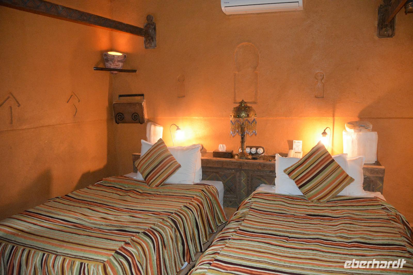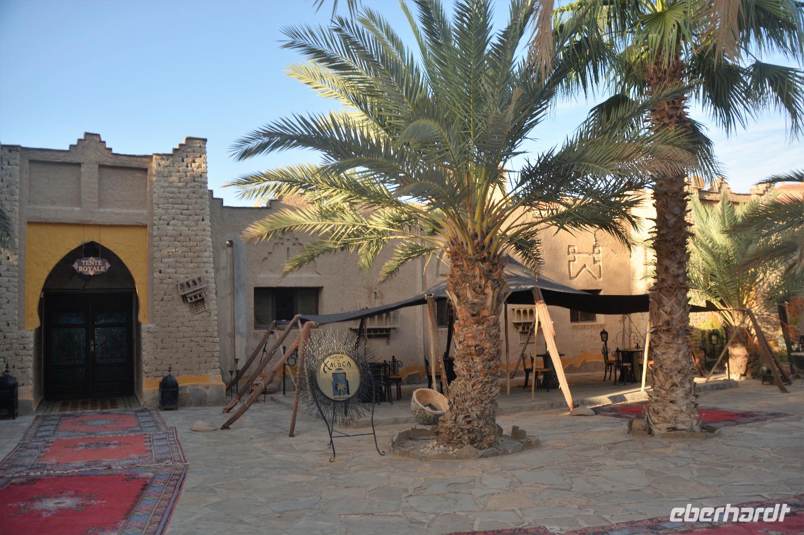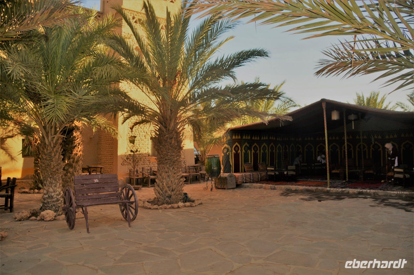 Wir fahren durch die Apfelregion Marokkos nach Midelt und stärken uns heute bei einem von Mohammed organisiertem Picknick. Unsere ersten Dattelpalmen erspähen wir am Qued Ziz. Das Baumaterial der Häuser hat sich ebenfalls gewandelt. Lehm ist der Baustoff des Südens, das ideale Baumaterial für heisse Gegenden. Für die Franzosen war hier während ihrer Protektoratszeit eine wichtige Zugangsschneise in die Sahara. In Vorbereitung auf unser abendliches Abenteuer erfahren wir etwas über das bestens an Wüstenbedingungen angepasste Dromedar und seine Überlebensstrategien. Weiter durch die Garnisonsstadt Er-Rachidia erreichen wir nach Durchqueren von Oasendörfern am Nachmittag unser Hotel. Bevor wir mit unseren Geländewagen abgeholt werden haben wir ein wenig Zeit zu entspannen. Inmitten der geschmackvollen Anlage gibt es sogar einen Pool (Wasser in der Wüste).