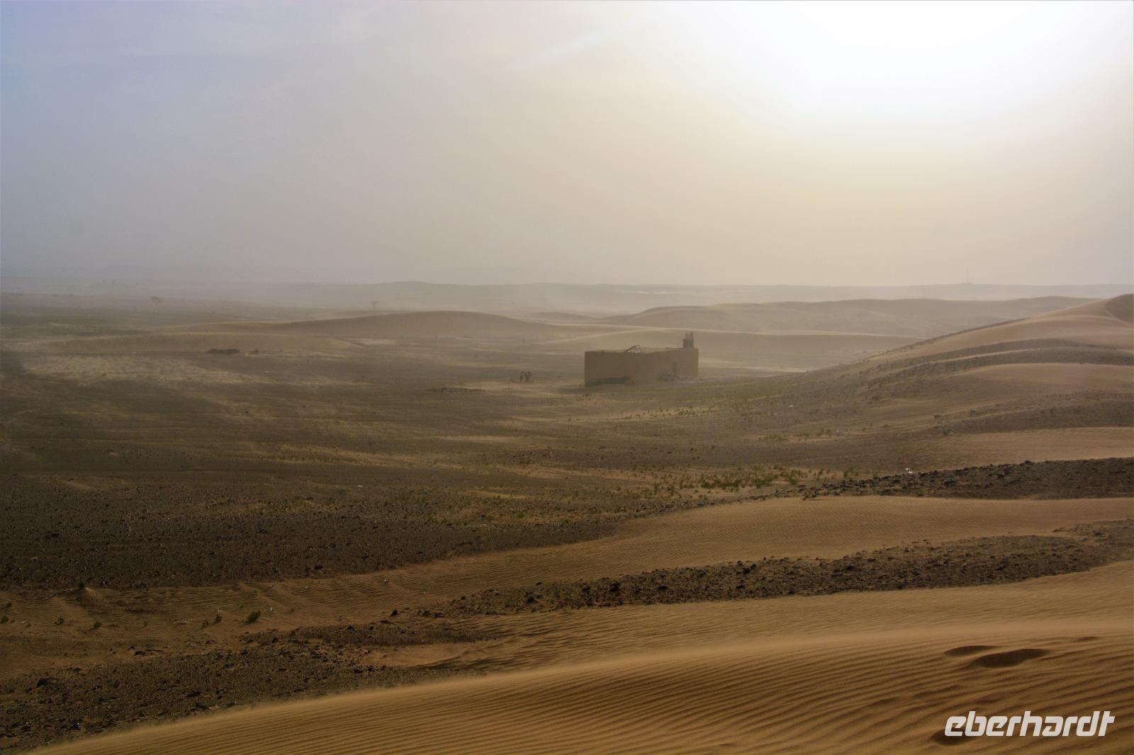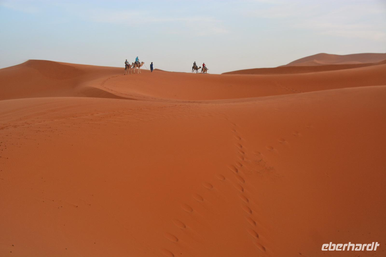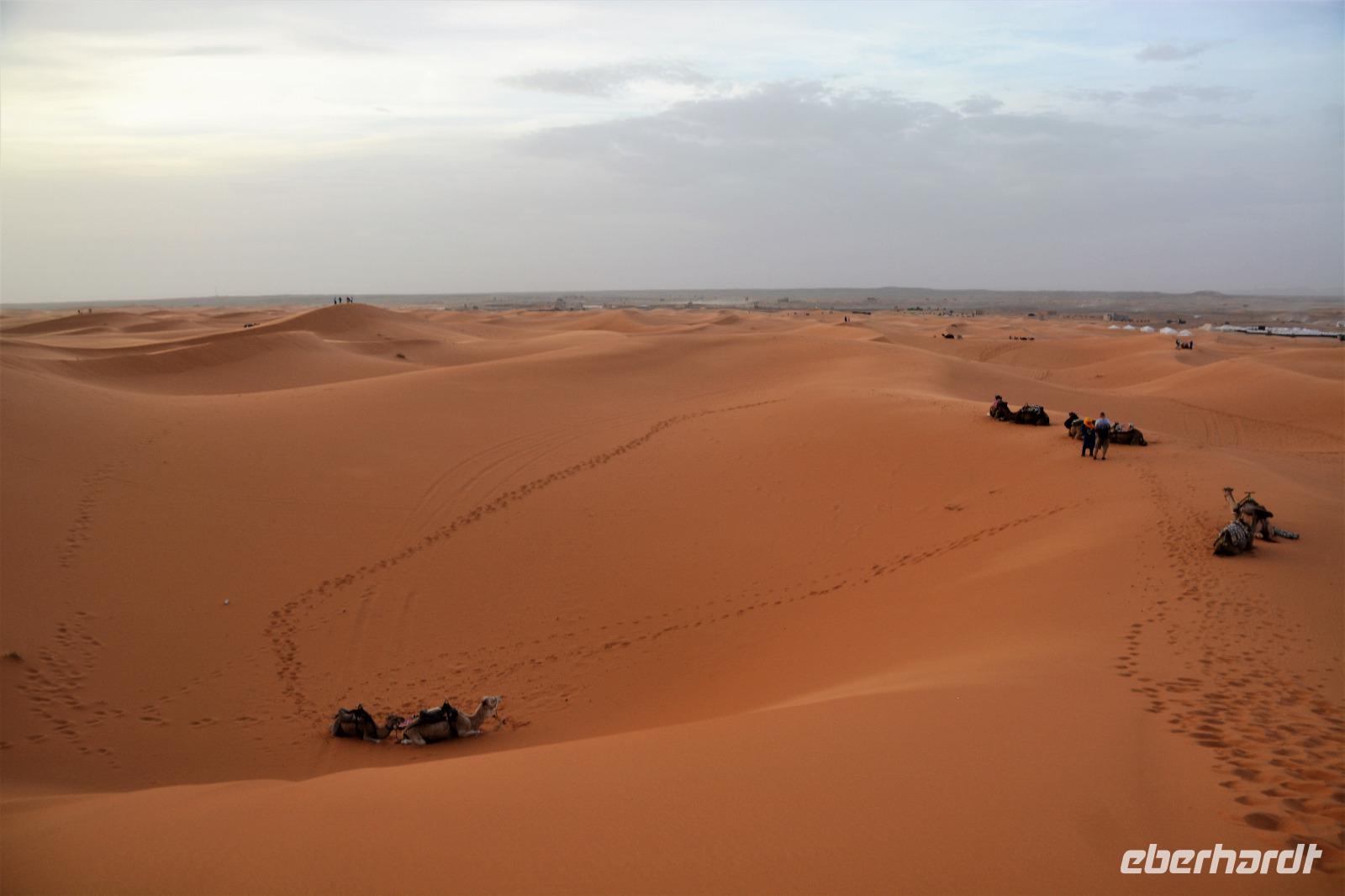 Dann aber geht es los, hinein in die Sahara. Unsere Wüstenfahrzeuge sind sehr bequem und die Fahrer haben heute alle ein Mobiltelefon. Diesen Luxus kannte Lawrence von Arabien noch nicht. Nach einer knappen Stunde Fahrt auf einer Piste kommen wir an einer Art "Karawanenraststätte" an. Es gibt WC und etwas zu trinken. Wir aber sind auf unsere Dromedare gespannt. Leider, leider macht sich die Sonne etwas rar und der Himmel ist bewölkt. Wir mutmaßen, daß zwar die Sonne untergehen wird, wir sie aber nicht sehen werden. Wir lassen uns aber nicht entmutigen. Jeder bekommt sein Dromedar zugewiesen und hopp .. schön festhalten, denn Dromedare stehen mit den Hinterbeinen zuerst auf.....geht es los im schwankenden Gang in Richtung Sanddüne. Wir schaukeln im gemächlichen Gang in Richtung Dünenkamm. Oben heisst es absitzen und noch ein paar Schritte zu Fuss, denn die Tierchen mögen ganz steile Dünen überhaupt nicht. Nun ja, den "schönsten Sonnenuntergang" hatten wir nicht aber auf alle Fälle ein echtes "Dromedarerlebnis". Zurück im Hotel geht ein langer Tag zu Ende und wir genießen unser Abendessen.