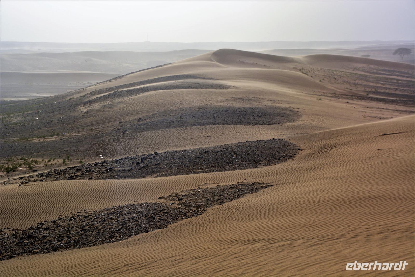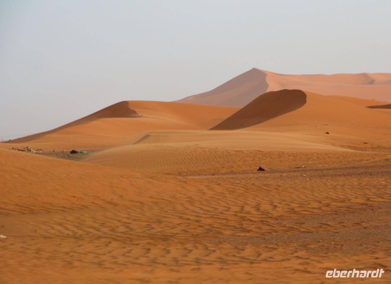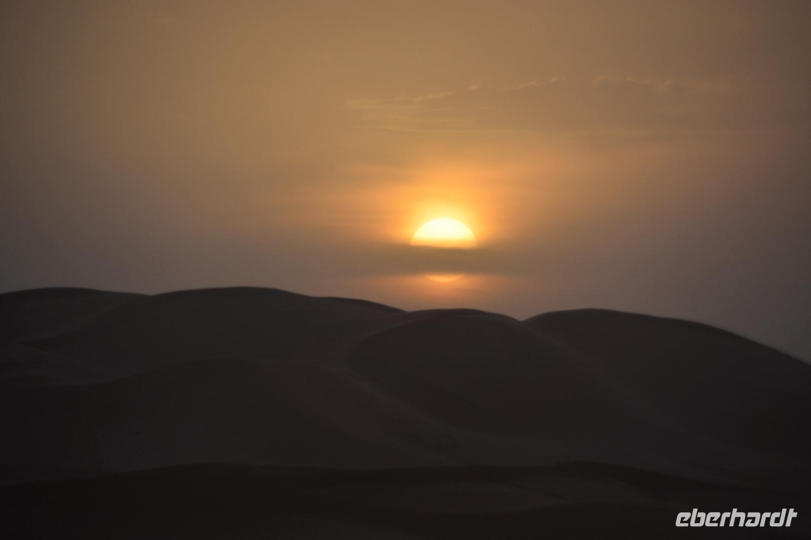 Dann aber geht es los, hinein in die Sahara. Unsere Wüstenfahrzeuge sind sehr bequem und die Fahrer haben heute alle ein Mobiltelefon. Diesen Luxus kannte Lawrence von Arabien noch nicht. Nach einer knappen Stunde Fahrt auf einer Piste kommen wir an einer Art "Karawanenraststätte" an. Es gibt WC und etwas zu trinken. Wir aber sind auf unsere Dromedare gespannt. Leider, leider macht sich die Sonne etwas rar und der Himmel ist bewölkt. Wir mutmaßen, daß zwar die Sonne untergehen wird, wir sie aber nicht sehen werden. Wir lassen uns aber nicht entmutigen. Jeder bekommt sein Dromedar zugewiesen und hopp .. schön festhalten, denn Dromedare stehen mit den Hinterbeinen zuerst auf.....geht es los im schwankenden Gang in Richtung Sanddüne. Wir schaukeln im gemächlichen Gang in Richtung Dünenkamm. Oben heisst es absitzen und noch ein paar Schritte zu Fuss, denn die Tierchen mögen ganz steile Dünen überhaupt nicht. Nun ja, den "schönsten Sonnenuntergang" hatten wir nicht aber auf alle Fälle ein echtes "Dromedarerlebnis". Zurück im Hotel geht ein langer Tag zu Ende und wir genießen unser Abendessen.