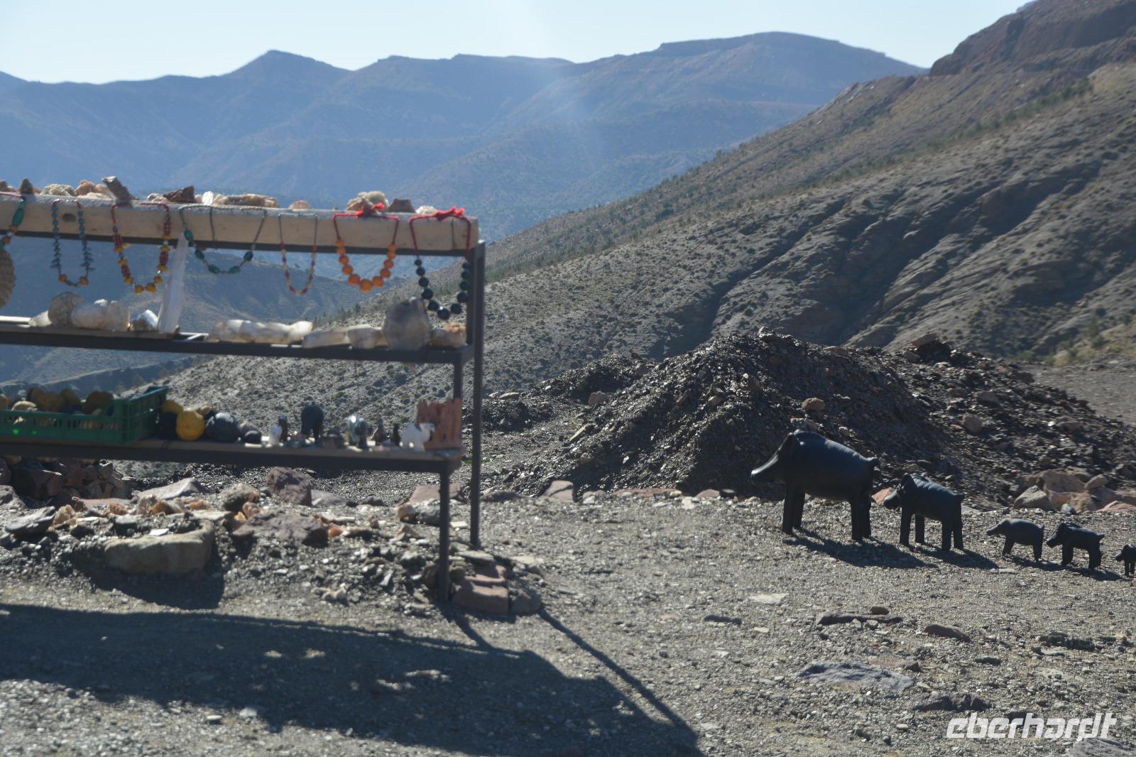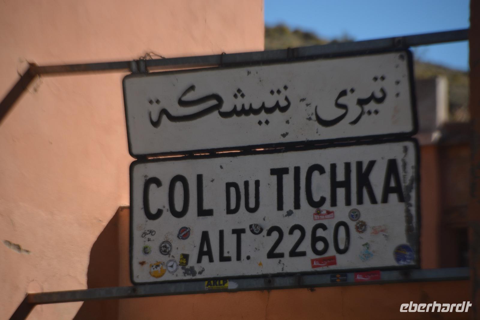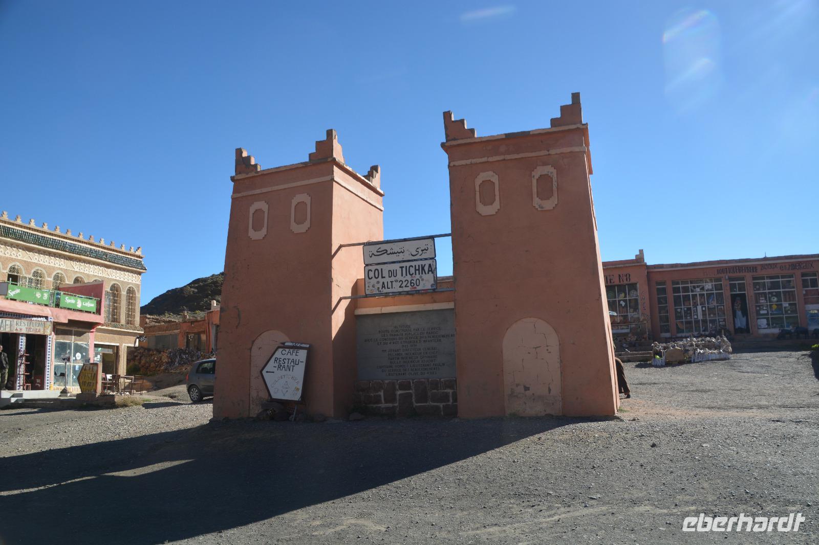 Heute beginnt der vorletzte Tag unserer Reise. Wir befinden uns auf dem Weg zurück in die Stadt von der wir gestartet sind: Marrakesch. Dazu haben wir den höchsten Straßenpass Marokkos zu überwinden. Langsam schlängelt sich die Straße nach oben. Sie befindet sich gerade im Bau und Mohammed erklärt uns, daß es in letzter Zeit oft zu Sperrungen wegen Sprengungen gekommen ist. So sind wir froh, daß wir ohne große Stopps am Tizi-n-Tichka-Pass ankommen, 2260 m über dem Meeresspiegel. Wir halten kurz für ein Foto. Kühl ist es hier, es wird wohl bald schneien, während die Nachrichten aus Deutschland von immer noch fast 20 Grad künden. Wir kommen ohne Zwischenfälle oder Zwangsaufenthalte in Marrakesch an und beziehen unsere Zimmer im uns schon bekannten Hotel.