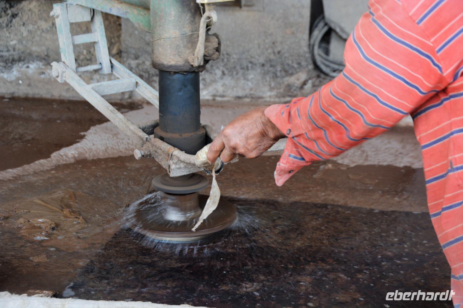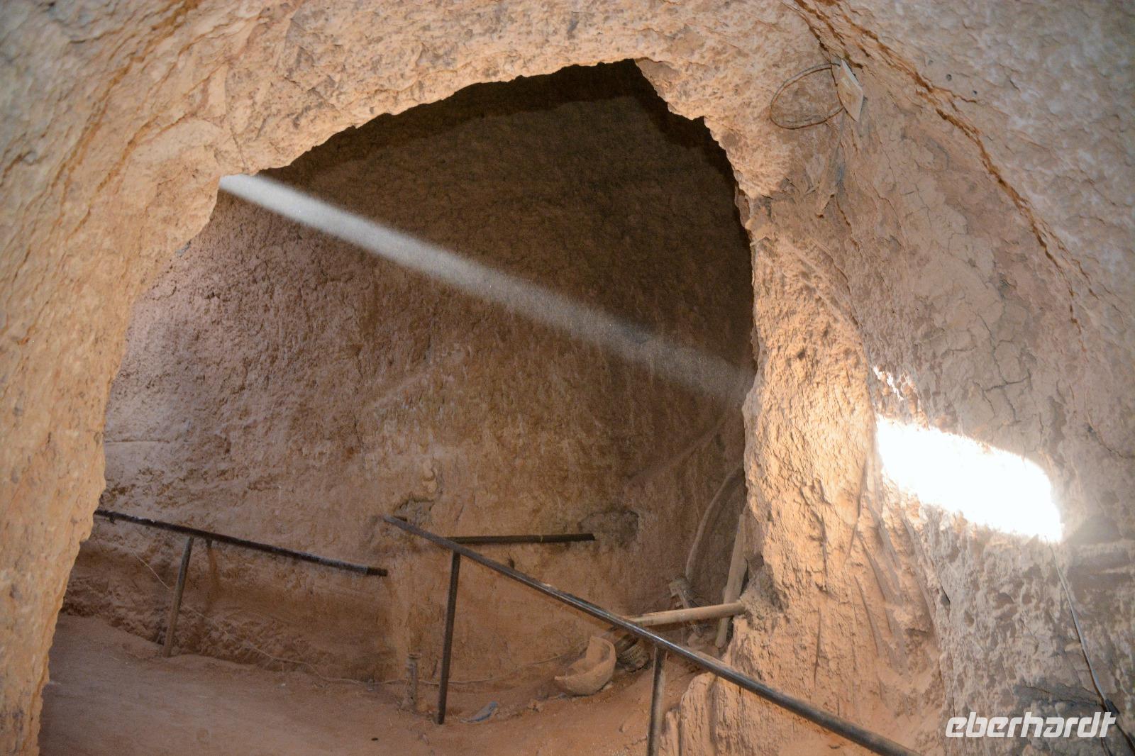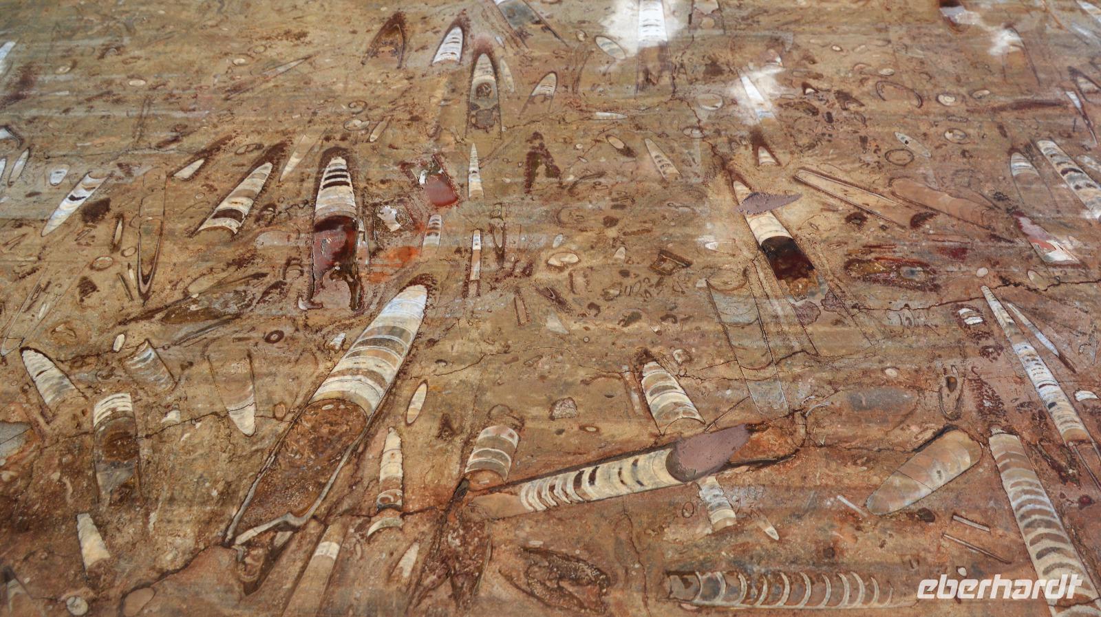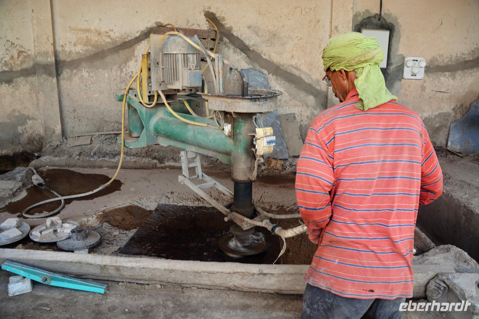 Schon auf der Fahrt hierher sind uns die verschiedenen Fossilien an den Verkaufsständen an der Straße aufgefallen. Marokko ist auch das Land der Geologen und Fossiliensammler, liegt es doch auf der Grenze der tektonischen Platten zwischen Europa und Asien. Ammoniten, Trilobiten, Seelilien und vieles mehr haben sich bis heute erhalten. Einige sind eingebettet in einem harten marmorähnlichen Gestein. Aus diesem fossilen Gestein werden fantastische Tischplatten, Waschbecken oder Skulpturen herausgeschnitten, poliert und verkauft. In unserem letzten Hotel durften wir schon die kunstvollen Waschbecken bewundern. Wir fahren in eine Werkstatt und sehen wie das Gestein präpariert und poliert wird. Zum Mitnehmen natürlich zu schwer wird so ein "Kunstwerk" frei haus in alle Welt geliefert. Beeindruckt fahren wir weiter. Als nächste Überraschung wartet eine weitere Besonderheit Marokkos auf uns, ein altes Bewässerungssystem, welches früher Wasser in die Oasen beförderte. Diese "Khettaras" genannten unterirdischen Wasserkanäle sind noch im Besitz der Familien und wurden in den letzten Jahren für die Besucher präpariert. Wir können bei einem sehr freundlichen Marokkaner in die Unterwelt hinabsteigen und sind beeindruckt, was von Menschenhand mit einfachen Mitteln gegraben wurde. Die Wartungsarbeiten durch die unbefestigten Schächte waren eine lebensgefährliche Arbeit.