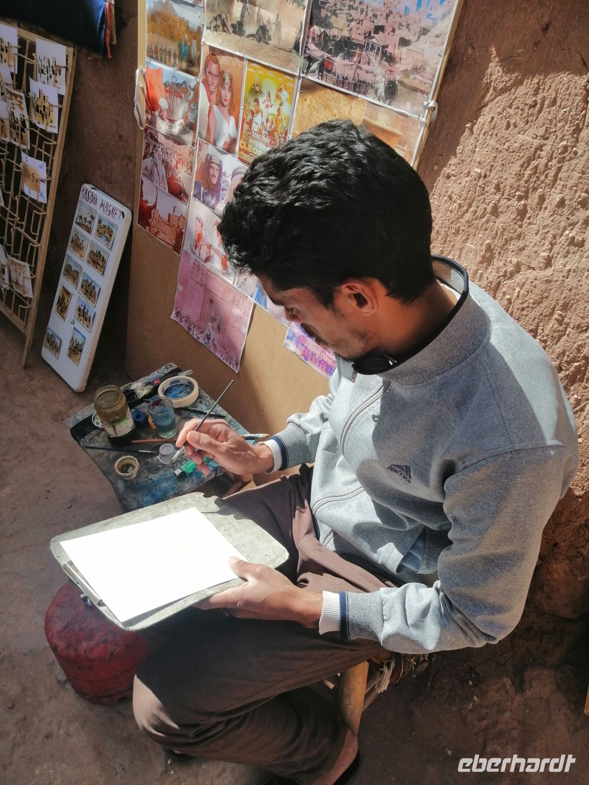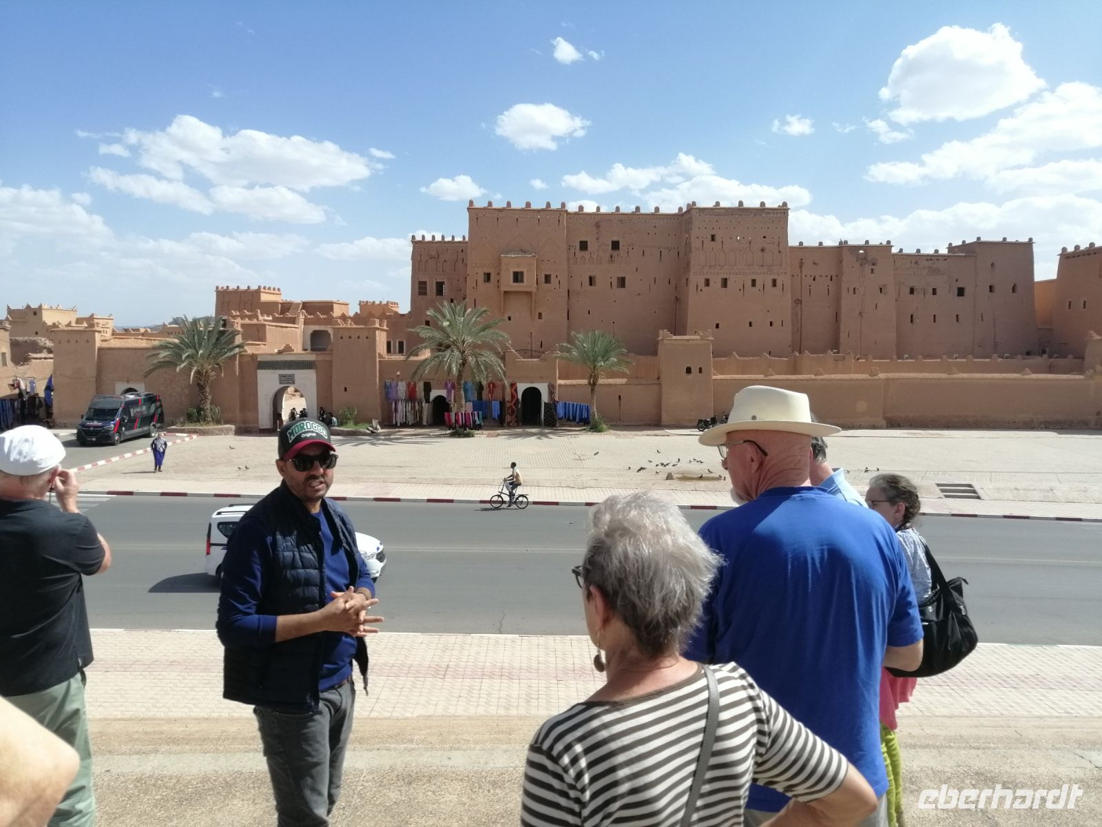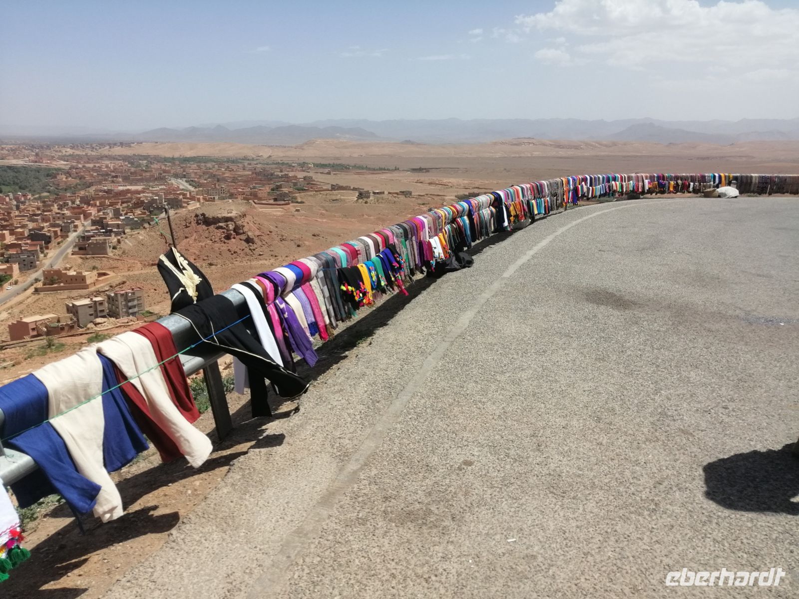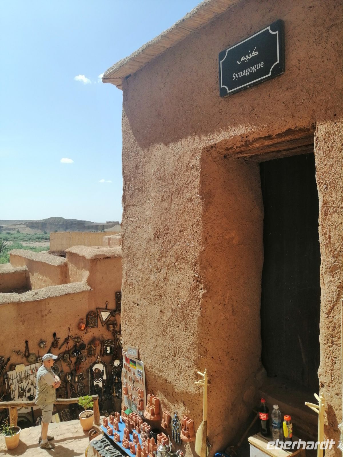 Nach dem Frühstück machten wir uns auf dem Weg und besuchten die prachtvolle Kasbah Ait-Ben-Haddou. Um diese gigantische Lehmburg zu erreichen, gingen wir zuerst durch die Straßen der Ortschaft, überquerten den Fluß über eine Brücke und stiegen dann über die engen Gassen der Kasbah bis nach ganz oben. Unterwegs begegneten wir einem Straßenkünstler, der nach einem besonderen Verfahren seine Gemälde malte, wir trafen mehrere Tuch- und Kleiderhändler, machten halt an einer Synagoge. Von Said erfuhren wir, dass diese Kasbah zum Unesco-Weltkulturerbe gehört und eine begehrte Filmkulisse für viele bekannte Filme vor allem für Filme zur biblischen Geschichte darstellte. Vom Gipfel der Kasbah konnten wir zusehen, wie die Filmkulisse für die Dreharbeiten am neuen Film Gladiator 2 aufgebaut wurde.
