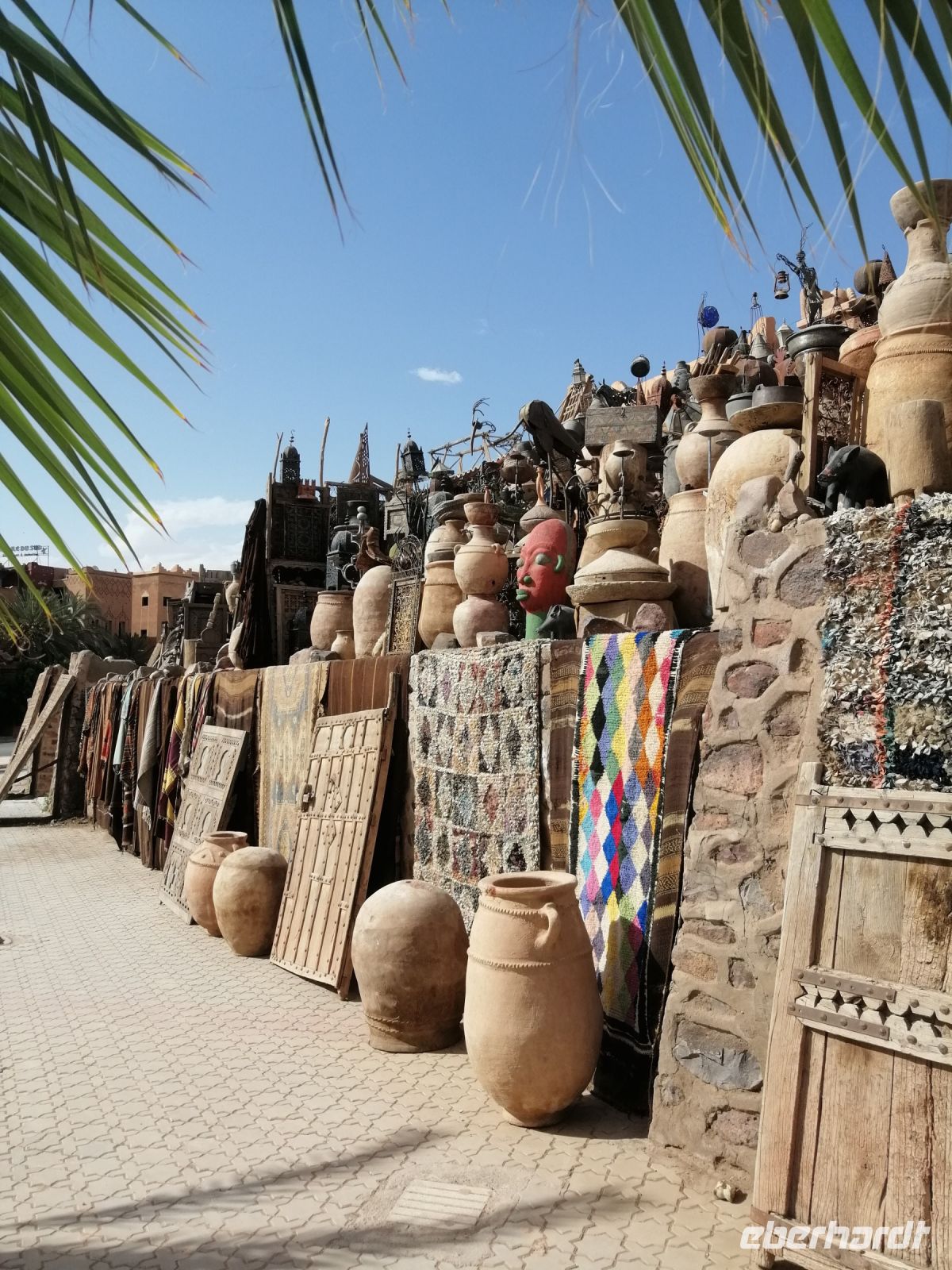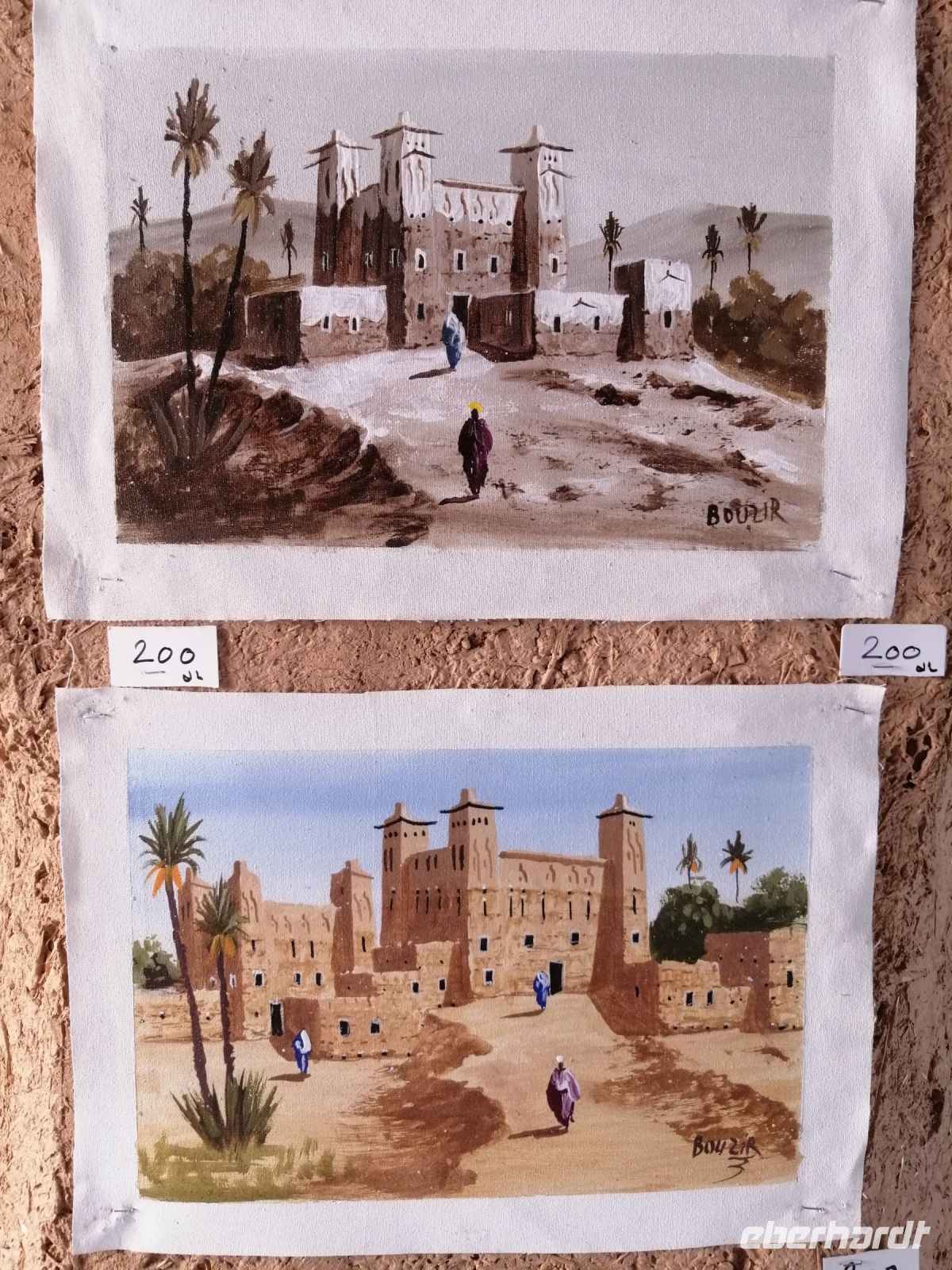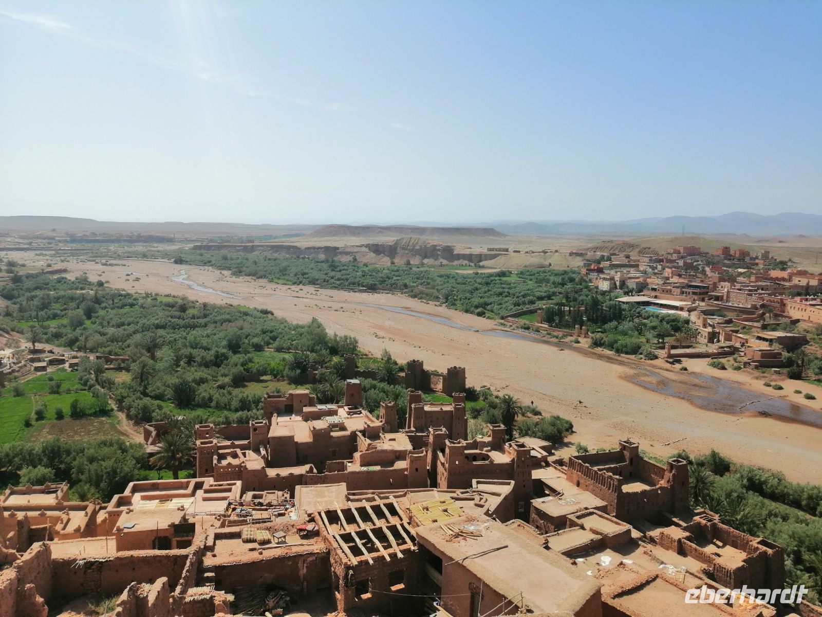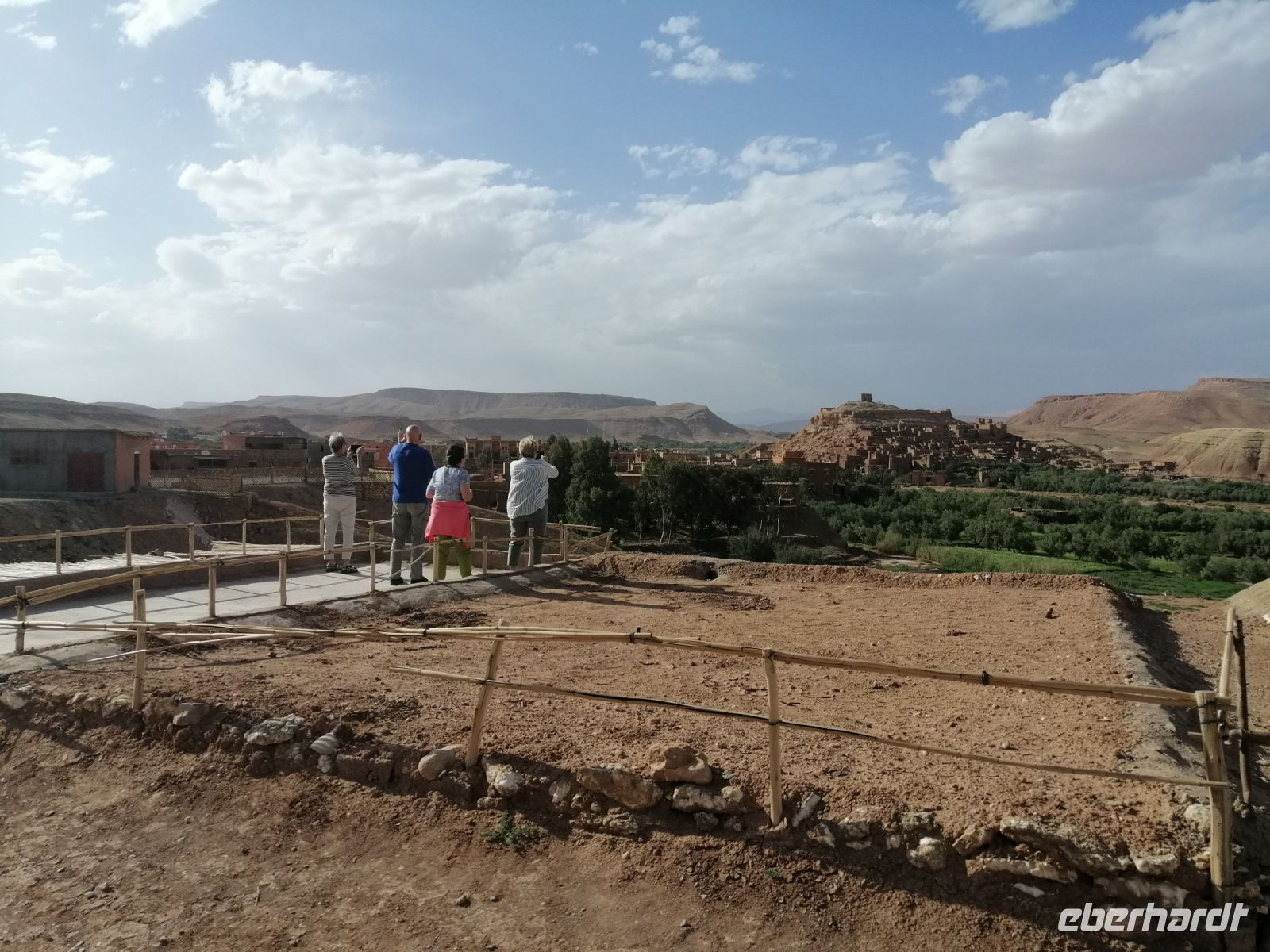 Nach dem Frühstück machten wir uns auf dem Weg und besuchten die prachtvolle Kasbah Ait-Ben-Haddou. Um diese gigantische Lehmburg zu erreichen, gingen wir zuerst durch die Straßen der Ortschaft, überquerten den Fluß über eine Brücke und stiegen dann über die engen Gassen der Kasbah bis nach ganz oben. Unterwegs begegneten wir einem Straßenkünstler, der nach einem besonderen Verfahren seine Gemälde malte, wir trafen mehrere Tuch- und Kleiderhändler, machten halt an einer Synagoge. Von Said erfuhren wir, dass diese Kasbah zum Unesco-Weltkulturerbe gehört und eine begehrte Filmkulisse für viele bekannte Filme vor allem für Filme zur biblischen Geschichte darstellte. Vom Gipfel der Kasbah konnten wir zusehen, wie die Filmkulisse für die Dreharbeiten am neuen Film Gladiator 2 aufgebaut wurde.