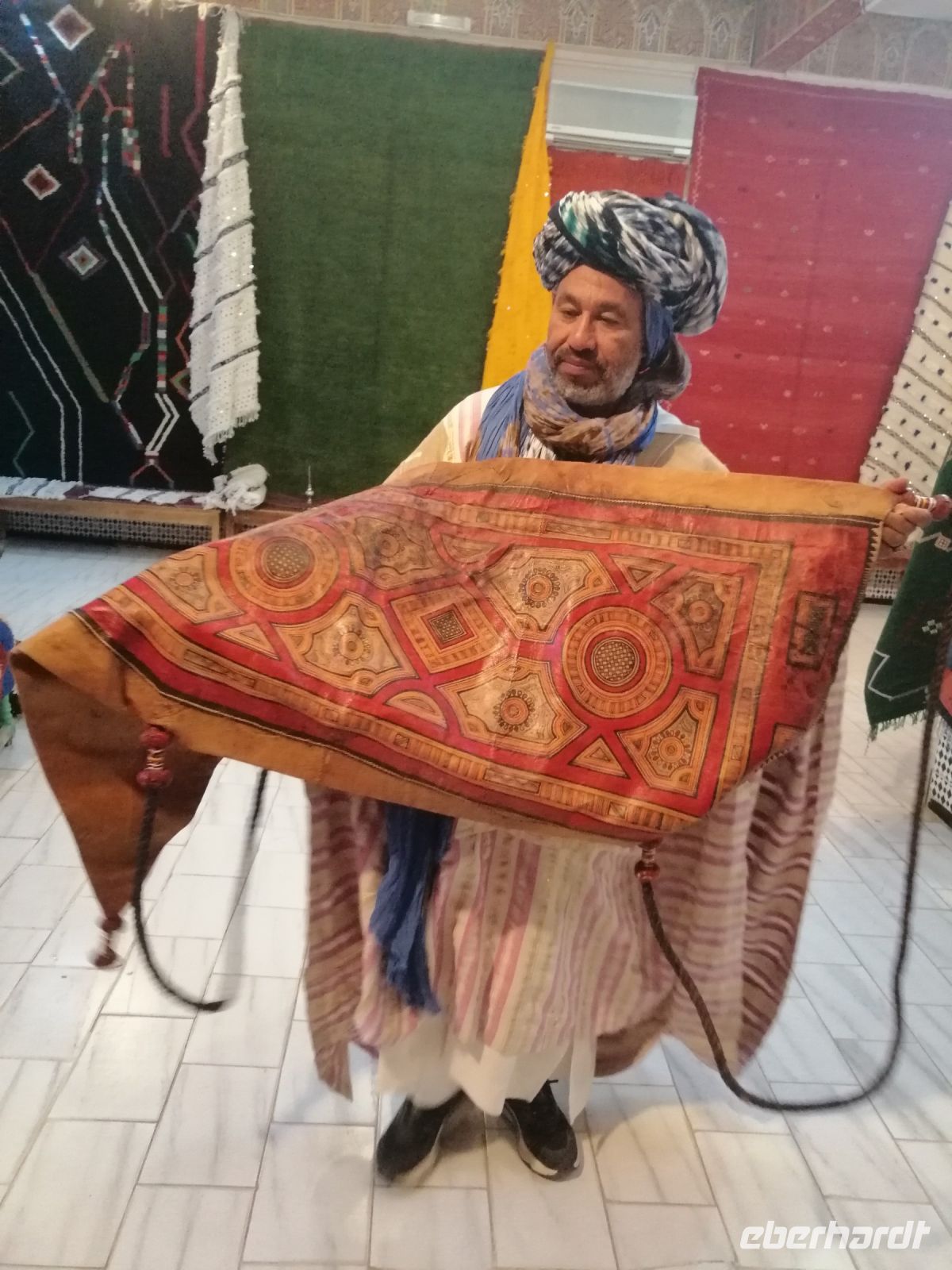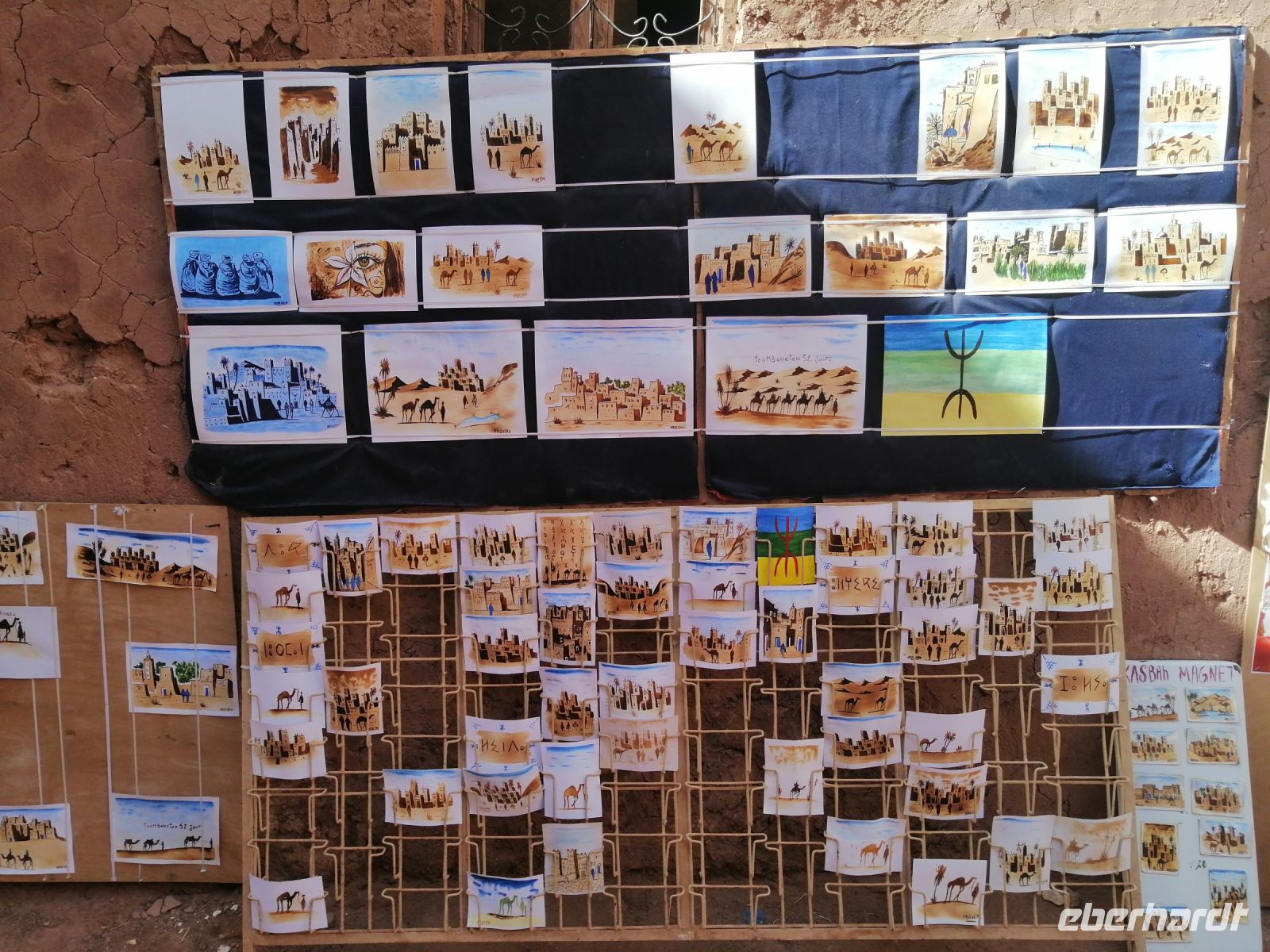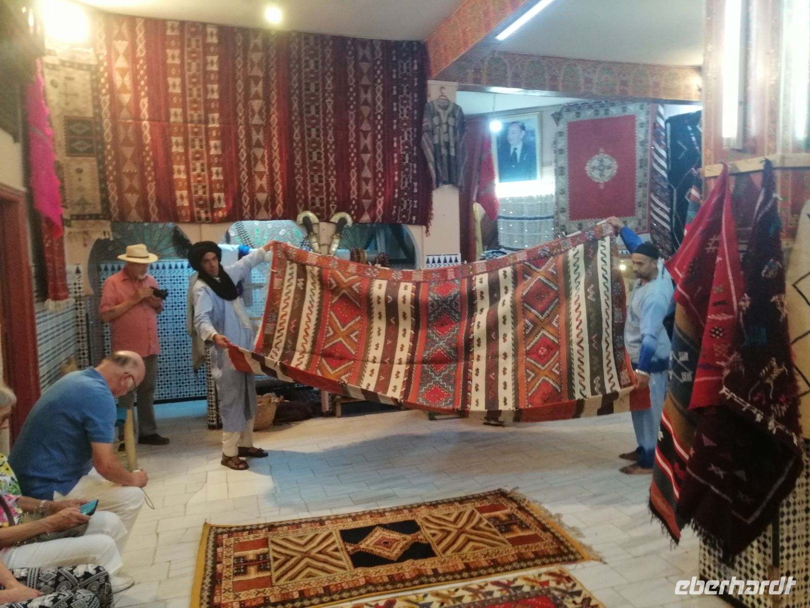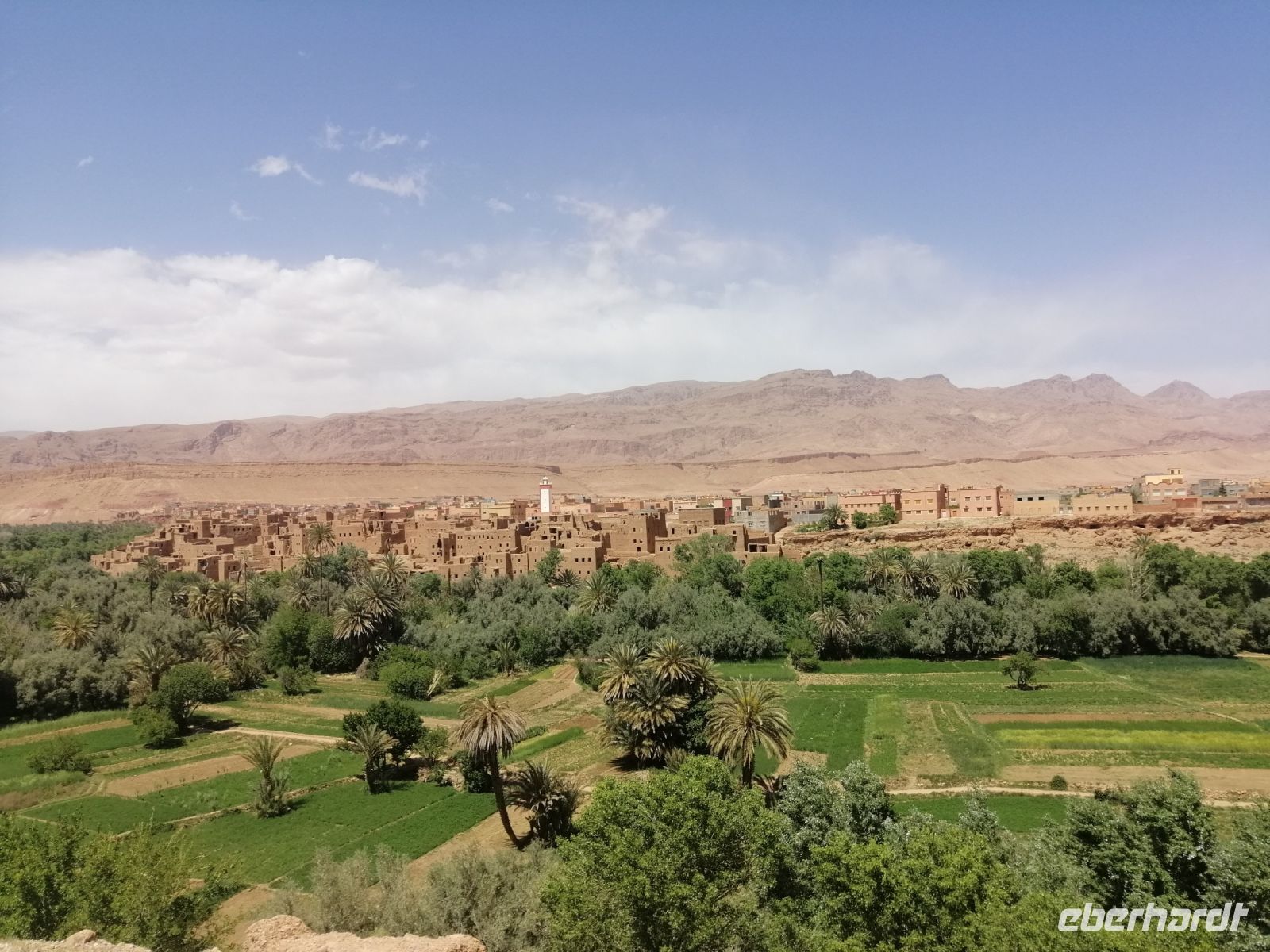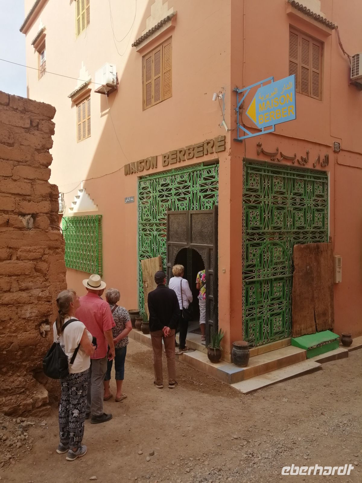 Nach dem Frühstück machten wir uns auf dem Weg und besuchten die prachtvolle Kasbah Ait-Ben-Haddou. Um diese gigantische Lehmburg zu erreichen, gingen wir zuerst durch die Straßen der Ortschaft, überquerten den Fluß über eine Brücke und stiegen dann über die engen Gassen der Kasbah bis nach ganz oben. Unterwegs begegneten wir einem Straßenkünstler, der nach einem besonderen Verfahren seine Gemälde malte, wir trafen mehrere Tuch- und Kleiderhändler, machten halt an einer Synagoge. Von Said erfuhren wir, dass diese Kasbah zum Unesco-Weltkulturerbe gehört und eine begehrte Filmkulisse für viele bekannte Filme vor allem für Filme zur biblischen Geschichte darstellte. Vom Gipfel der Kasbah konnten wir zusehen, wie die Filmkulisse für die Dreharbeiten am neuen Film Gladiator 2 aufgebaut wurde.