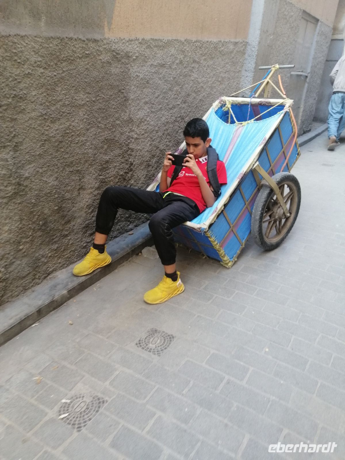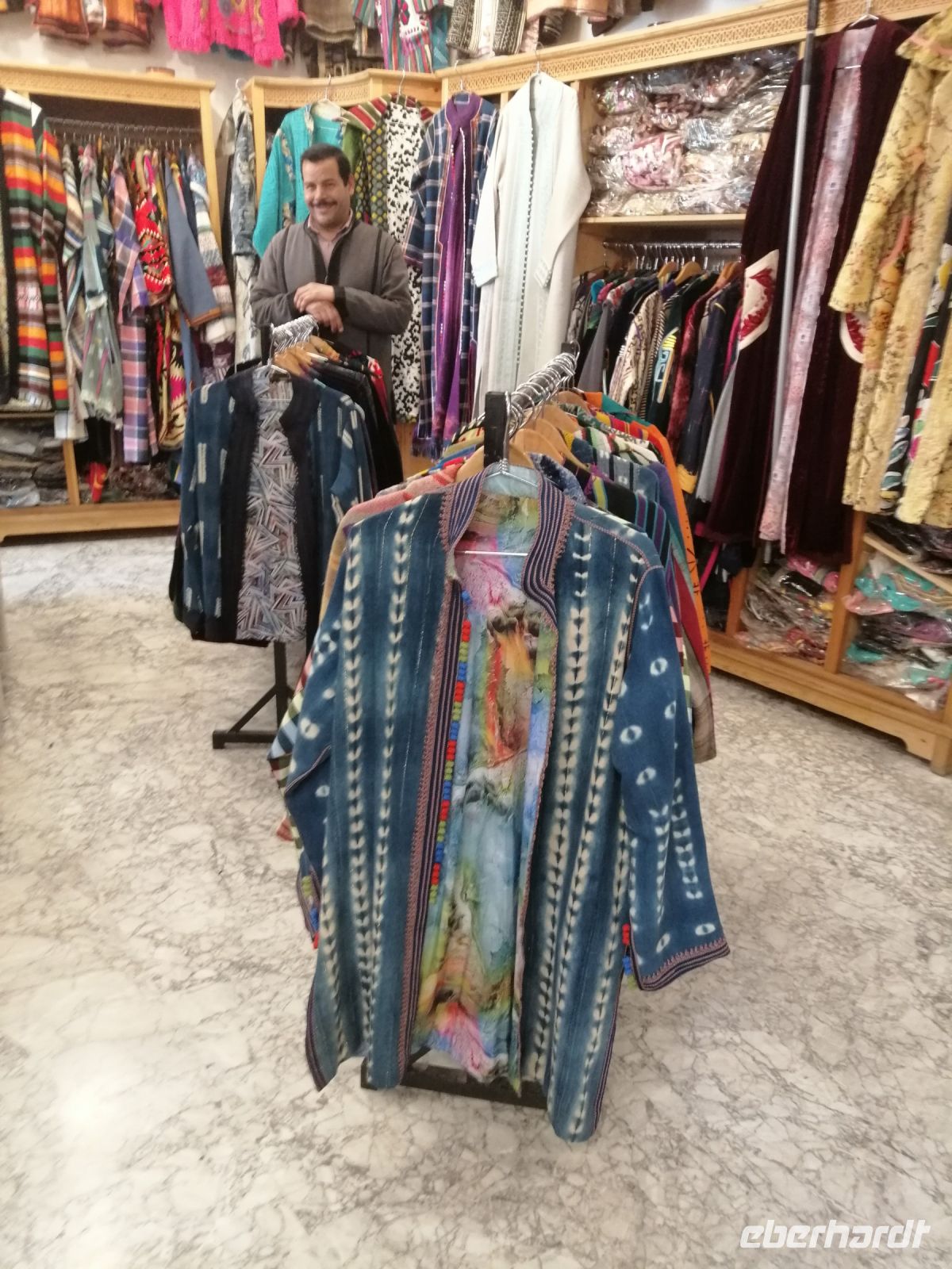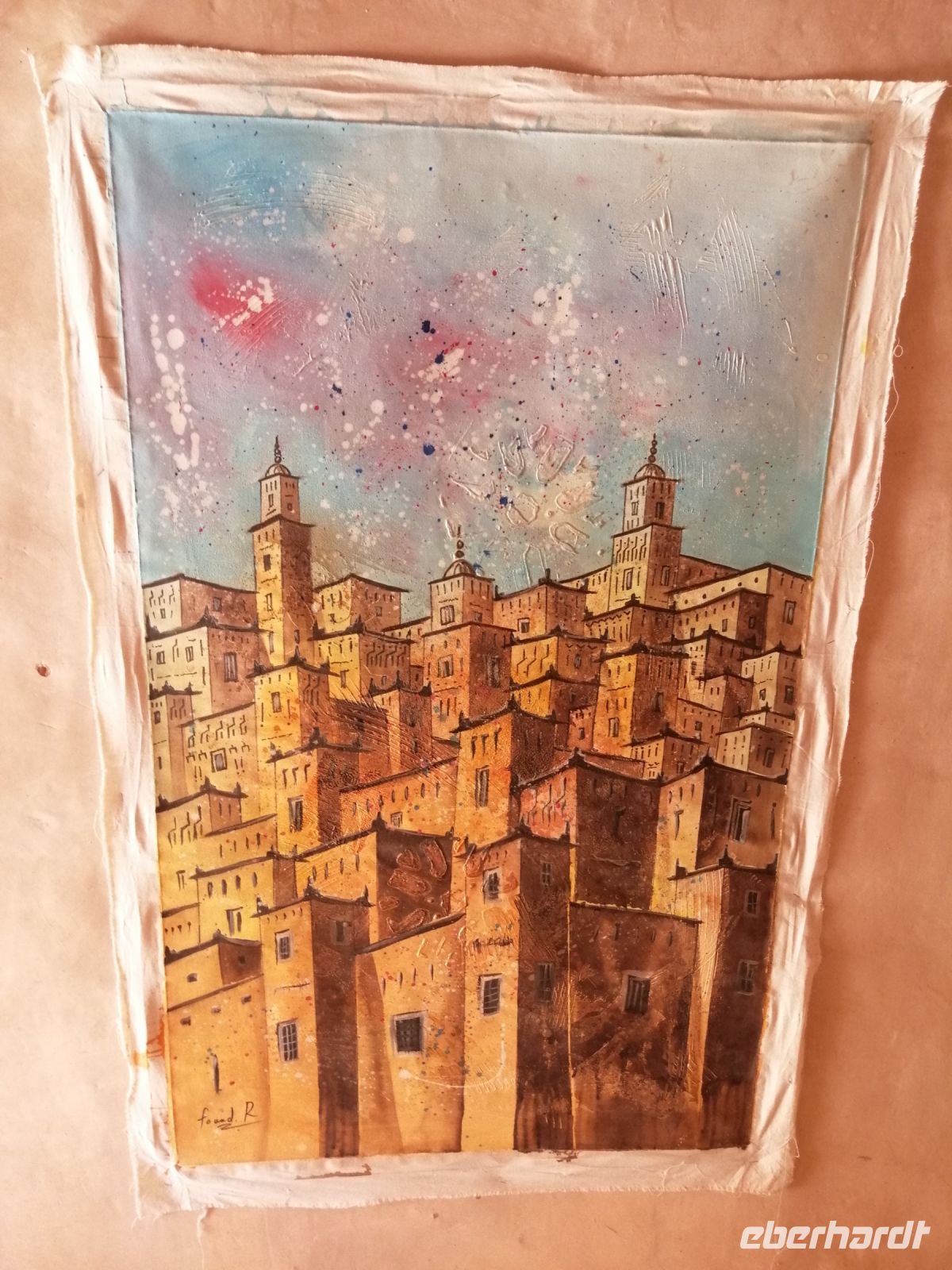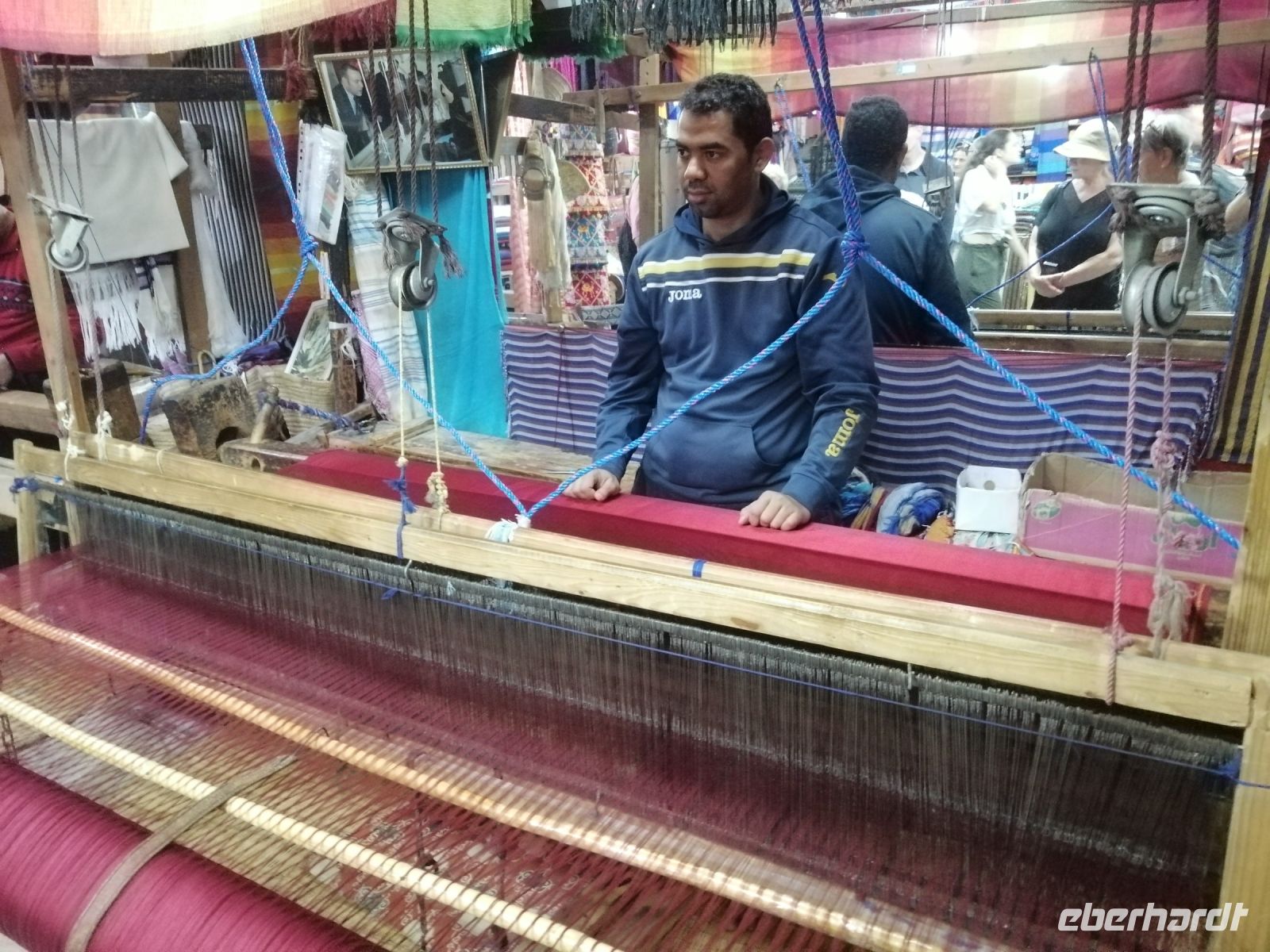 Nach dem Frühstück machten wir uns auf dem Weg und besuchten die prachtvolle Kasbah Ait-Ben-Haddou. Um diese gigantische Lehmburg zu erreichen, gingen wir zuerst durch die Straßen der Ortschaft, überquerten den Fluß über eine Brücke und stiegen dann über die engen Gassen der Kasbah bis nach ganz oben. Unterwegs begegneten wir einem Straßenkünstler, der nach einem besonderen Verfahren seine Gemälde malte, wir trafen mehrere Tuch- und Kleiderhändler, machten halt an einer Synagoge. Von Said erfuhren wir, dass diese Kasbah zum Unesco-Weltkulturerbe gehört und eine begehrte Filmkulisse für viele bekannte Filme vor allem für Filme zur biblischen Geschichte darstellte. Vom Gipfel der Kasbah konnten wir zusehen, wie die Filmkulisse für die Dreharbeiten am neuen Film Gladiator 2 aufgebaut wurde.