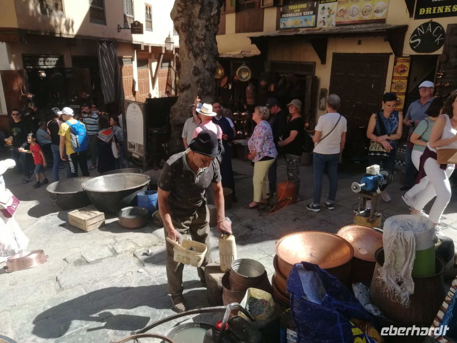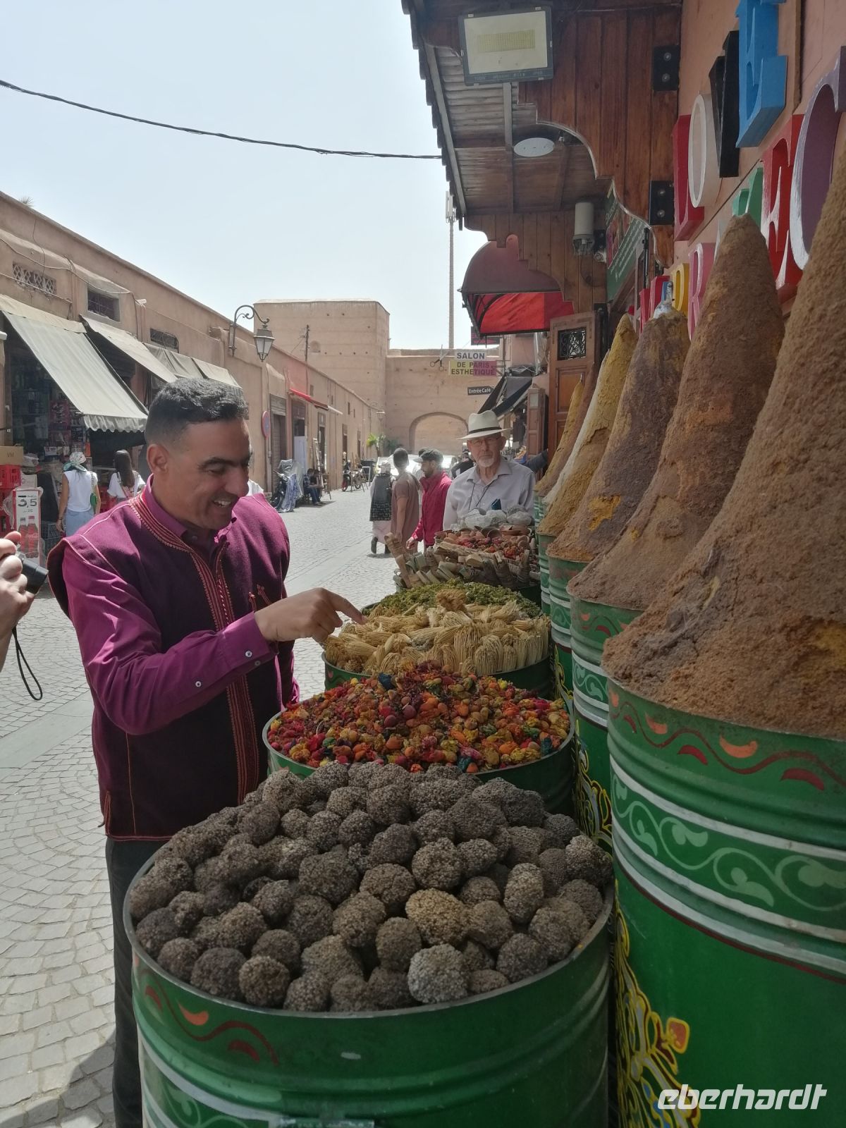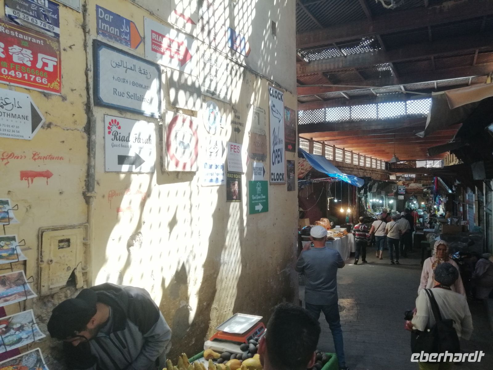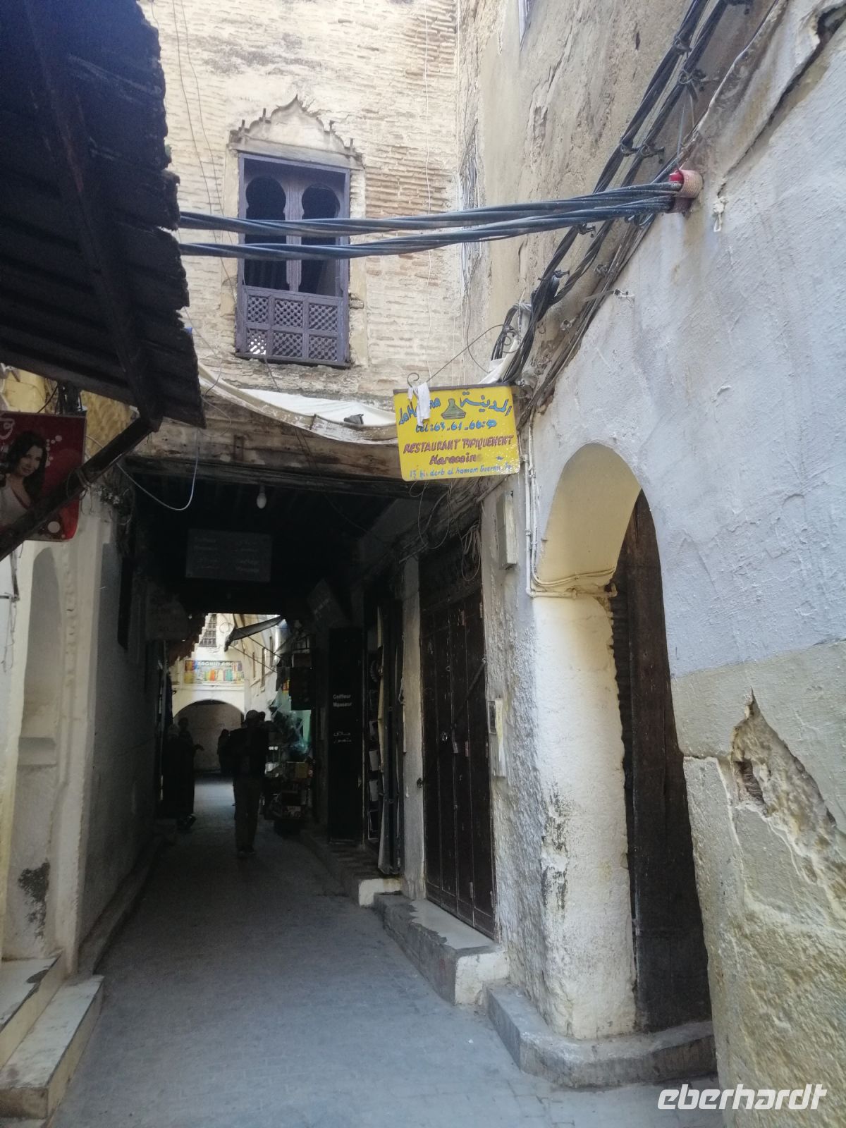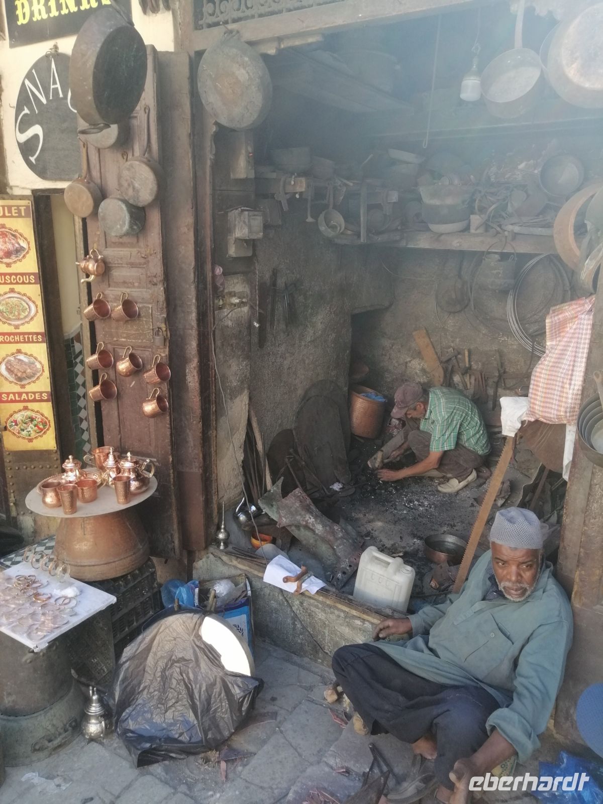 Besonders fasziniert waren wir von der Besichtigung der Medina mit ihren fast 10.000 Gassen und unzähligen Menschen. Die Basare (hier Suks genannt) nahmen uns echt gefangen: ein scheinbar grenzenloses Labyrinth verwinkelter, schmaler Gässchen, eingeteilt nach den einzelnen Gewerben und davon muss es Hunderte geben und fast jeder verrichtete seine Arbeit in aller Öffentlichkeit. Wir tauchten in die Gerüche der angebotenen Kräuter ein, schauten den Handwerken über die Schulter zu und versuchten ab und zu energetisch mit den Händlern zu verhandeln. Nach der kurzen Verschnaufpause auf dem Platz der Tischler, setzten wir unsere Stadtführung durch die Gassen der Medina fort, bis wir zu unserem Restaurant Typiquehent Marocain gelangt sind, wo Said für uns ein typisch marokkanisches Mittagessen organisierte!