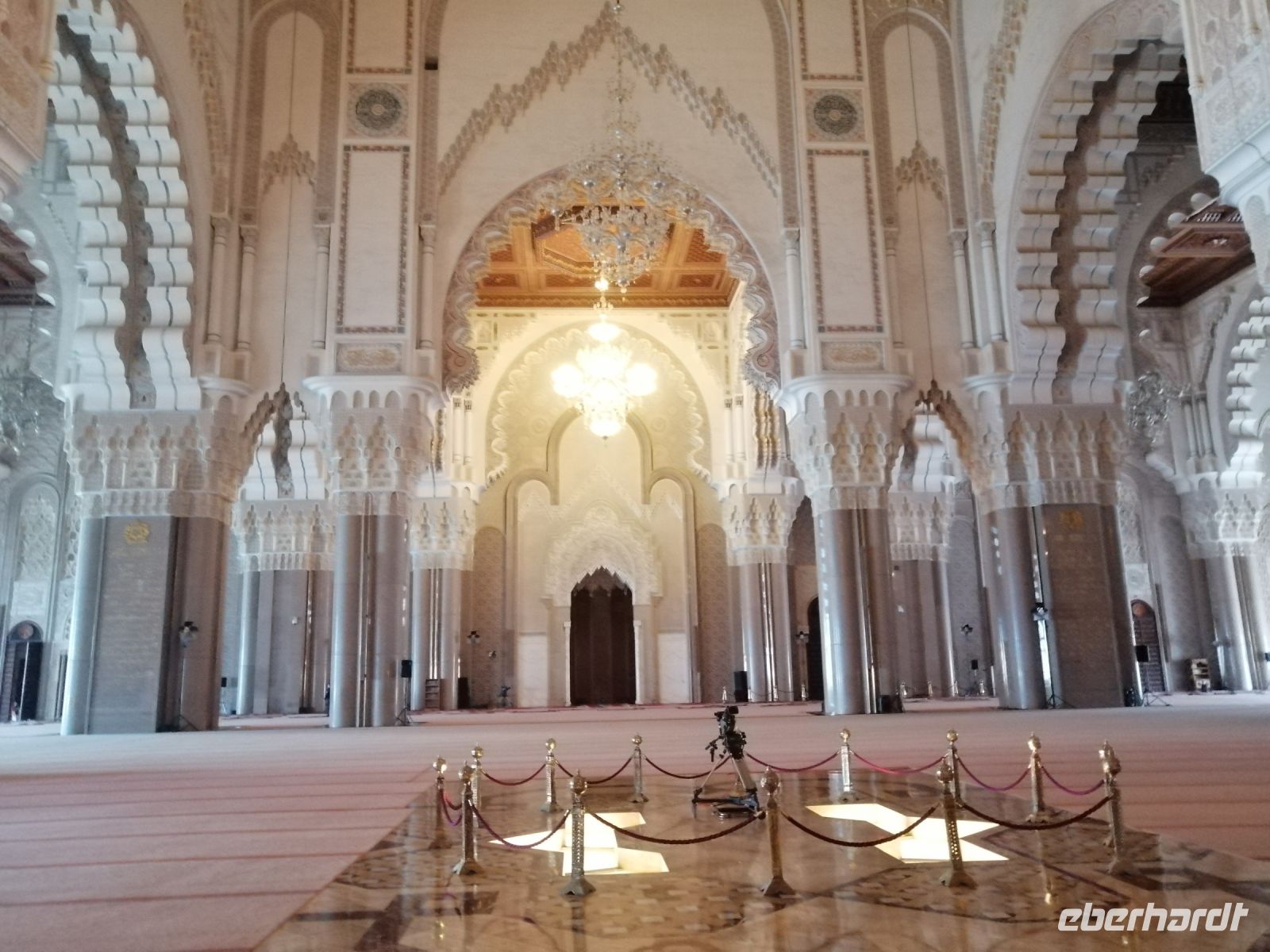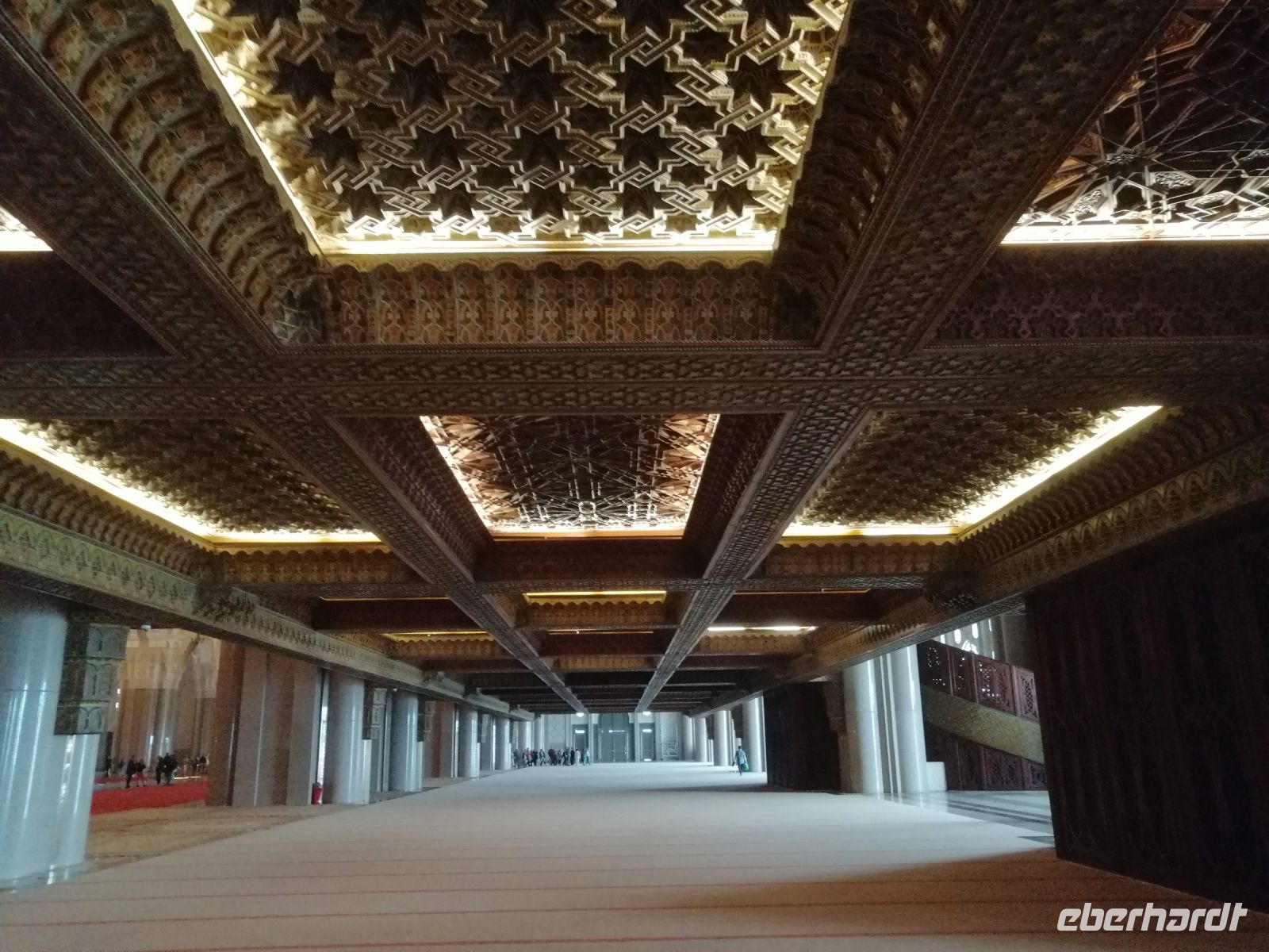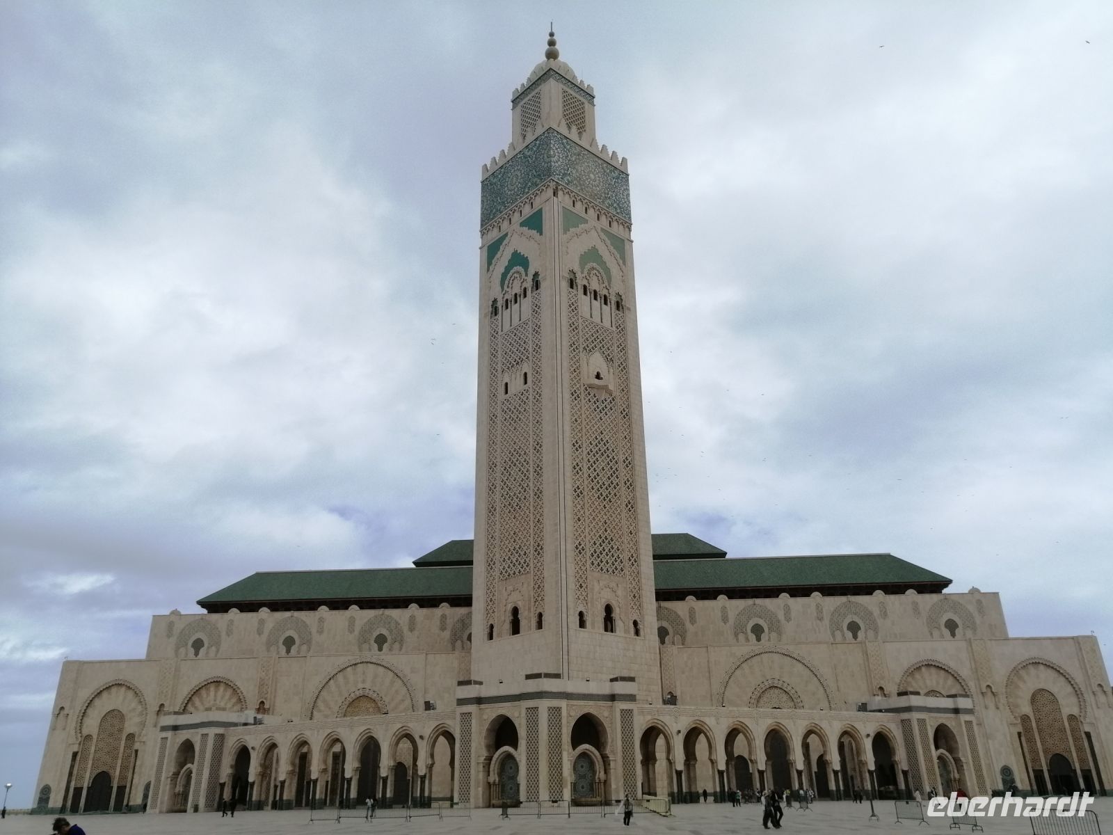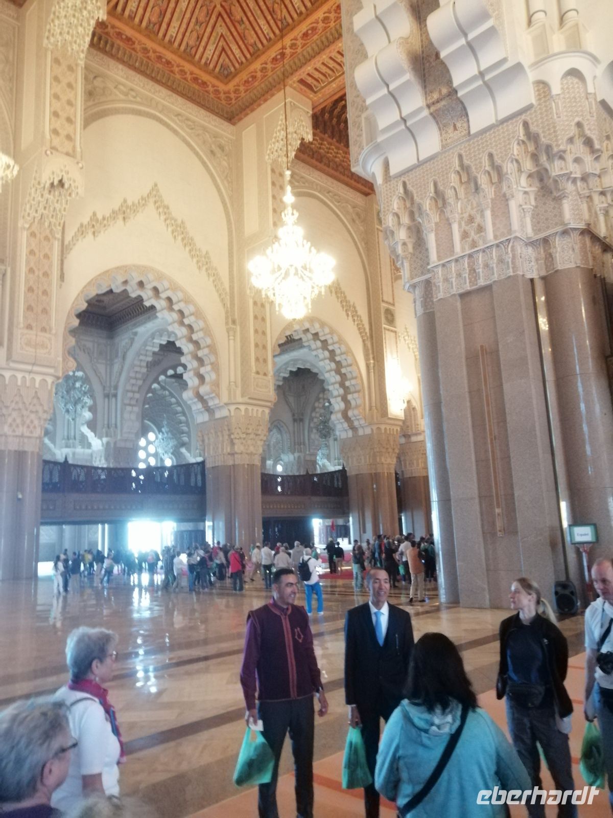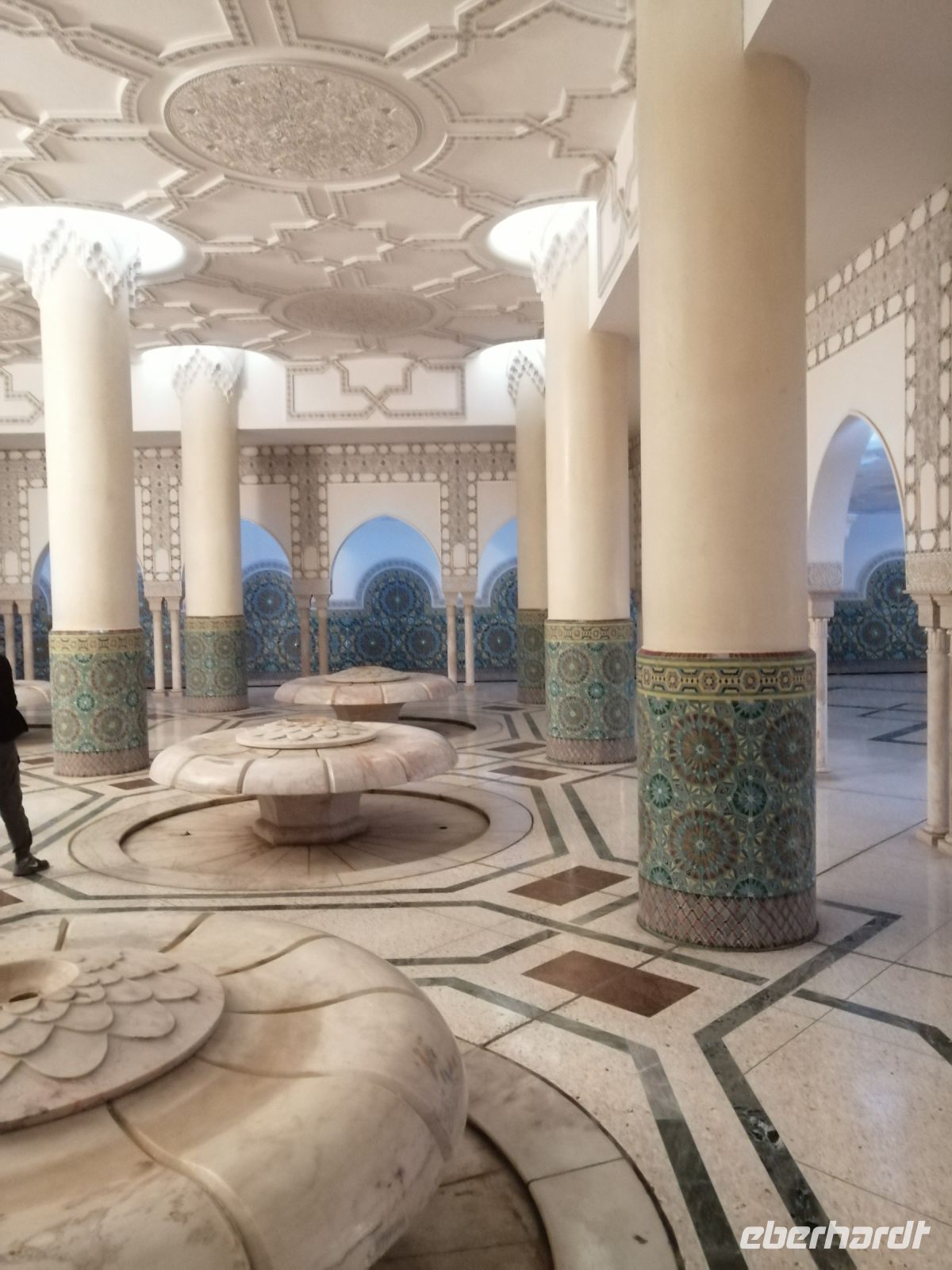 Nach dem Frühstück im Hotel starteten wir unsere Besichtigung der drittgrößten Moschee der Welt: Moschee Hassan II. Während der deutschsprachigen Führung erfuhren wir, dass die Moschee zwischen 1987 und 1993, mit Hilfe von ca. 2.500 Bauarbeitern und ca. 10.000 Kunsthandwerkern aus ganz Marokko gebaut wurde. Der Baugrund Moschee war es eine neue Sehenswürdigkeit für die Stadt zu schaffen und als Erinnerung an den Vater vom König – Hassan II. Eine Besonderheit dieser Moschee ist das 600 Tonnen schwere, 100 x 34 Meter große Schieberdach! Innerhalb von nur 3 Minuten kann das Schieberdach aufgeschoben werden. Über die Baukosten wird immer noch spekuliert: der Bau wurde angeblich komplett durch Spenden finanziert und die Kosten betrugen 800 Mio. bis 1,5 Mrd. USD. Die Fläche der Moschee umfasst 20 tqm und bietet somit Platz für etwa 25.000 Menschen zum Gebet an. Außerdem finden draußen, vor der Moschee, ca. 40.000 Menschen Platz. Der nette Fremdenführer zeigte uns noch die Waschräume und erzählte auch über den eindrucksvollen viereckigen Minarett der Moschee, der 210 Meter hoch und somit das höchste religiöse Bauwerk der Welt sei.