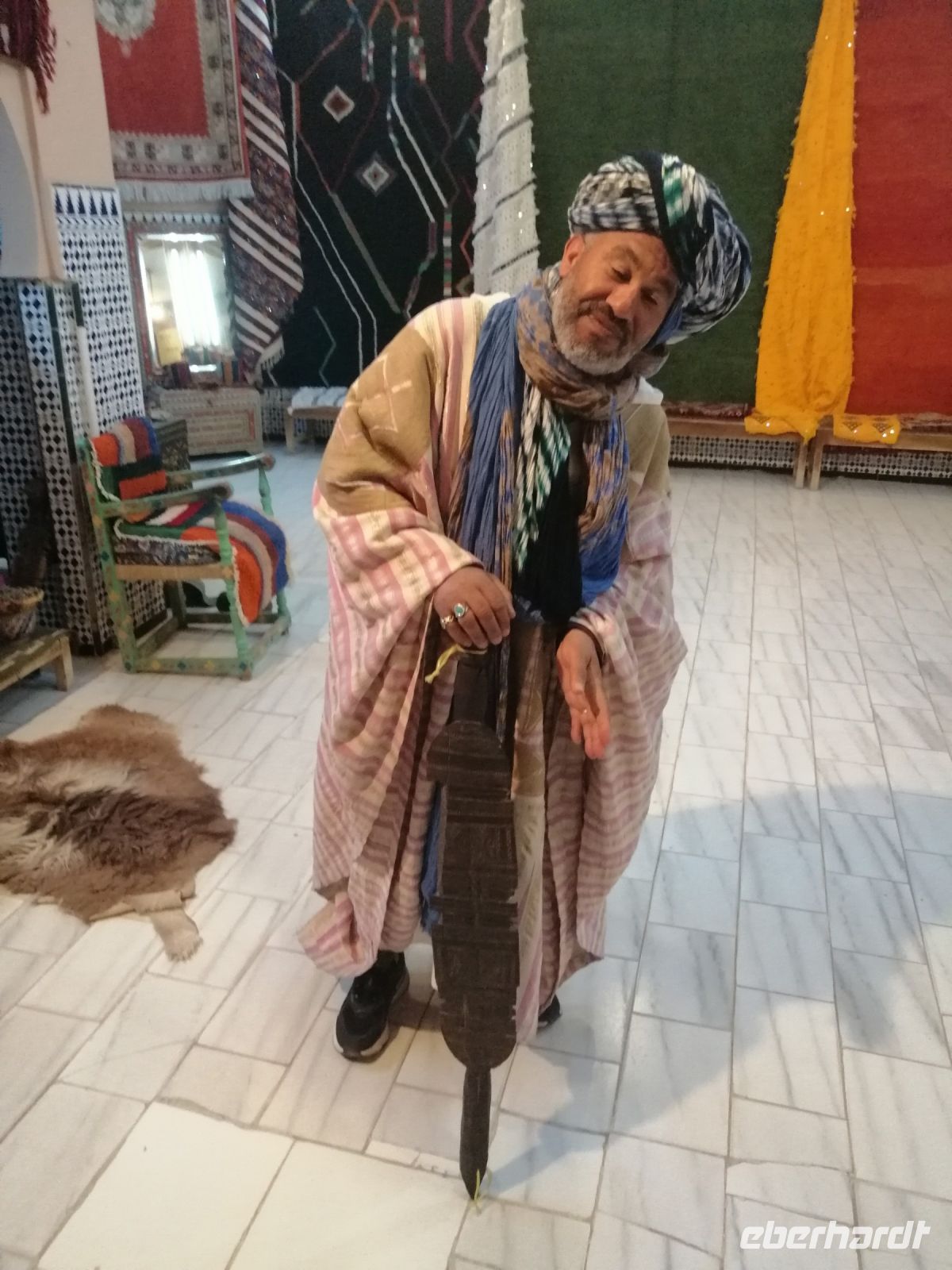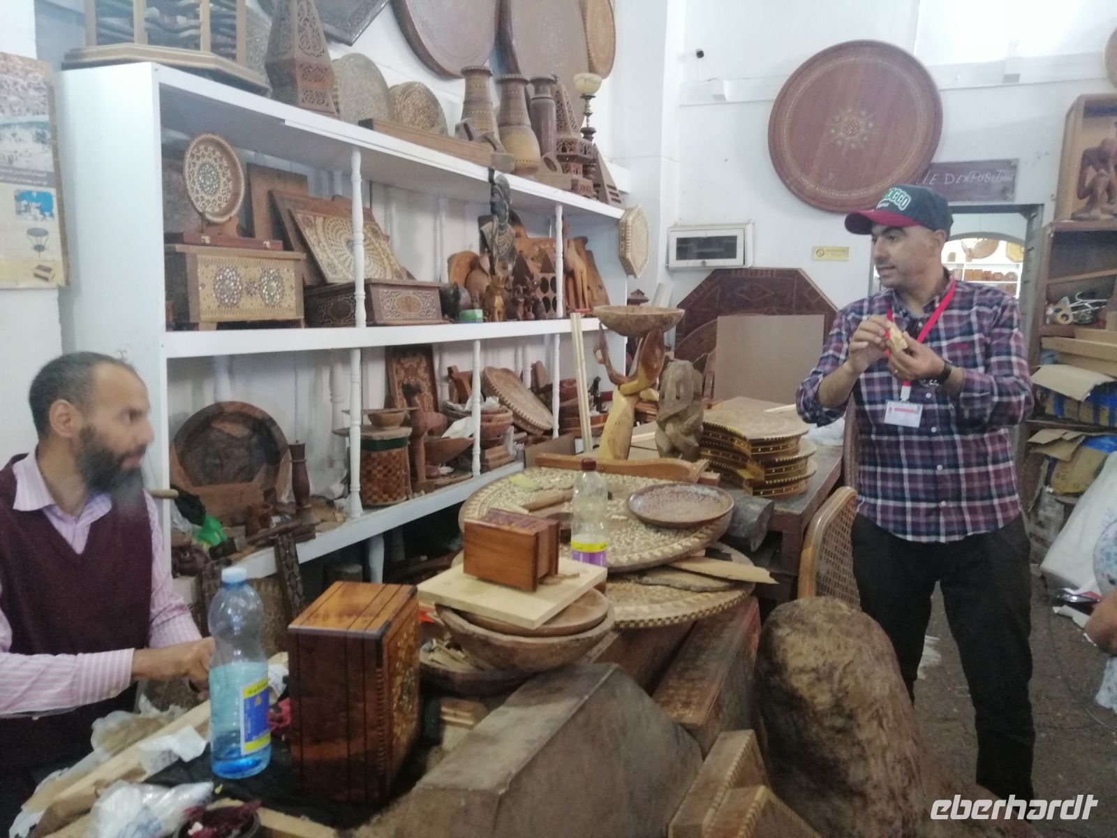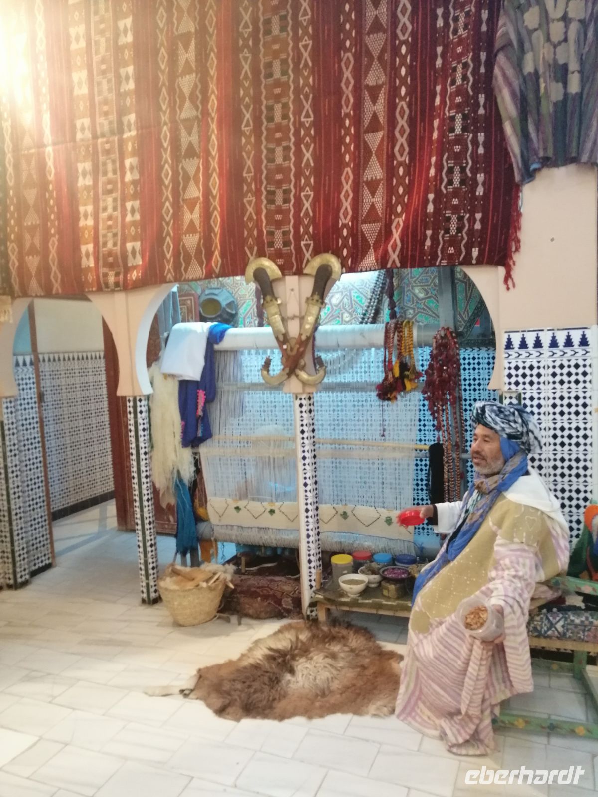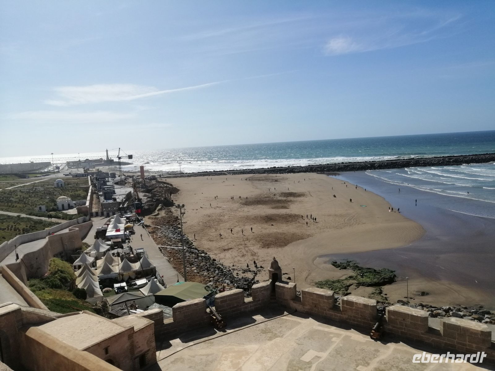 Nach der Ankunft in Essaouira gegen Mittag, unternehmen wir einen Rundgang durch den Hafen und schauten uns das Treiben der Fischer und der Händler an. Anschließend ging es durch das „Tor der Marine“, auf dem alle Religionen abgebildet sind, Richtung Medina von Essaouira. Die Stadt ist für hervorragende und kunstvolle Intarsienarbeiten aus verschiedenen Holzarten, vor allem Zitronenbaum- und Ebenholz sehr bekannt. In einer Holzwerkstatt wurden einige Reisegäste findig und erwarben wunderschöne Holzprodukte. Während der weiteren Erkundung der Altstadt von Essaouira spazierten wir durch die engen Gassen der Medina, mit ihrer vielen Händlern, bis zur Bastion Nord – eine Art Festung an der Küstenpromenade. Der Nachmittag stand dann allen Gästen zur freien Verfügung. Einige nutzten die Zeit für einen Küstenspaziergang und beobachteten viele Kite- und Windsurfer, denn die Region um Essaouira wird vom Passat zwischen April und Anfang Oktober mit Wind versorgt. Das Wasser im Atlantik ist kühl, im Sommer etwa 22° Grad im Frühjahr 18° Grad. Dadurch hat die Region auch im Hochsommer ein angenehmes Klima. Der Temperaturkontrast zwischen Meer und Hinterland sorgt für eine thermische Verstärkung und beschleunigt den Passat hier mit großer Beständigkeit auf 6 – 8 Beaufort (starker Wind), besonders in den Hochsommermonaten Juli und August. Der Wind setzt morgens ab ca. 9 Uhr langsam ein und steigert sich im Laufe des Tages auf Maximalstärke. Die Faustregel in Marokko lautet: im Sommer ist der Wind stark und die Wellen bleiben klein, im Winter ist es umgekehrt.